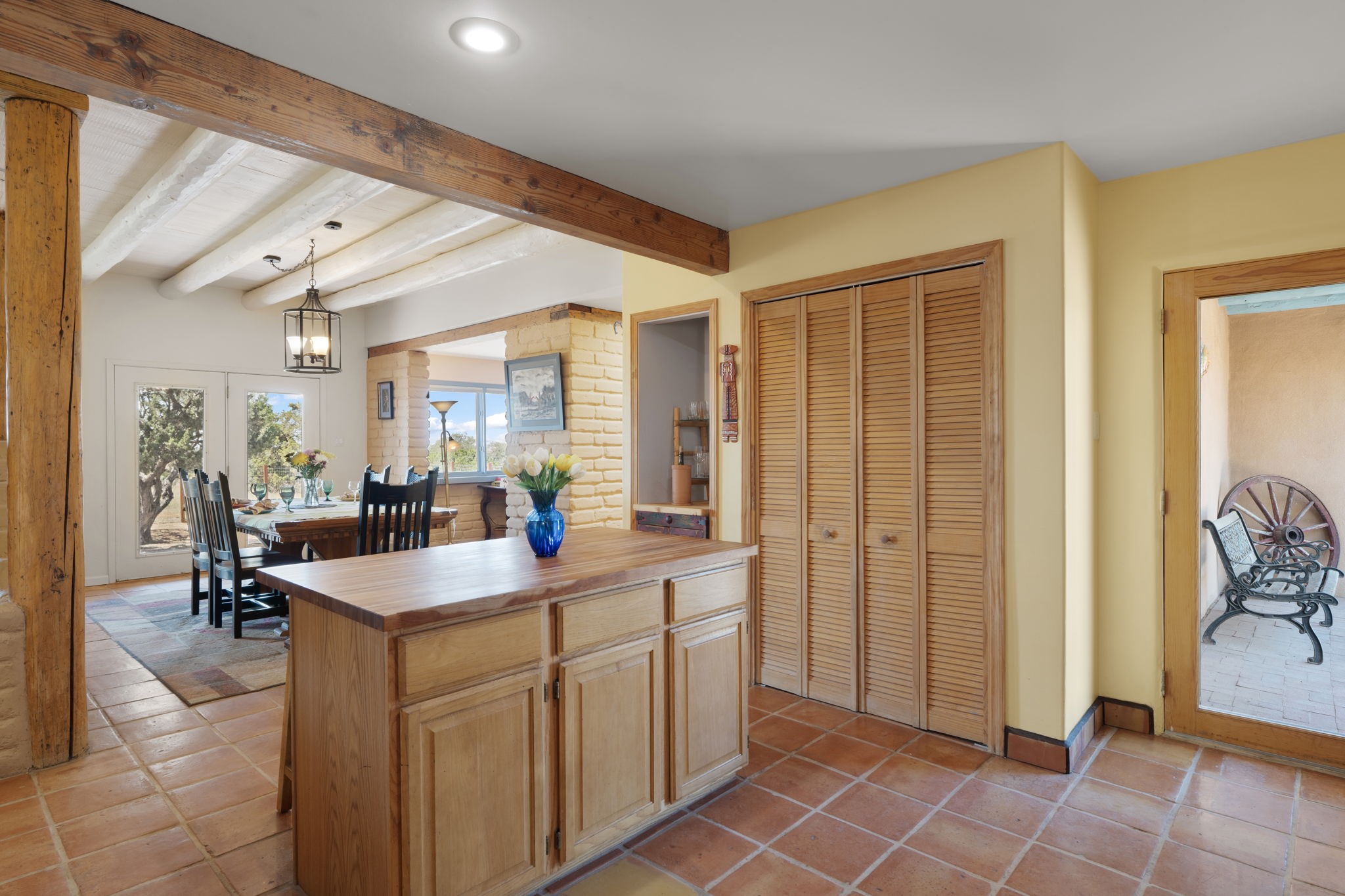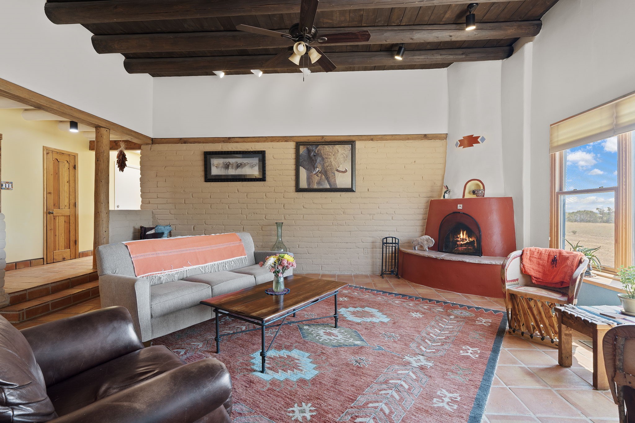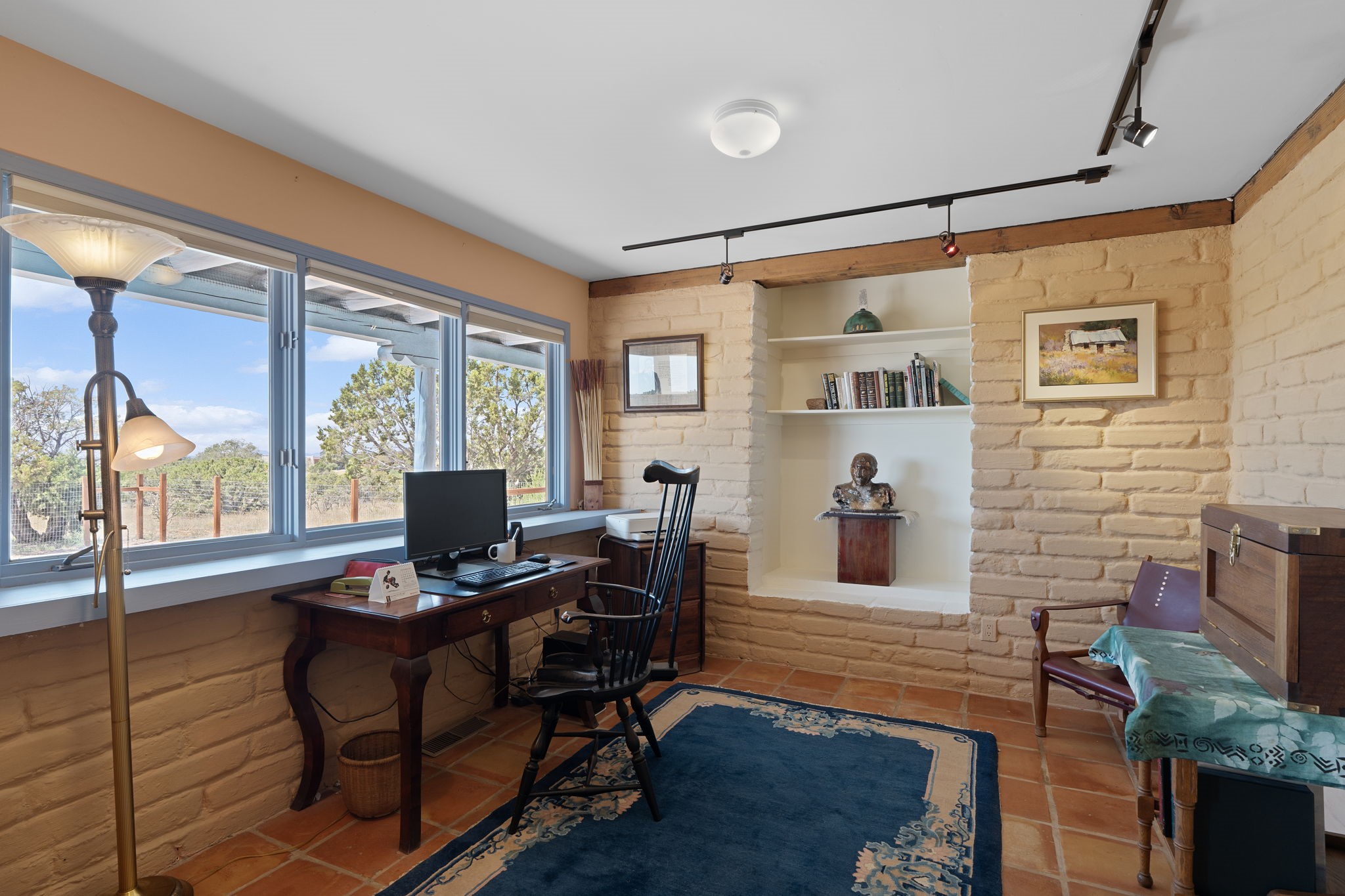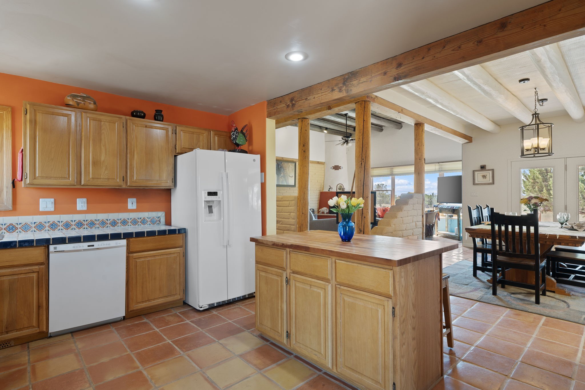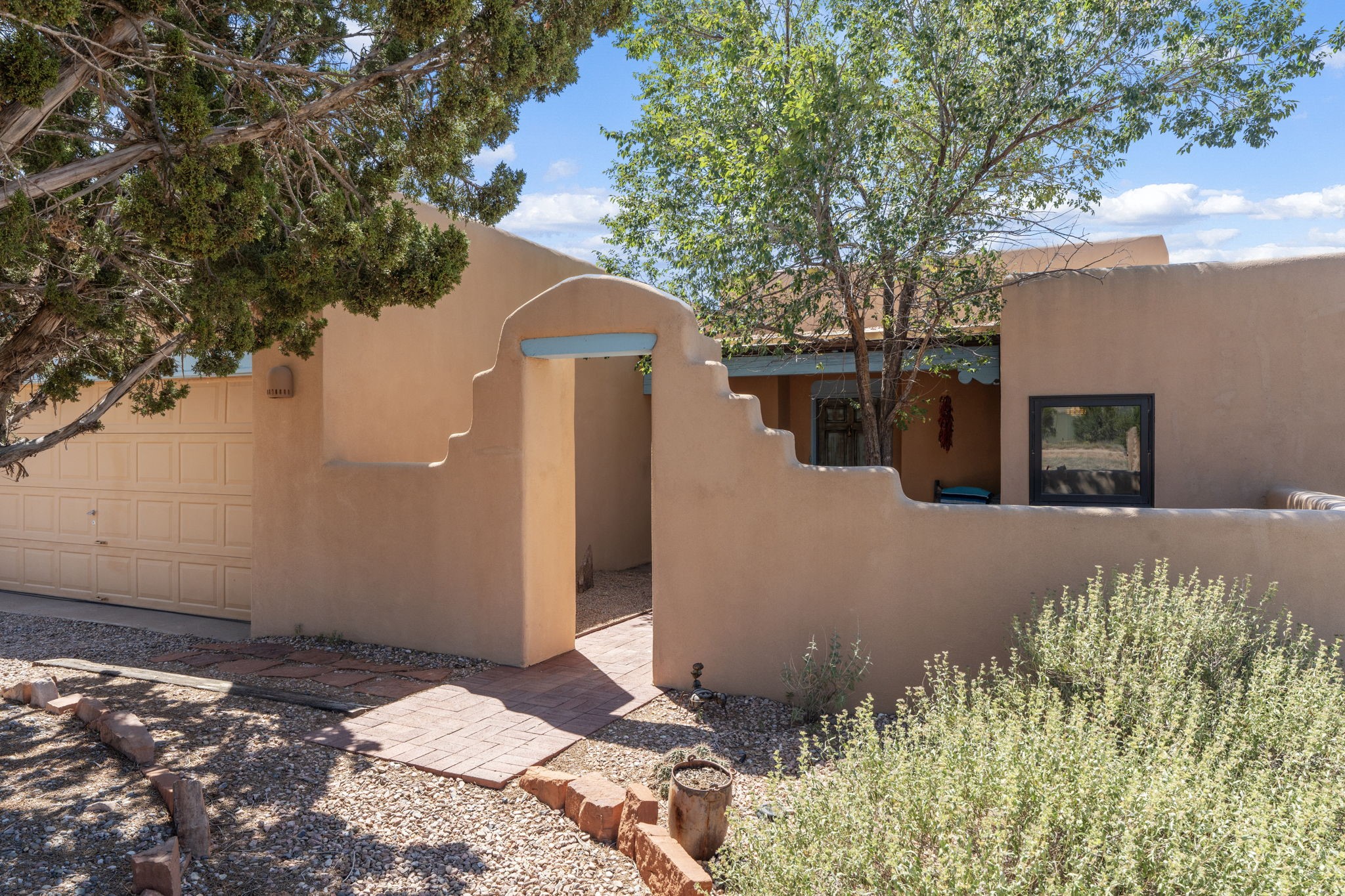 Welcome to your happy and bright Eldorado Hacienda! Exposed adobe walls, viga ceilings and saltillo tile enhance the charm of this beautiful property. Sited on a cul-de-sac for privacy. Lovely mountain views through picture windows. Dramatic high ceiling in living room with kiva fireplace. Three bedrooms plus an office space off the dining room. Kitchen has THREE pantry spaces and an island with storage. Spacious primary bedroom with a wood-burning kiva fireplace with a flagstone hearth. Saltillo tile throughout, one guest room has brick floors the other has carpet. Good bedroom separation. Morning and afternoon portals to enjoy and a walled side yard. Sunset views! Two steps down to living room and to kitchen. Lot corners are flagged. Septic inspection in supplements. PRE-INSPECTED AND ALL REPAIRS COMPLETED. REPORT ON REQUEST.