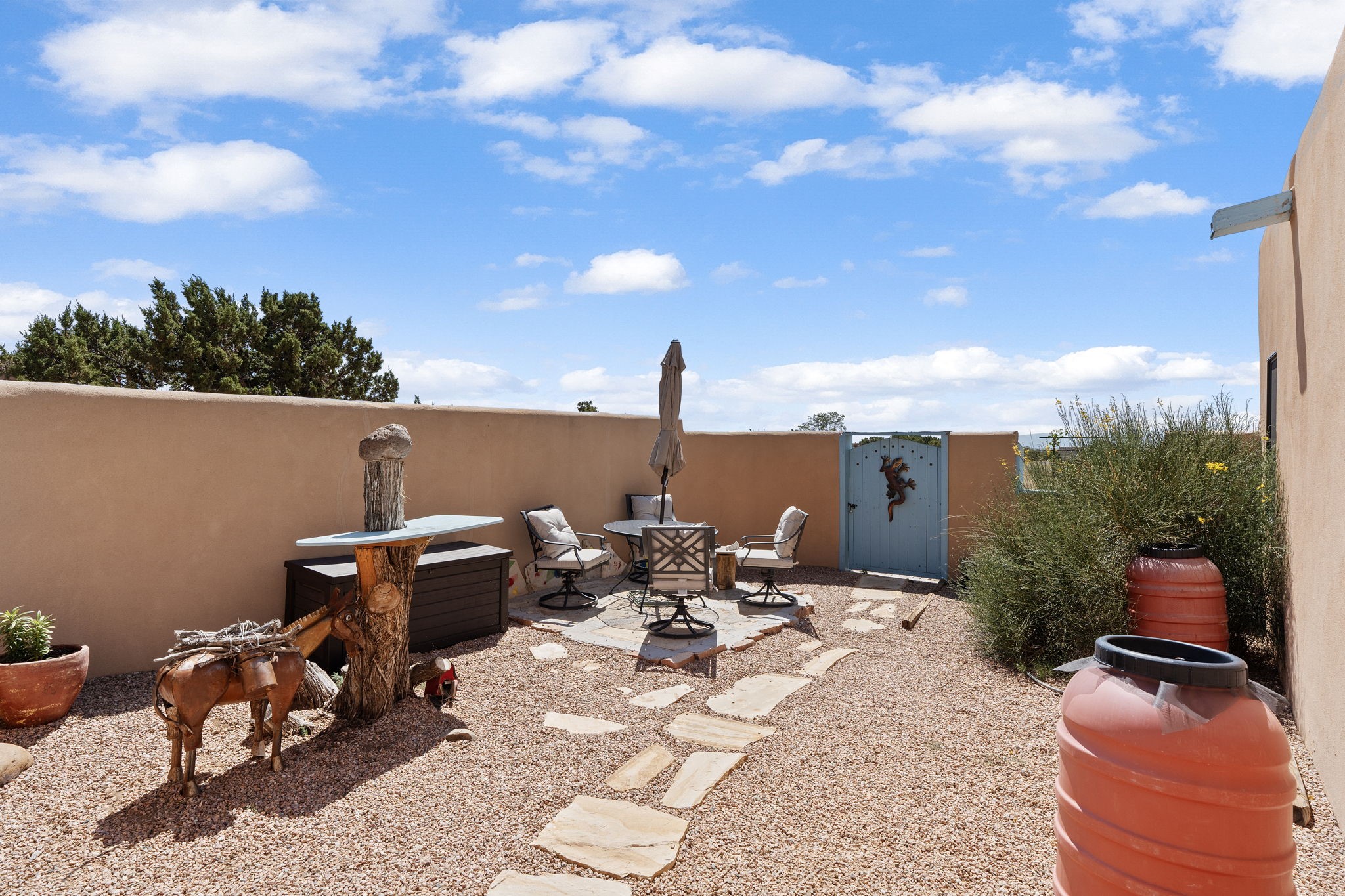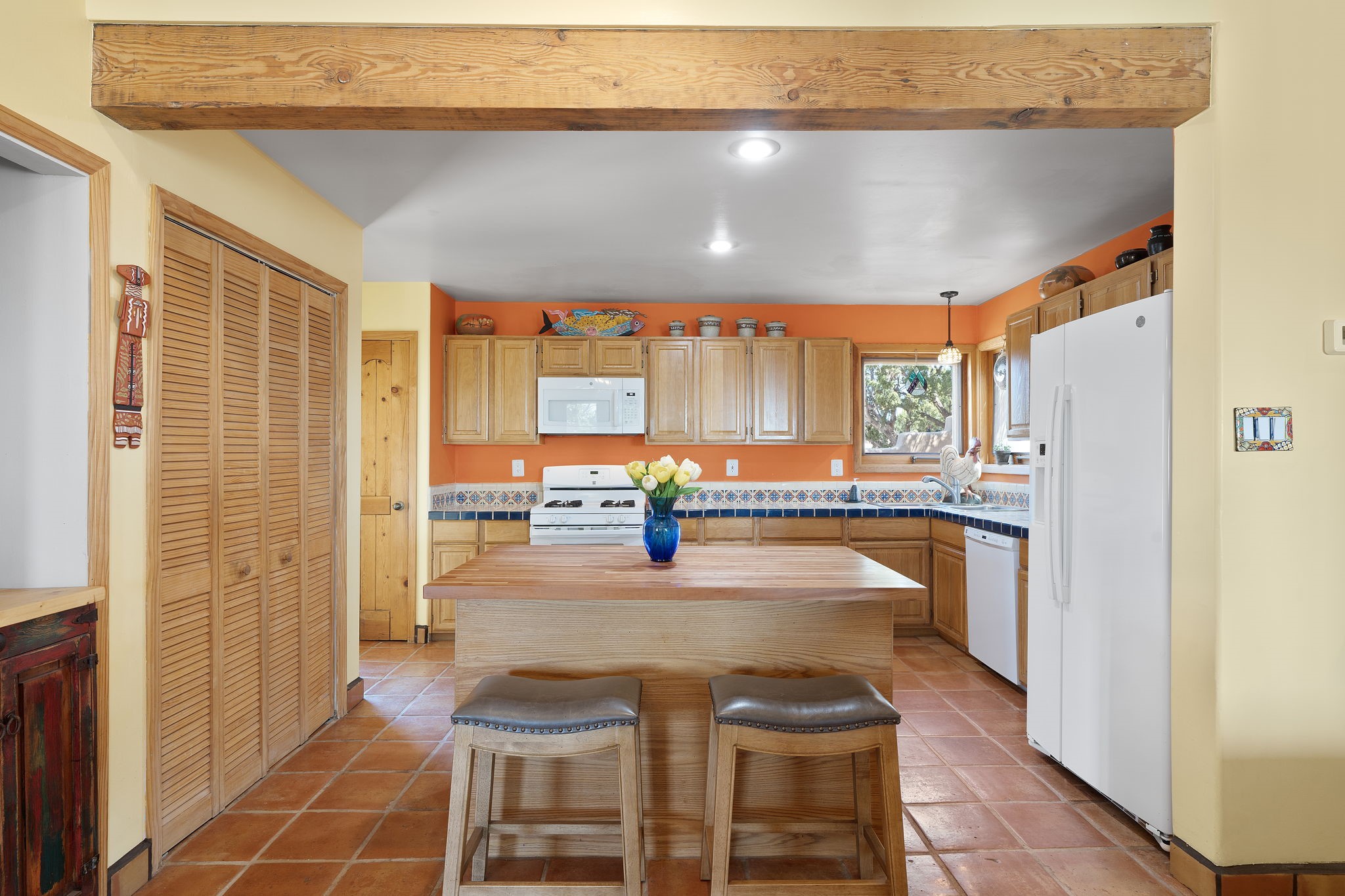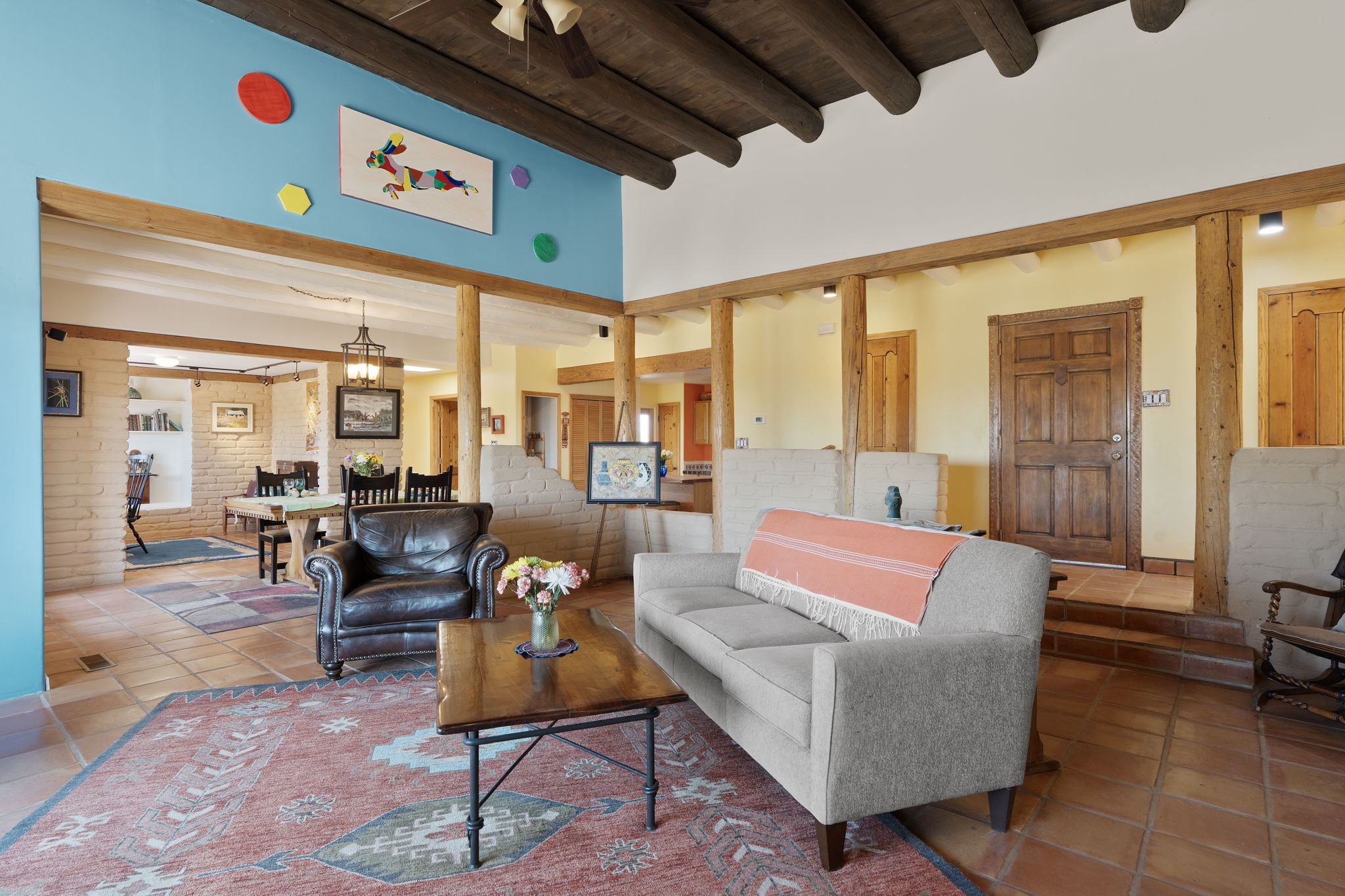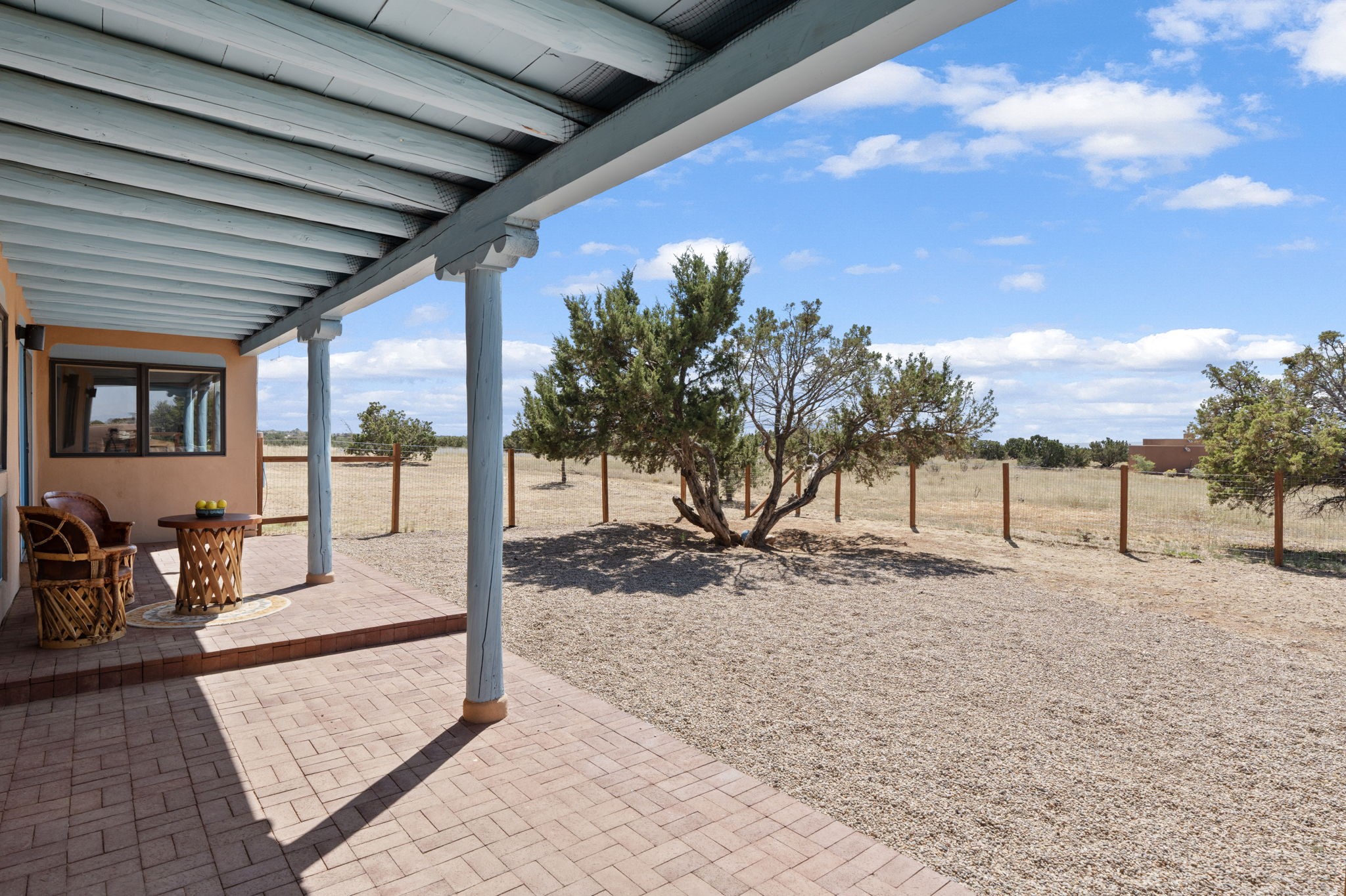 Welcome to your happy and bright Eldorado Hacienda! Exposed adobe walls, viga ceilings and saltillo tile enhance the charm of this beautiful property. Sited on a cul-de-sac for privacy. Lovely mountain views through picture windows. Dramatic high ceiling in living room with kiva fireplace. Three bedrooms plus an office space off the dining room. Kitchen has THREE pantry spaces and an island with storage. Spacious primary bedroom with a wood-burning kiva fireplace with a flagstone hearth. Saltillo tile throughout, one guest room has brick floors the other has carpet. Good bedroom separation. Morning and afternoon portals to enjoy and a walled side yard. Sunset views! Two steps down to living room and to kitchen. Lot corners are flagged. Septic inspection in supplements. PRE-INSPECTED AND ALL REPAIRS COMPLETED. REPORT ON REQUEST.