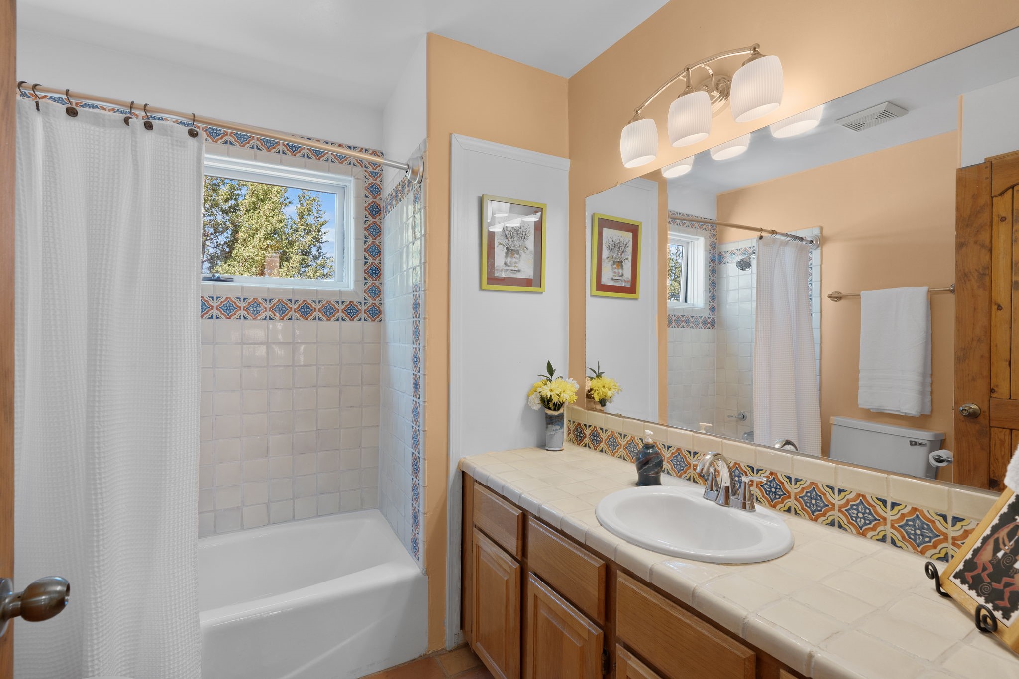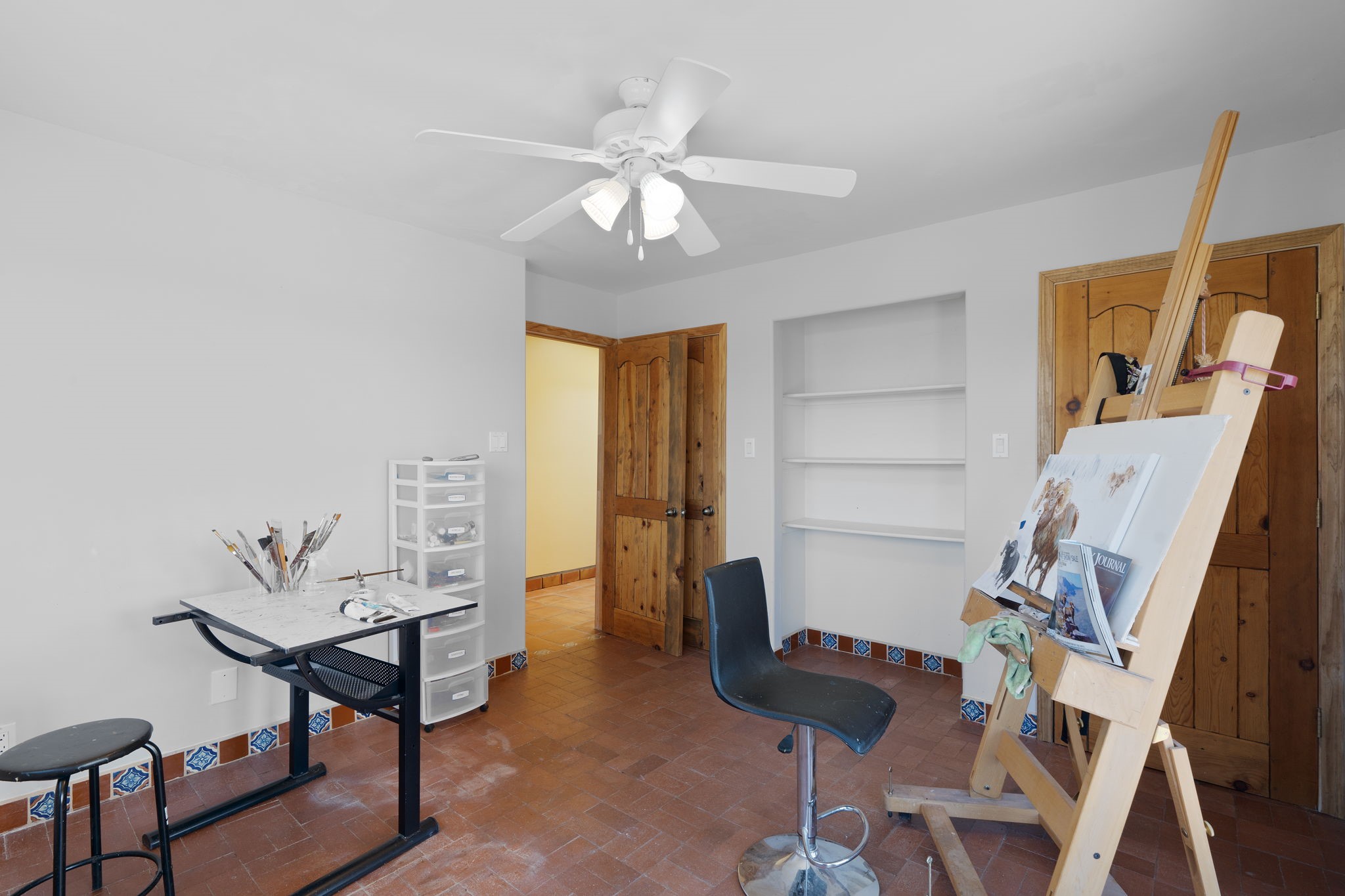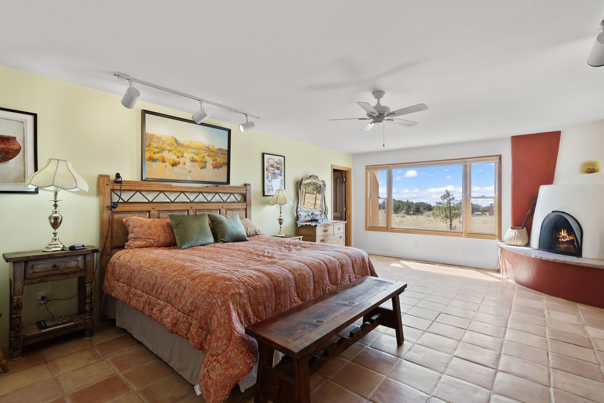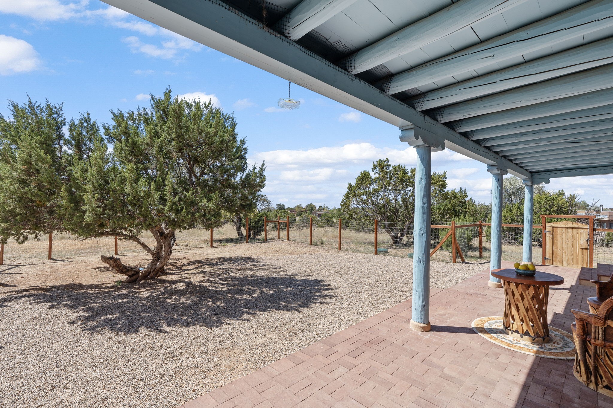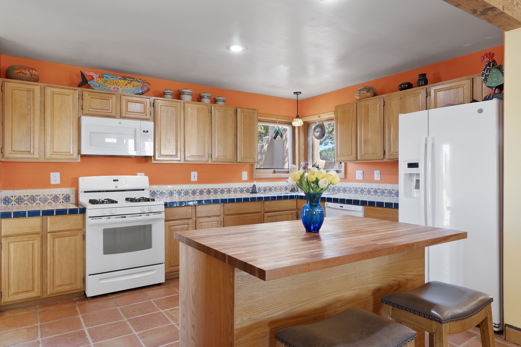 Welcome to your happy and bright Eldorado Hacienda! Exposed adobe walls, viga ceilings and saltillo tile enhance the charm of this beautiful property. Sited on a cul-de-sac for privacy. Lovely mountain views through picture windows. Dramatic high ceiling in living room with kiva fireplace. Three bedrooms plus an office space off the dining room. Kitchen has THREE pantry spaces and an island with storage. Spacious primary bedroom with a wood-burning kiva fireplace with a flagstone hearth. Saltillo tile throughout, one guest room has brick floors the other has carpet. Good bedroom separation. Morning and afternoon portals to enjoy and a walled side yard. Sunset views! Two steps down to living room and to kitchen. Lot corners are flagged. Septic inspection in supplements. PRE-INSPECTED AND ALL REPAIRS COMPLETED. REPORT ON REQUEST.