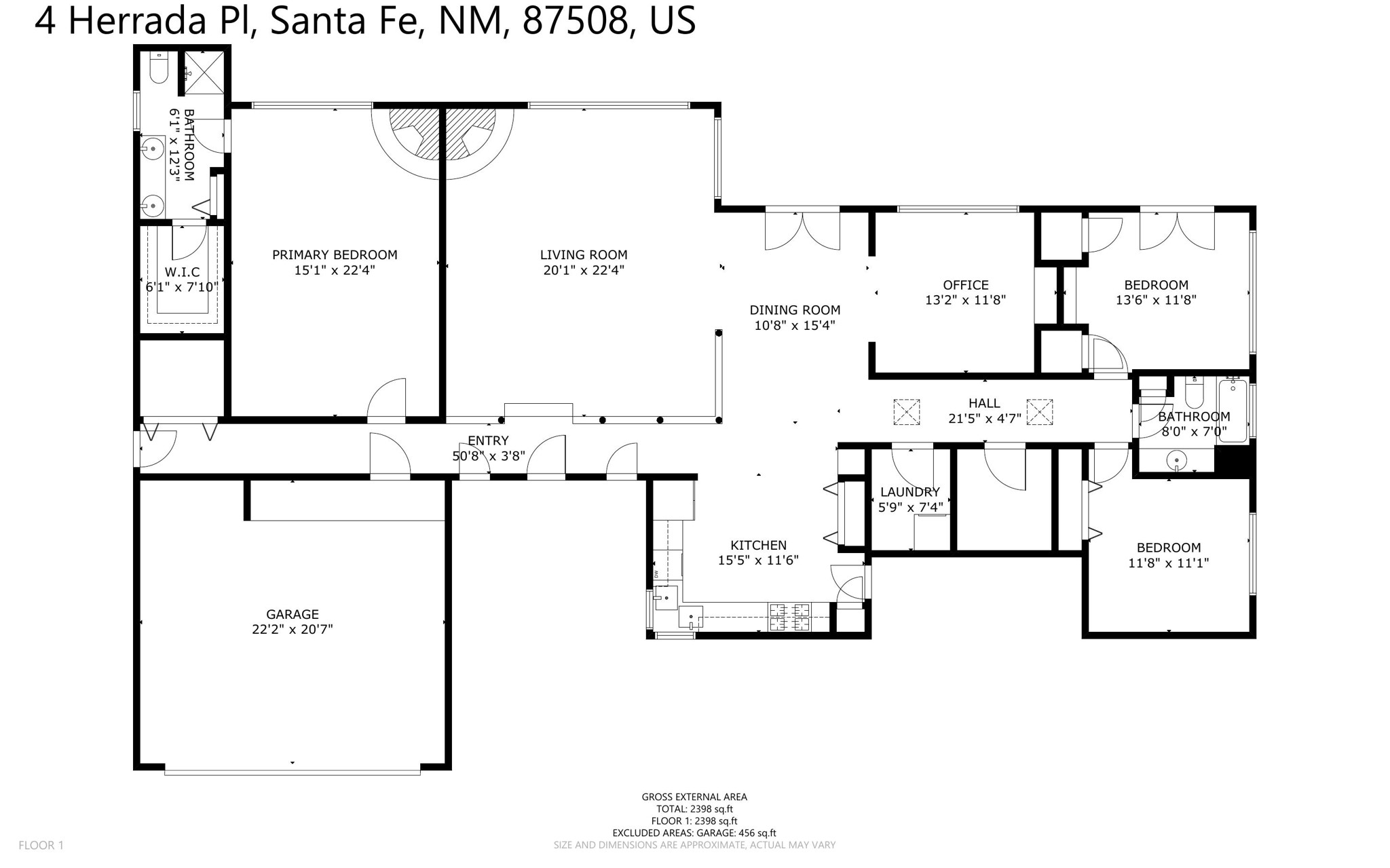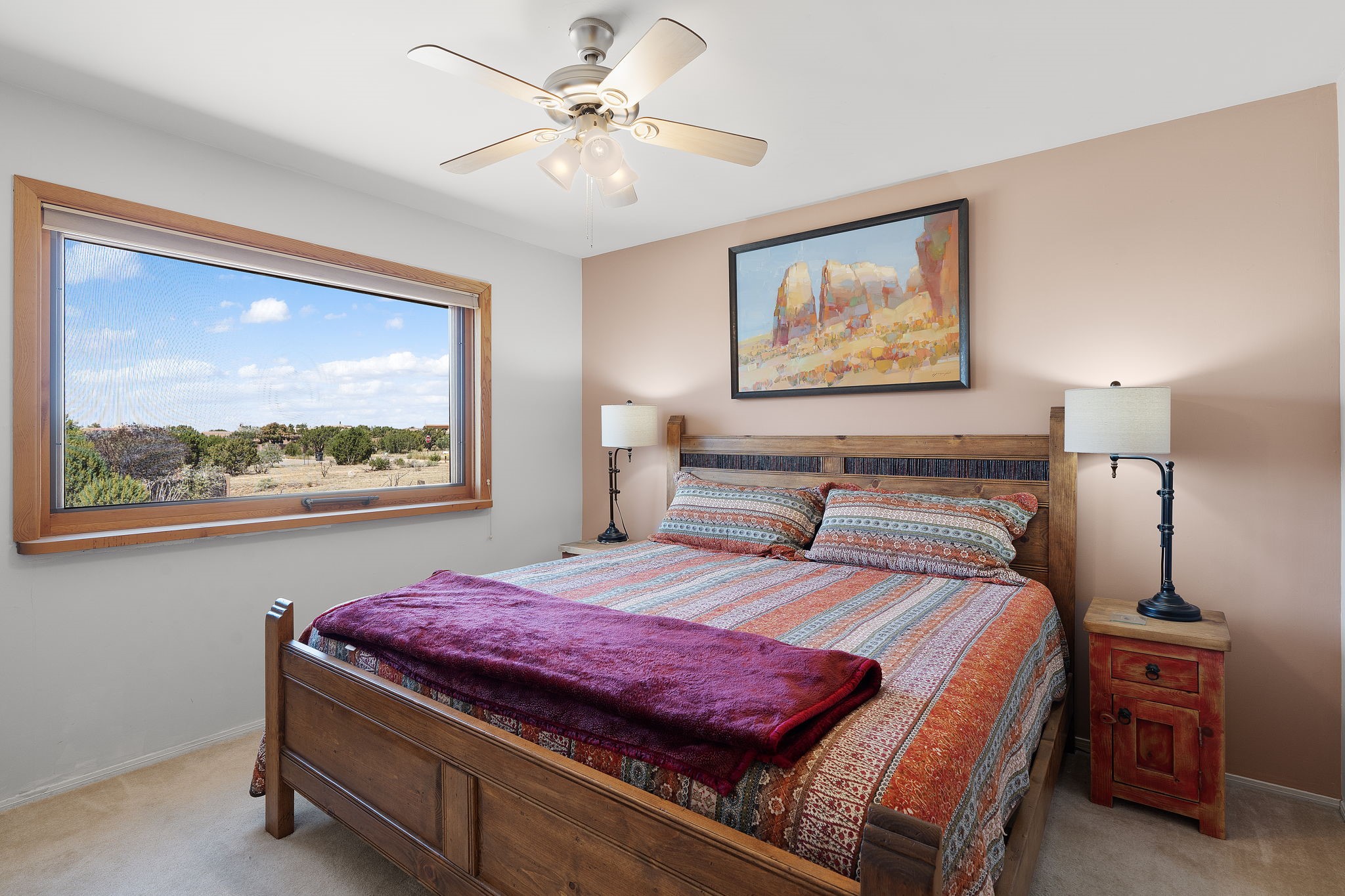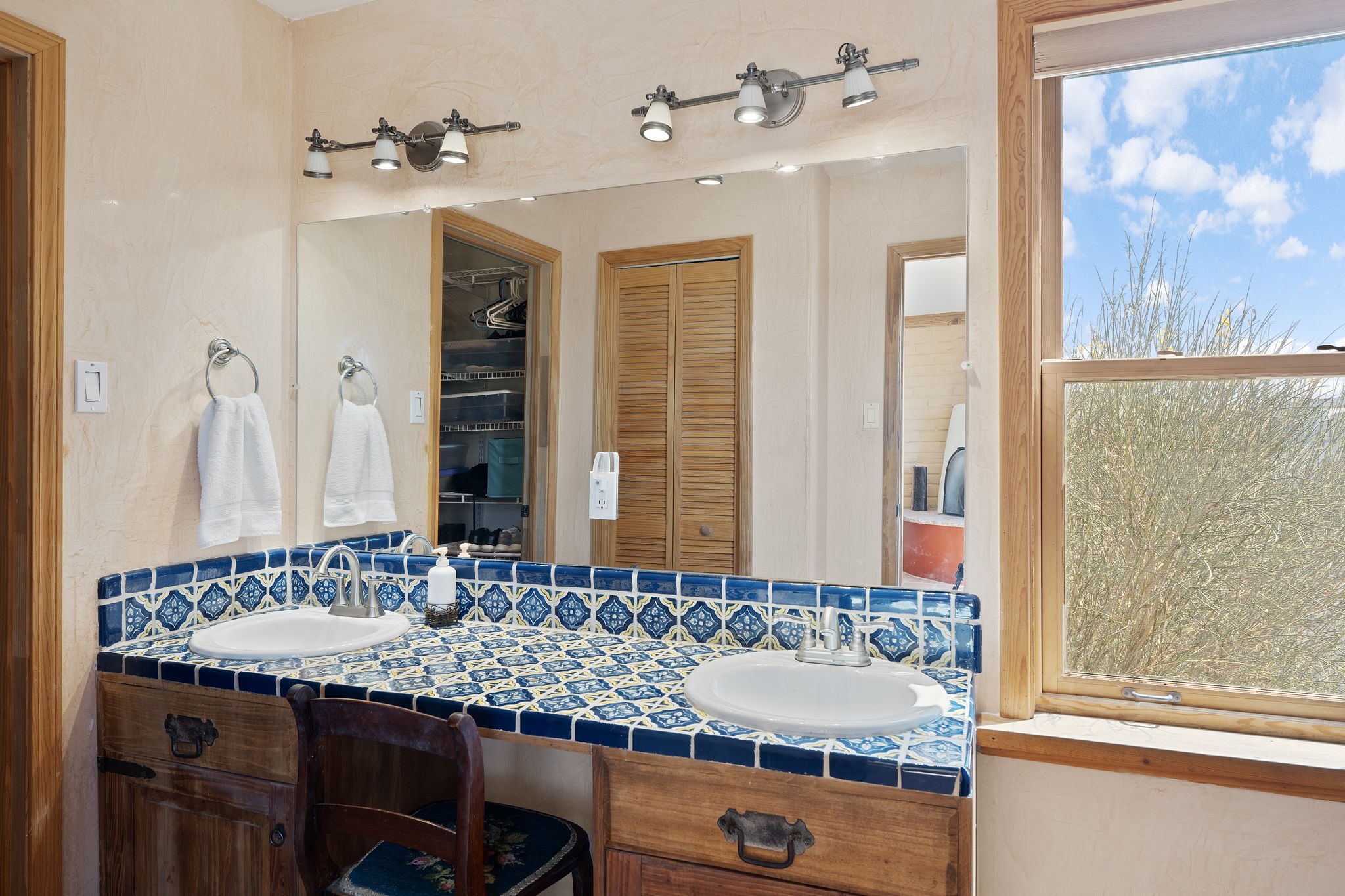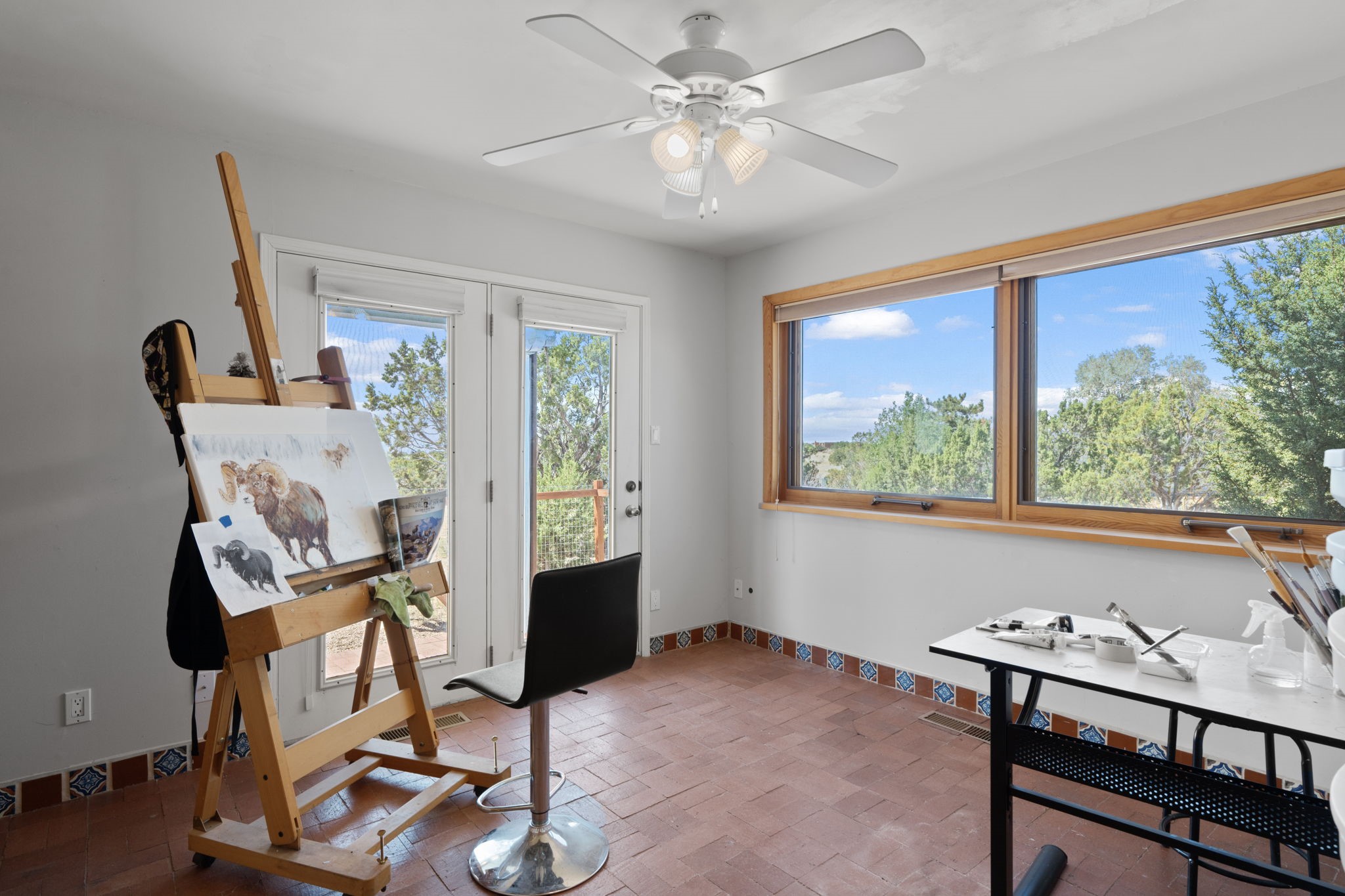 Welcome to your happy and bright Eldorado Hacienda! Exposed adobe walls, viga ceilings and saltillo tile enhance the charm of this beautiful property. Sited on a cul-de-sac for privacy. Lovely mountain views through picture windows. Dramatic high ceiling in living room with kiva fireplace. Three bedrooms plus an office space off the dining room. Kitchen has THREE pantry spaces and an island with storage. Spacious primary bedroom with a wood-burning kiva fireplace with a flagstone hearth. Saltillo tile throughout, one guest room has brick floors the other has carpet. Good bedroom separation. Morning and afternoon portals to enjoy and a walled side yard. Sunset views! Two steps down to living room and to kitchen. Lot corners are flagged. Septic inspection in supplements. PRE-INSPECTED AND ALL REPAIRS COMPLETED. REPORT ON REQUEST.