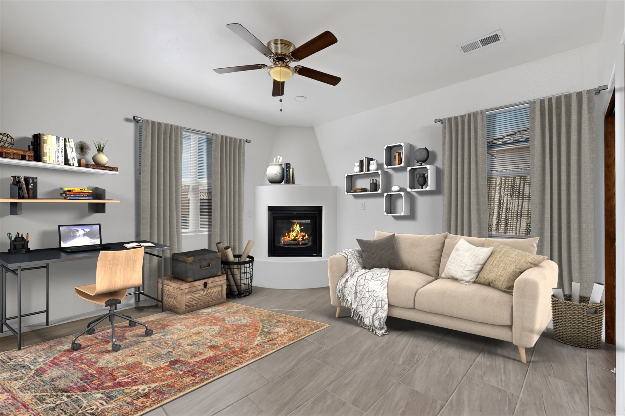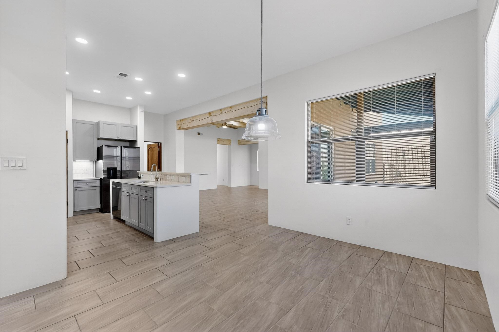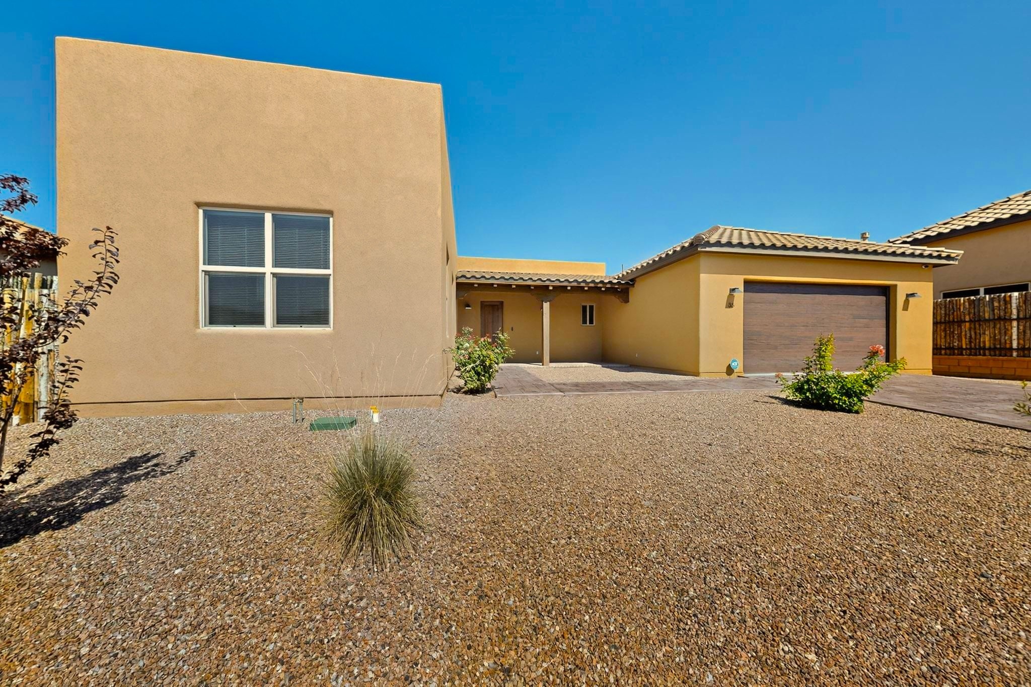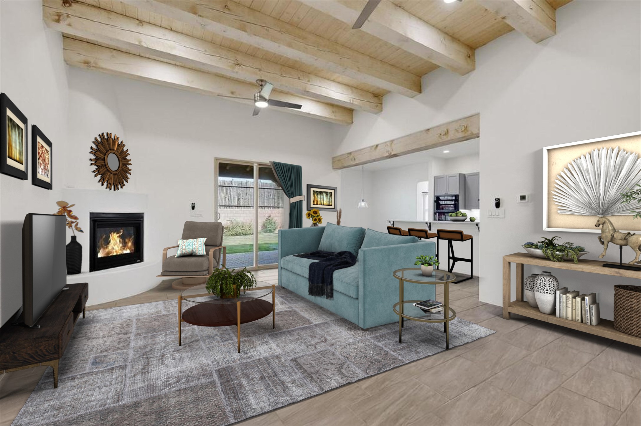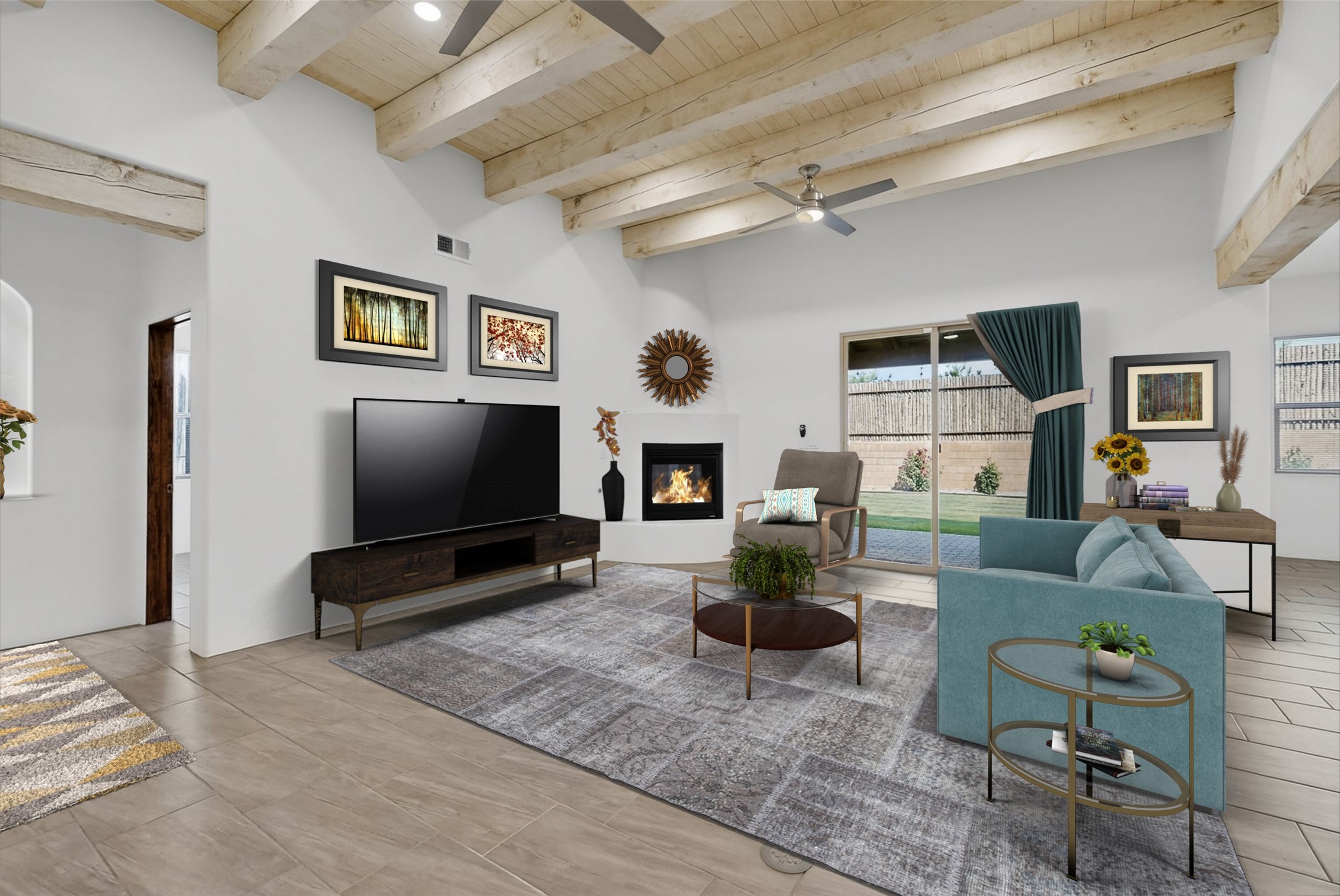 This San Miguel floor plan is a 2268 sq. ft. with 4 bedrooms and 2.5 baths located in the tranquil La Pradera community. The exterior has a pitched Spanish design with a clay tile roof and covered portals with heavy wood beams and brick pavers. The driveway is a colored stamped concrete design. The home is entered through an 8 ft. door to light wood-like porcelain floor tiles, with a powder room to the right and a hallway to the left with a nicho accented wall leading to the the 4th guest bedroom which could also serve as a wonderful office or media room with it's inviting kiva fireplace. The primary bath has a large walk-in shower with euro-style shower fixtures and an overhead rain shower head. There is also a very large oversized primary closet. The living room has white-stained beams and T&G trim and another kiva fireplace. The open kitchen has a separate dining area along with the bar seating. The insulated garage has 2 separate storage areas. The back yard is completely landscaped with established plantings which include roses bushes, grass, gravel and coyote fencing all around. This is a great home for all! Virtual staging and fires in fireplaces digitally created.