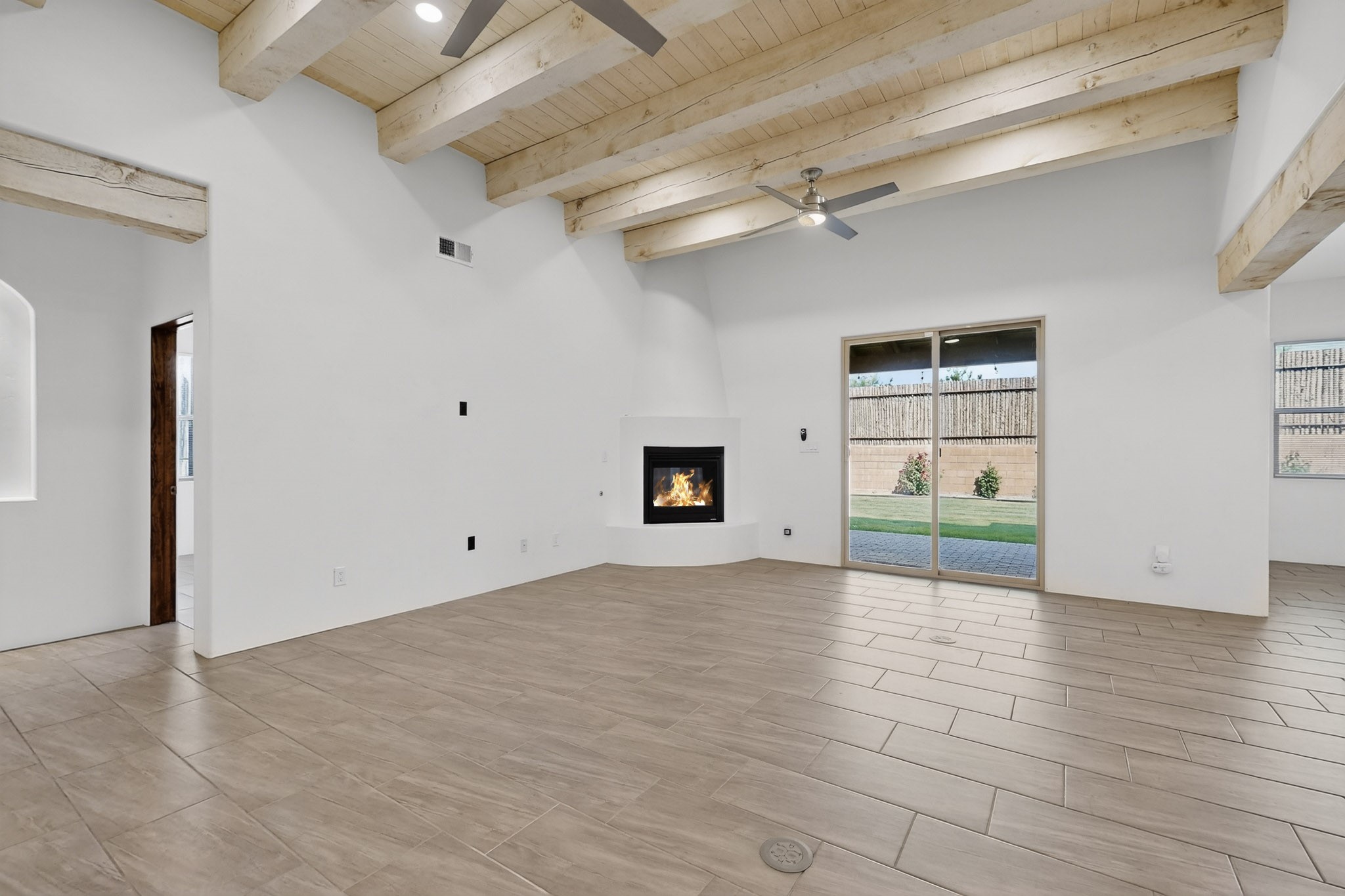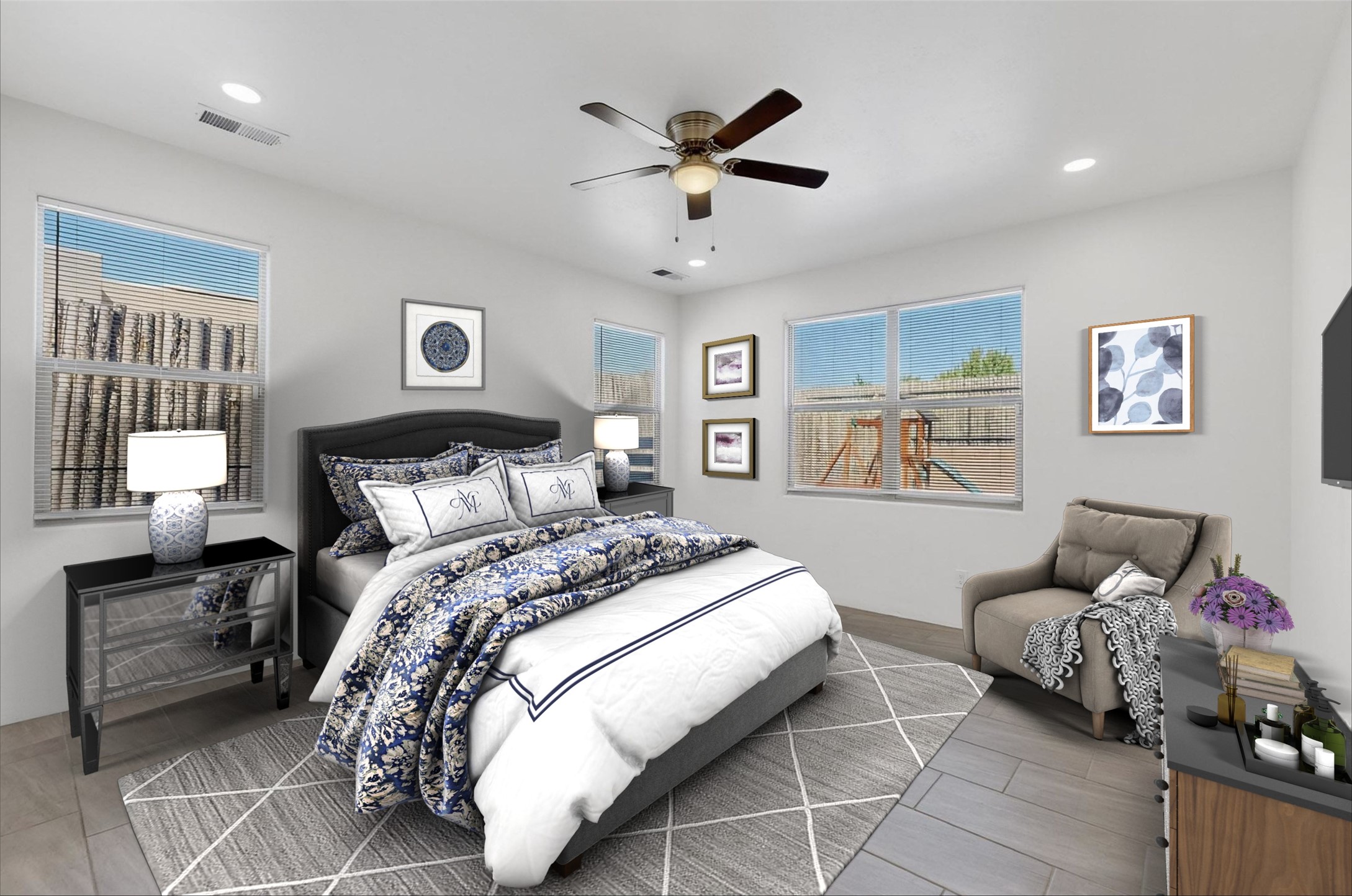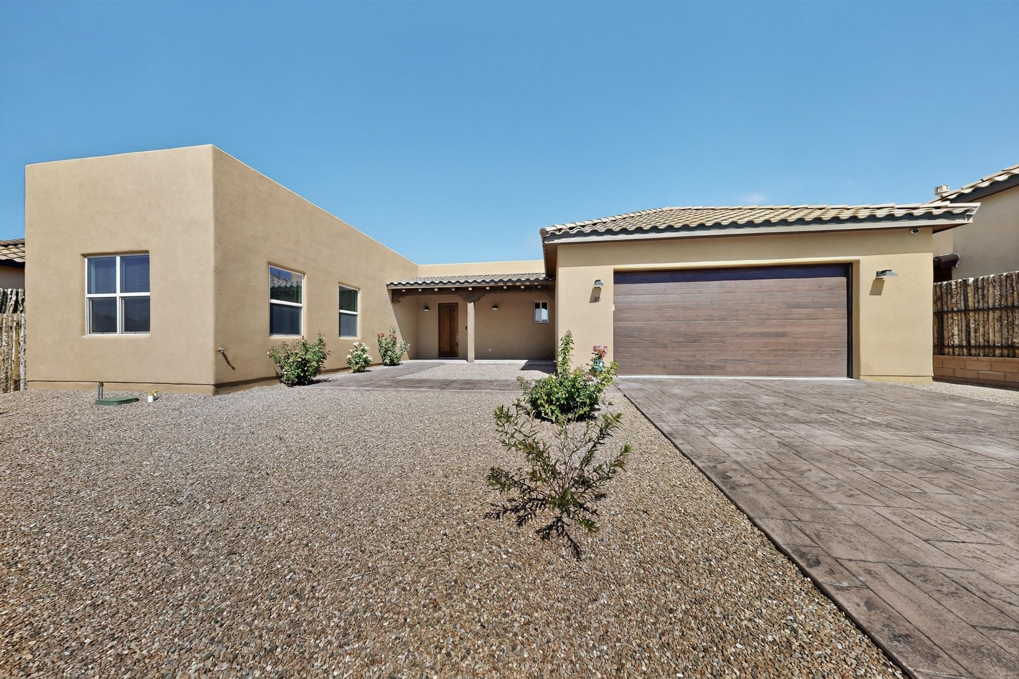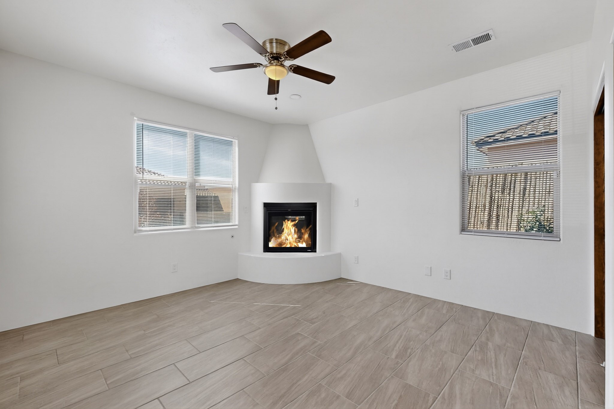 This San Miguel floor plan is a 2268 sq. ft. with 4 bedrooms and 2.5 baths located in the tranquil La Pradera community. The exterior has a pitched Spanish design with a clay tile roof and covered portals with heavy wood beams and brick pavers. The driveway is a colored stamped concrete design. The home is entered through an 8 ft. door to light wood-like porcelain floor tiles, with a powder room to the right and a hallway to the left with a nicho accented wall leading to the the 4th guest bedroom which could also serve as a wonderful office or media room with it's inviting kiva fireplace. The primary bath has a large walk-in shower with euro-style shower fixtures and an overhead rain shower head. There is also a very large oversized primary closet. The living room has white-stained beams and T&G trim and another kiva fireplace. The open kitchen has a separate dining area along with the bar seating. The insulated garage has 2 separate storage areas. The back yard is completely landscaped with established plantings which include roses bushes, grass, gravel and coyote fencing all around. This is a great home for all! Virtual staging and fires in fireplaces digitally created.