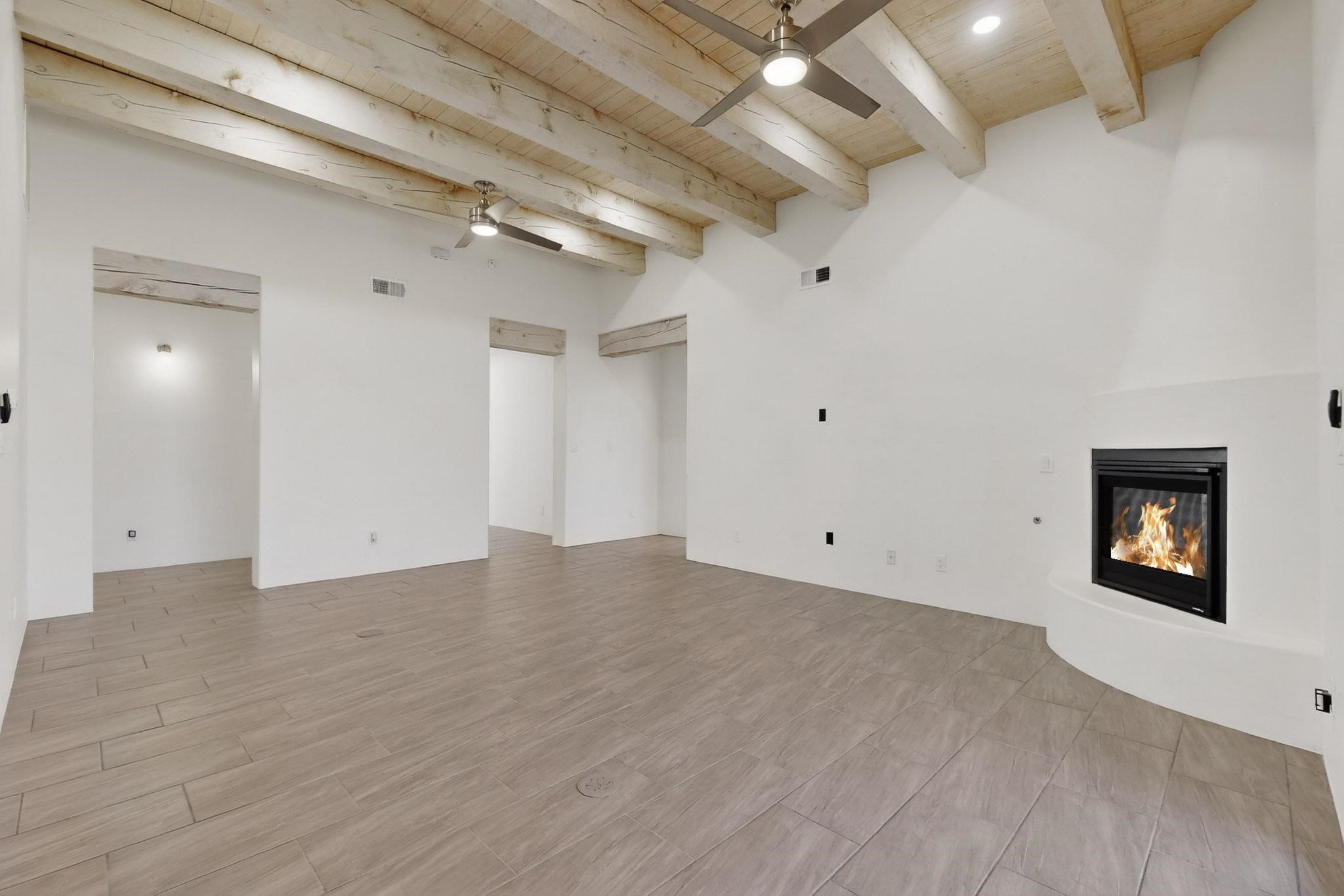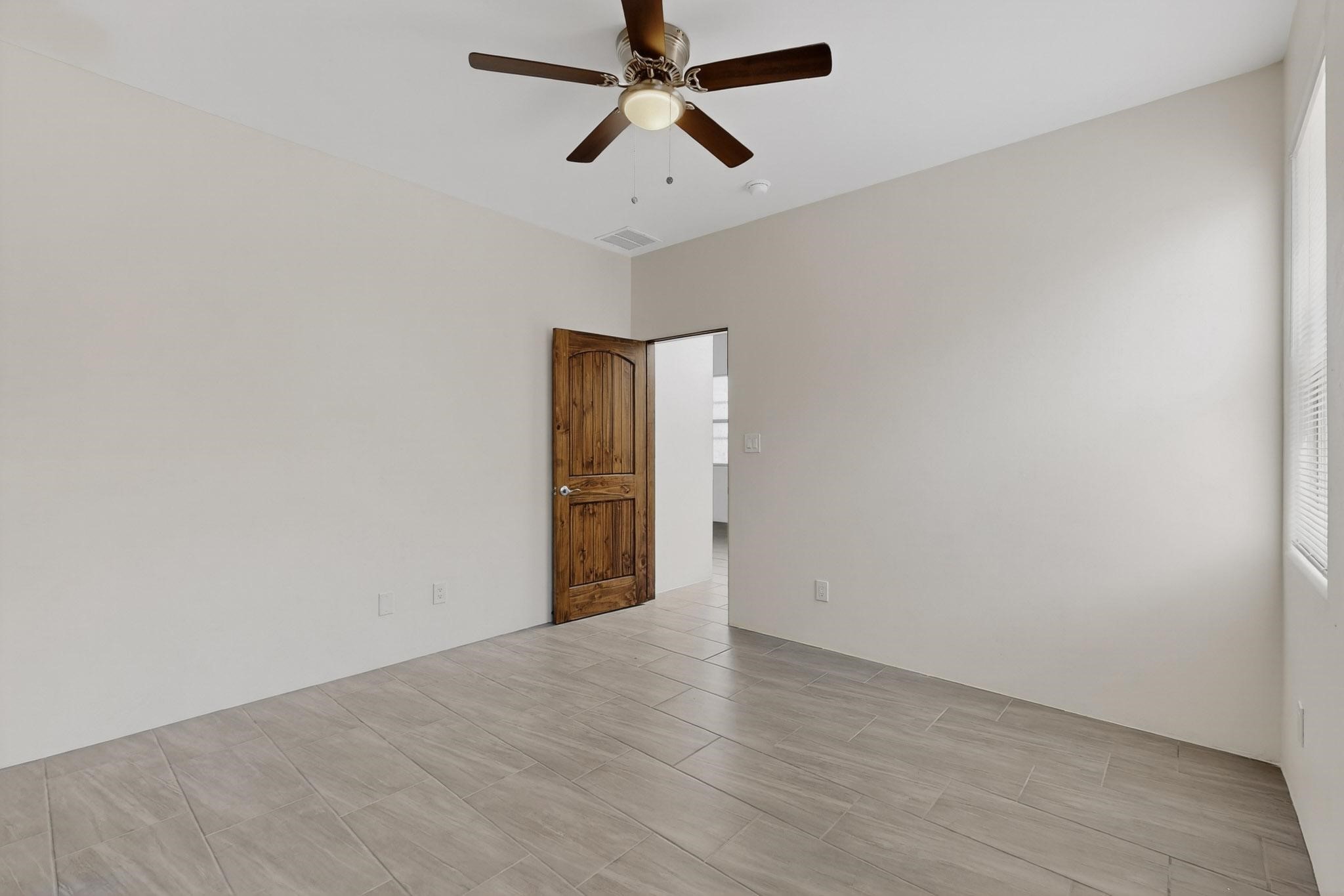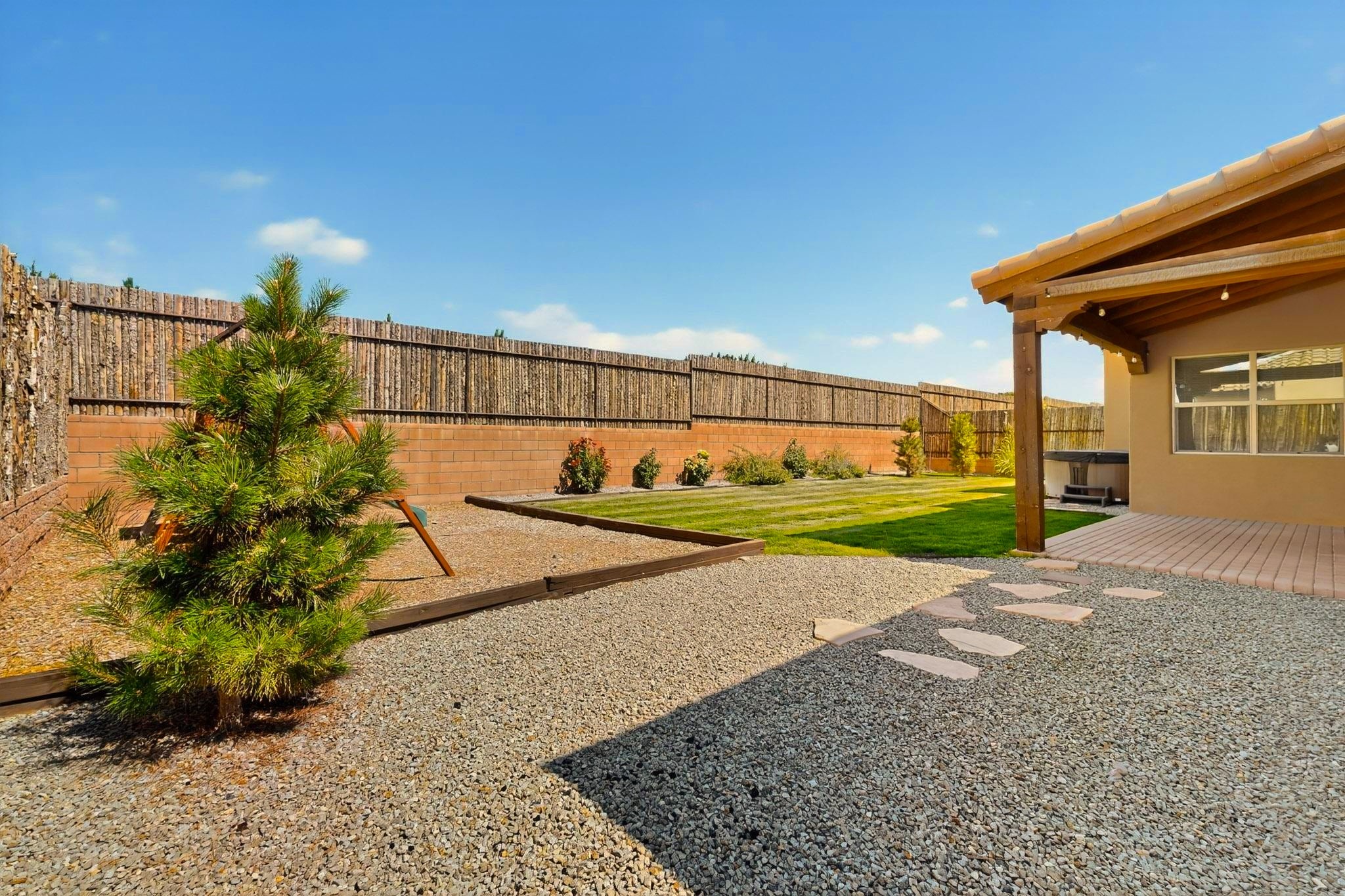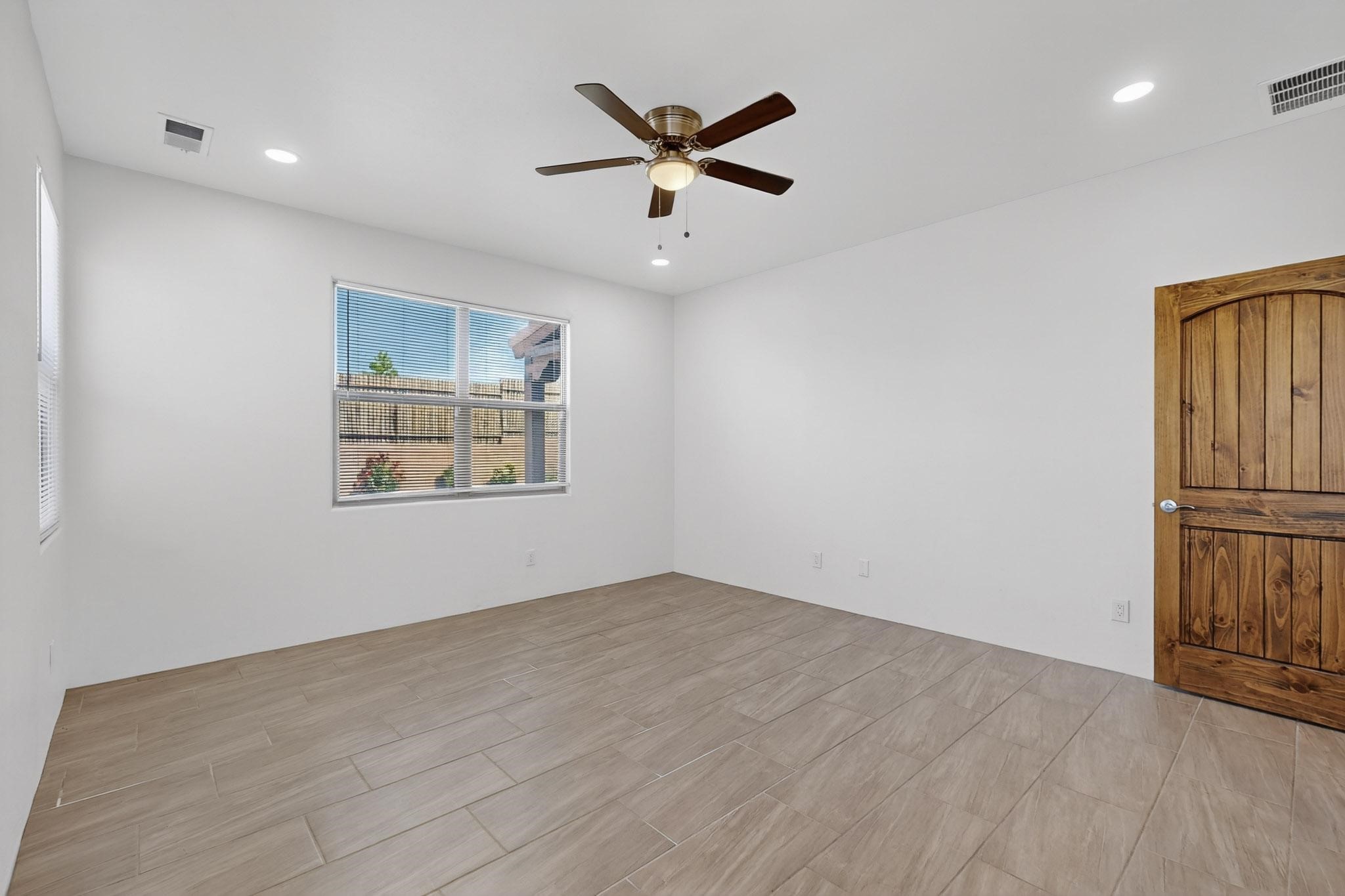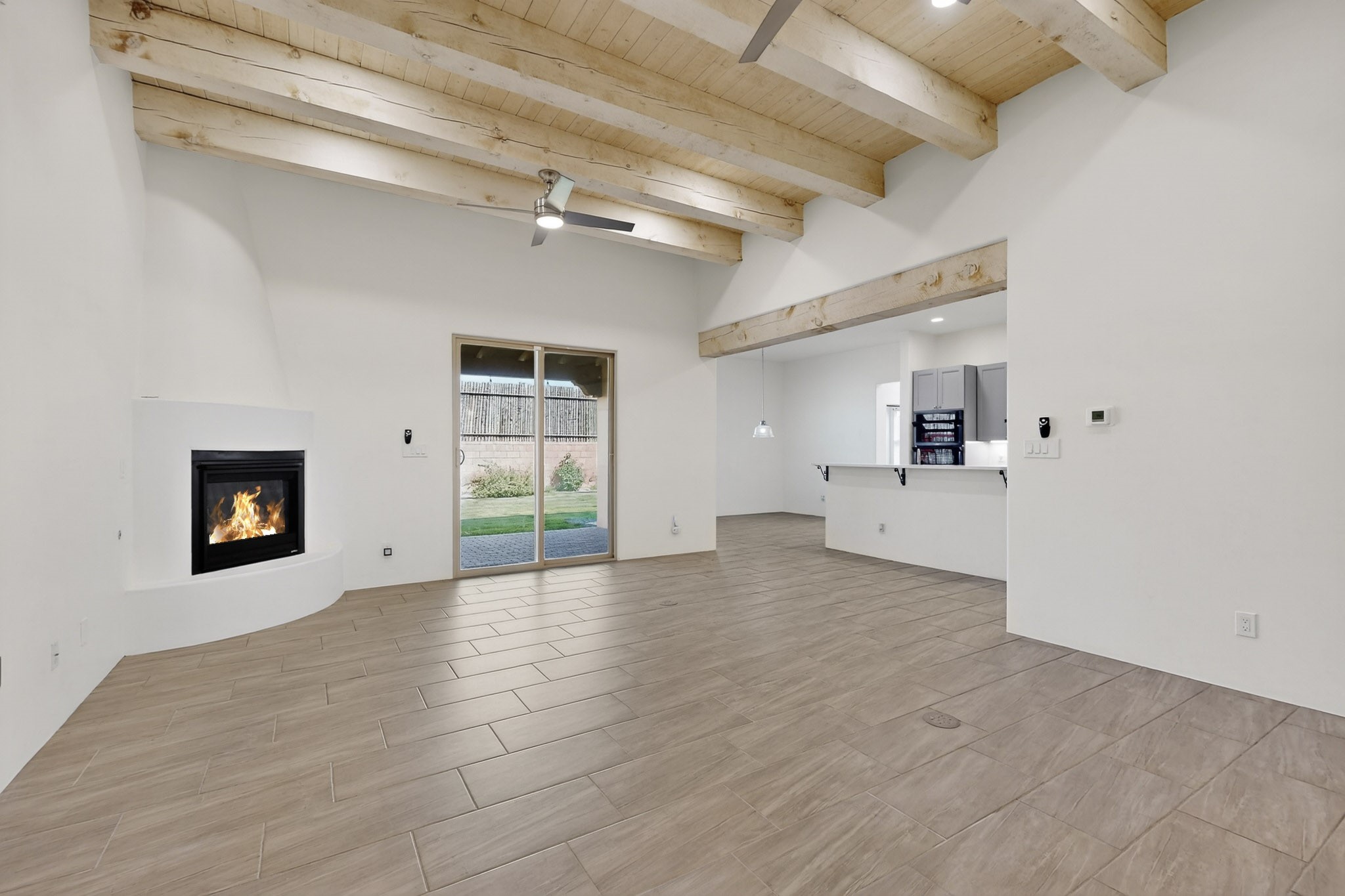 This San Miguel floor plan is a 2268 sq. ft. with 4 bedrooms and 2.5 baths located in the tranquil La Pradera community. The exterior has a pitched Spanish design with a clay tile roof and covered portals with heavy wood beams and brick pavers. The driveway is a colored stamped concrete design. The home is entered through an 8 ft. door to light wood-like porcelain floor tiles, with a powder room to the right and a hallway to the left with a nicho accented wall leading to the the 4th guest bedroom which could also serve as a wonderful office or media room with it's inviting kiva fireplace. The primary bath has a large walk-in shower with euro-style shower fixtures and an overhead rain shower head. There is also a very large oversized primary closet. The living room has white-stained beams and T&G trim and another kiva fireplace. The open kitchen has a separate dining area along with the bar seating. The insulated garage has 2 separate storage areas. The back yard is completely landscaped with established plantings which include roses bushes, grass, gravel and coyote fencing all around. This is a great home for all! Virtual staging and fires in fireplaces digitally created.