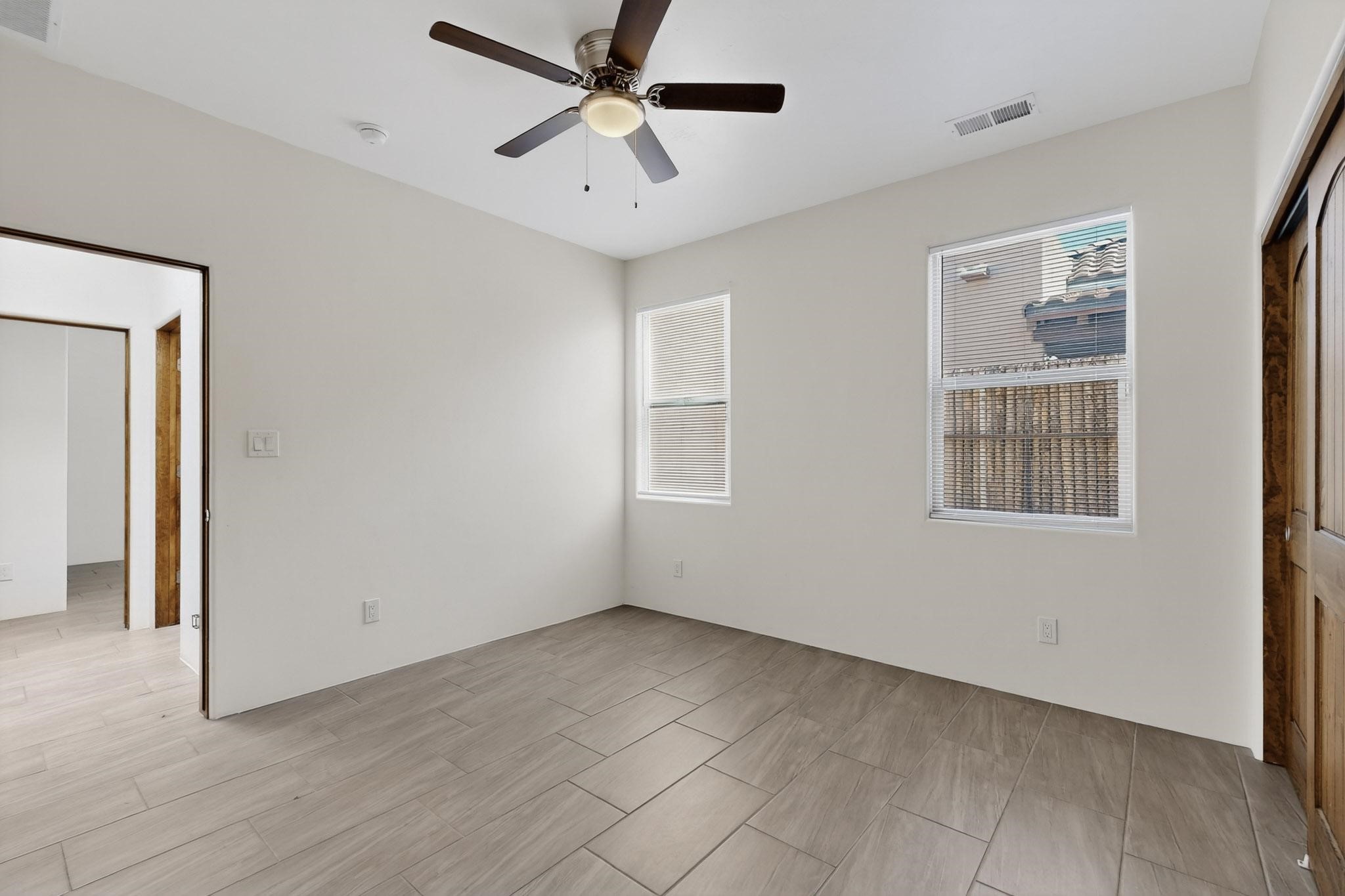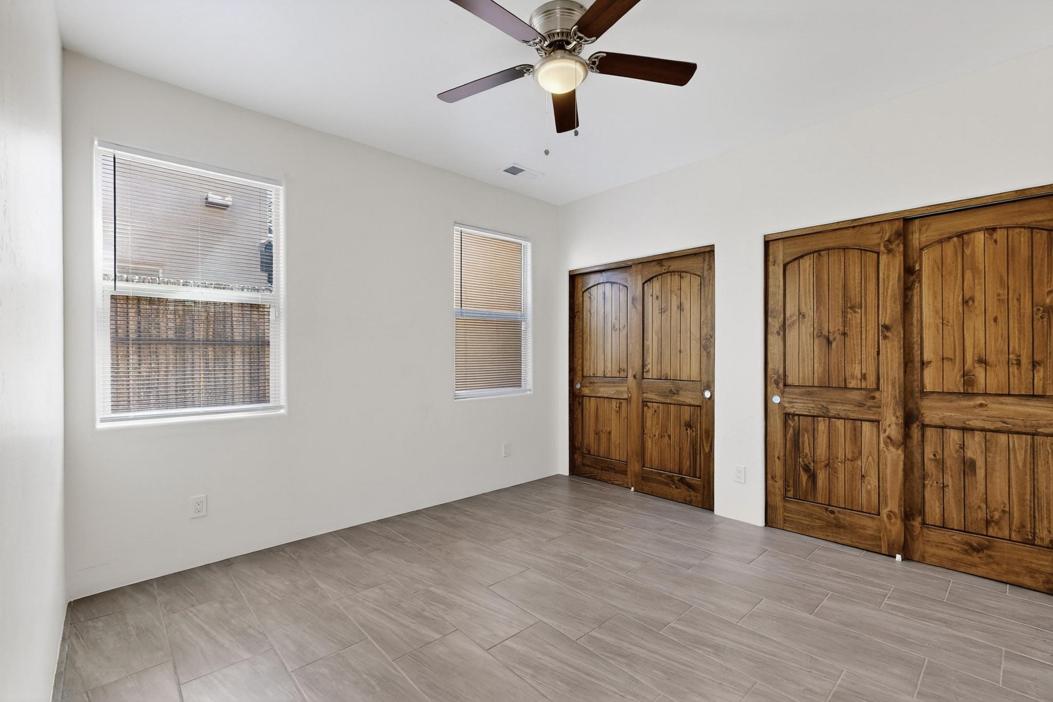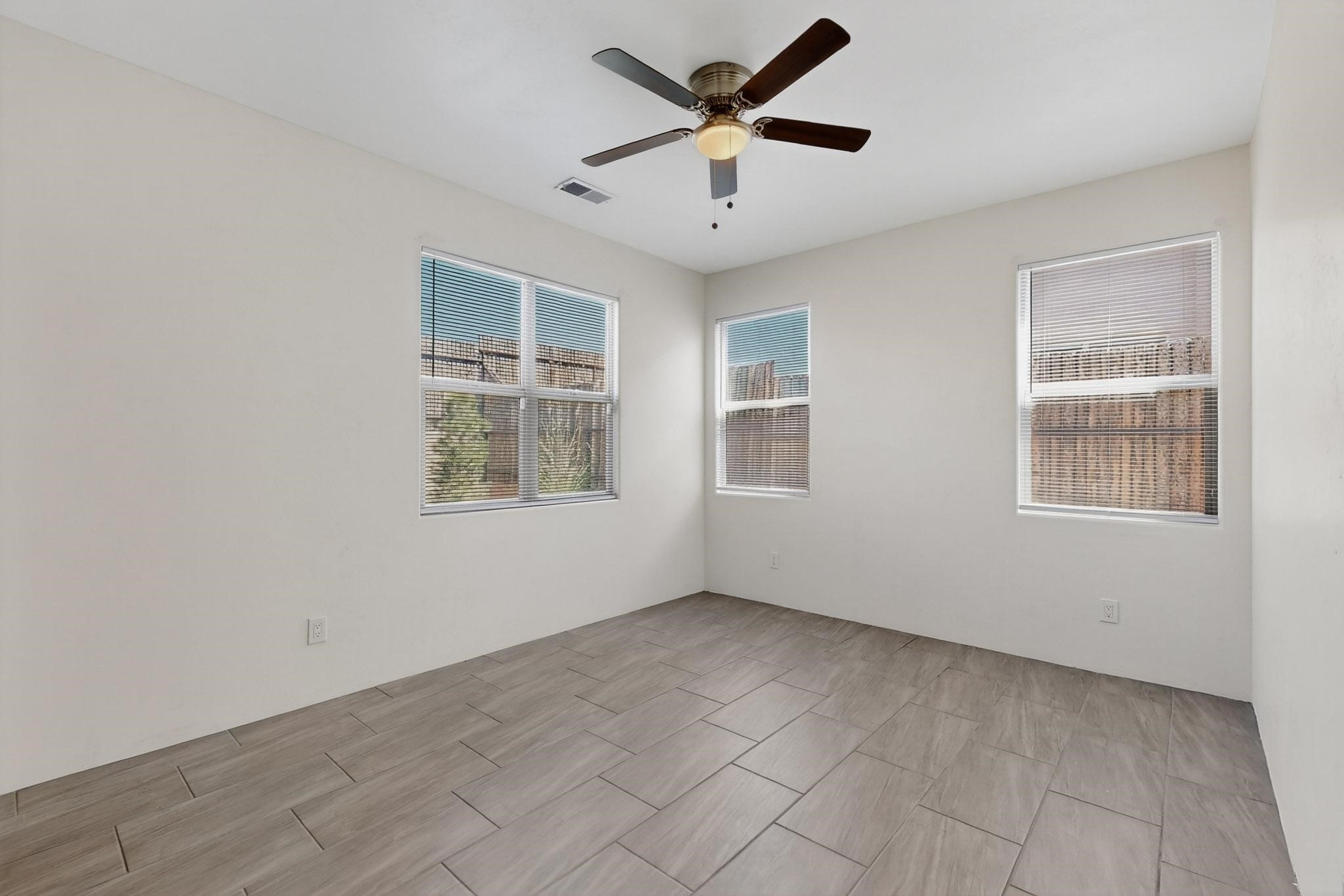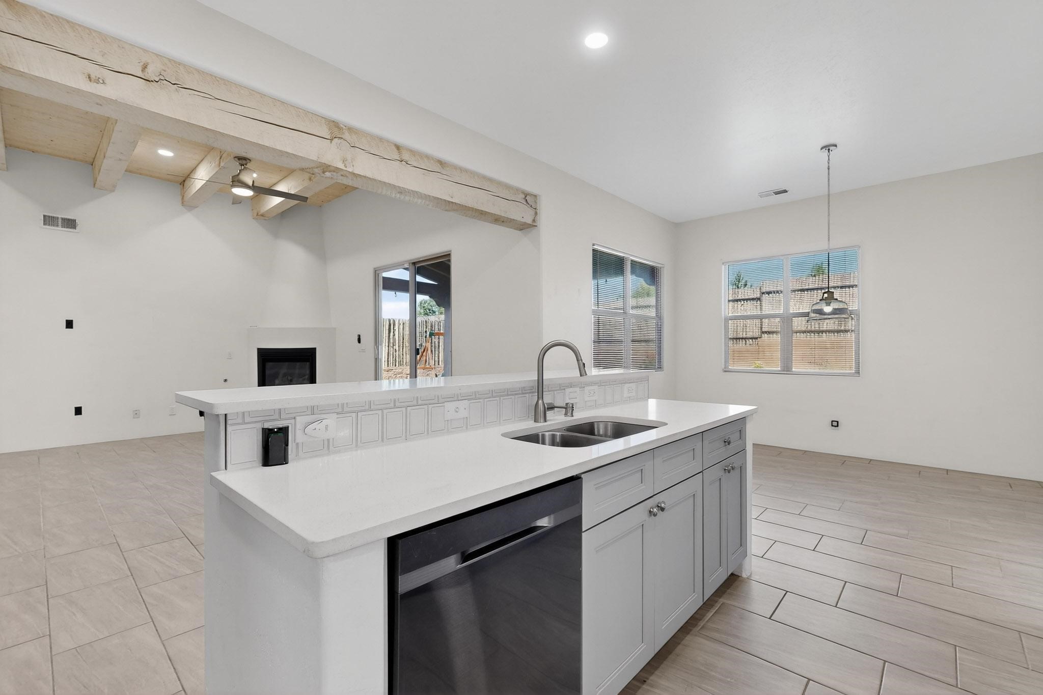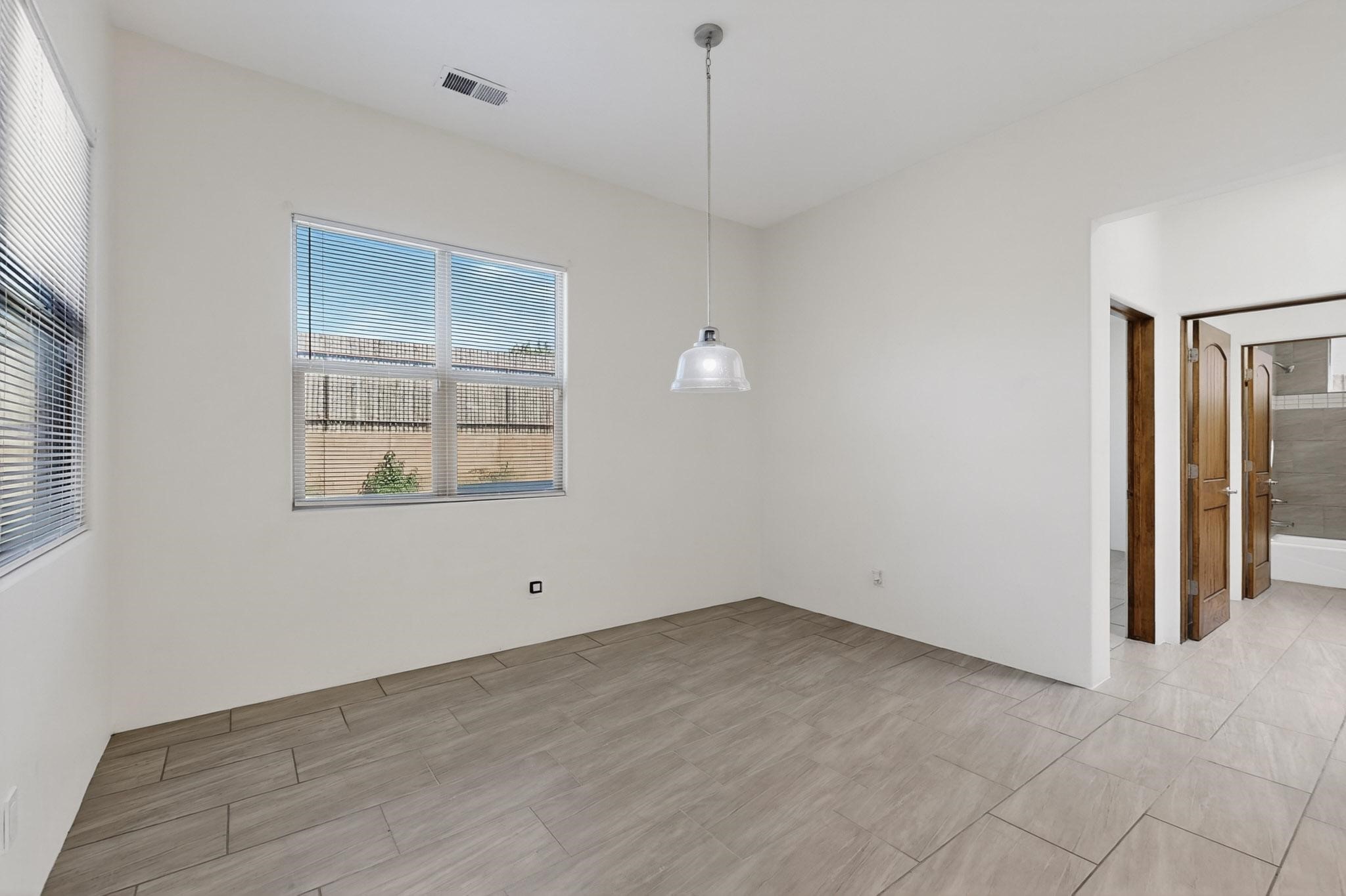 This San Miguel floor plan is a 2268 sq. ft. with 4 bedrooms and 2.5 baths located in the tranquil La Pradera community. The exterior has a pitched Spanish design with a clay tile roof and covered portals with heavy wood beams and brick pavers. The driveway is a colored stamped concrete design. The home is entered through an 8 ft. door to light wood-like porcelain floor tiles, with a powder room to the right and a hallway to the left with a nicho accented wall leading to the the 4th guest bedroom which could also serve as a wonderful office or media room with it's inviting kiva fireplace. The primary bath has a large walk-in shower with euro-style shower fixtures and an overhead rain shower head. There is also a very large oversized primary closet. The living room has white-stained beams and T&G trim and another kiva fireplace. The open kitchen has a separate dining area along with the bar seating. The insulated garage has 2 separate storage areas. The back yard is completely landscaped with established plantings which include roses bushes, grass, gravel and coyote fencing all around. This is a great home for all! Virtual staging and fires in fireplaces digitally created.
