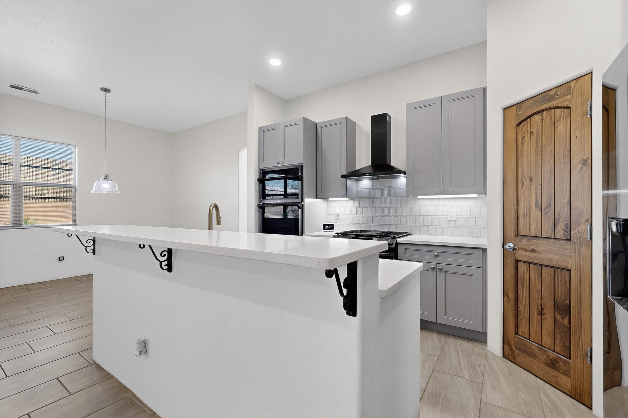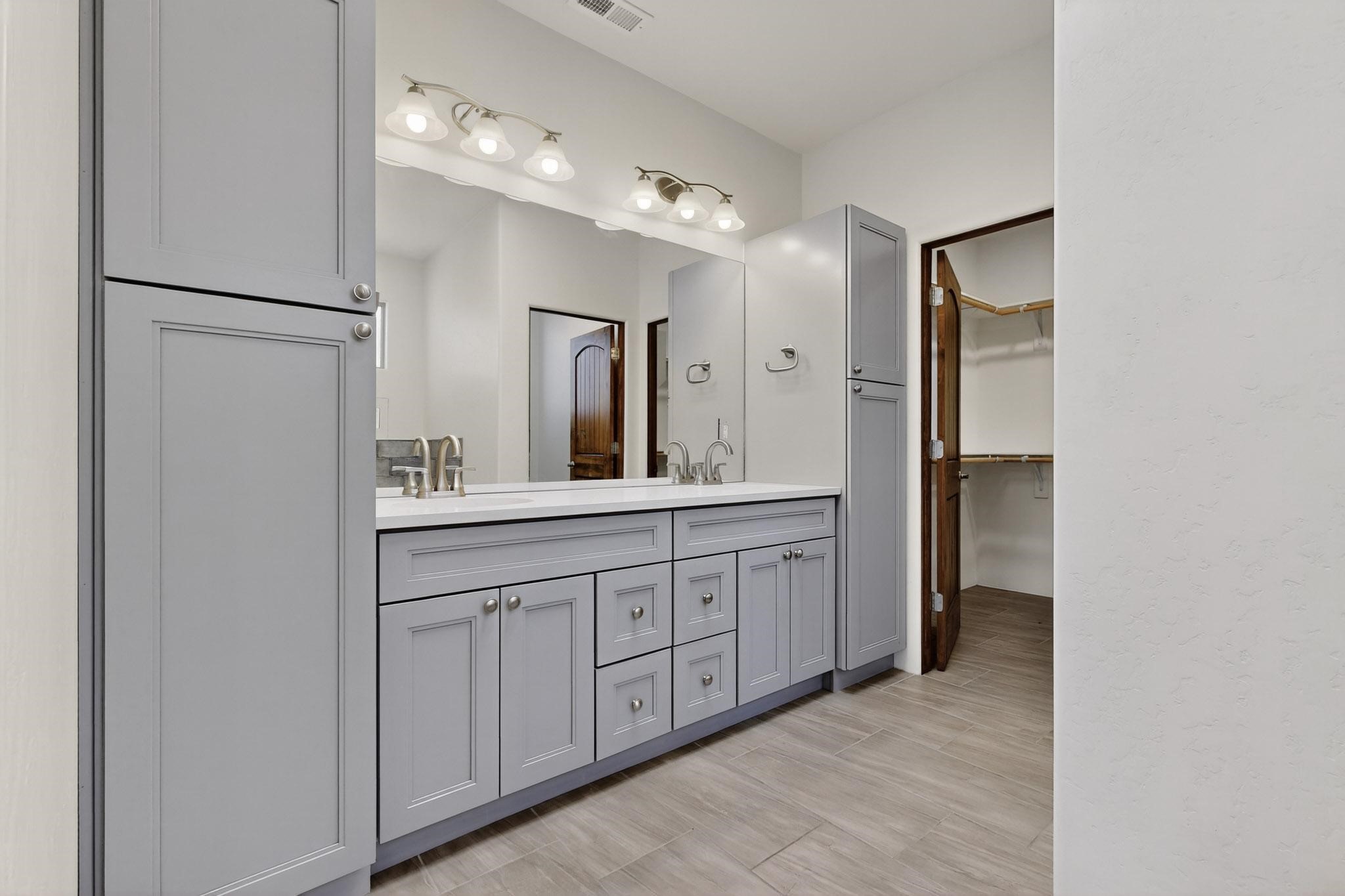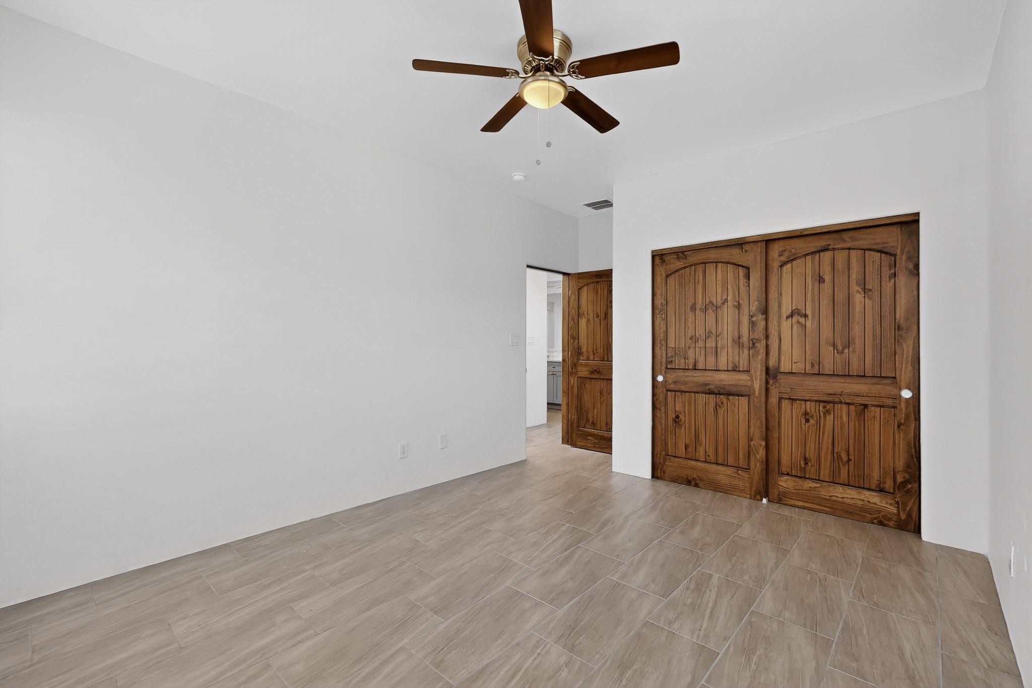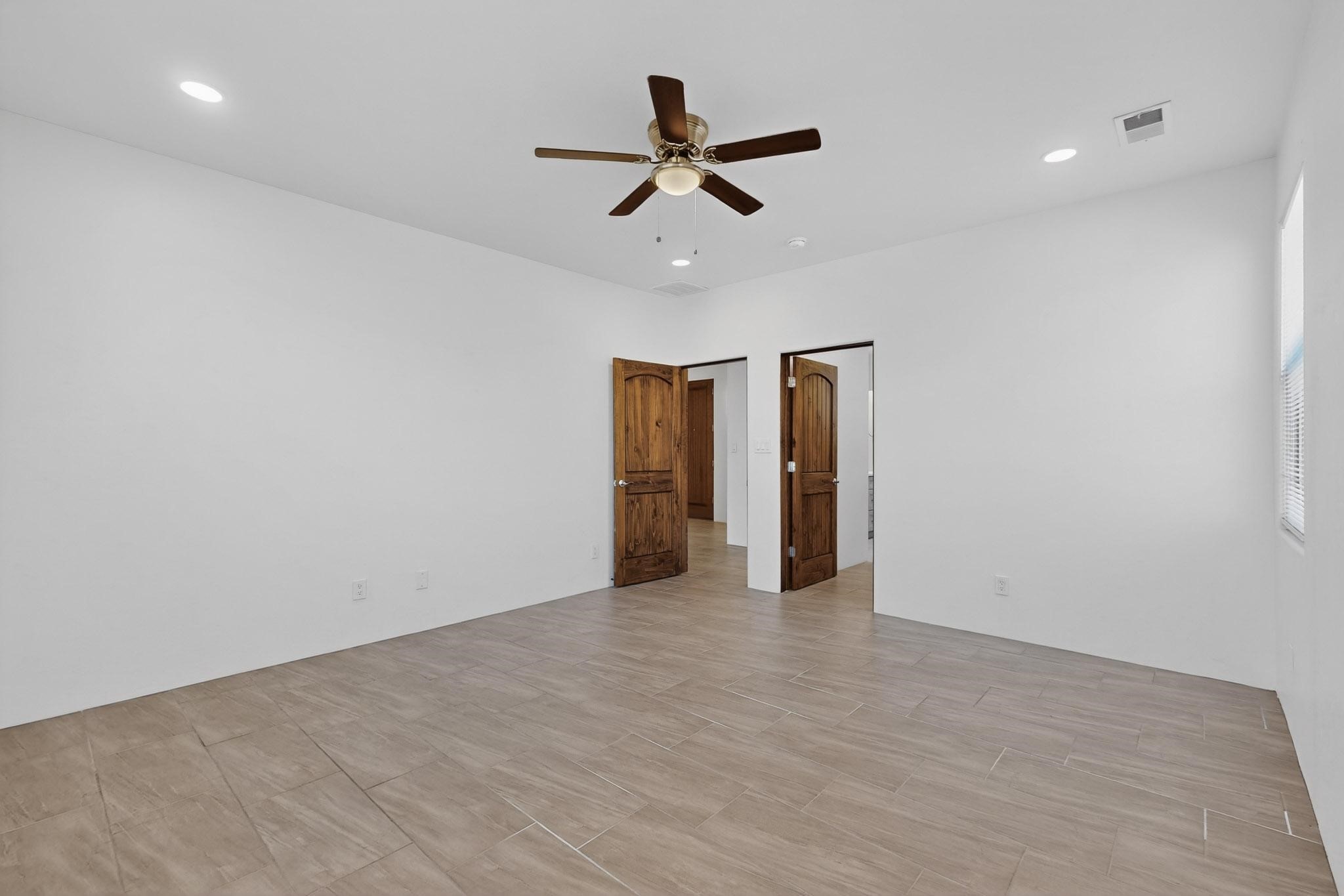 This San Miguel floor plan is a 2268 sq. ft. with 4 bedrooms and 2.5 baths located in the tranquil La Pradera community. The exterior has a pitched Spanish design with a clay tile roof and covered portals with heavy wood beams and brick pavers. The driveway is a colored stamped concrete design. The home is entered through an 8 ft. door to light wood-like porcelain floor tiles, with a powder room to the right and a hallway to the left with a nicho accented wall leading to the the 4th guest bedroom which could also serve as a wonderful office or media room with it's inviting kiva fireplace. The primary bath has a large walk-in shower with euro-style shower fixtures and an overhead rain shower head. There is also a very large oversized primary closet. The living room has white-stained beams and T&G trim and another kiva fireplace. The open kitchen has a separate dining area along with the bar seating. The insulated garage has 2 separate storage areas. The back yard is completely landscaped with established plantings which include roses bushes, grass, gravel and coyote fencing all around. This is a great home for all! Virtual staging and fires in fireplaces digitally created.