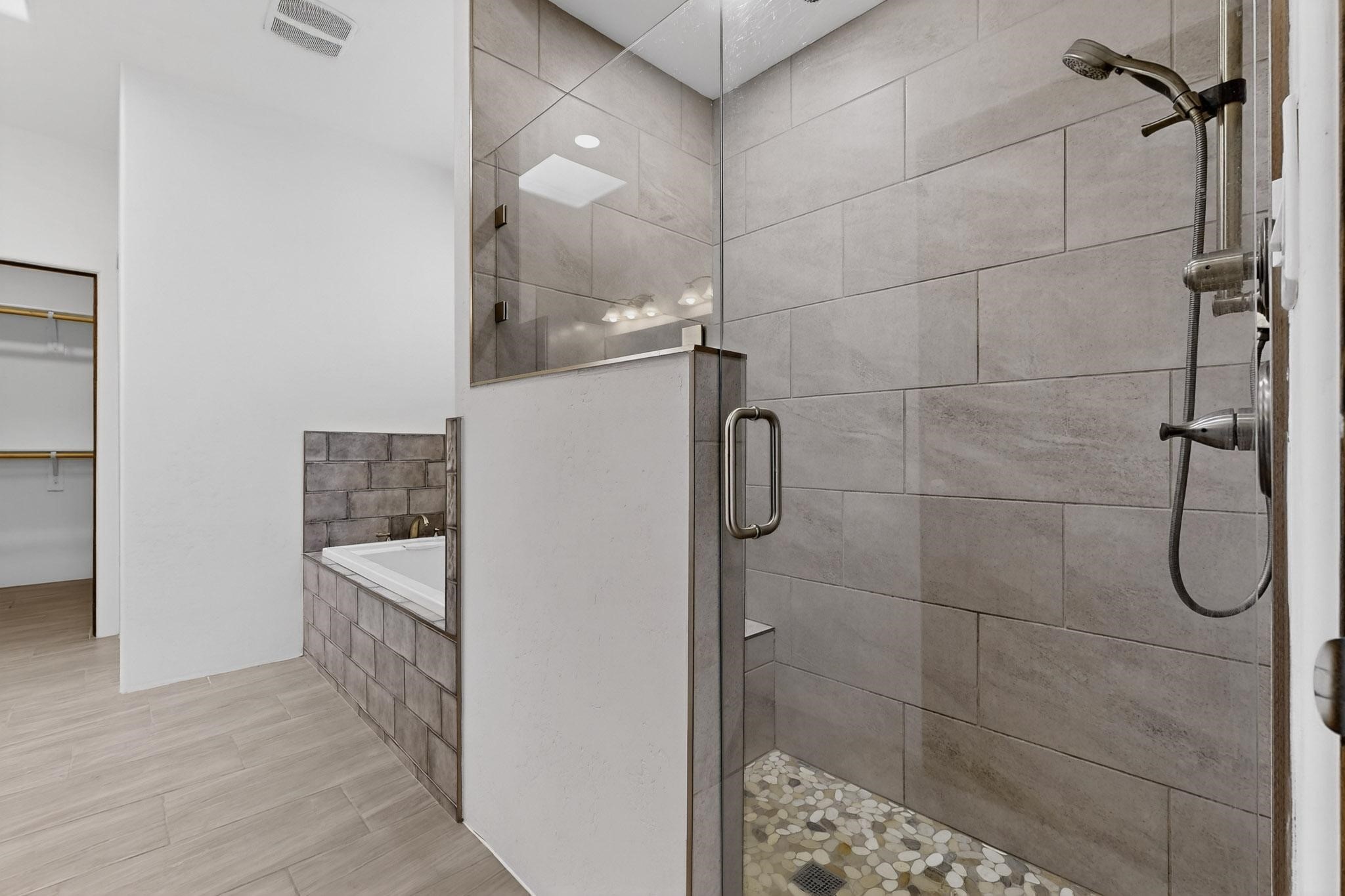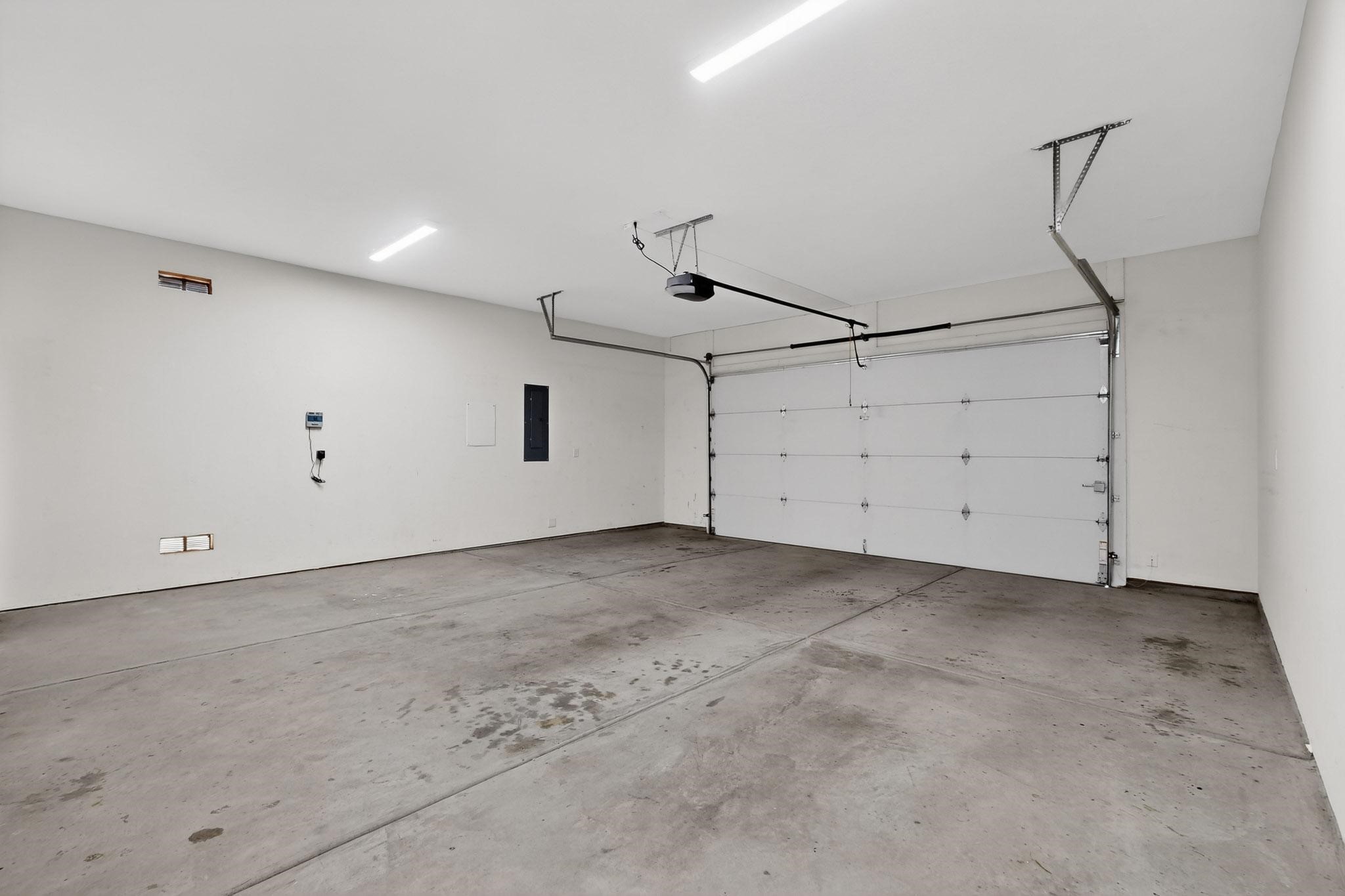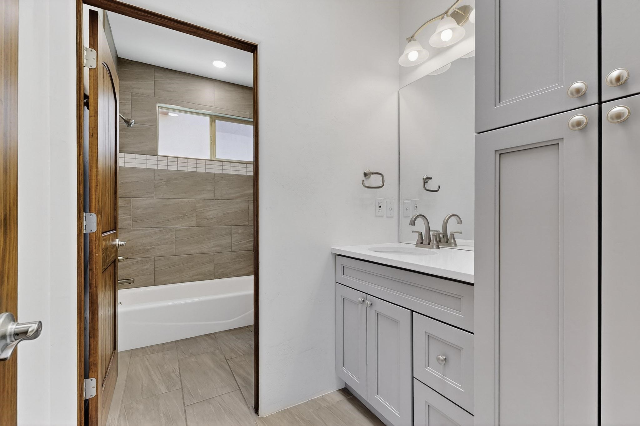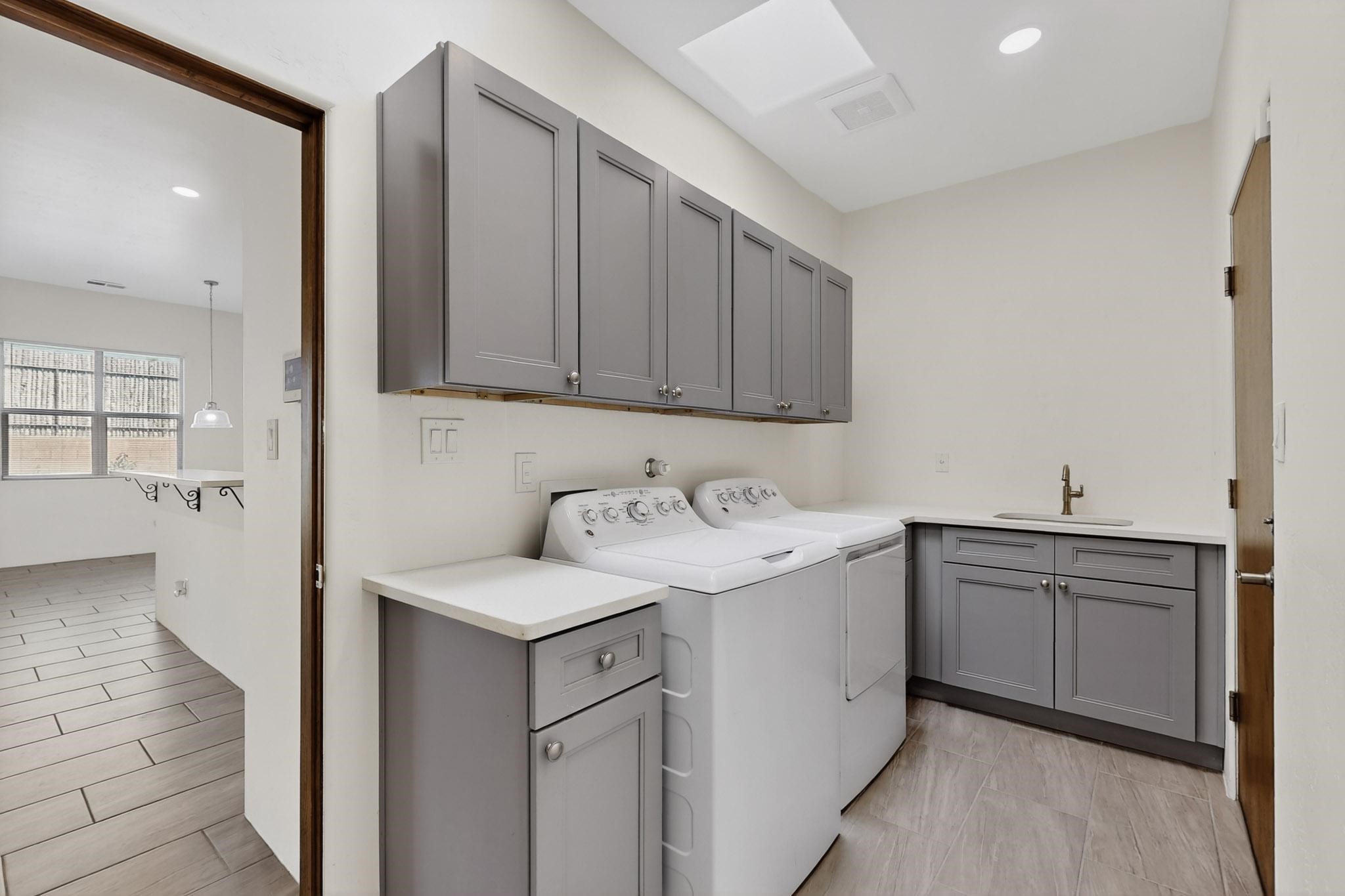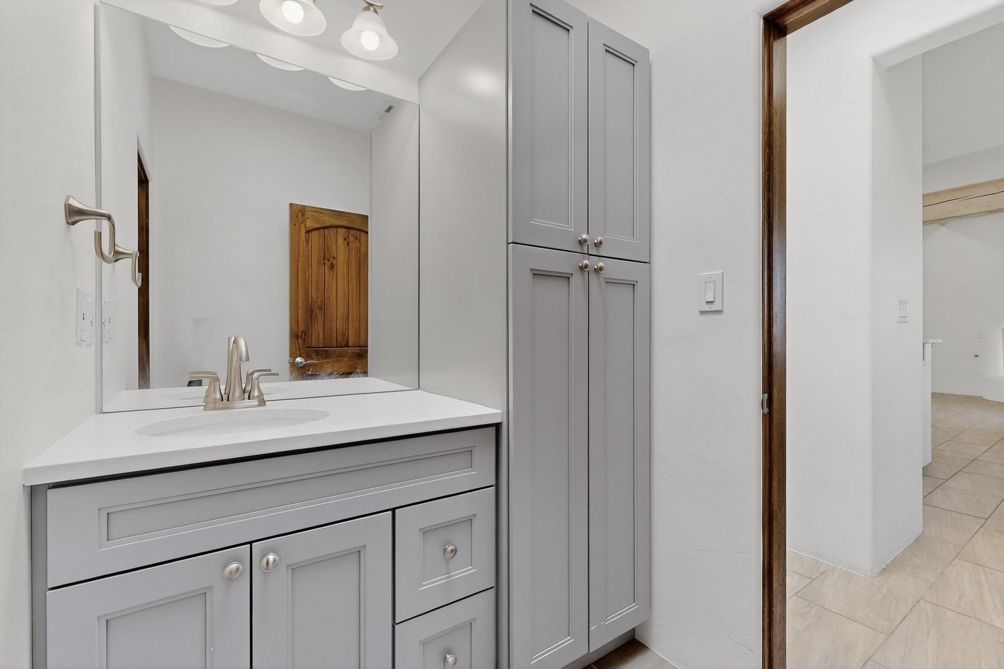 This San Miguel floor plan is a 2268 sq. ft. with 4 bedrooms and 2.5 baths located in the tranquil La Pradera community. The exterior has a pitched Spanish design with a clay tile roof and covered portals with heavy wood beams and brick pavers. The driveway is a colored stamped concrete design. The home is entered through an 8 ft. door to light wood-like porcelain floor tiles, with a powder room to the right and a hallway to the left with a nicho accented wall leading to the the 4th guest bedroom which could also serve as a wonderful office or media room with it's inviting kiva fireplace. The primary bath has a large walk-in shower with euro-style shower fixtures and an overhead rain shower head. There is also a very large oversized primary closet. The living room has white-stained beams and T&G trim and another kiva fireplace. The open kitchen has a separate dining area along with the bar seating. The insulated garage has 2 separate storage areas. The back yard is completely landscaped with established plantings which include roses bushes, grass, gravel and coyote fencing all around. This is a great home for all! Virtual staging and fires in fireplaces digitally created.