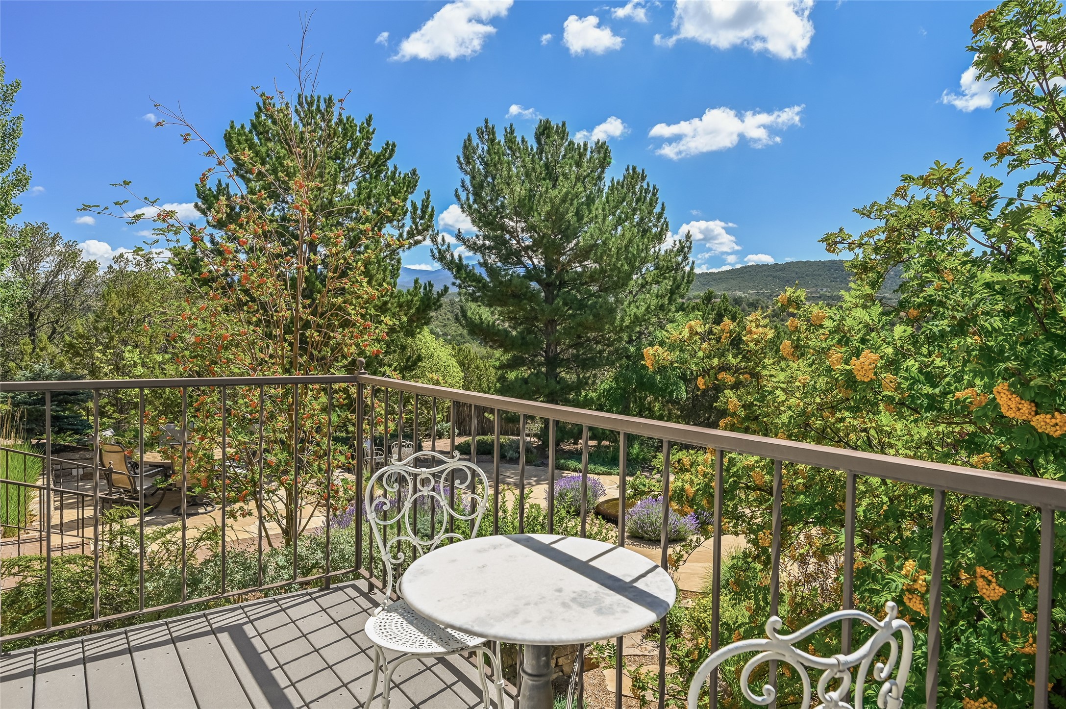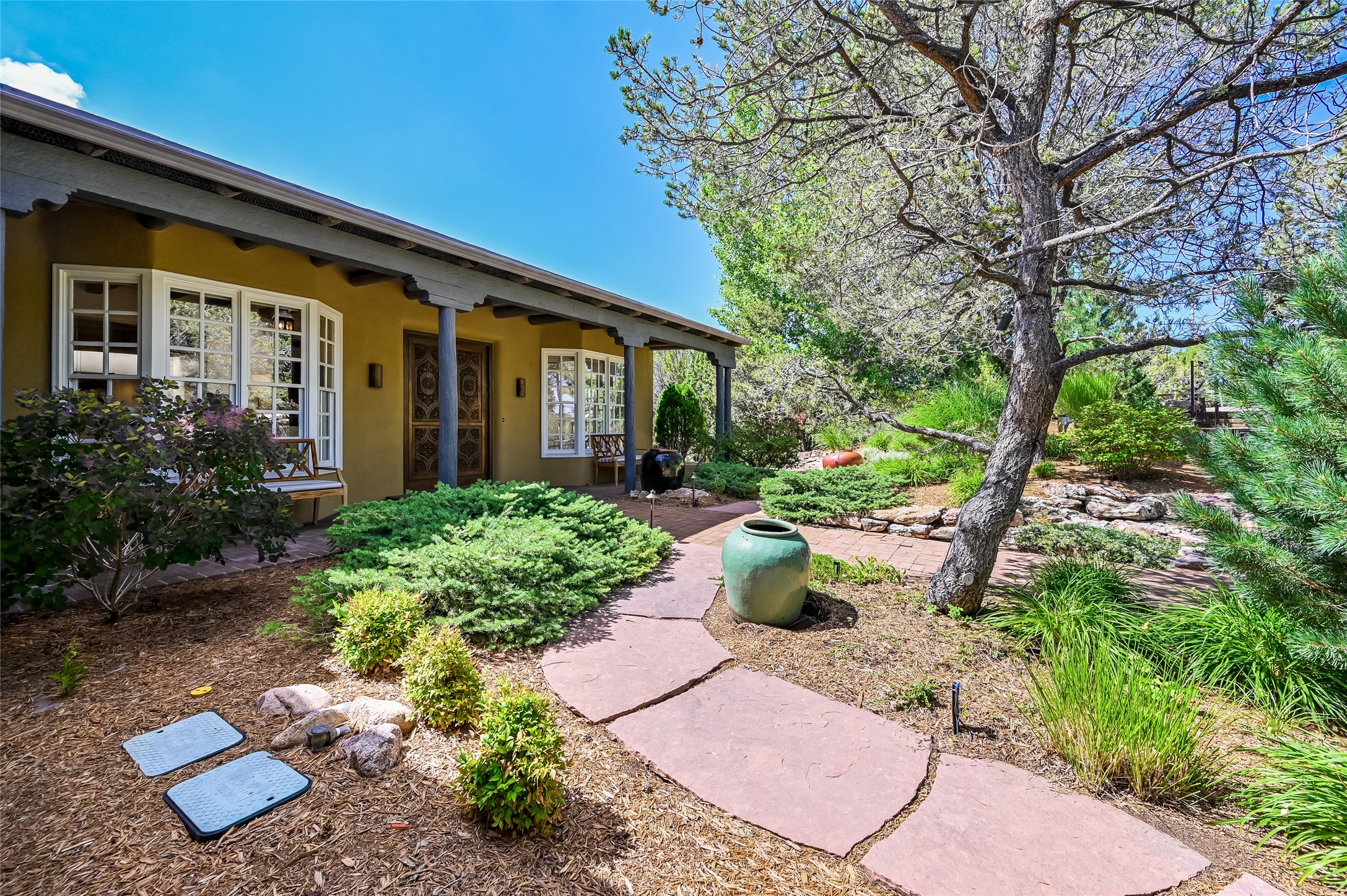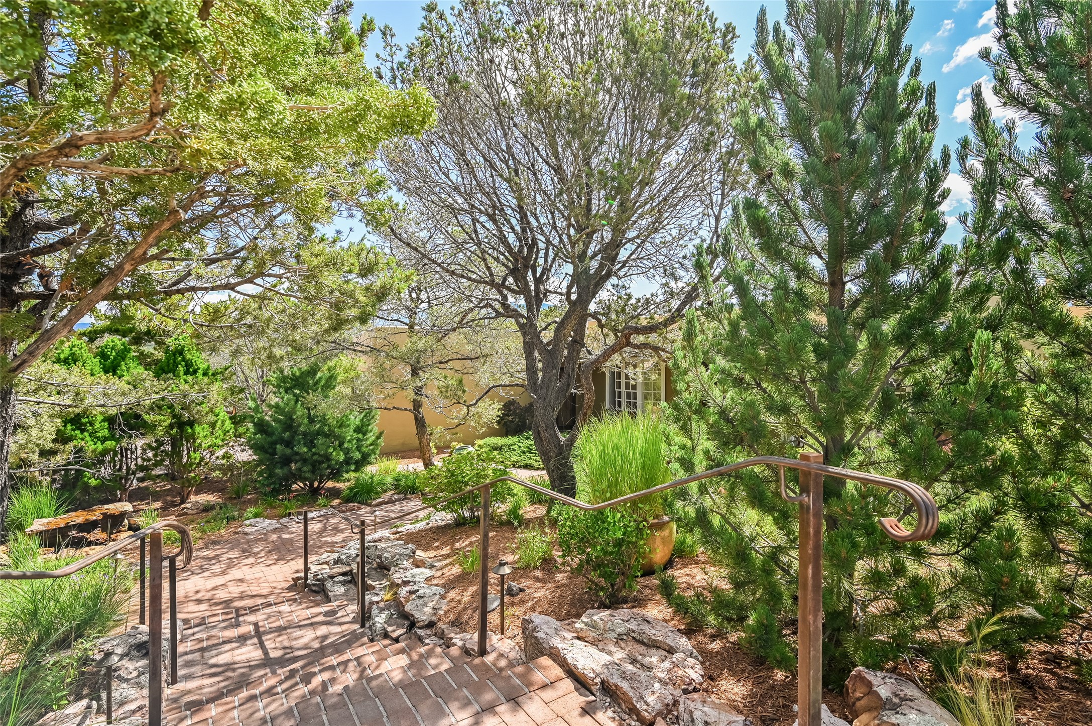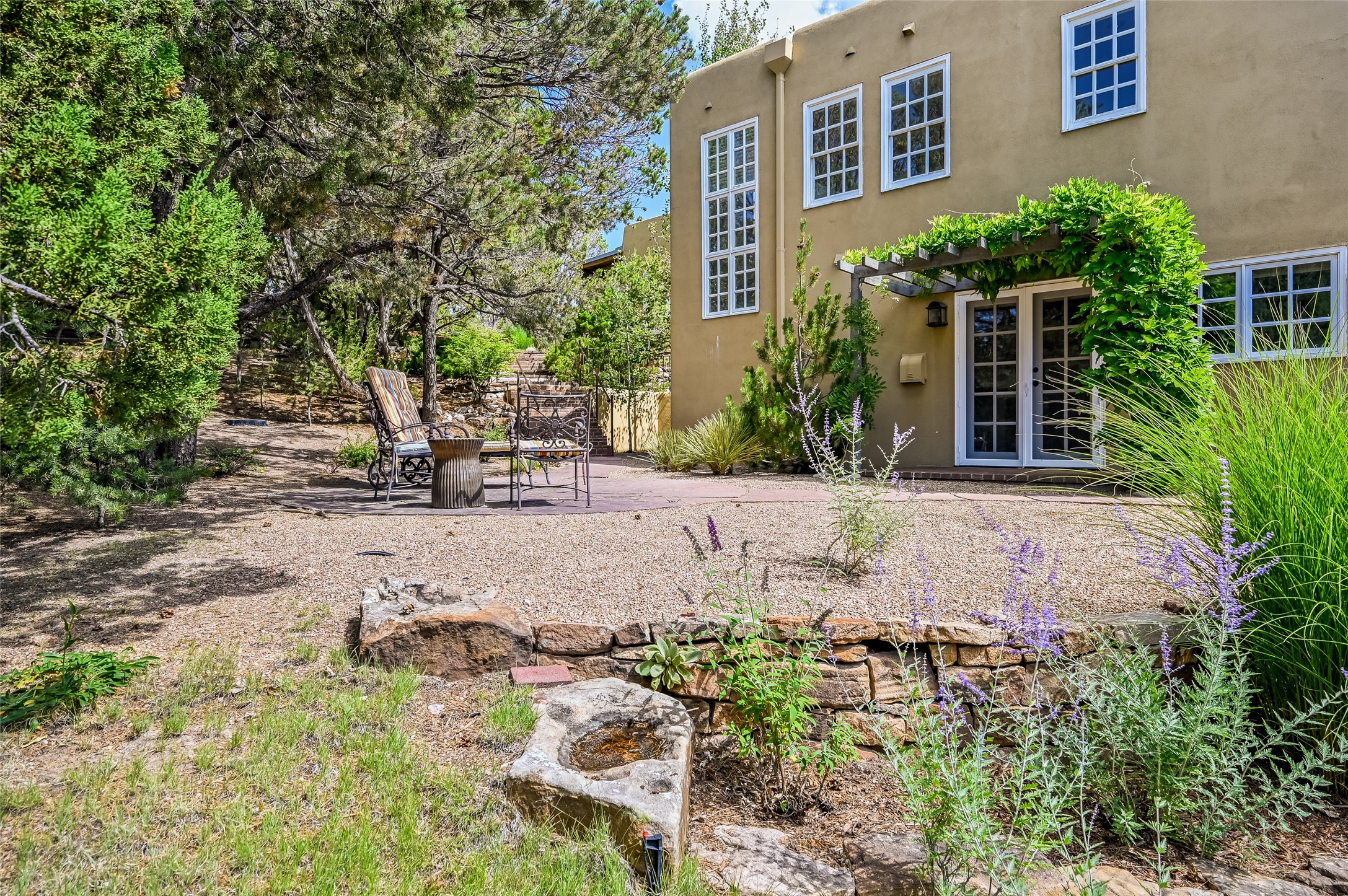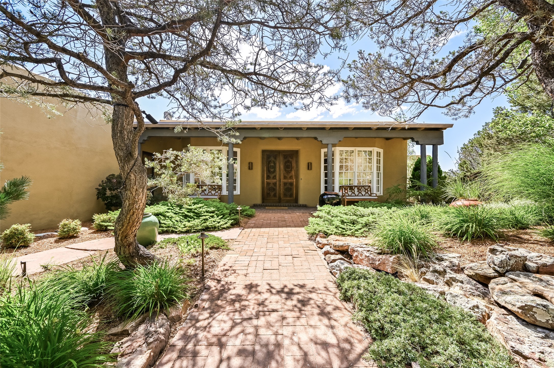 This classic Pueblo-style home with expansive views embraces symmetry and elegance, blending historic character with modern comforts. Inside, 4 fireplaces, brick and wood floors set a warm foundation for three generous living spaces, one of which could easily transform into a private third bedroom suite. Coved ceilings and architectural detailing add refinement throughout.The extra-large primary suite is a true retreat, featuring its own fireplace, private access to surrounding patios, an updated bathroom, and a nicely sized closet. It's also worth noting that there is only one step on the main level!The property's 1.60-acre grounds are a lush sanctuary, graced with water features, mature landscaping, and a greenhouse for year-round gardening. A solar system offsets most of the electric costs, offering both sustainability and efficiency.An office with built-ins provides a dedicated work space, while the lower-level guest casita--complete with its own kitchenette, bathroom, living room, large bedroom, and 2 private entrances--offers ideal accommodations for extended family, guests, caretaker or a potential rental.Just minutes from downtown yet set against a backdrop of panoramic vistas, this Old World residence combines timeless Pueblo charm with a lifestyle of ease and beauty.