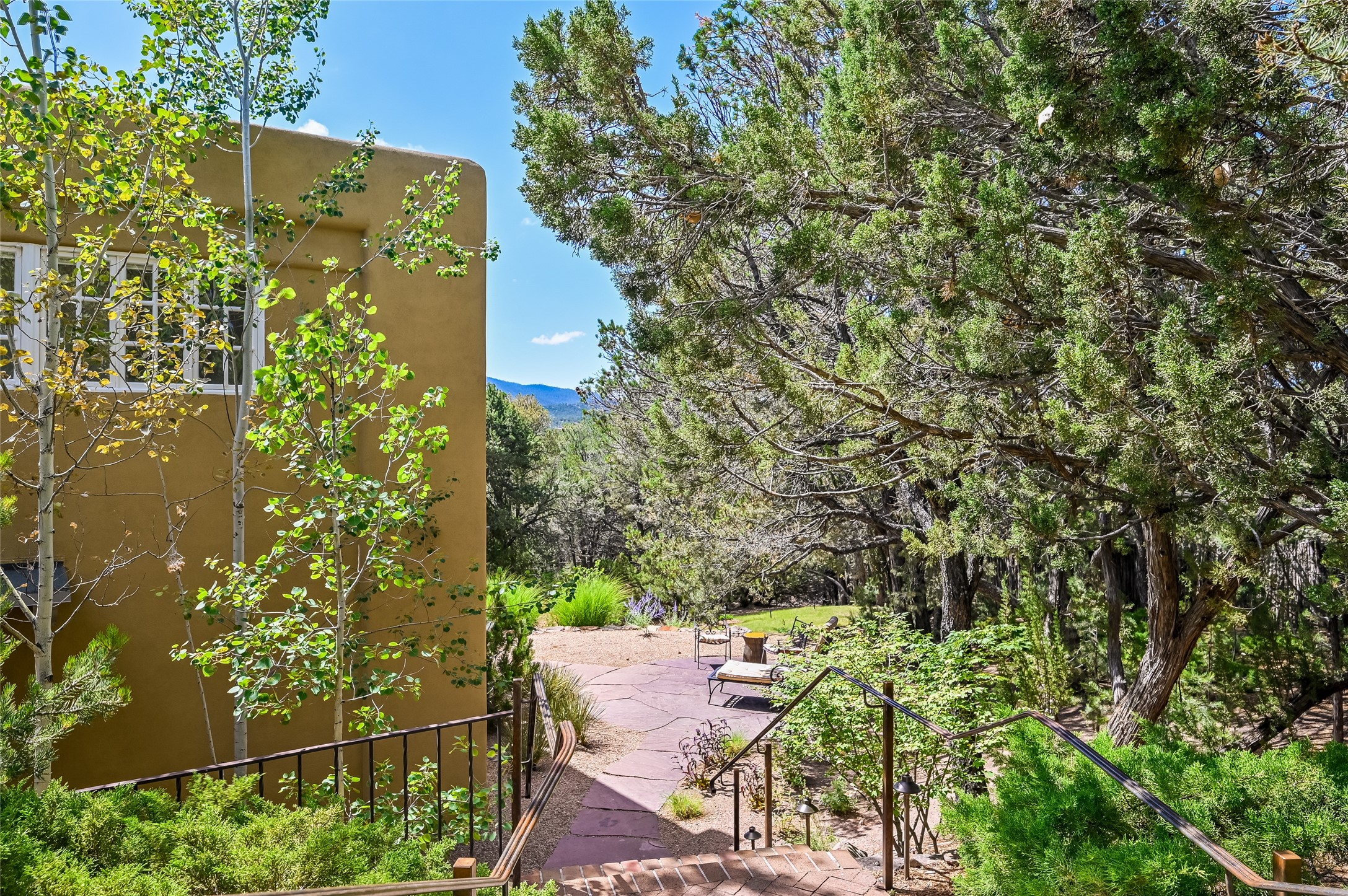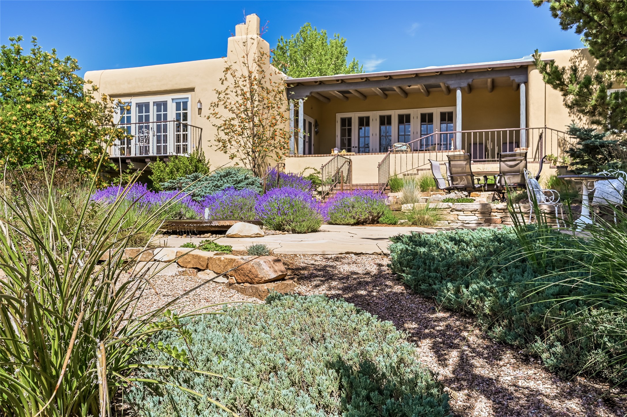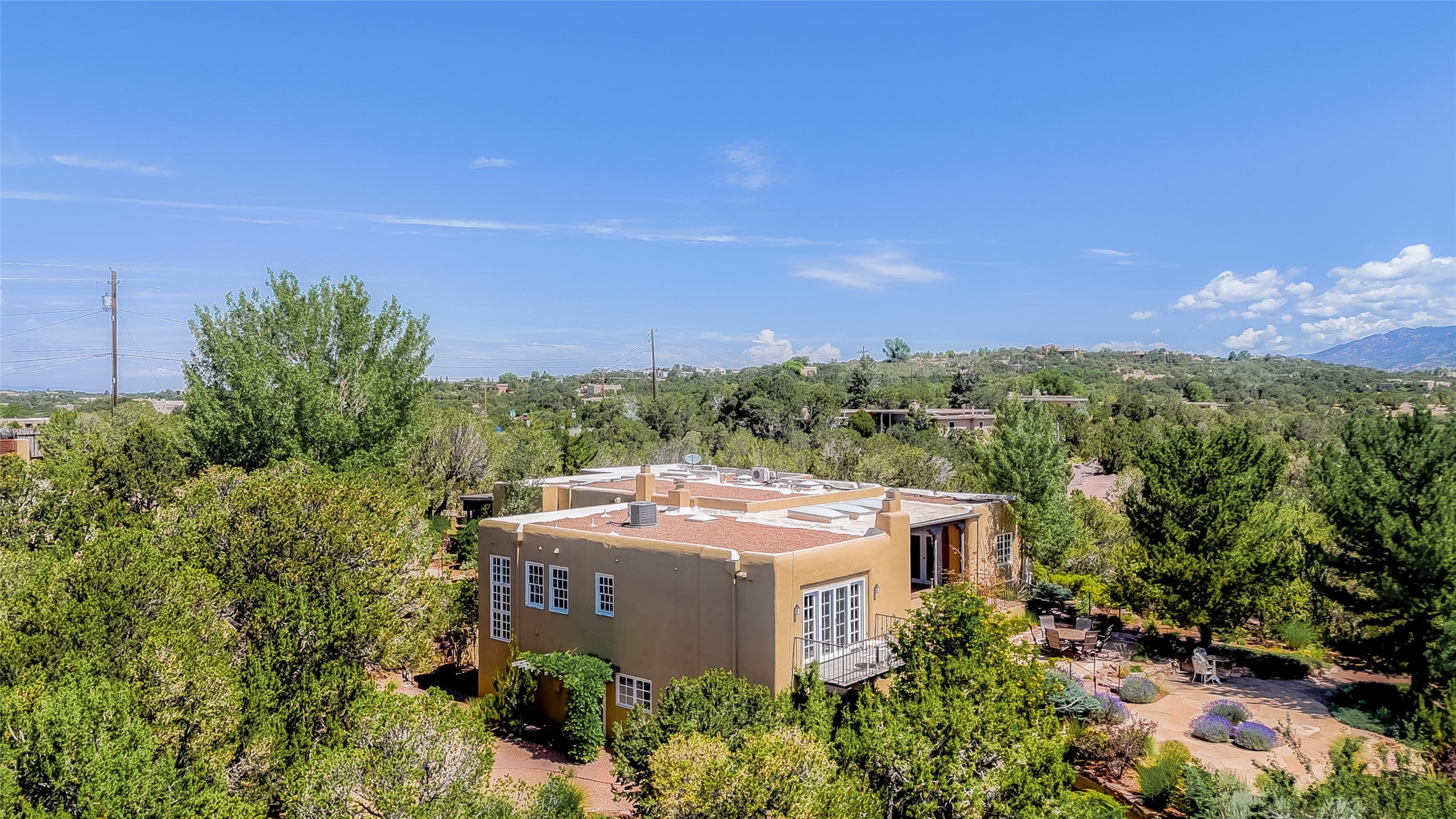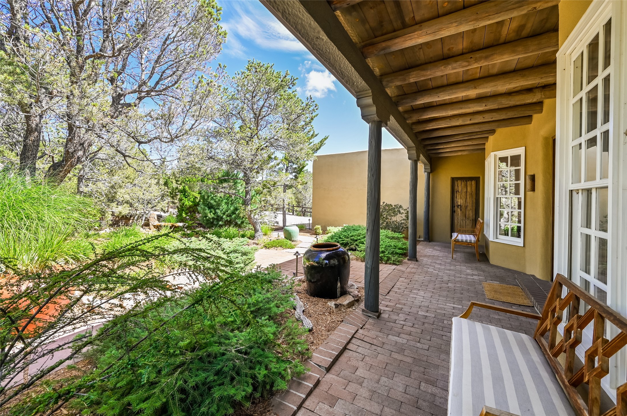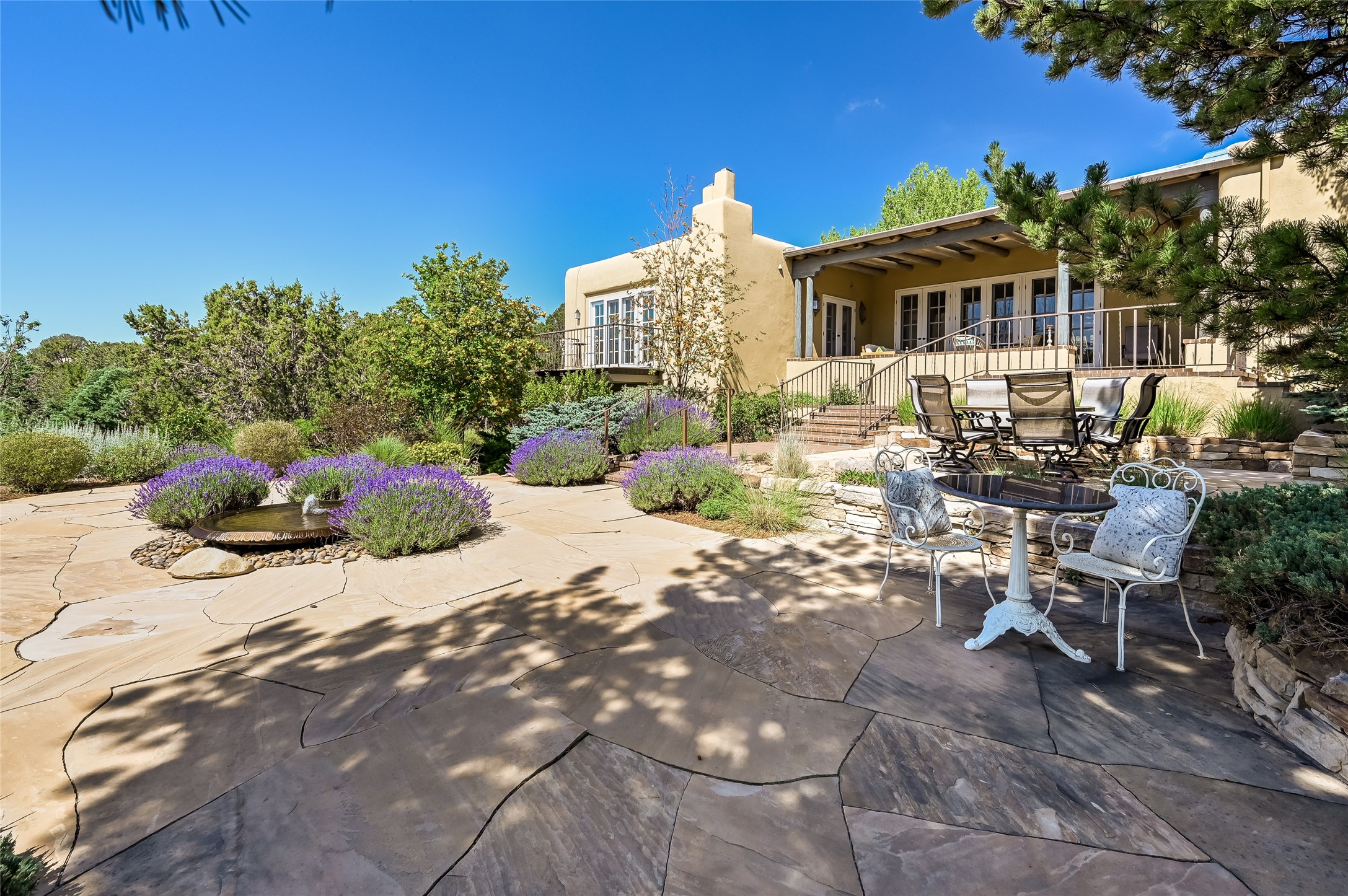 This classic Pueblo-style home with expansive views embraces symmetry and elegance, blending historic character with modern comforts. Inside, 4 fireplaces, brick and wood floors set a warm foundation for three generous living spaces, one of which could easily transform into a private third bedroom suite. Coved ceilings and architectural detailing add refinement throughout.The extra-large primary suite is a true retreat, featuring its own fireplace, private access to surrounding patios, an updated bathroom, and a nicely sized closet. It's also worth noting that there is only one step on the main level!The property's 1.60-acre grounds are a lush sanctuary, graced with water features, mature landscaping, and a greenhouse for year-round gardening. A solar system offsets most of the electric costs, offering both sustainability and efficiency.An office with built-ins provides a dedicated work space, while the lower-level guest casita--complete with its own kitchenette, bathroom, living room, large bedroom, and 2 private entrances--offers ideal accommodations for extended family, guests, caretaker or a potential rental.Just minutes from downtown yet set against a backdrop of panoramic vistas, this Old World residence combines timeless Pueblo charm with a lifestyle of ease and beauty.