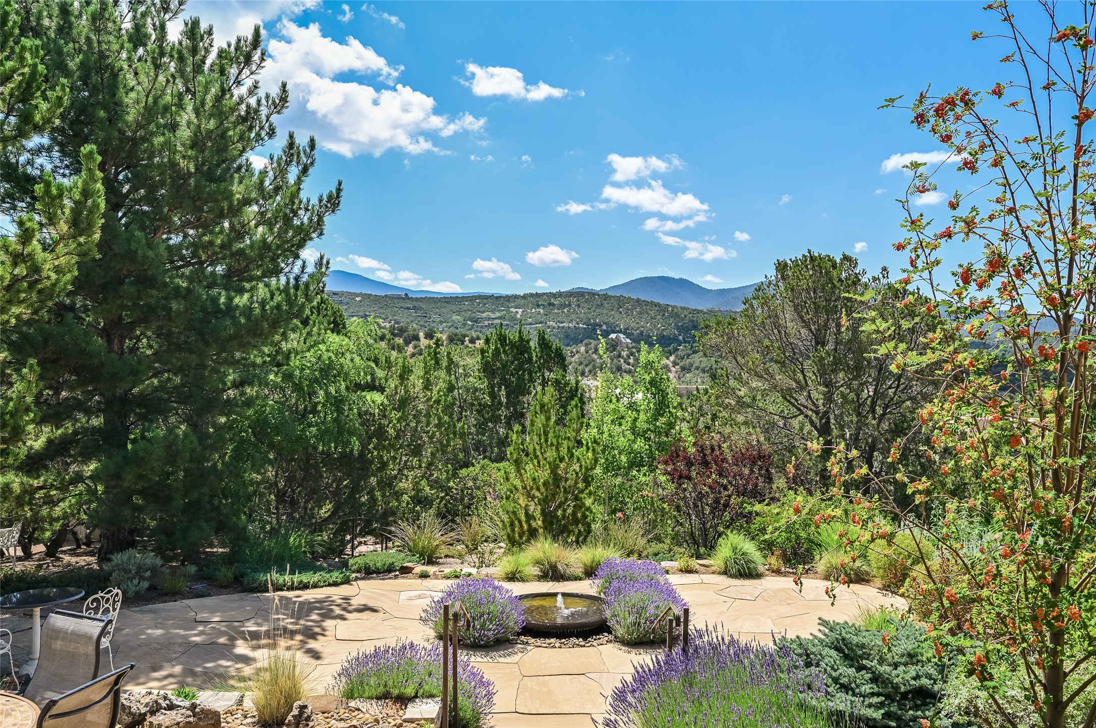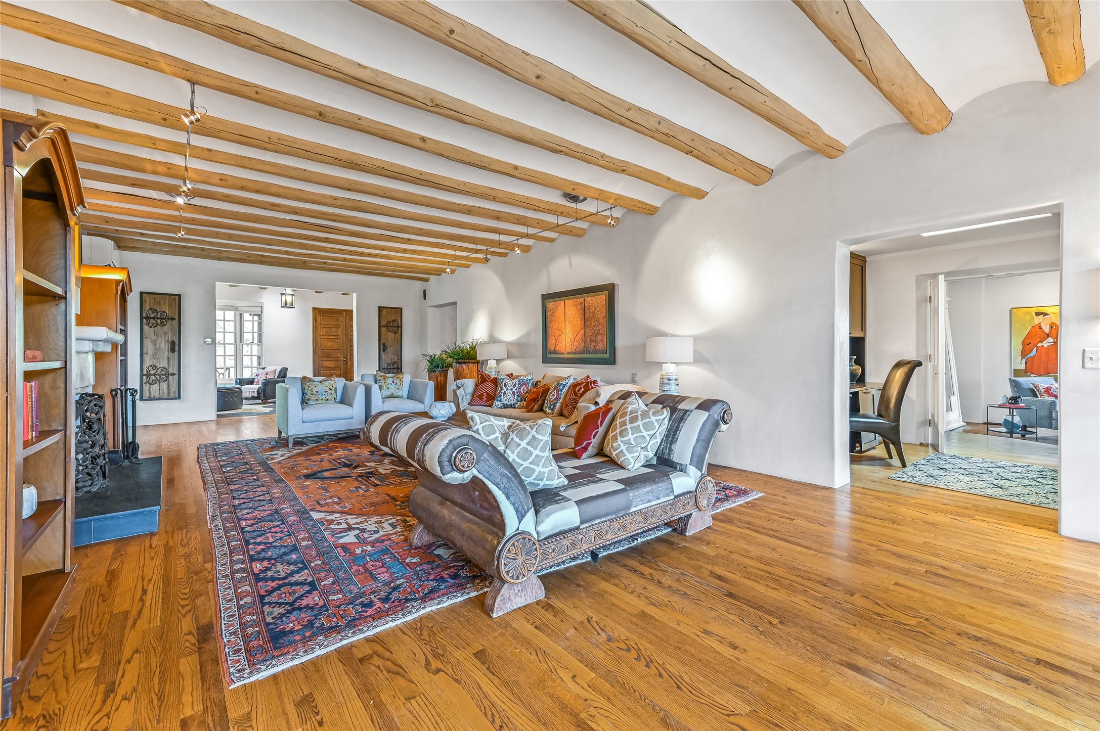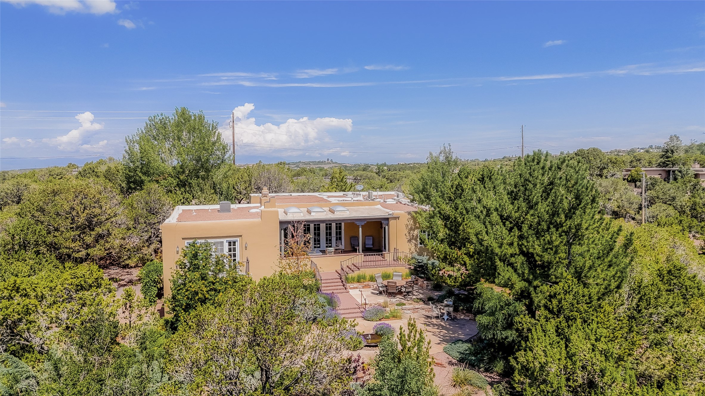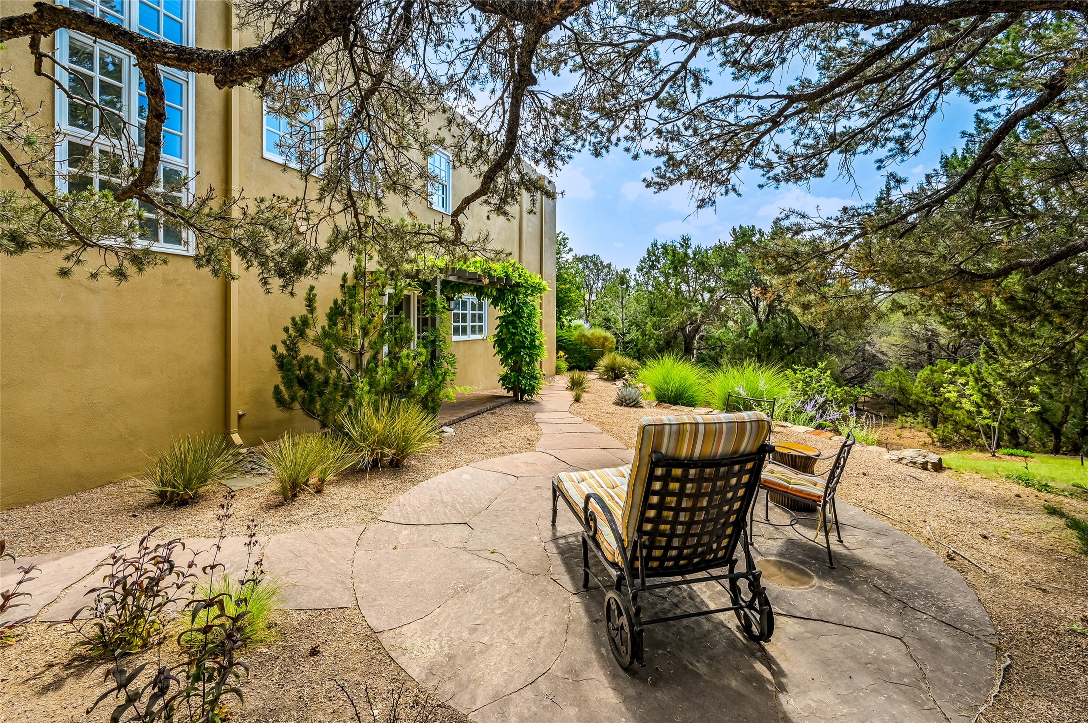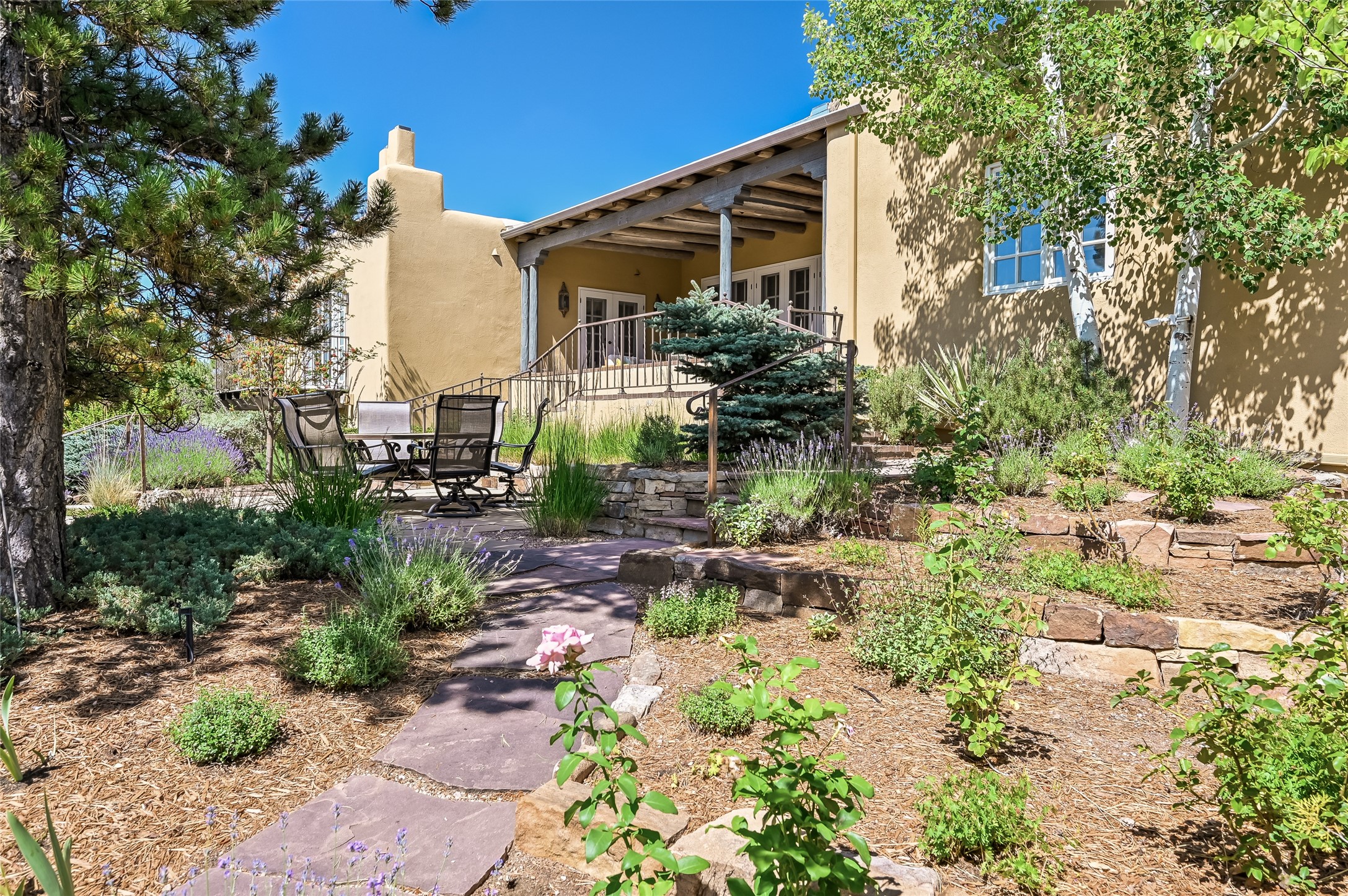 This classic Pueblo-style home with expansive views embraces symmetry and elegance, blending historic character with modern comforts. Inside, 4 fireplaces, brick and wood floors set a warm foundation for three generous living spaces, one of which could easily transform into a private third bedroom suite. Coved ceilings and architectural detailing add refinement throughout.The extra-large primary suite is a true retreat, featuring its own fireplace, private access to surrounding patios, an updated bathroom, and a nicely sized closet. It's also worth noting that there is only one step on the main level!The property's 1.60-acre grounds are a lush sanctuary, graced with water features, mature landscaping, and a greenhouse for year-round gardening. A solar system offsets most of the electric costs, offering both sustainability and efficiency.An office with built-ins provides a dedicated work space, while the lower-level guest casita--complete with its own kitchenette, bathroom, living room, large bedroom, and 2 private entrances--offers ideal accommodations for extended family, guests, caretaker or a potential rental.Just minutes from downtown yet set against a backdrop of panoramic vistas, this Old World residence combines timeless Pueblo charm with a lifestyle of ease and beauty.