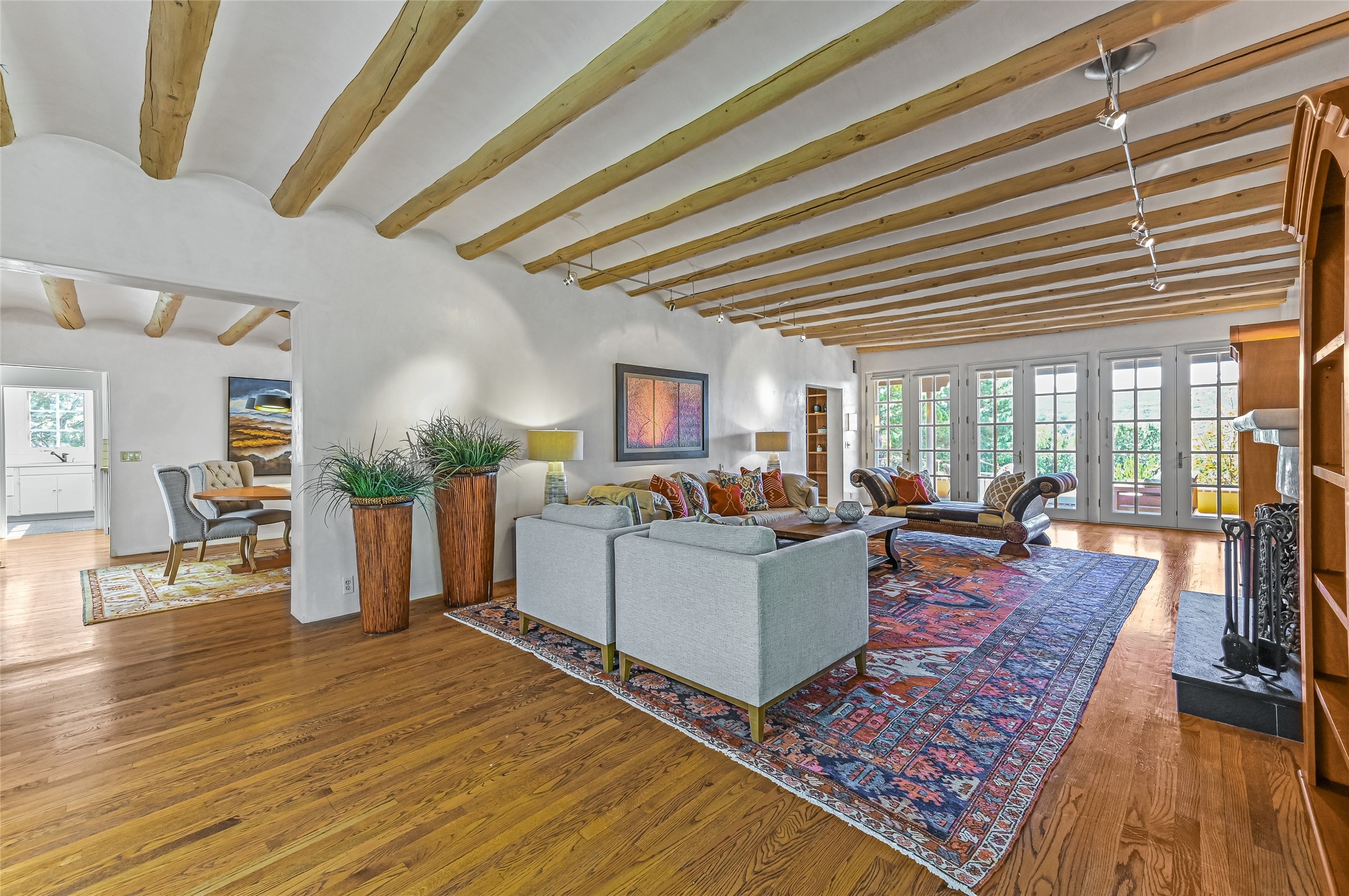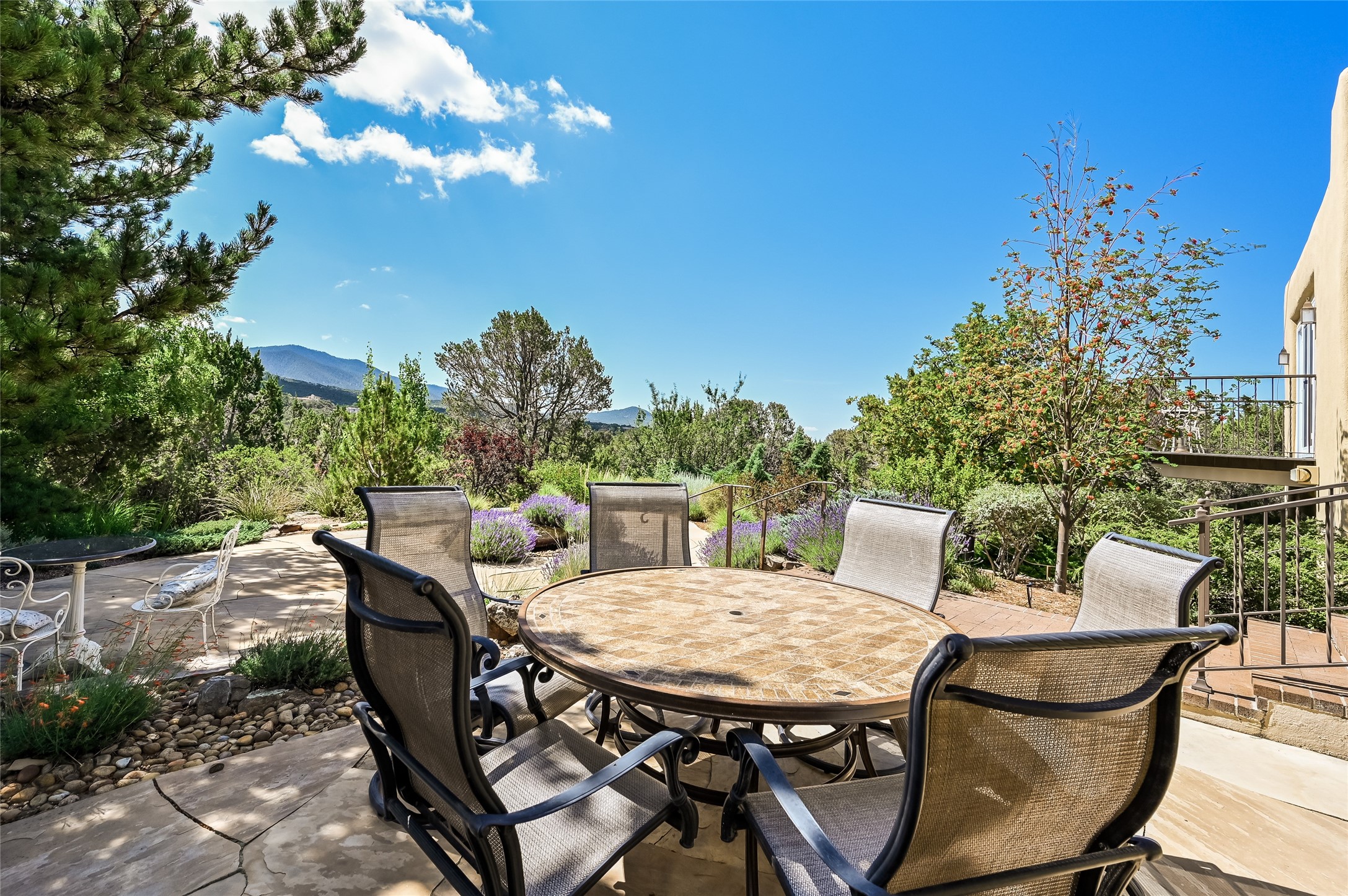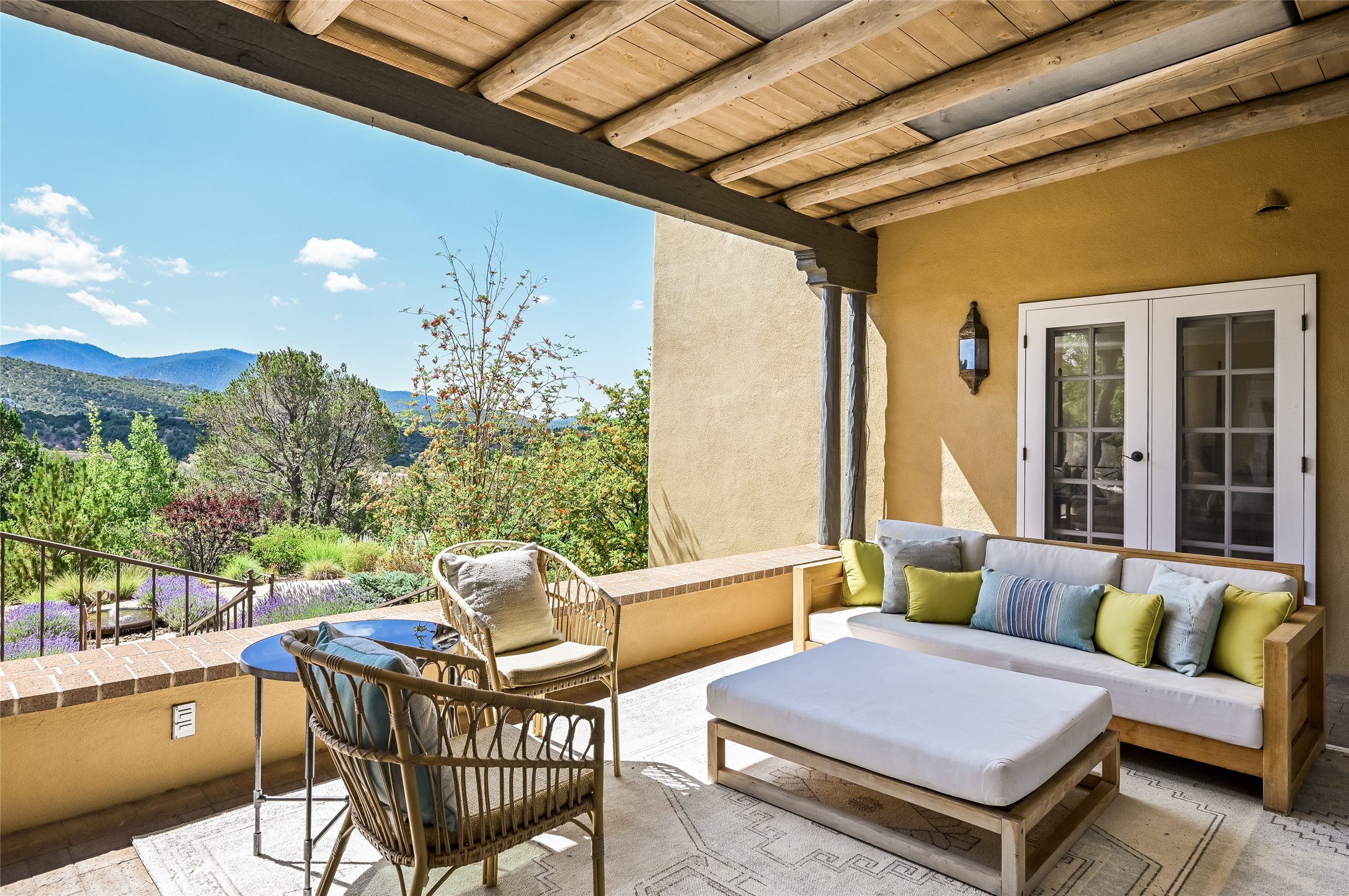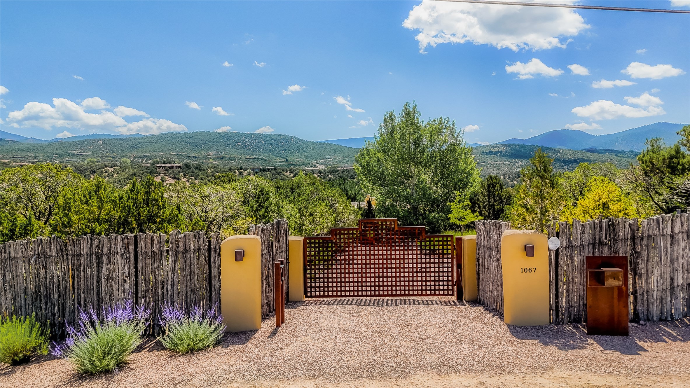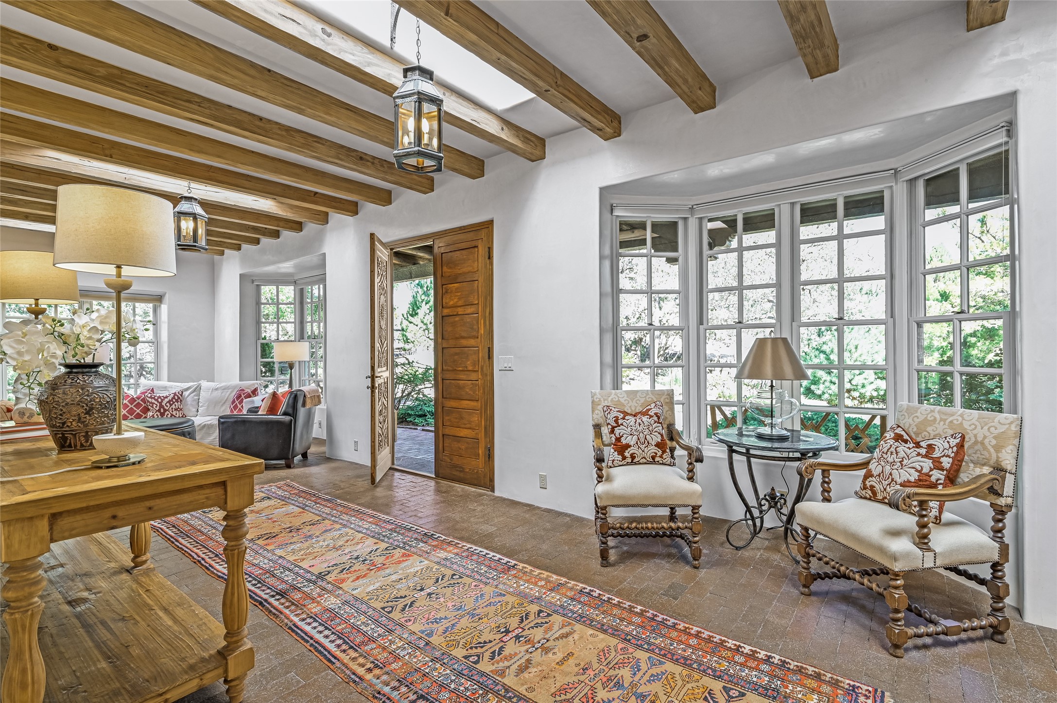 This classic Pueblo-style home with expansive views embraces symmetry and elegance, blending historic character with modern comforts. Inside, 4 fireplaces, brick and wood floors set a warm foundation for three generous living spaces, one of which could easily transform into a private third bedroom suite. Coved ceilings and architectural detailing add refinement throughout.The extra-large primary suite is a true retreat, featuring its own fireplace, private access to surrounding patios, an updated bathroom, and a nicely sized closet. It's also worth noting that there is only one step on the main level!The property's 1.60-acre grounds are a lush sanctuary, graced with water features, mature landscaping, and a greenhouse for year-round gardening. A solar system offsets most of the electric costs, offering both sustainability and efficiency.An office with built-ins provides a dedicated work space, while the lower-level guest casita--complete with its own kitchenette, bathroom, living room, large bedroom, and 2 private entrances--offers ideal accommodations for extended family, guests, caretaker or a potential rental.Just minutes from downtown yet set against a backdrop of panoramic vistas, this Old World residence combines timeless Pueblo charm with a lifestyle of ease and beauty.