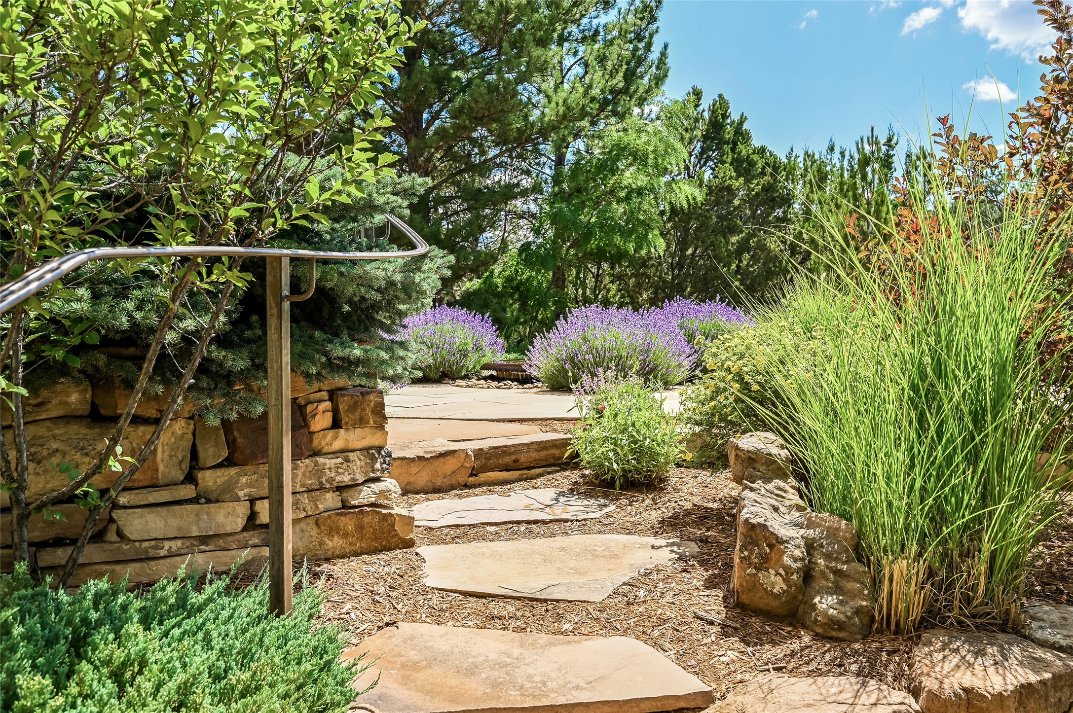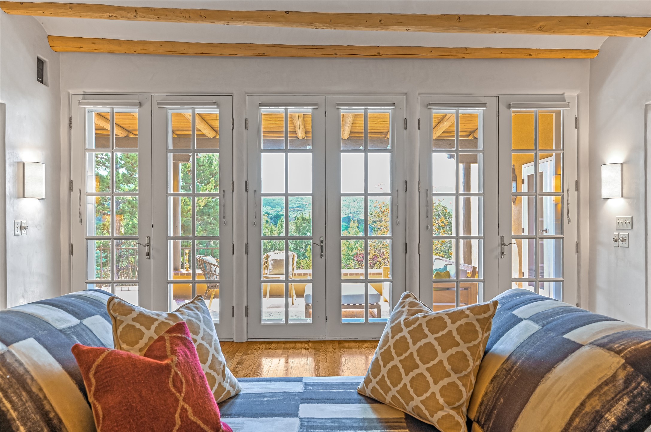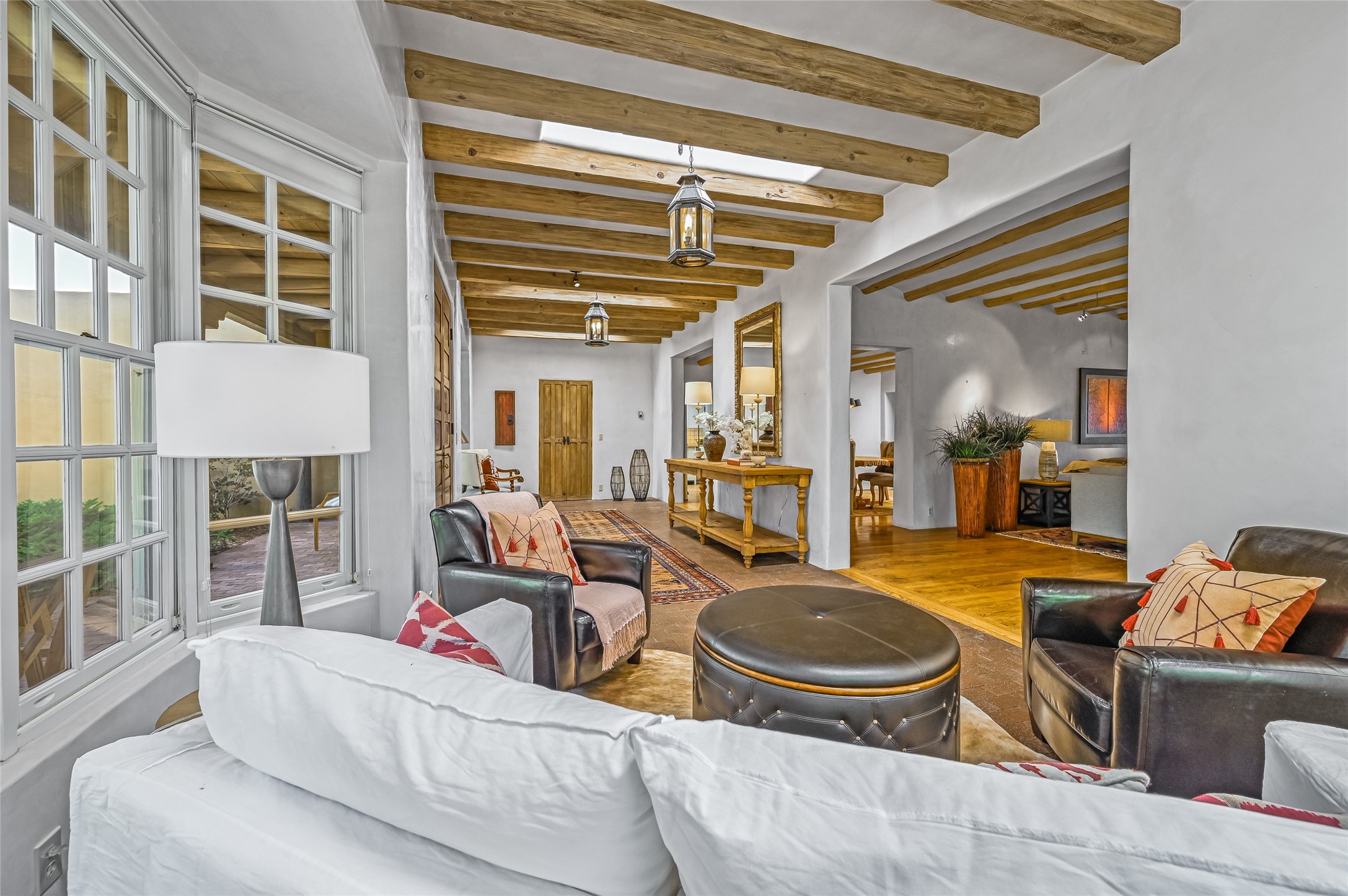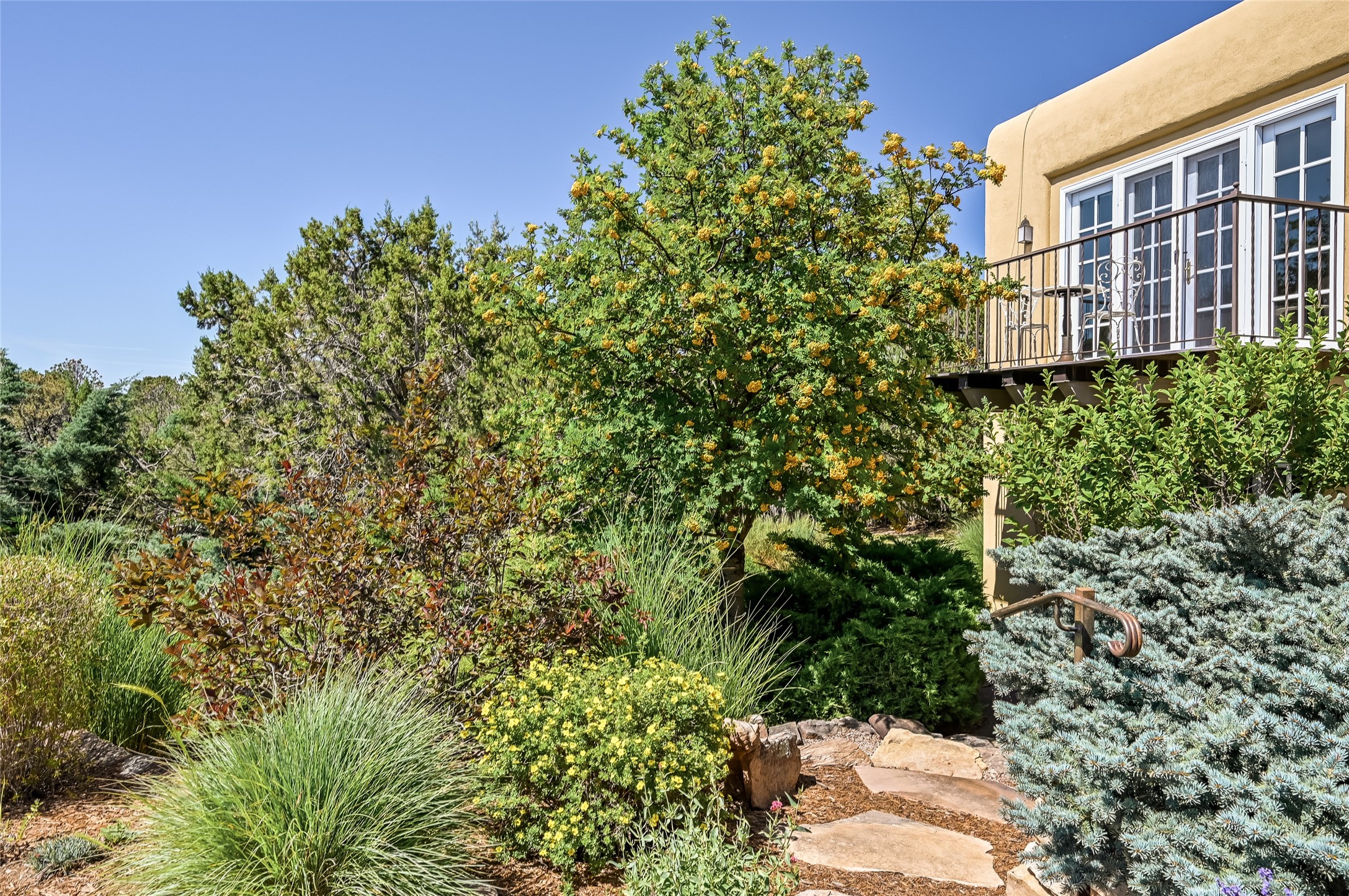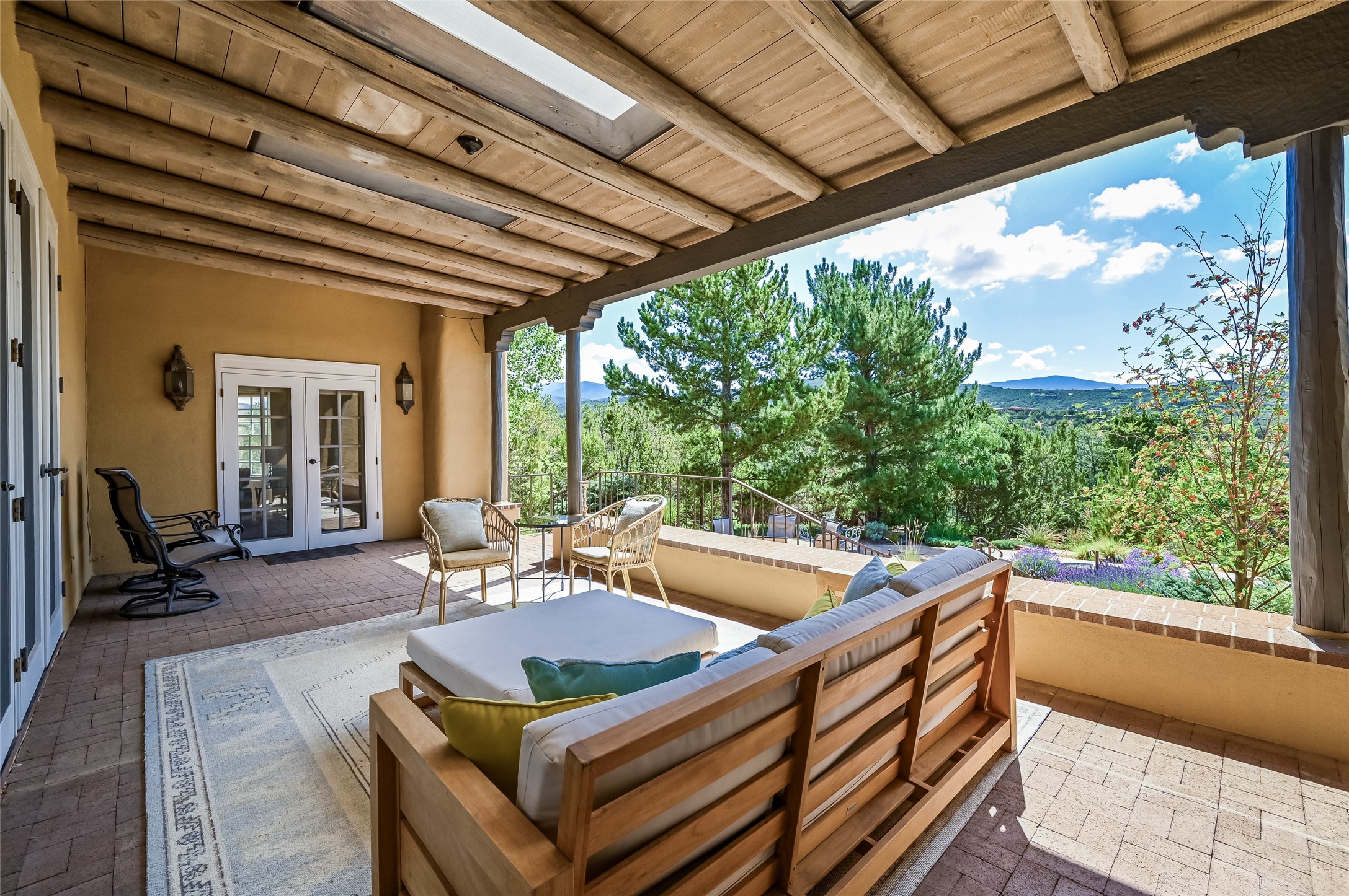 This classic Pueblo-style home with expansive views embraces symmetry and elegance, blending historic character with modern comforts. Inside, 4 fireplaces, brick and wood floors set a warm foundation for three generous living spaces, one of which could easily transform into a private third bedroom suite. Coved ceilings and architectural detailing add refinement throughout.The extra-large primary suite is a true retreat, featuring its own fireplace, private access to surrounding patios, an updated bathroom, and a nicely sized closet. It's also worth noting that there is only one step on the main level!The property's 1.60-acre grounds are a lush sanctuary, graced with water features, mature landscaping, and a greenhouse for year-round gardening. A solar system offsets most of the electric costs, offering both sustainability and efficiency.An office with built-ins provides a dedicated work space, while the lower-level guest casita--complete with its own kitchenette, bathroom, living room, large bedroom, and 2 private entrances--offers ideal accommodations for extended family, guests, caretaker or a potential rental.Just minutes from downtown yet set against a backdrop of panoramic vistas, this Old World residence combines timeless Pueblo charm with a lifestyle of ease and beauty.