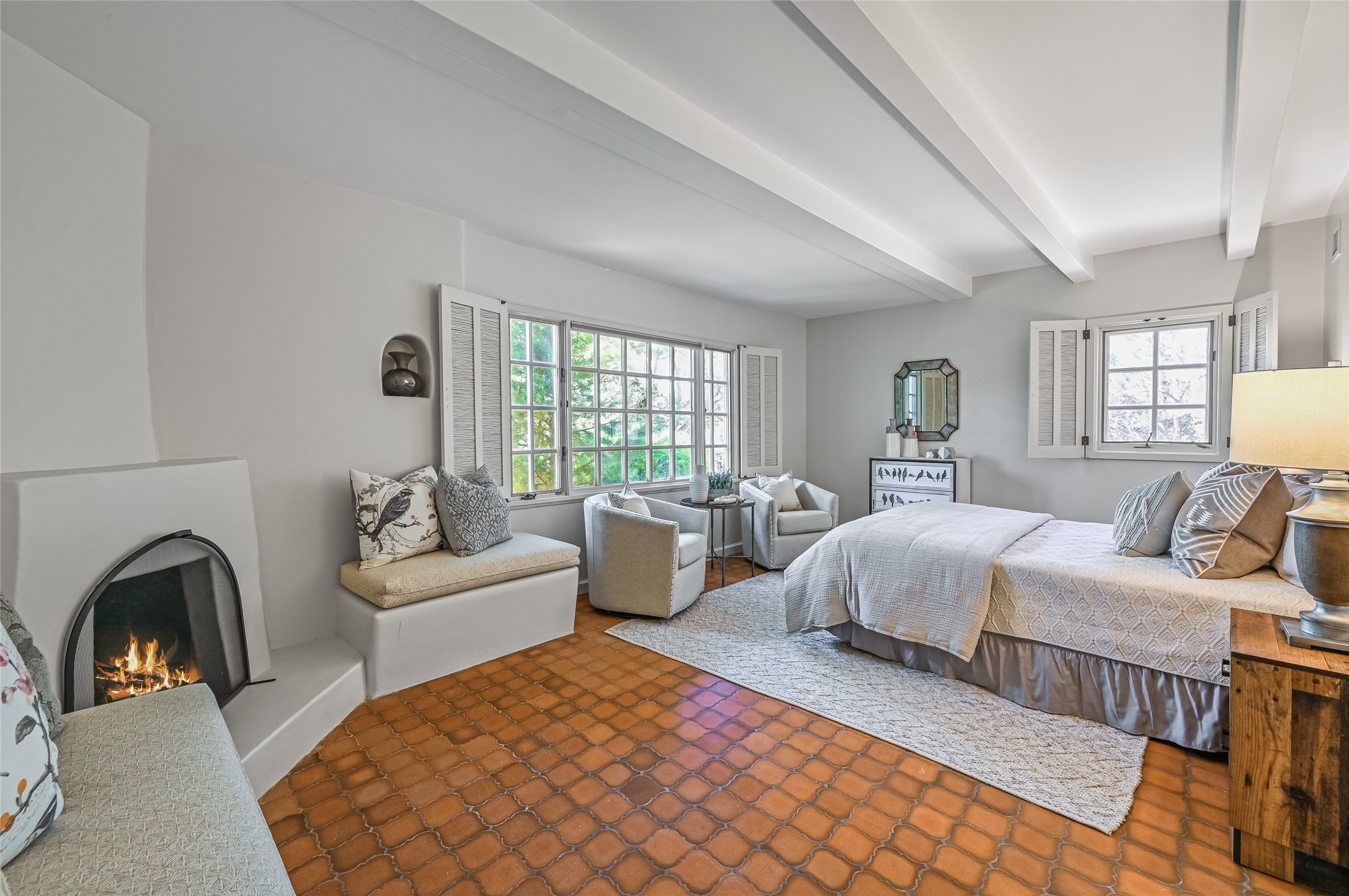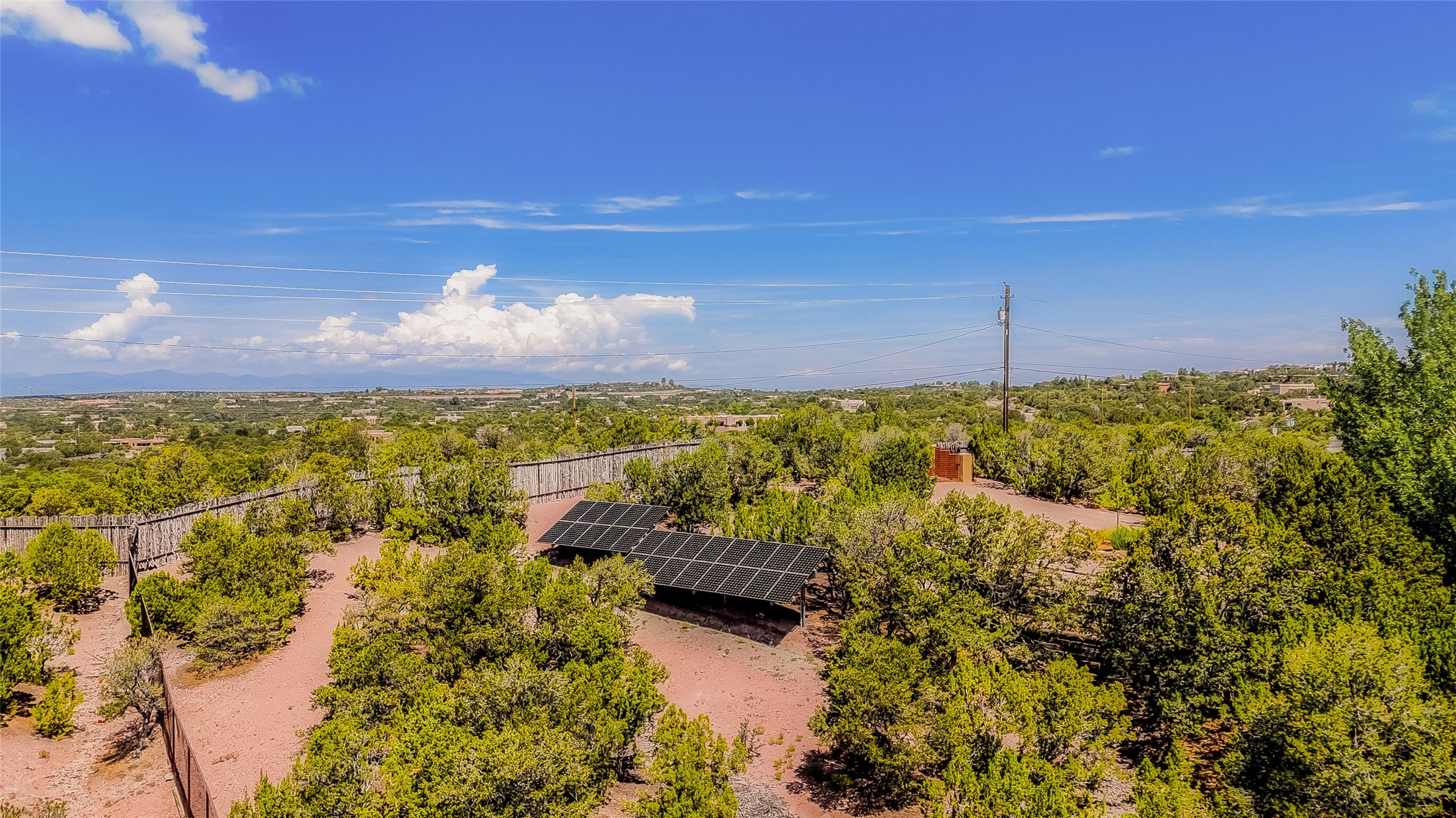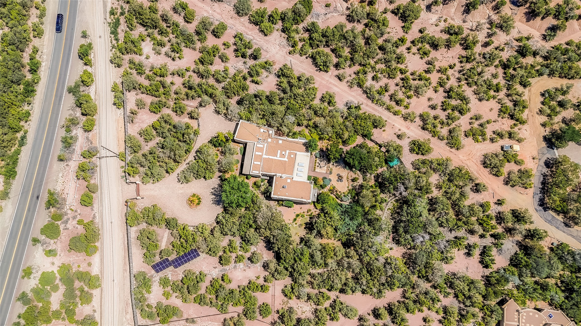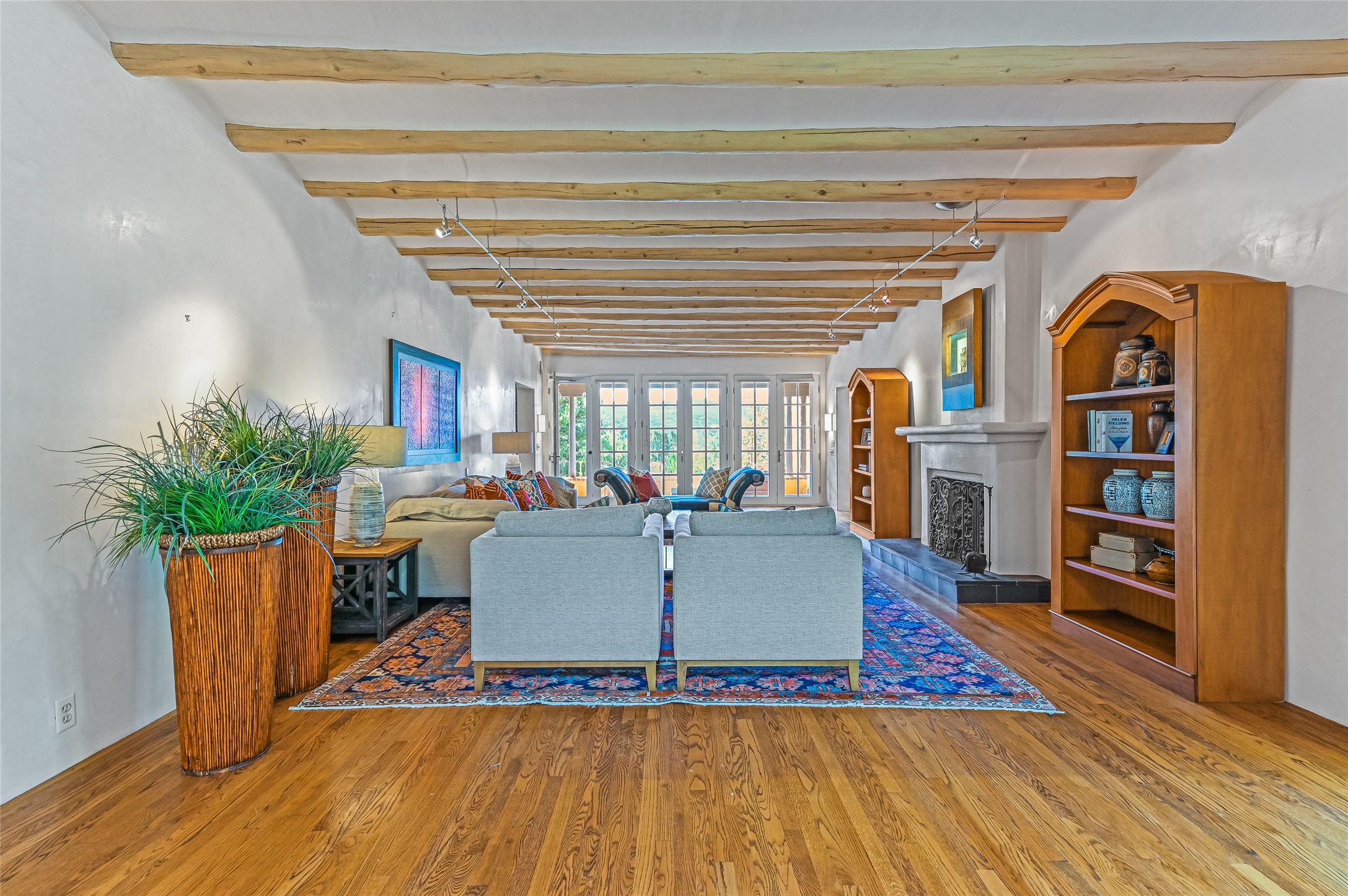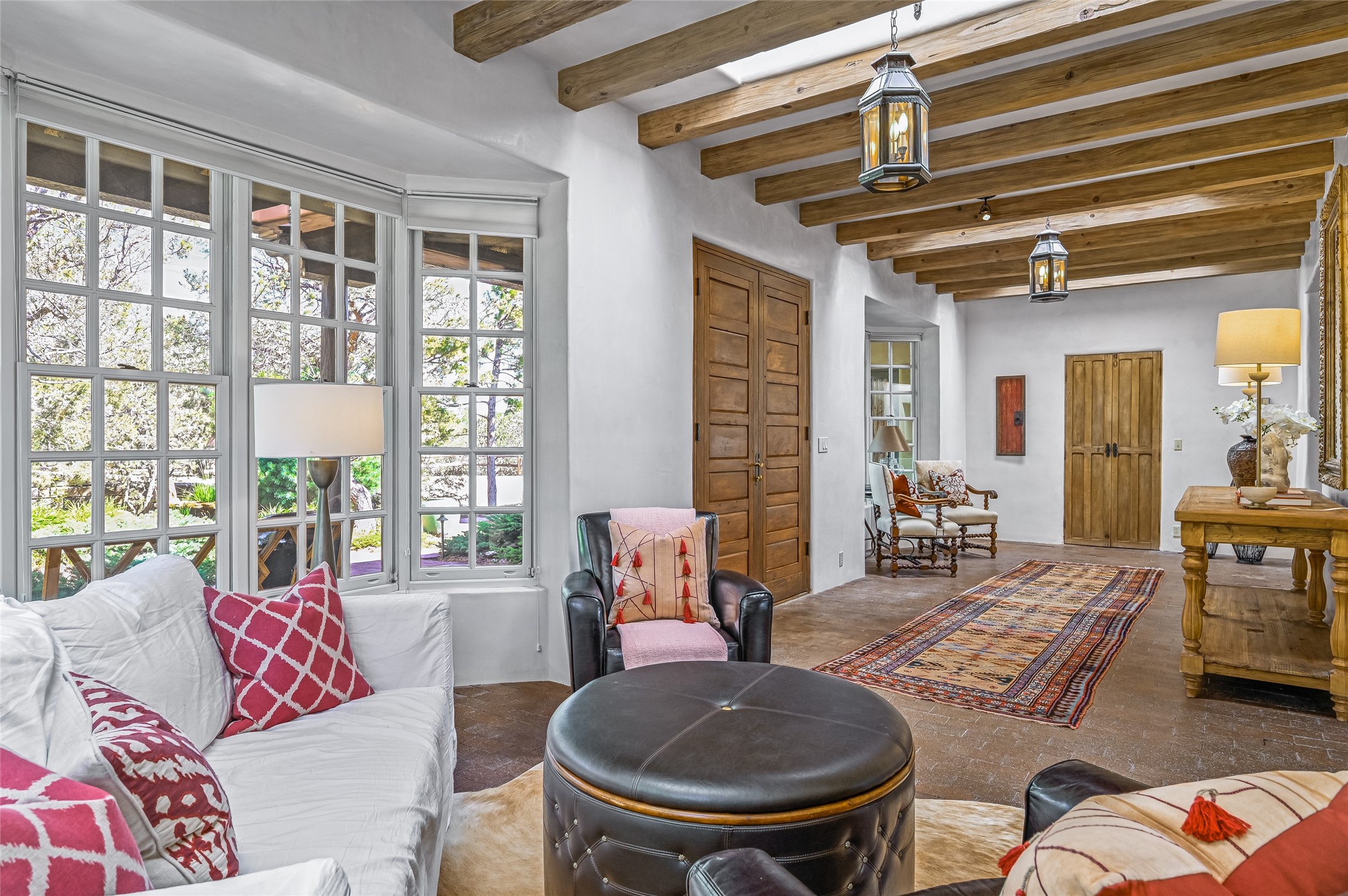 This classic Pueblo-style home with expansive views embraces symmetry and elegance, blending historic character with modern comforts. Inside, 4 fireplaces, brick and wood floors set a warm foundation for three generous living spaces, one of which could easily transform into a private third bedroom suite. Coved ceilings and architectural detailing add refinement throughout.The extra-large primary suite is a true retreat, featuring its own fireplace, private access to surrounding patios, an updated bathroom, and a nicely sized closet. It's also worth noting that there is only one step on the main level!The property's 1.60-acre grounds are a lush sanctuary, graced with water features, mature landscaping, and a greenhouse for year-round gardening. A solar system offsets most of the electric costs, offering both sustainability and efficiency.An office with built-ins provides a dedicated work space, while the lower-level guest casita--complete with its own kitchenette, bathroom, living room, large bedroom, and 2 private entrances--offers ideal accommodations for extended family, guests, caretaker or a potential rental.Just minutes from downtown yet set against a backdrop of panoramic vistas, this Old World residence combines timeless Pueblo charm with a lifestyle of ease and beauty.