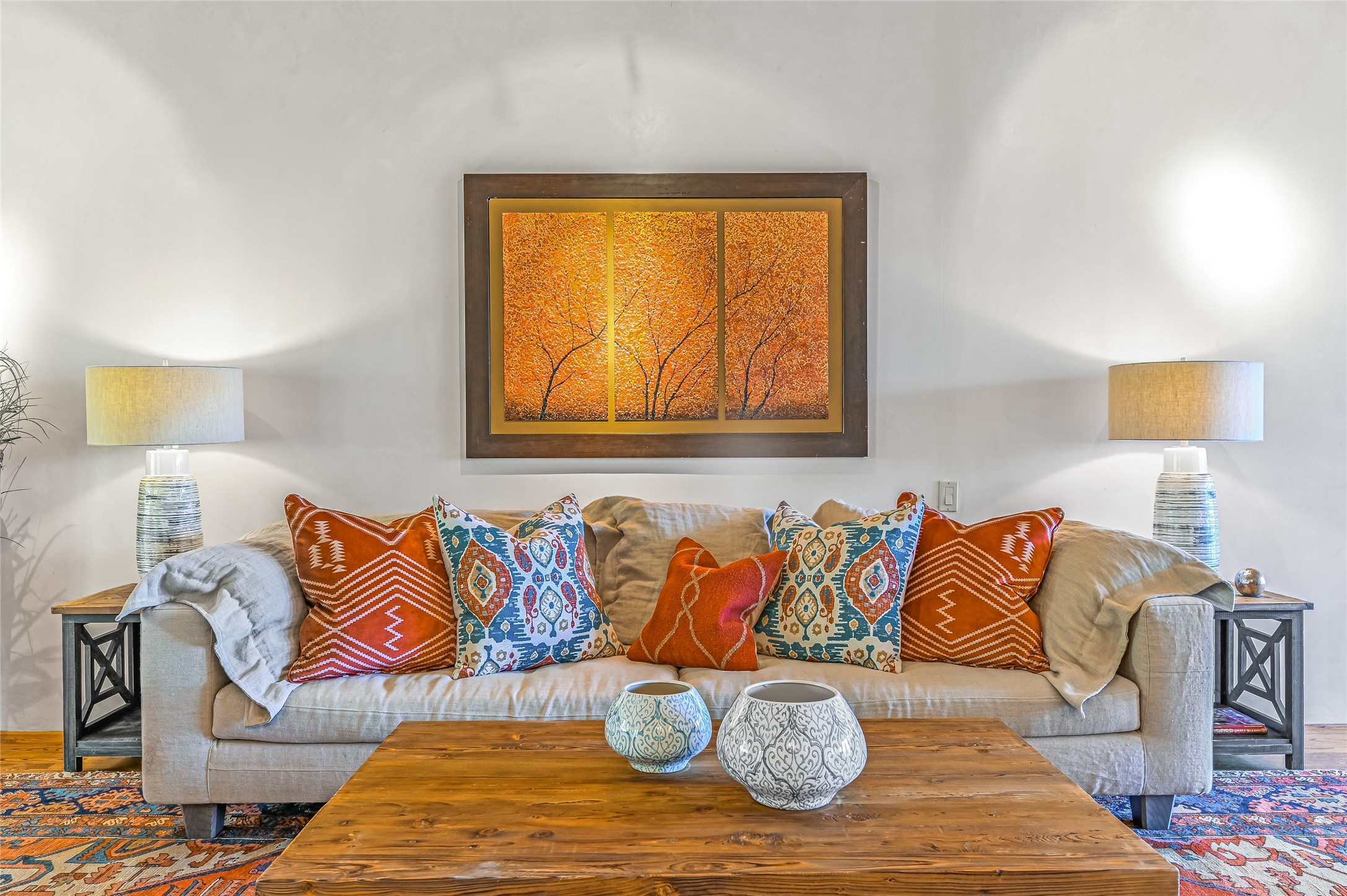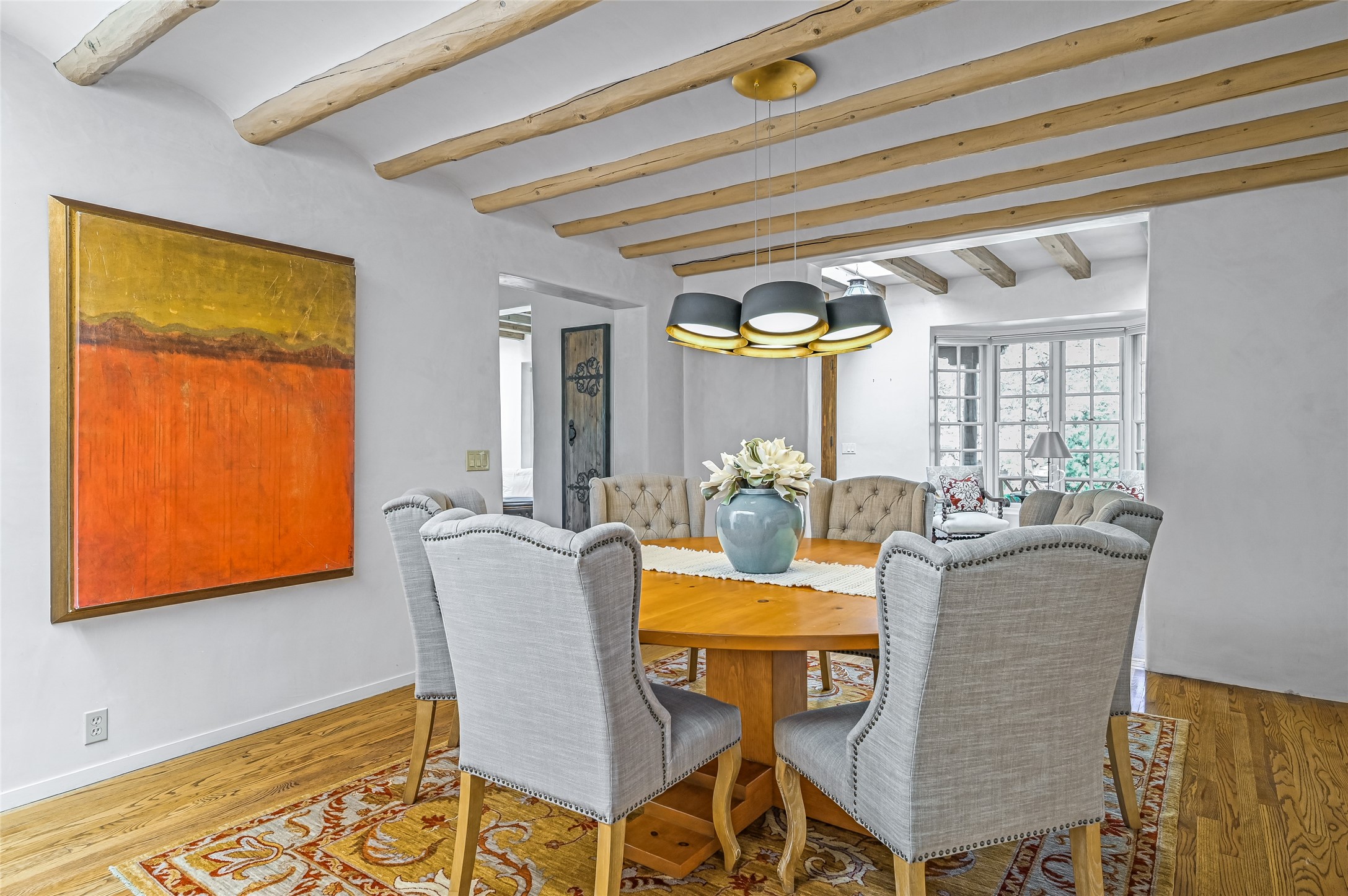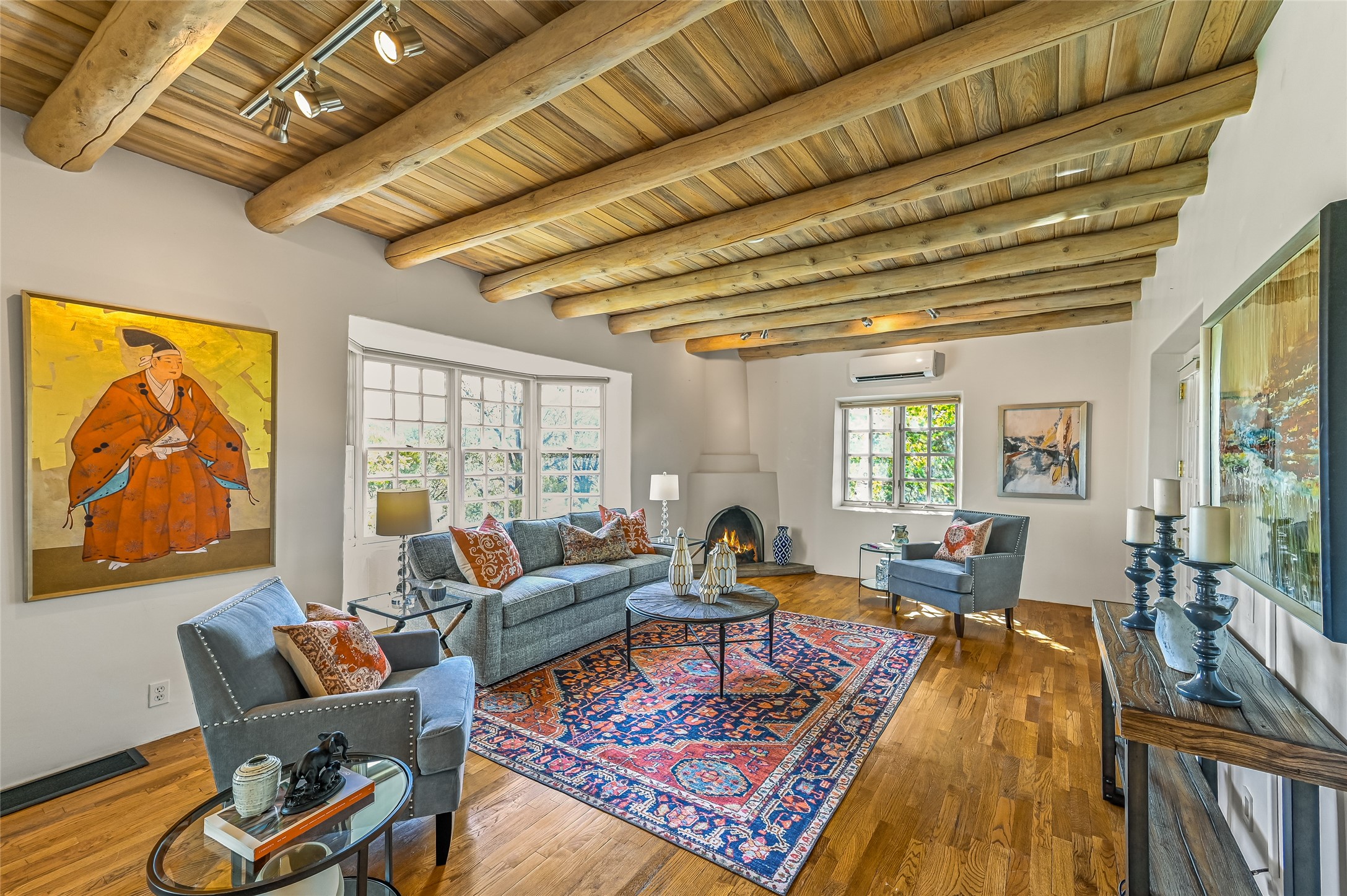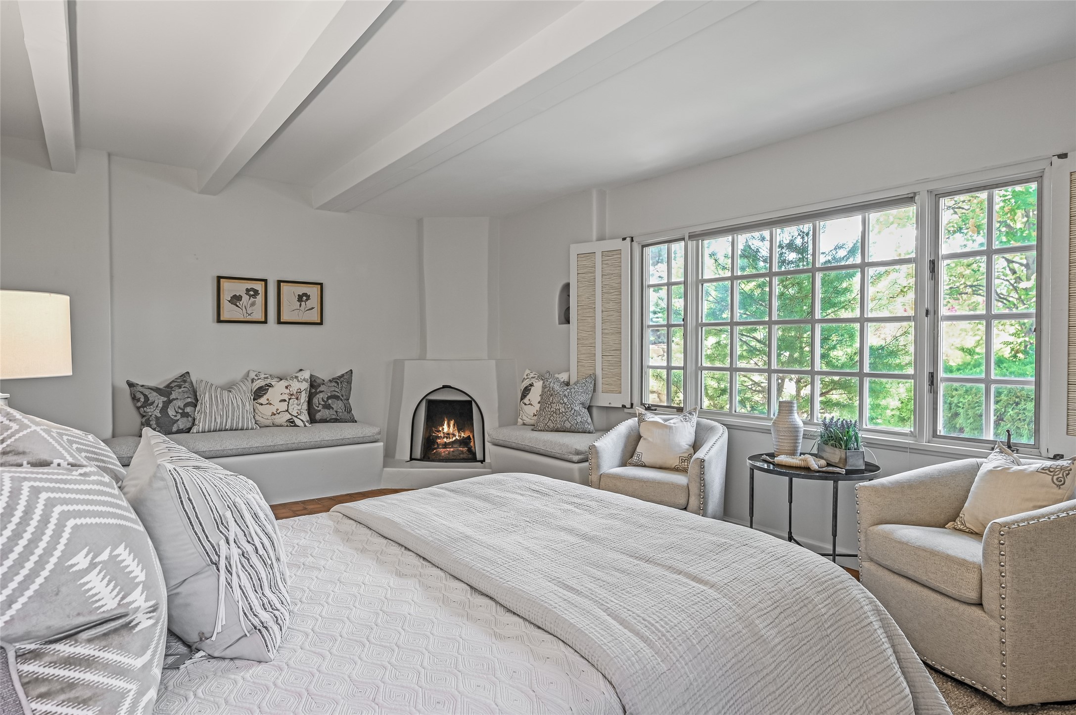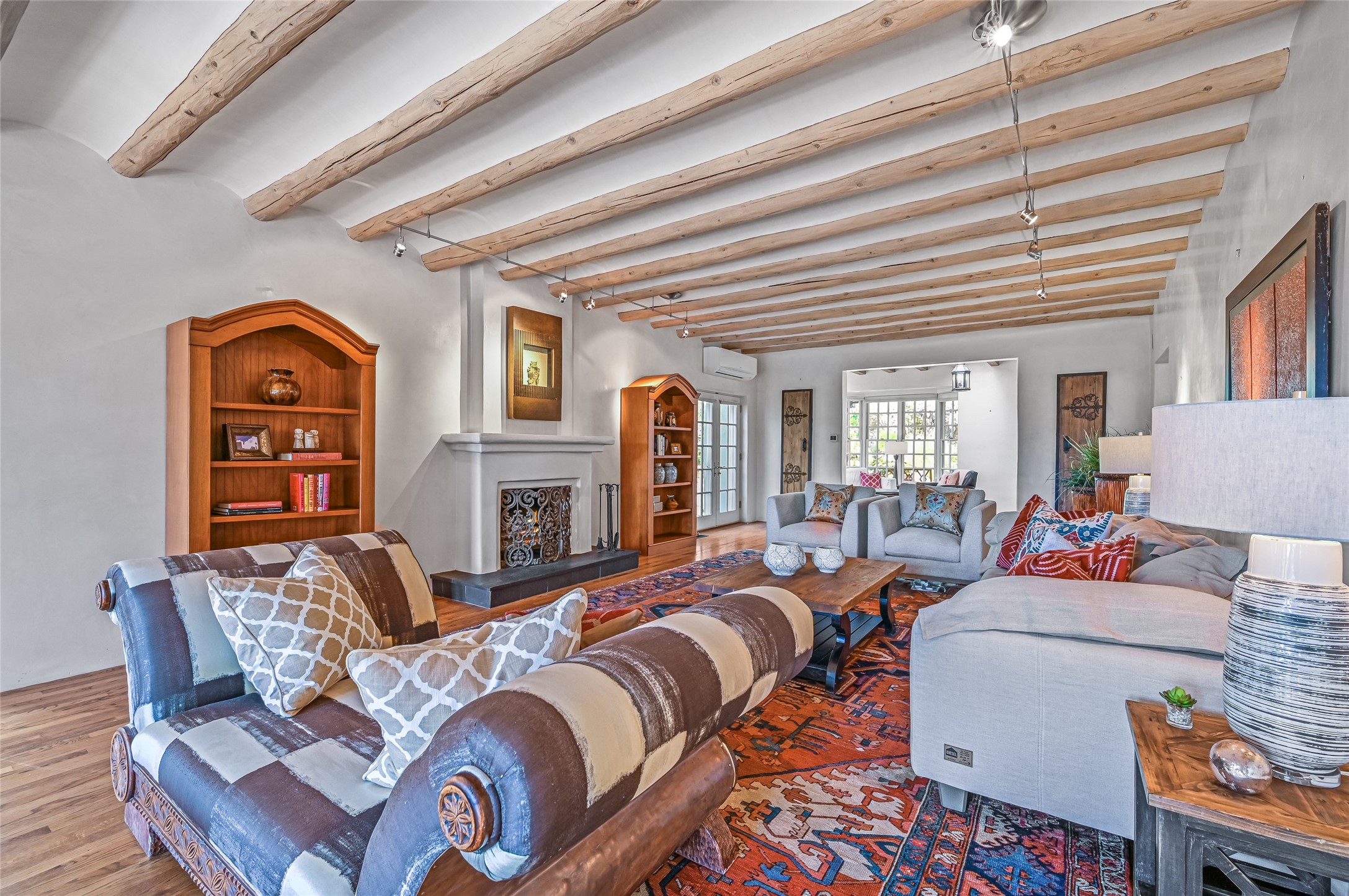 This classic Pueblo-style home with expansive views embraces symmetry and elegance, blending historic character with modern comforts. Inside, 4 fireplaces, brick and wood floors set a warm foundation for three generous living spaces, one of which could easily transform into a private third bedroom suite. Coved ceilings and architectural detailing add refinement throughout.The extra-large primary suite is a true retreat, featuring its own fireplace, private access to surrounding patios, an updated bathroom, and a nicely sized closet. It's also worth noting that there is only one step on the main level!The property's 1.60-acre grounds are a lush sanctuary, graced with water features, mature landscaping, and a greenhouse for year-round gardening. A solar system offsets most of the electric costs, offering both sustainability and efficiency.An office with built-ins provides a dedicated work space, while the lower-level guest casita--complete with its own kitchenette, bathroom, living room, large bedroom, and 2 private entrances--offers ideal accommodations for extended family, guests, caretaker or a potential rental.Just minutes from downtown yet set against a backdrop of panoramic vistas, this Old World residence combines timeless Pueblo charm with a lifestyle of ease and beauty.