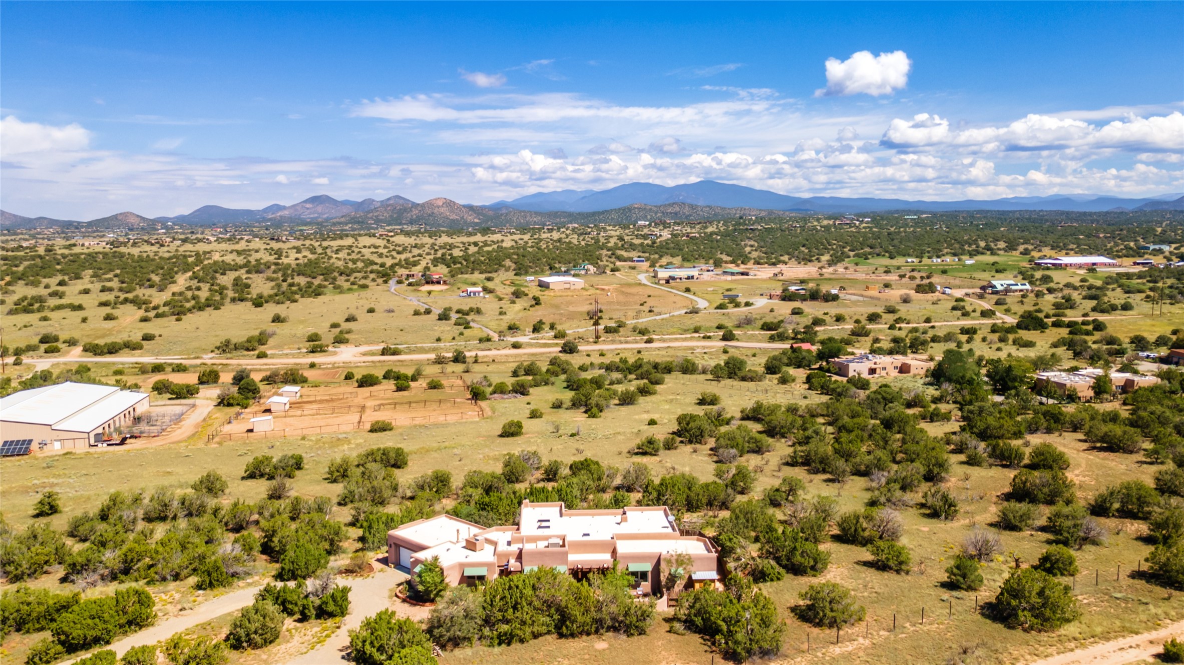 Peaceful Country Living with Room to Roam! If you've been searching for unencumbered horse property, extra elbow room, or simply a serene retreat away from the bustle, this exceptional home delivers. Nestled on 10 fenced acres at the end of a private lane, the elevated setting offers breathtaking eastern views of the Sangre de Cristo Mountains. Enjoy your mornings with sunlit vistas and your evenings under the shaded portal, where sunsets dance across the mountains.A welcoming enclosed courtyard and striking entryway lead inside, where sandstone floors contrast beautifully with vigas and wood-beamed ceilings. Smooth plaster walls add elegance, while thoughtful upgrades throughout the home reflect quality and care. The split three-bedroom floor plan is enhanced by a spacious bonus room with a closet, currently used as an office and game room. The updated kitchen features stainless steel appliances, a convection cooktop, and a cozy dining nook warmed by a kiva fireplace. The owner's suite is a retreat of its own with mountain views, outdoor access, and a luxurious 400+/- square foot bath, boasting a claw-foot soaking tub, steam shower, dual vanities, and a private water closet with bidet. You will also love the spacious laundry room with plenty of storage and utility sink and access to the back yard. Practical amenities include a shared well on the property that supplies both domestic water and drip irrigation, with the option to connect to the community water system if desired. A brand-new TPO roof was installed in 2018. On the acreage, an alternate site with electric and water is ready for a barn, guest house, or studio--making this property as versatile as it is beautiful. Come experience the best of Northern New Mexico living--space, views, and a home filled with timeless Santa Fe character.