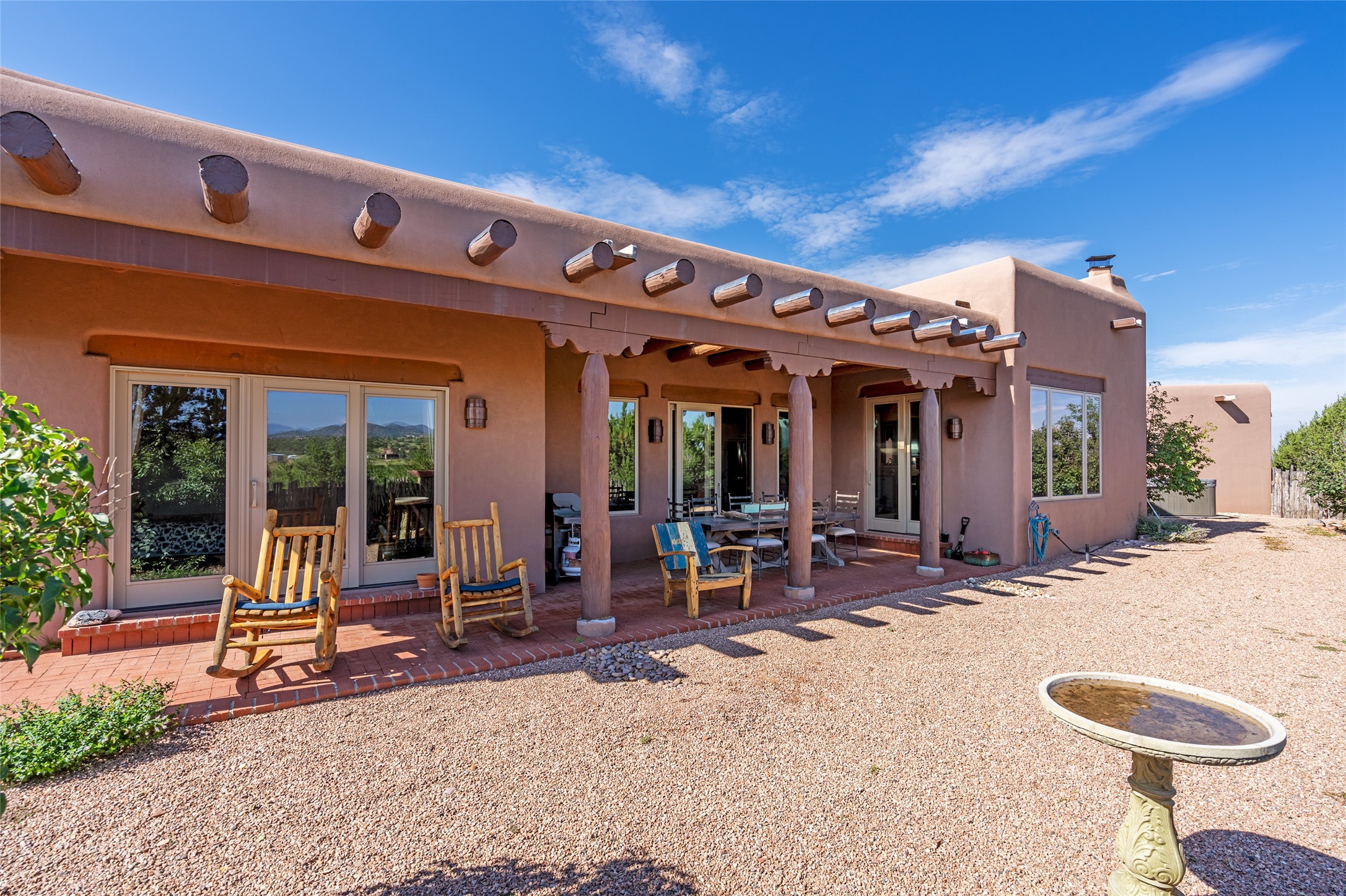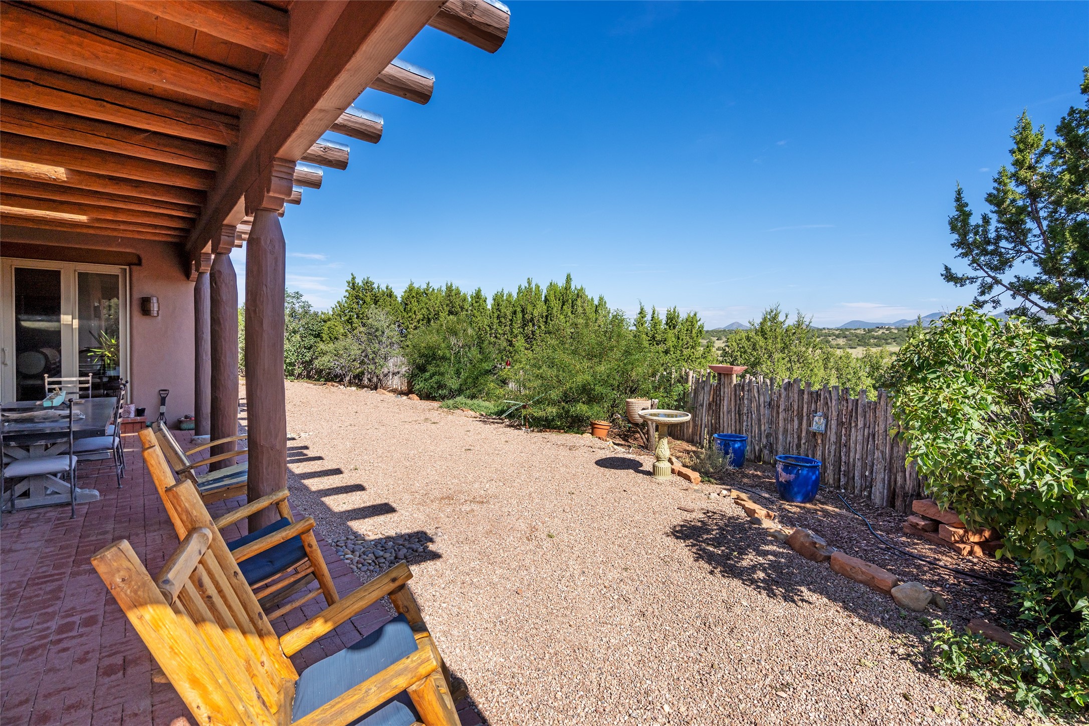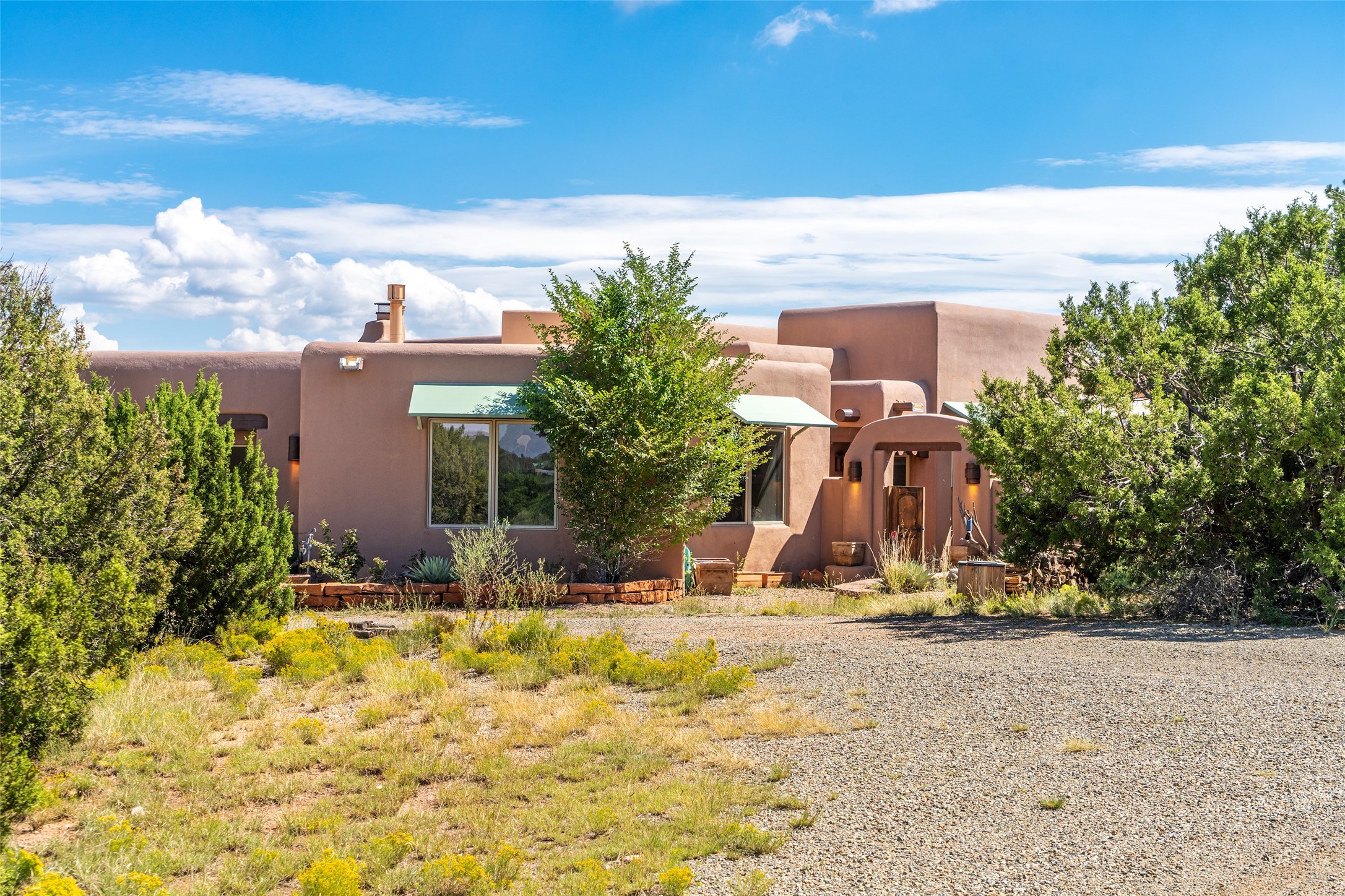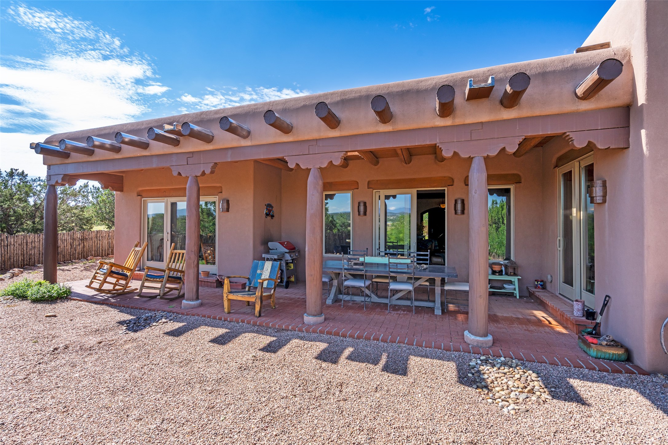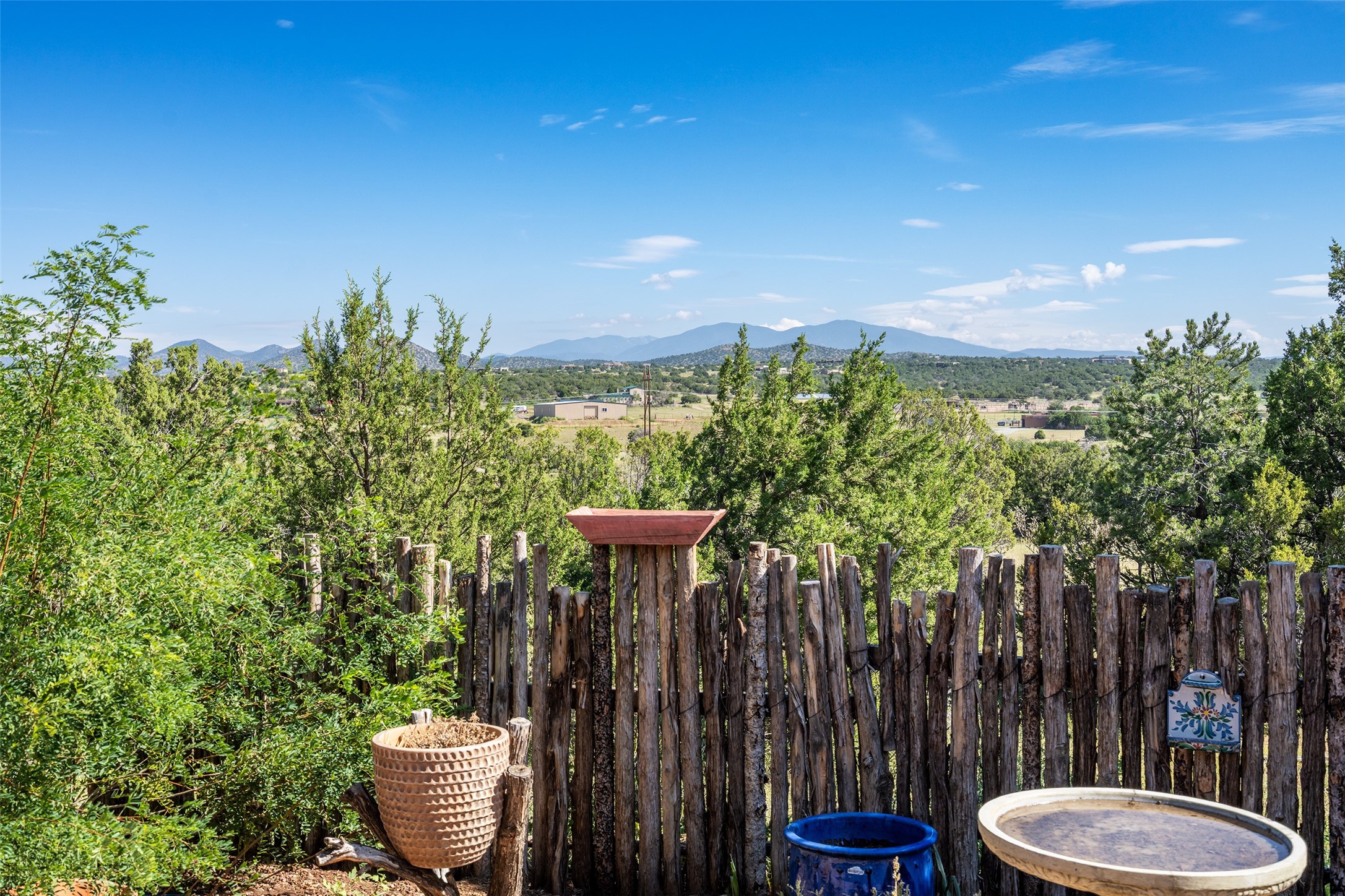 Peaceful Country Living with Room to Roam! If you've been searching for unencumbered horse property, extra elbow room, or simply a serene retreat away from the bustle, this exceptional home delivers. Nestled on 10 fenced acres at the end of a private lane, the elevated setting offers breathtaking eastern views of the Sangre de Cristo Mountains. Enjoy your mornings with sunlit vistas and your evenings under the shaded portal, where sunsets dance across the mountains.A welcoming enclosed courtyard and striking entryway lead inside, where sandstone floors contrast beautifully with vigas and wood-beamed ceilings. Smooth plaster walls add elegance, while thoughtful upgrades throughout the home reflect quality and care. The split three-bedroom floor plan is enhanced by a spacious bonus room with a closet, currently used as an office and game room. The updated kitchen features stainless steel appliances, a convection cooktop, and a cozy dining nook warmed by a kiva fireplace. The owner's suite is a retreat of its own with mountain views, outdoor access, and a luxurious 400+/- square foot bath, boasting a claw-foot soaking tub, steam shower, dual vanities, and a private water closet with bidet. You will also love the spacious laundry room with plenty of storage and utility sink and access to the back yard. Practical amenities include a shared well on the property that supplies both domestic water and drip irrigation, with the option to connect to the community water system if desired. A brand-new TPO roof was installed in 2018. On the acreage, an alternate site with electric and water is ready for a barn, guest house, or studio--making this property as versatile as it is beautiful. Come experience the best of Northern New Mexico living--space, views, and a home filled with timeless Santa Fe character.