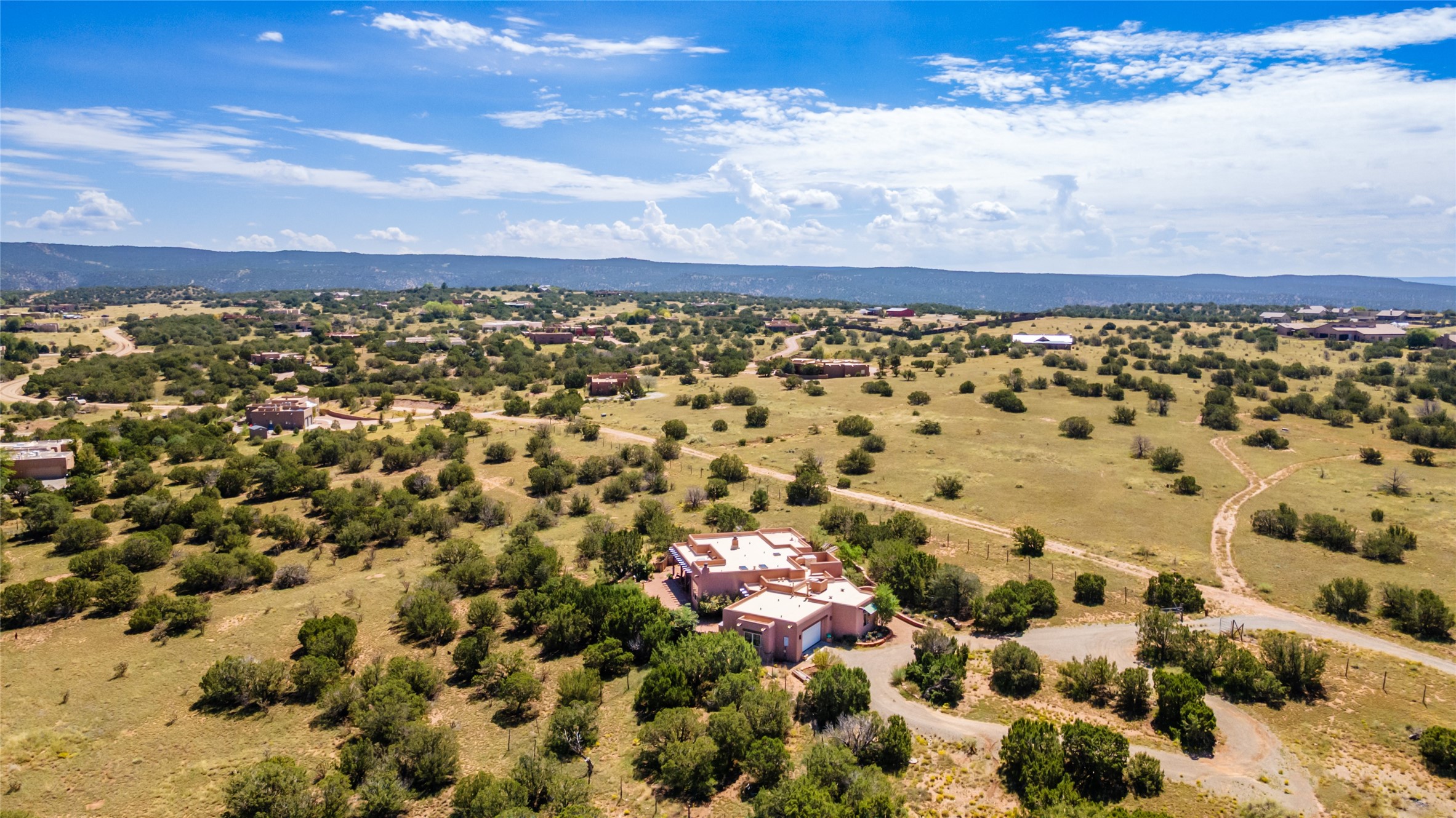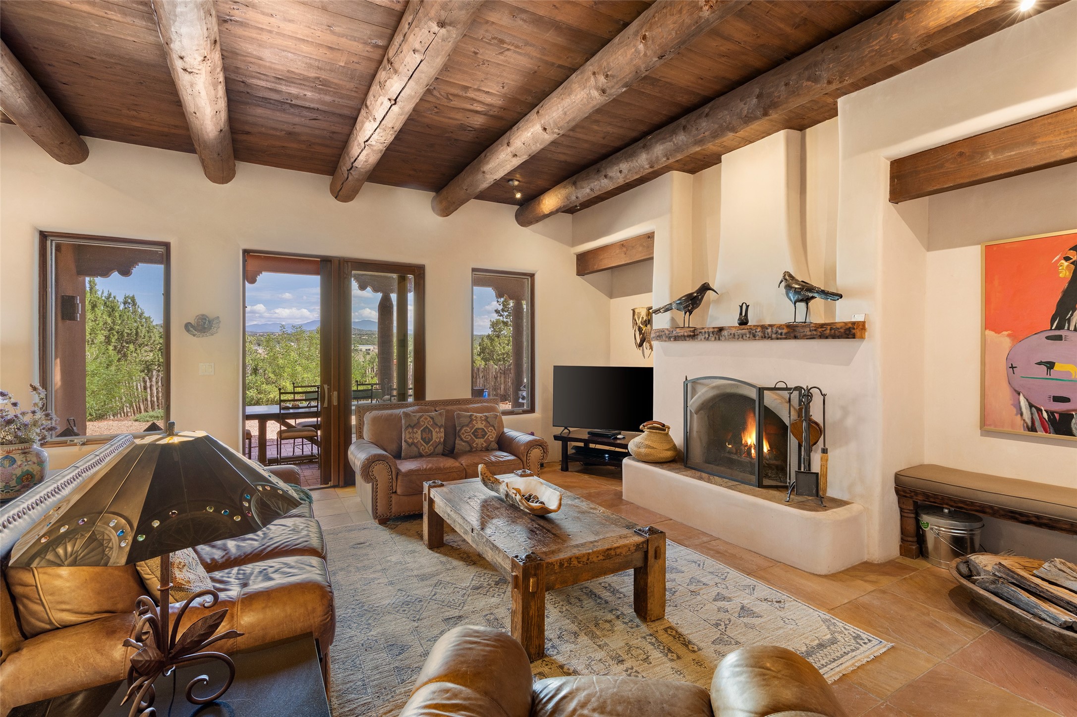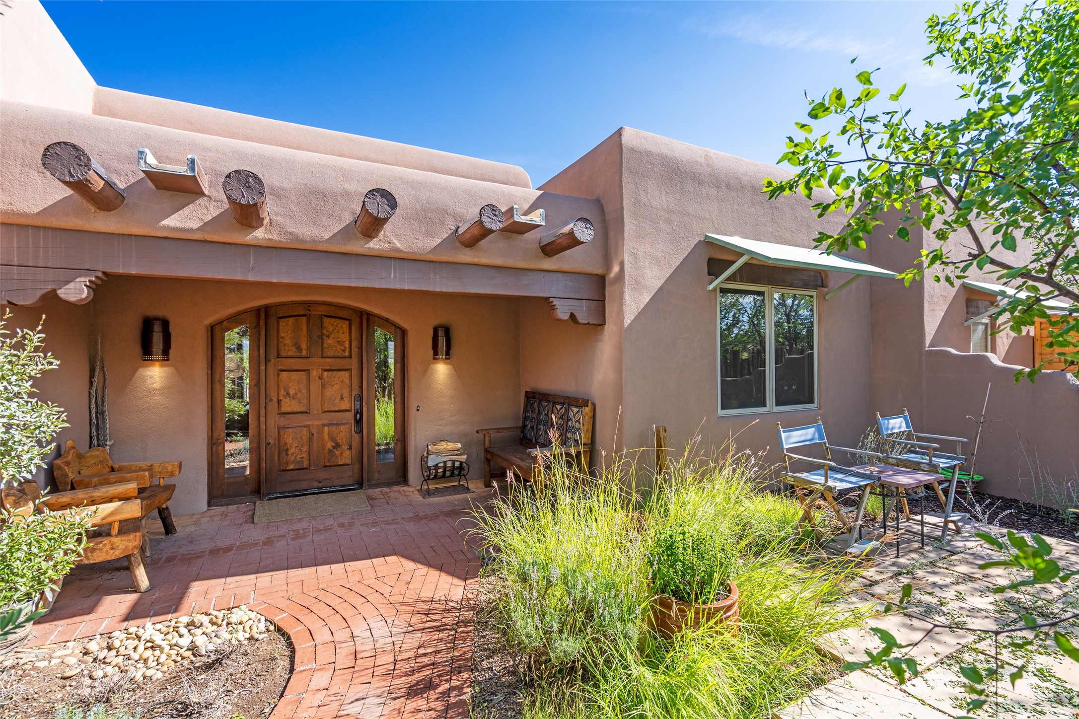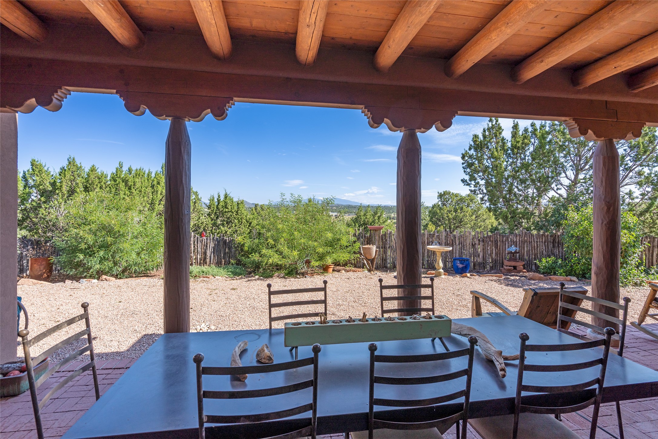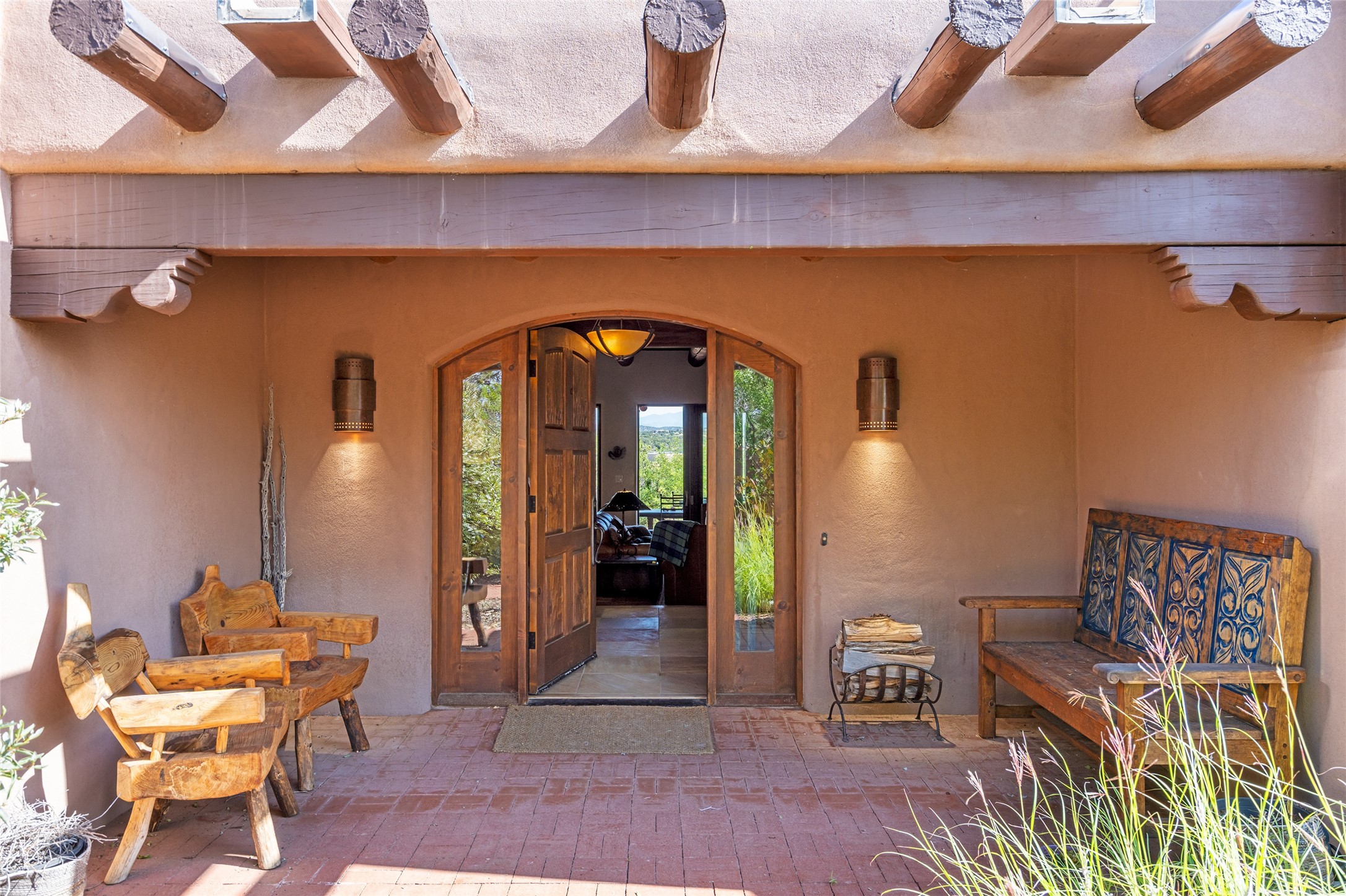 Peaceful Country Living with Room to Roam! If you've been searching for unencumbered horse property, extra elbow room, or simply a serene retreat away from the bustle, this exceptional home delivers. Nestled on 10 fenced acres at the end of a private lane, the elevated setting offers breathtaking eastern views of the Sangre de Cristo Mountains. Enjoy your mornings with sunlit vistas and your evenings under the shaded portal, where sunsets dance across the mountains.A welcoming enclosed courtyard and striking entryway lead inside, where sandstone floors contrast beautifully with vigas and wood-beamed ceilings. Smooth plaster walls add elegance, while thoughtful upgrades throughout the home reflect quality and care. The split three-bedroom floor plan is enhanced by a spacious bonus room with a closet, currently used as an office and game room. The updated kitchen features stainless steel appliances, a convection cooktop, and a cozy dining nook warmed by a kiva fireplace. The owner's suite is a retreat of its own with mountain views, outdoor access, and a luxurious 400+/- square foot bath, boasting a claw-foot soaking tub, steam shower, dual vanities, and a private water closet with bidet. You will also love the spacious laundry room with plenty of storage and utility sink and access to the back yard. Practical amenities include a shared well on the property that supplies both domestic water and drip irrigation, with the option to connect to the community water system if desired. A brand-new TPO roof was installed in 2018. On the acreage, an alternate site with electric and water is ready for a barn, guest house, or studio--making this property as versatile as it is beautiful. Come experience the best of Northern New Mexico living--space, views, and a home filled with timeless Santa Fe character.