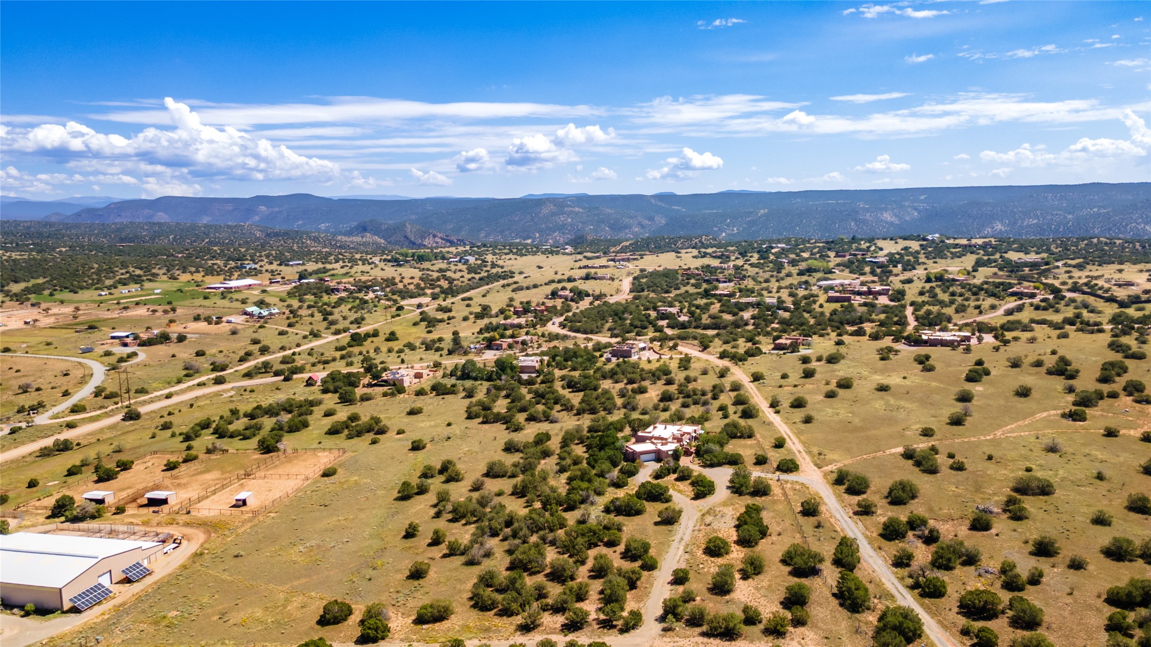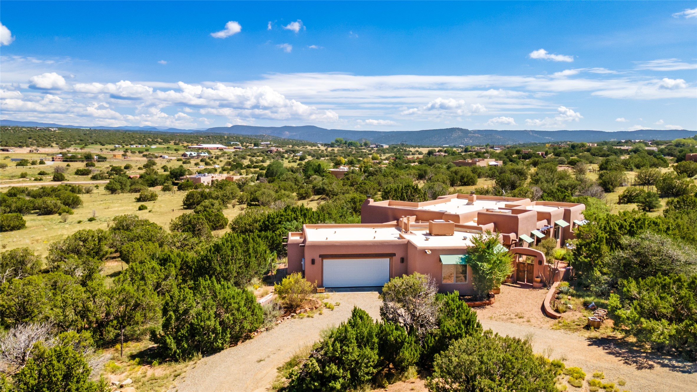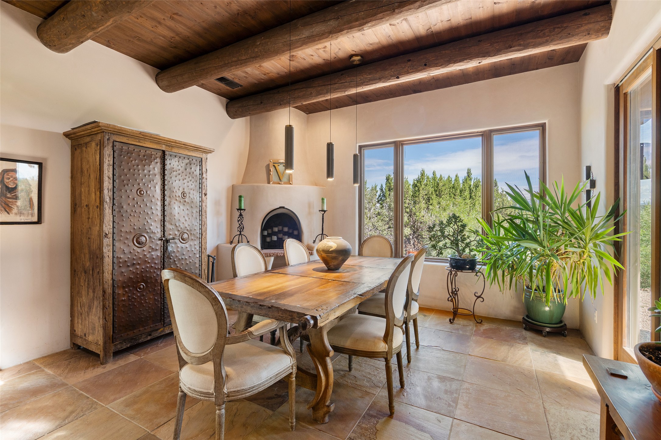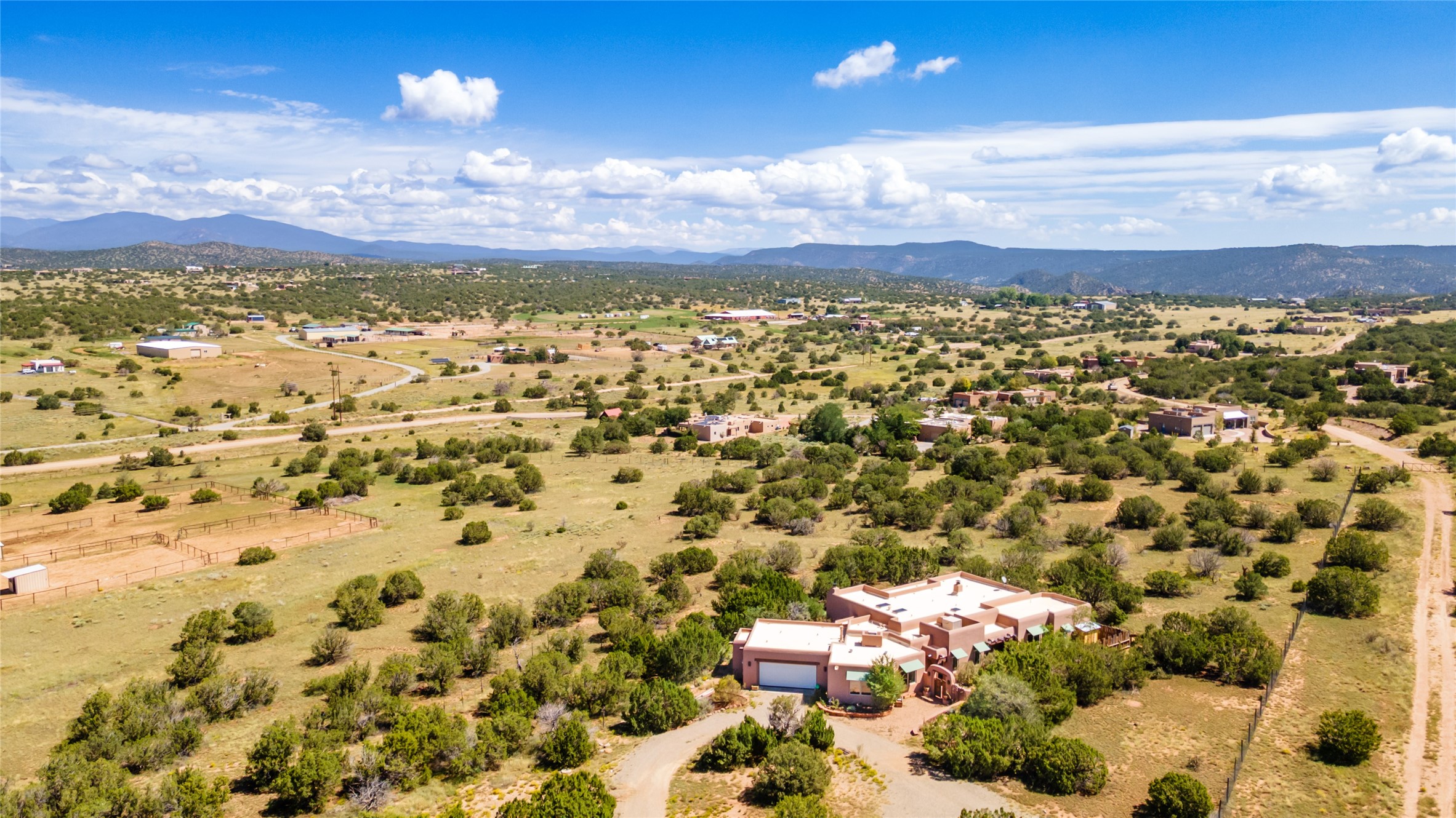 Peaceful Country Living with Room to Roam! If you've been searching for unencumbered horse property, extra elbow room, or simply a serene retreat away from the bustle, this exceptional home delivers. Nestled on 10 fenced acres at the end of a private lane, the elevated setting offers breathtaking eastern views of the Sangre de Cristo Mountains. Enjoy your mornings with sunlit vistas and your evenings under the shaded portal, where sunsets dance across the mountains.A welcoming enclosed courtyard and striking entryway lead inside, where sandstone floors contrast beautifully with vigas and wood-beamed ceilings. Smooth plaster walls add elegance, while thoughtful upgrades throughout the home reflect quality and care. The split three-bedroom floor plan is enhanced by a spacious bonus room with a closet, currently used as an office and game room. The updated kitchen features stainless steel appliances, a convection cooktop, and a cozy dining nook warmed by a kiva fireplace. The owner's suite is a retreat of its own with mountain views, outdoor access, and a luxurious 400+/- square foot bath, boasting a claw-foot soaking tub, steam shower, dual vanities, and a private water closet with bidet. You will also love the spacious laundry room with plenty of storage and utility sink and access to the back yard. Practical amenities include a shared well on the property that supplies both domestic water and drip irrigation, with the option to connect to the community water system if desired. A brand-new TPO roof was installed in 2018. On the acreage, an alternate site with electric and water is ready for a barn, guest house, or studio--making this property as versatile as it is beautiful. Come experience the best of Northern New Mexico living--space, views, and a home filled with timeless Santa Fe character.