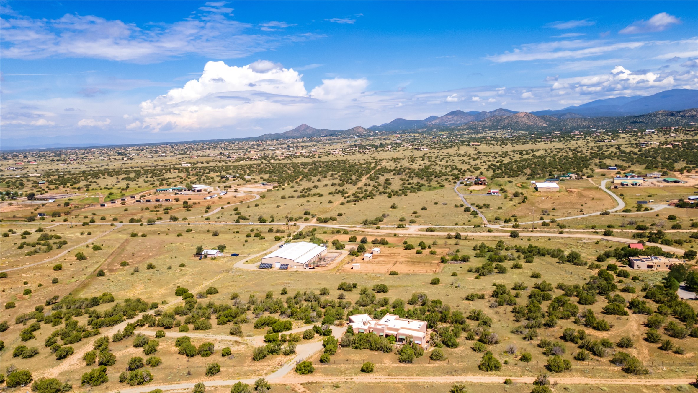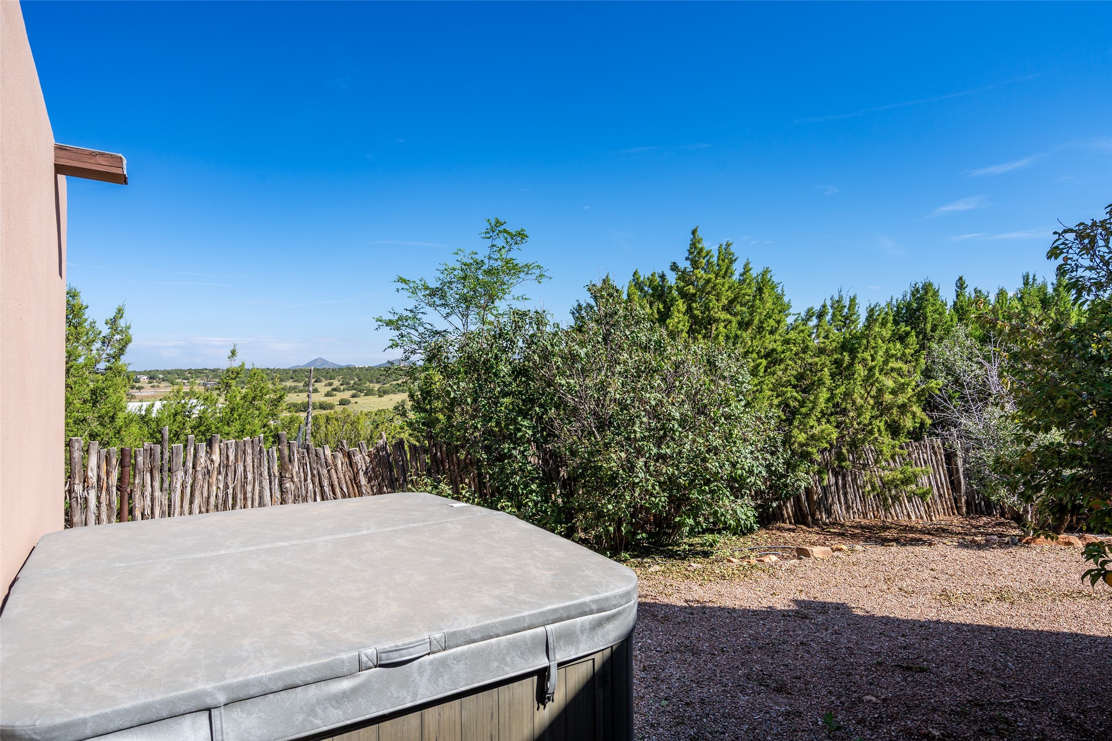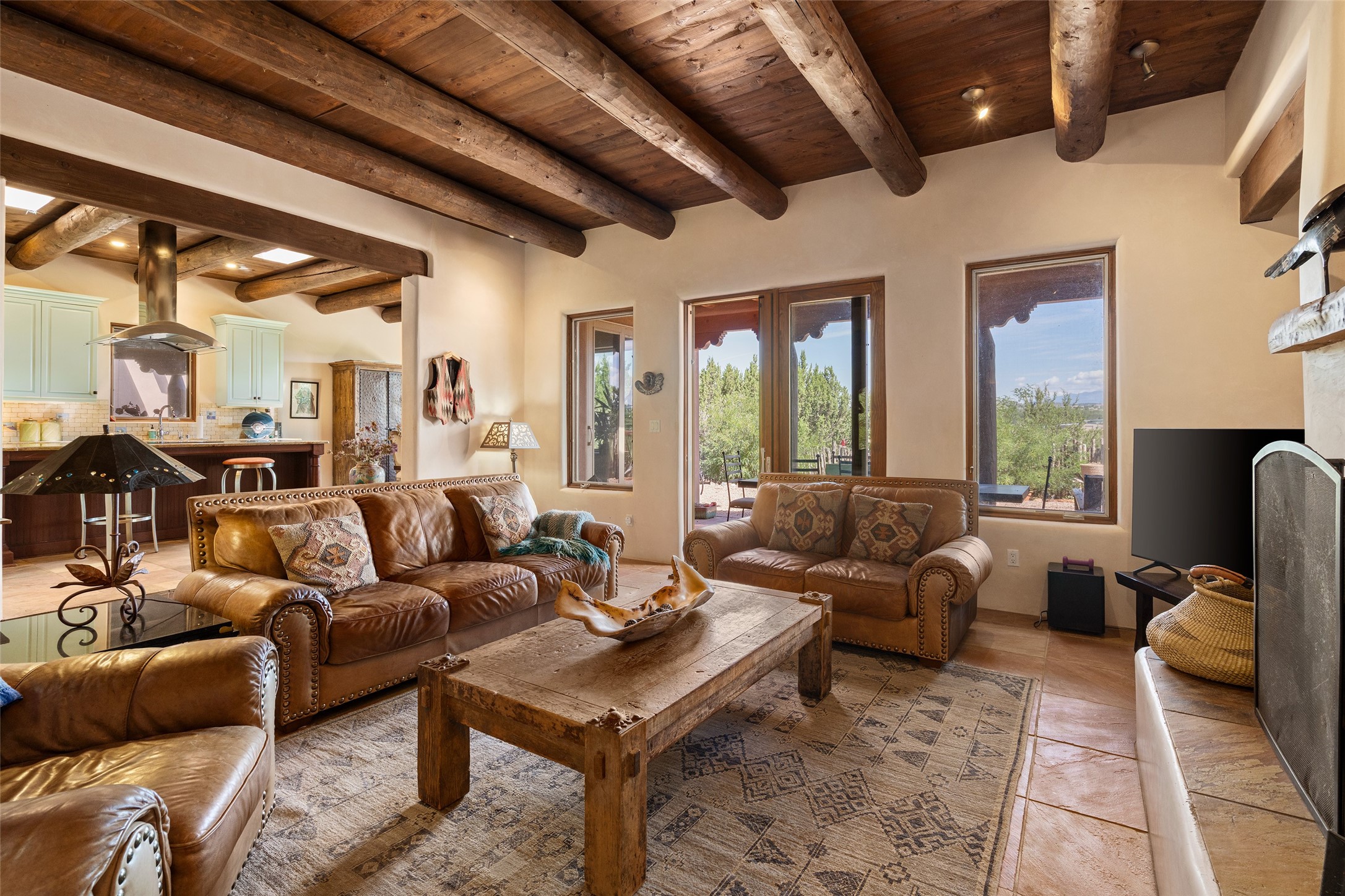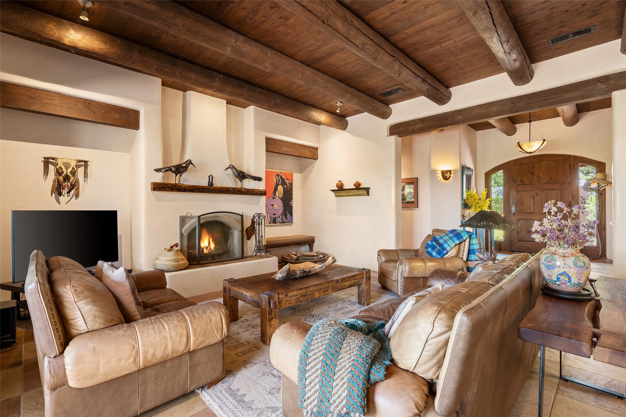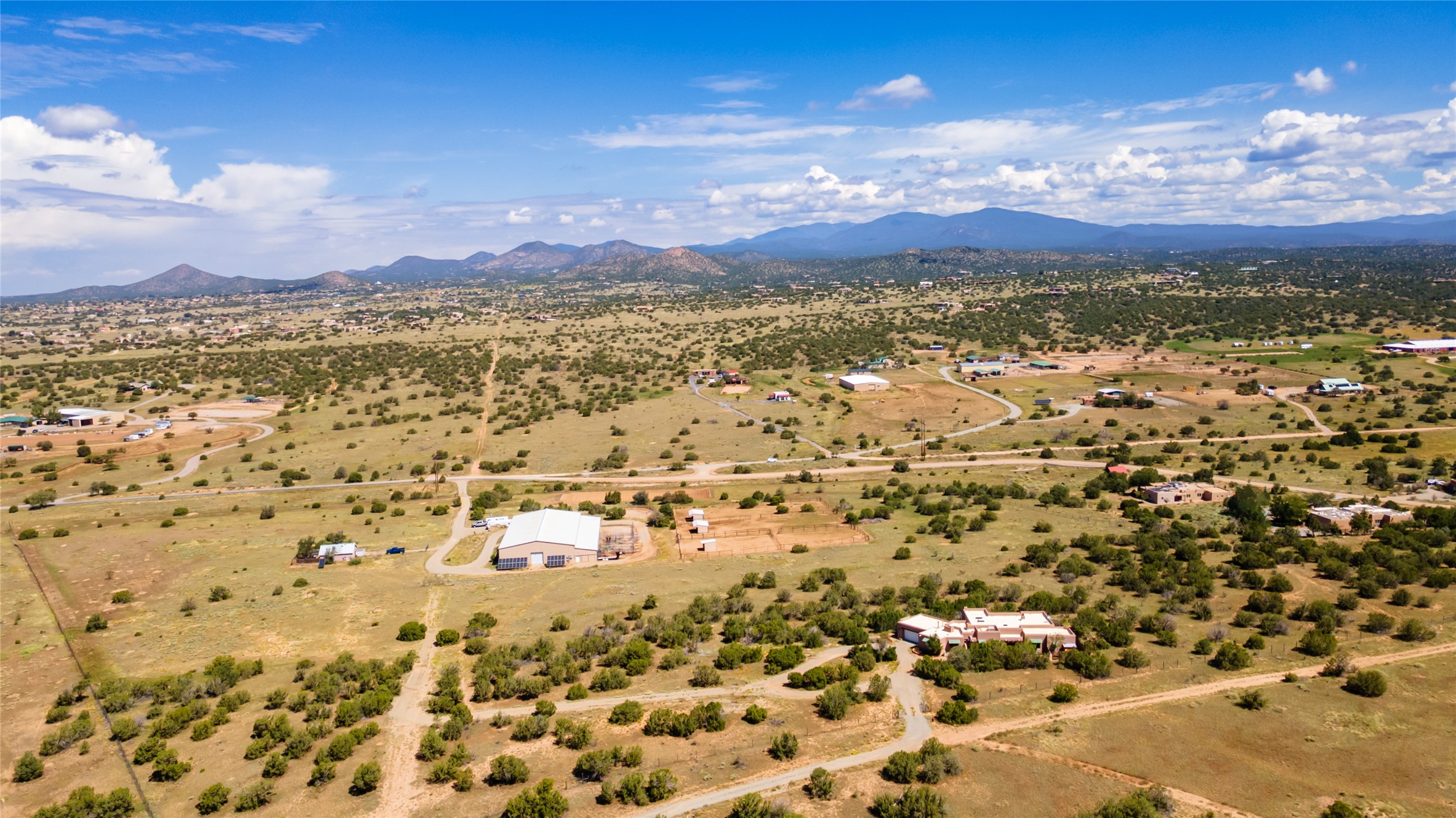 Peaceful Country Living with Room to Roam! If you've been searching for unencumbered horse property, extra elbow room, or simply a serene retreat away from the bustle, this exceptional home delivers. Nestled on 10 fenced acres at the end of a private lane, the elevated setting offers breathtaking eastern views of the Sangre de Cristo Mountains. Enjoy your mornings with sunlit vistas and your evenings under the shaded portal, where sunsets dance across the mountains.A welcoming enclosed courtyard and striking entryway lead inside, where sandstone floors contrast beautifully with vigas and wood-beamed ceilings. Smooth plaster walls add elegance, while thoughtful upgrades throughout the home reflect quality and care. The split three-bedroom floor plan is enhanced by a spacious bonus room with a closet, currently used as an office and game room. The updated kitchen features stainless steel appliances, a convection cooktop, and a cozy dining nook warmed by a kiva fireplace. The owner's suite is a retreat of its own with mountain views, outdoor access, and a luxurious 400+/- square foot bath, boasting a claw-foot soaking tub, steam shower, dual vanities, and a private water closet with bidet. You will also love the spacious laundry room with plenty of storage and utility sink and access to the back yard. Practical amenities include a shared well on the property that supplies both domestic water and drip irrigation, with the option to connect to the community water system if desired. A brand-new TPO roof was installed in 2018. On the acreage, an alternate site with electric and water is ready for a barn, guest house, or studio--making this property as versatile as it is beautiful. Come experience the best of Northern New Mexico living--space, views, and a home filled with timeless Santa Fe character.