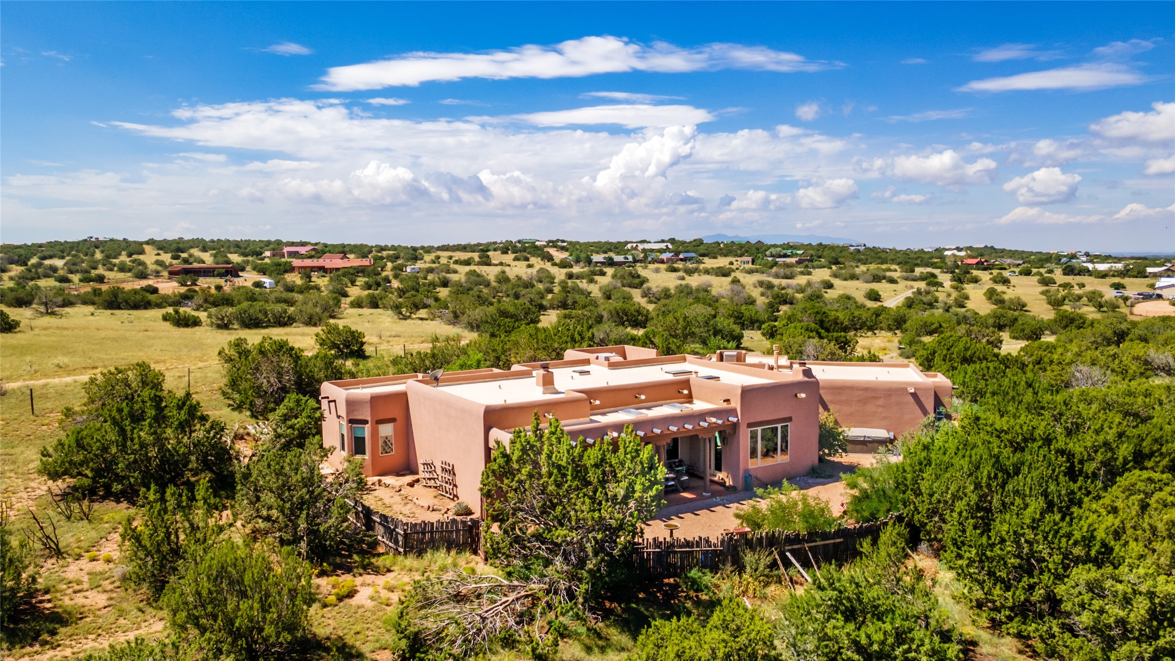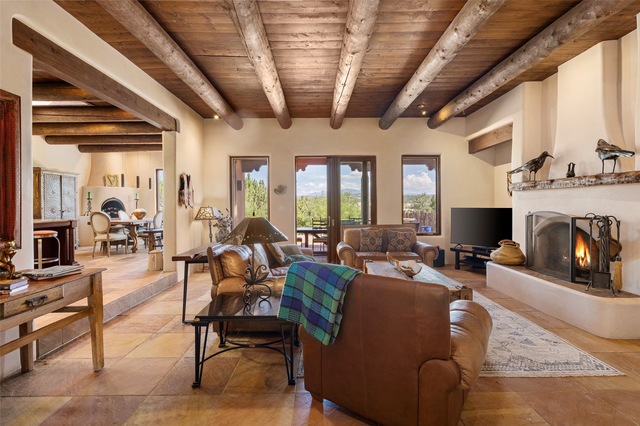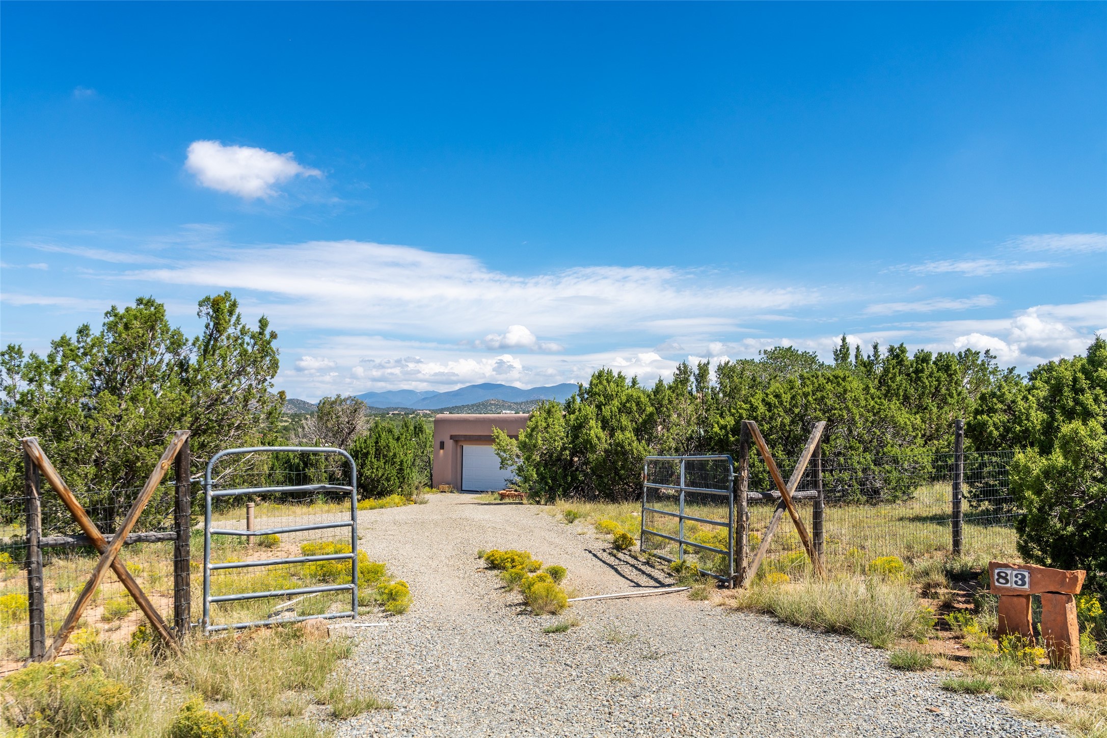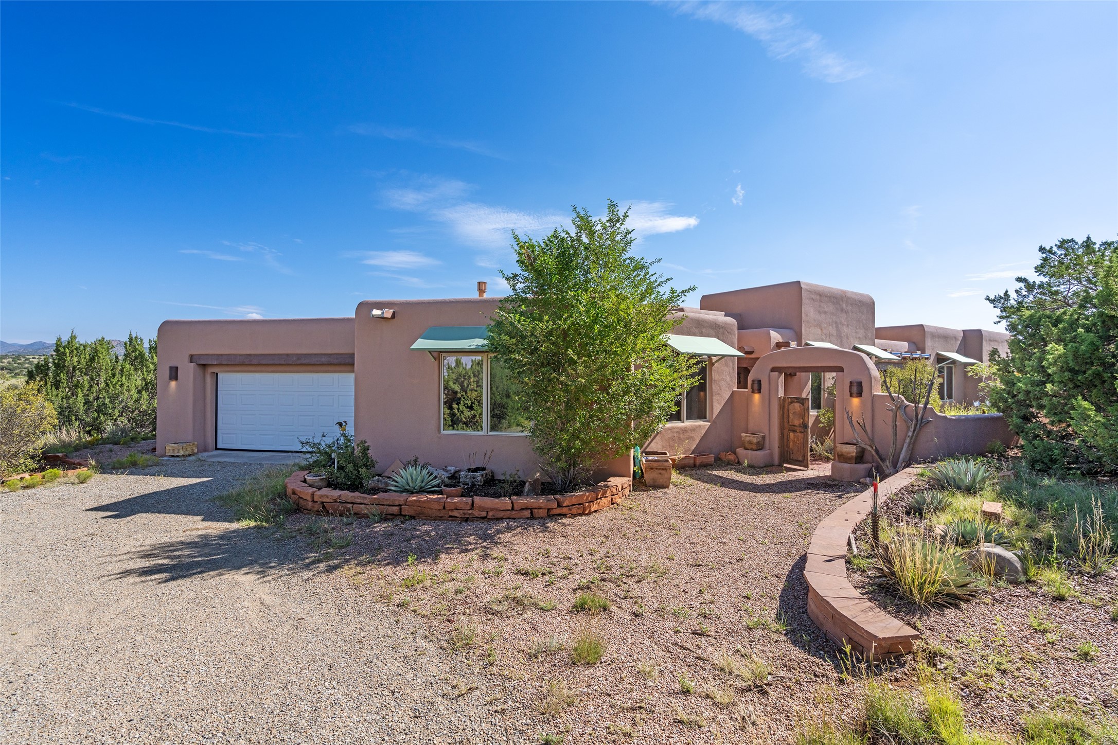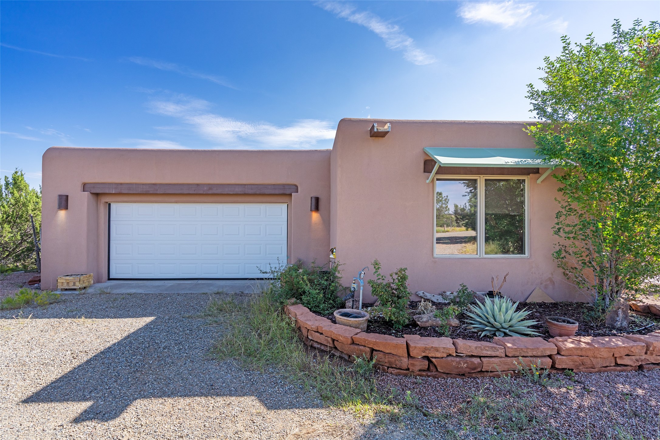 Peaceful Country Living with Room to Roam! If you've been searching for unencumbered horse property, extra elbow room, or simply a serene retreat away from the bustle, this exceptional home delivers. Nestled on 10 fenced acres at the end of a private lane, the elevated setting offers breathtaking eastern views of the Sangre de Cristo Mountains. Enjoy your mornings with sunlit vistas and your evenings under the shaded portal, where sunsets dance across the mountains.A welcoming enclosed courtyard and striking entryway lead inside, where sandstone floors contrast beautifully with vigas and wood-beamed ceilings. Smooth plaster walls add elegance, while thoughtful upgrades throughout the home reflect quality and care. The split three-bedroom floor plan is enhanced by a spacious bonus room with a closet, currently used as an office and game room. The updated kitchen features stainless steel appliances, a convection cooktop, and a cozy dining nook warmed by a kiva fireplace. The owner's suite is a retreat of its own with mountain views, outdoor access, and a luxurious 400+/- square foot bath, boasting a claw-foot soaking tub, steam shower, dual vanities, and a private water closet with bidet. You will also love the spacious laundry room with plenty of storage and utility sink and access to the back yard. Practical amenities include a shared well on the property that supplies both domestic water and drip irrigation, with the option to connect to the community water system if desired. A brand-new TPO roof was installed in 2018. On the acreage, an alternate site with electric and water is ready for a barn, guest house, or studio--making this property as versatile as it is beautiful. Come experience the best of Northern New Mexico living--space, views, and a home filled with timeless Santa Fe character.