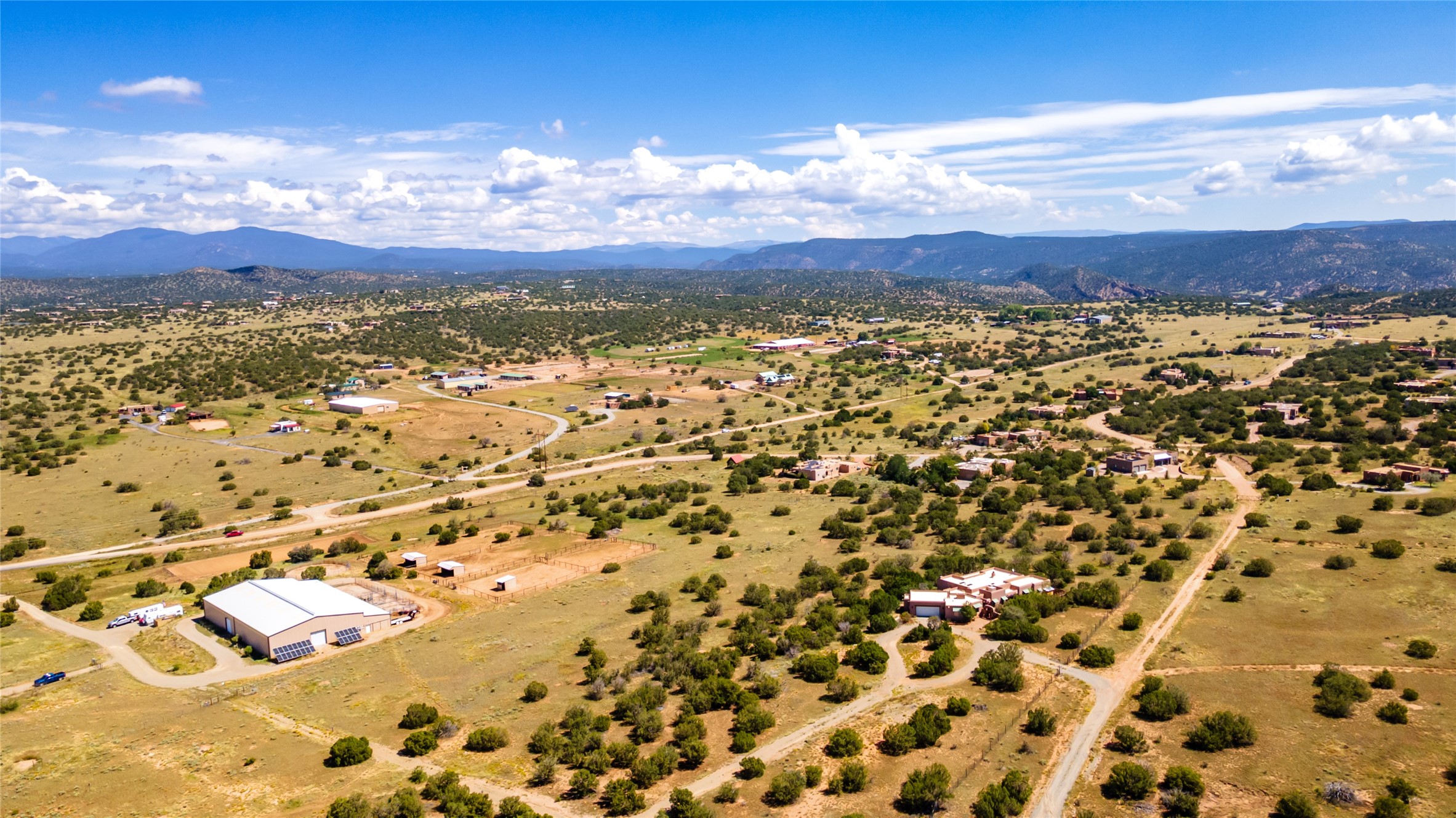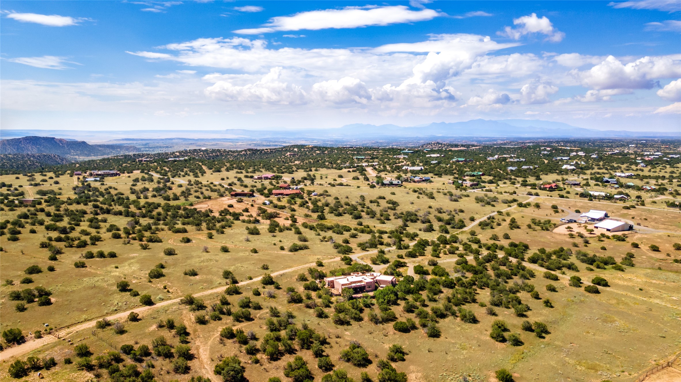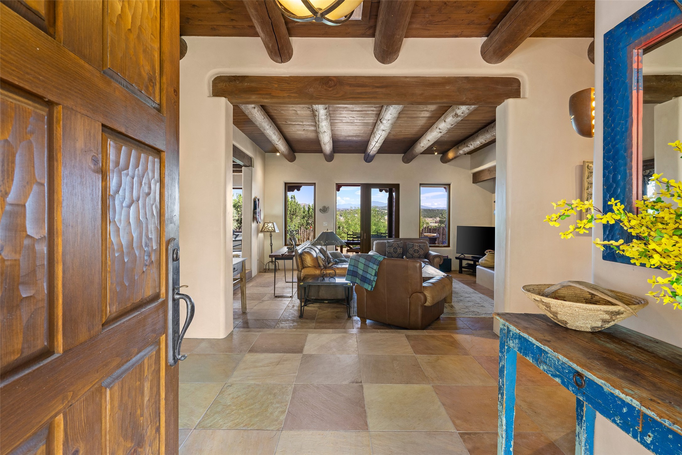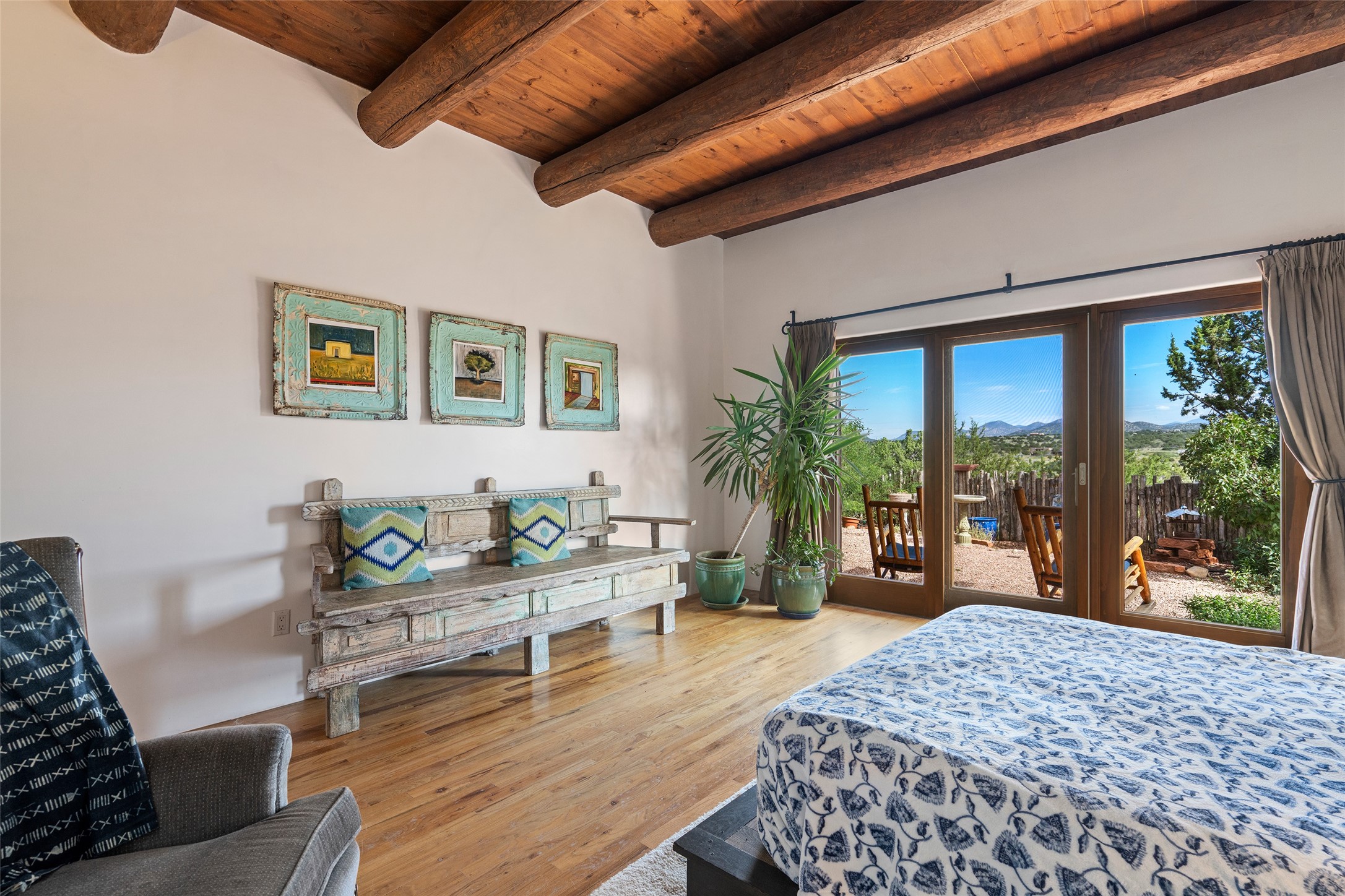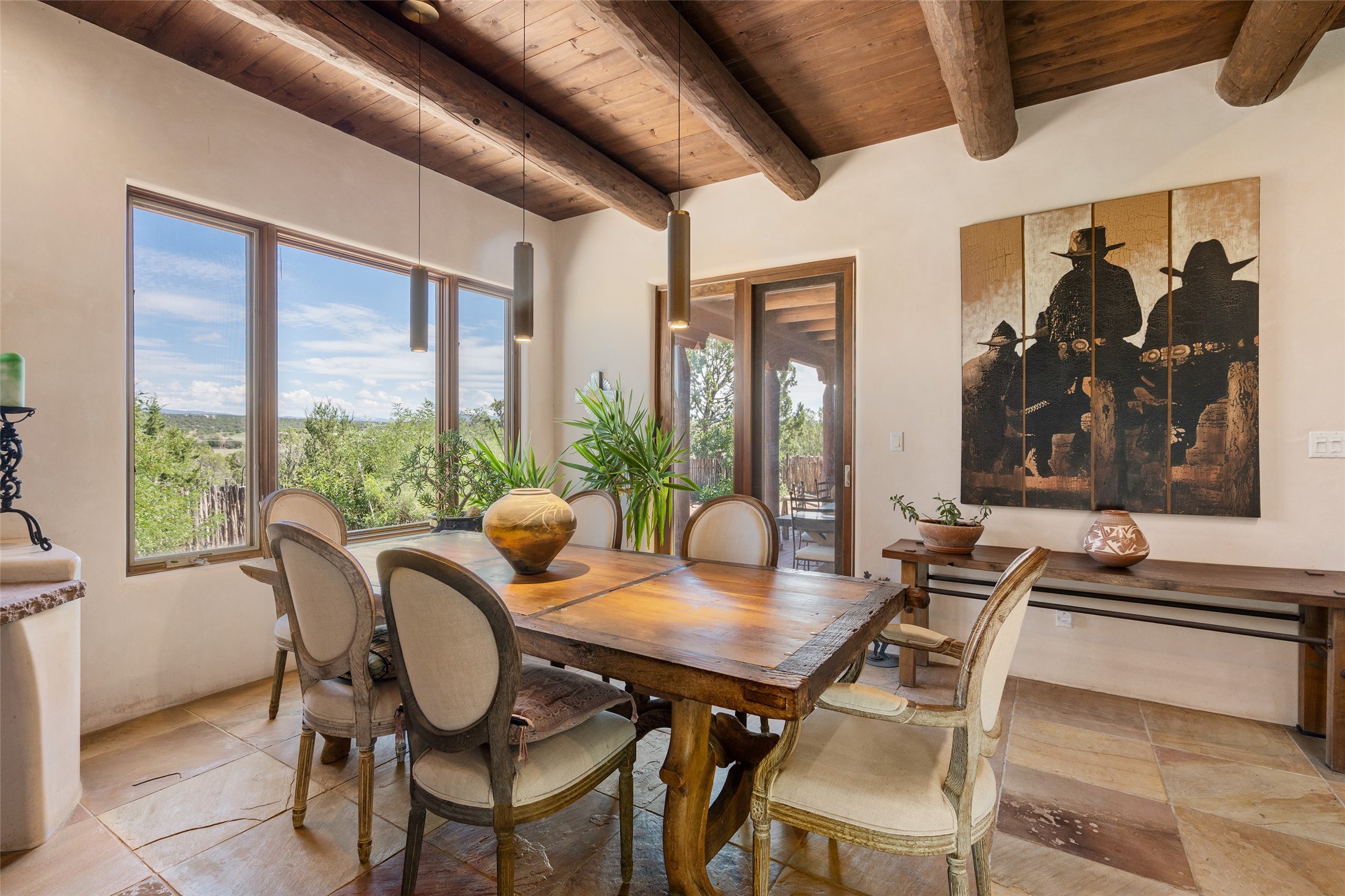 Peaceful Country Living with Room to Roam! If you've been searching for unencumbered horse property, extra elbow room, or simply a serene retreat away from the bustle, this exceptional home delivers. Nestled on 10 fenced acres at the end of a private lane, the elevated setting offers breathtaking eastern views of the Sangre de Cristo Mountains. Enjoy your mornings with sunlit vistas and your evenings under the shaded portal, where sunsets dance across the mountains.A welcoming enclosed courtyard and striking entryway lead inside, where sandstone floors contrast beautifully with vigas and wood-beamed ceilings. Smooth plaster walls add elegance, while thoughtful upgrades throughout the home reflect quality and care. The split three-bedroom floor plan is enhanced by a spacious bonus room with a closet, currently used as an office and game room. The updated kitchen features stainless steel appliances, a convection cooktop, and a cozy dining nook warmed by a kiva fireplace. The owner's suite is a retreat of its own with mountain views, outdoor access, and a luxurious 400+/- square foot bath, boasting a claw-foot soaking tub, steam shower, dual vanities, and a private water closet with bidet. You will also love the spacious laundry room with plenty of storage and utility sink and access to the back yard. Practical amenities include a shared well on the property that supplies both domestic water and drip irrigation, with the option to connect to the community water system if desired. A brand-new TPO roof was installed in 2018. On the acreage, an alternate site with electric and water is ready for a barn, guest house, or studio--making this property as versatile as it is beautiful. Come experience the best of Northern New Mexico living--space, views, and a home filled with timeless Santa Fe character.