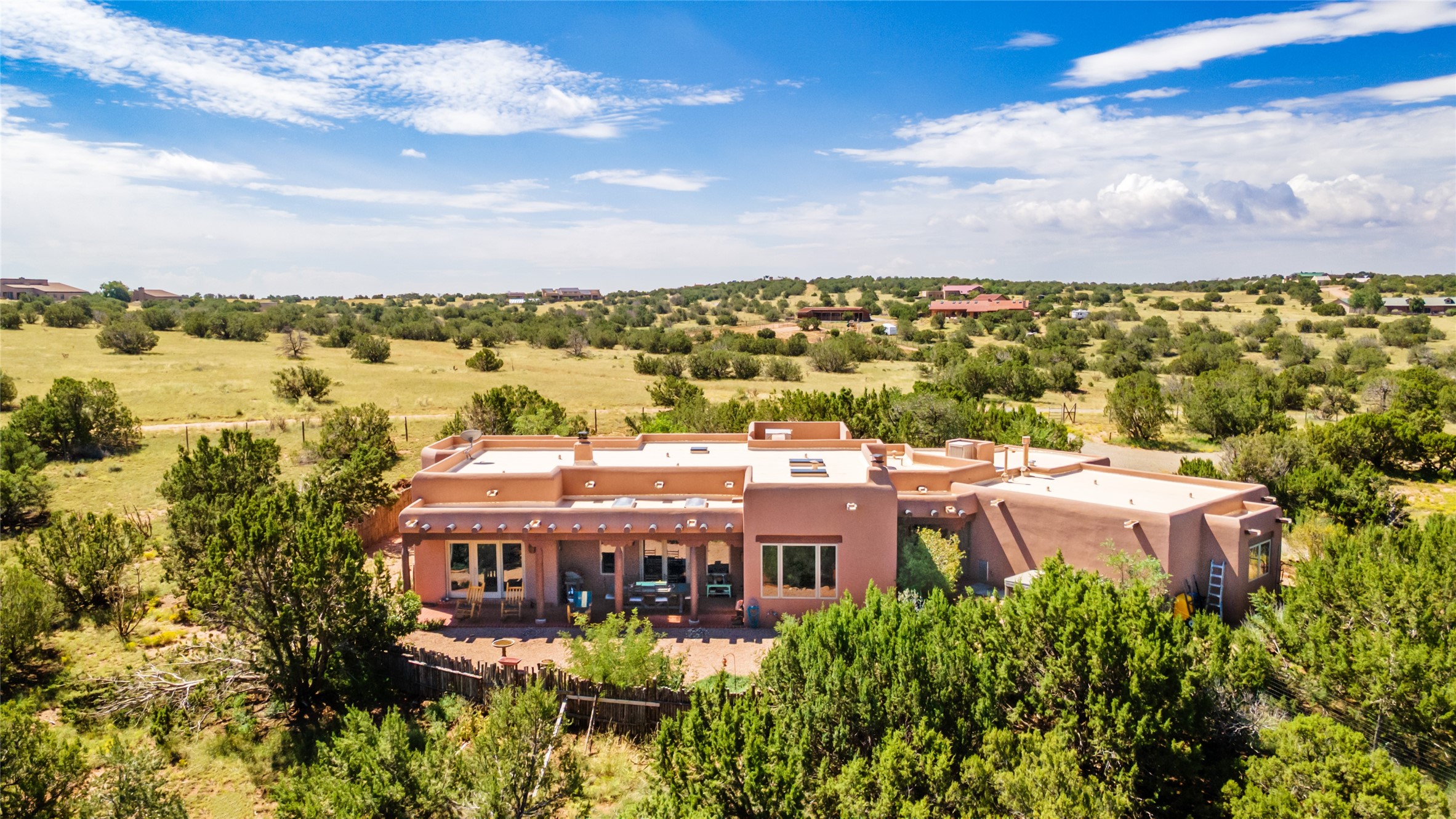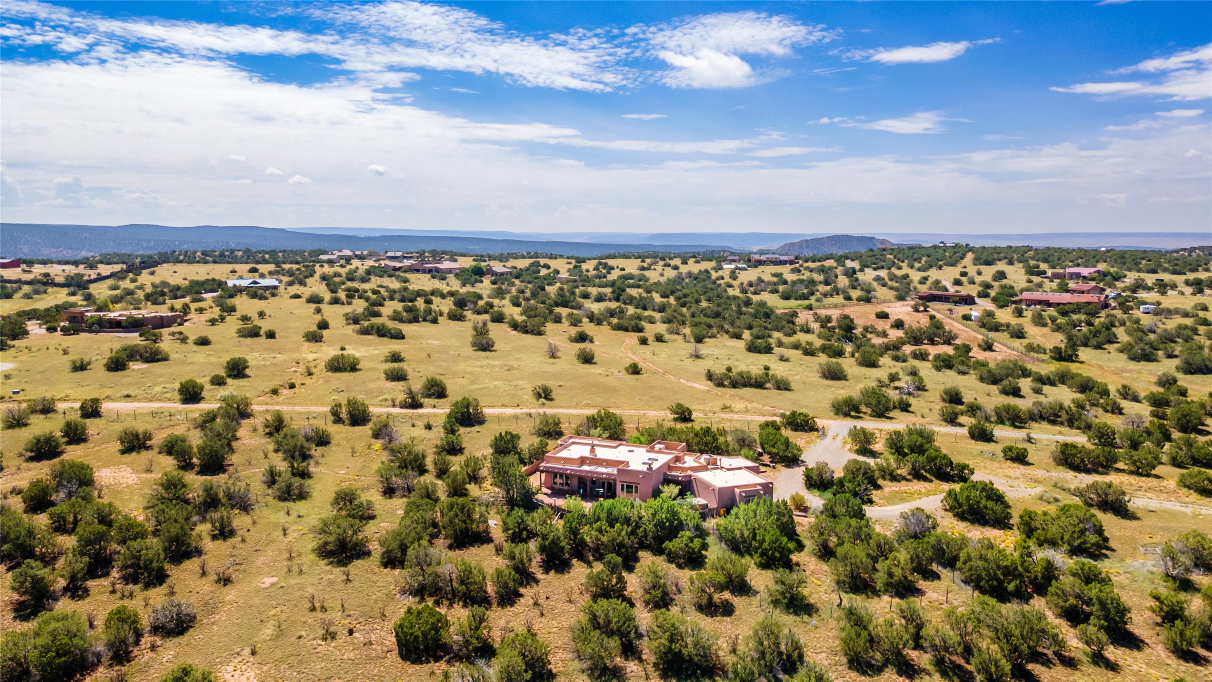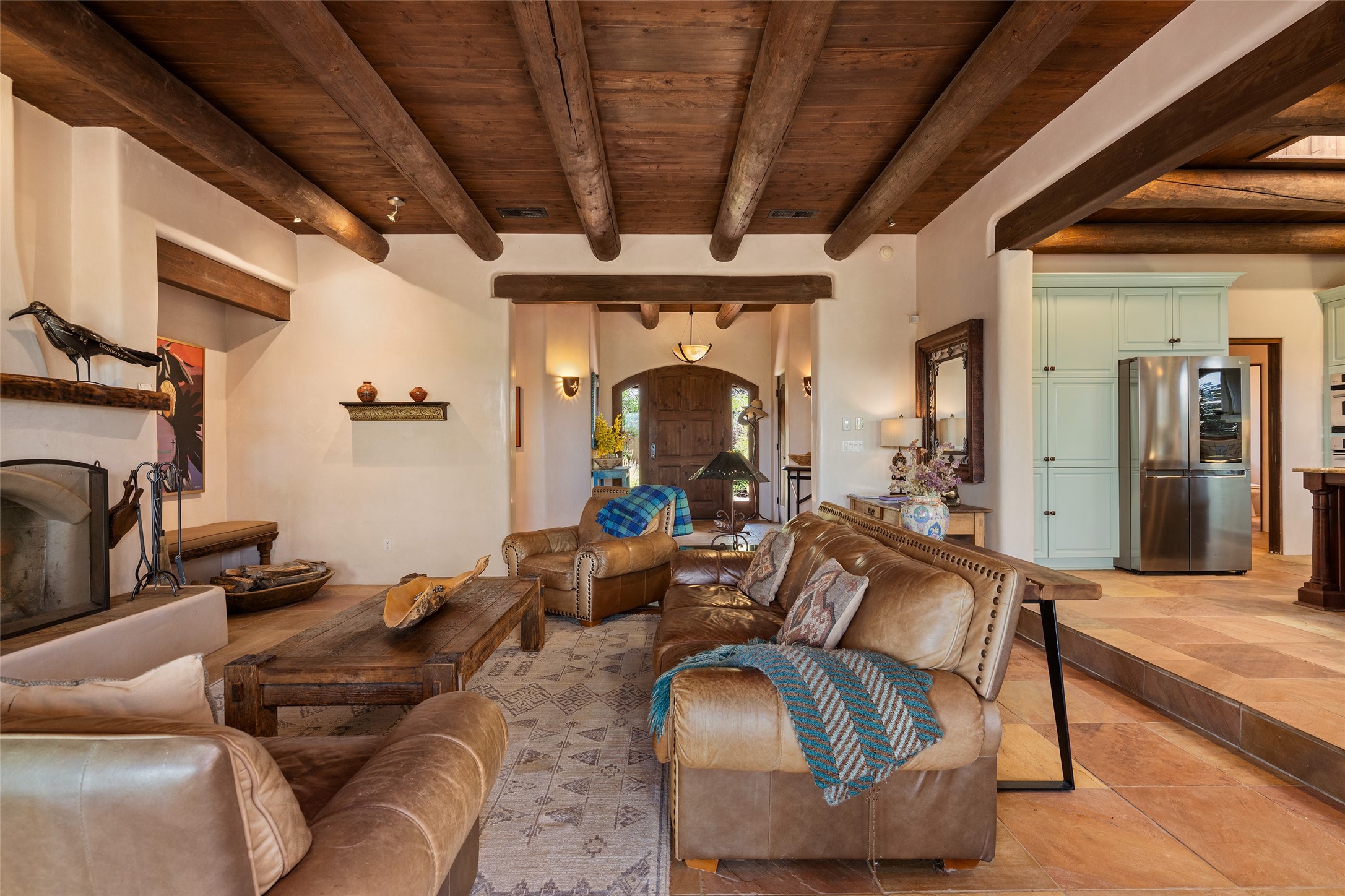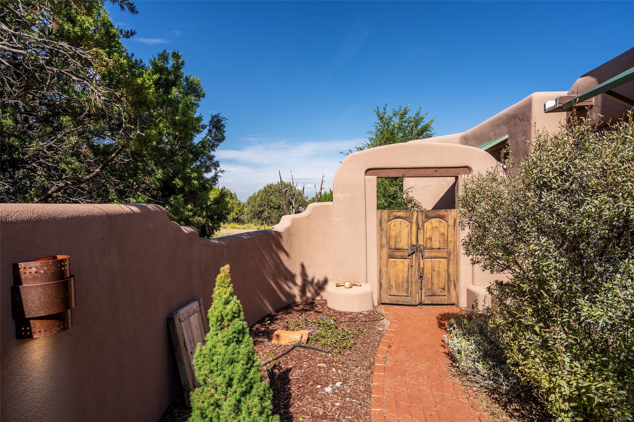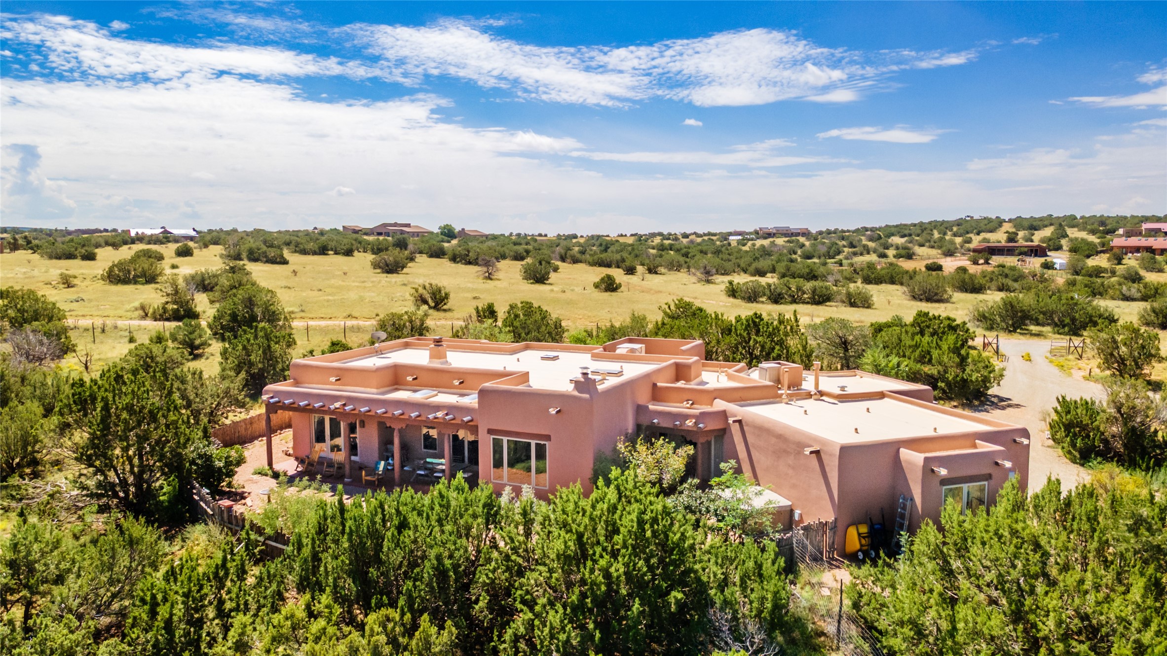 Peaceful Country Living with Room to Roam! If you've been searching for unencumbered horse property, extra elbow room, or simply a serene retreat away from the bustle, this exceptional home delivers. Nestled on 10 fenced acres at the end of a private lane, the elevated setting offers breathtaking eastern views of the Sangre de Cristo Mountains. Enjoy your mornings with sunlit vistas and your evenings under the shaded portal, where sunsets dance across the mountains.A welcoming enclosed courtyard and striking entryway lead inside, where sandstone floors contrast beautifully with vigas and wood-beamed ceilings. Smooth plaster walls add elegance, while thoughtful upgrades throughout the home reflect quality and care. The split three-bedroom floor plan is enhanced by a spacious bonus room with a closet, currently used as an office and game room. The updated kitchen features stainless steel appliances, a convection cooktop, and a cozy dining nook warmed by a kiva fireplace. The owner's suite is a retreat of its own with mountain views, outdoor access, and a luxurious 400+/- square foot bath, boasting a claw-foot soaking tub, steam shower, dual vanities, and a private water closet with bidet. You will also love the spacious laundry room with plenty of storage and utility sink and access to the back yard. Practical amenities include a shared well on the property that supplies both domestic water and drip irrigation, with the option to connect to the community water system if desired. A brand-new TPO roof was installed in 2018. On the acreage, an alternate site with electric and water is ready for a barn, guest house, or studio--making this property as versatile as it is beautiful. Come experience the best of Northern New Mexico living--space, views, and a home filled with timeless Santa Fe character.