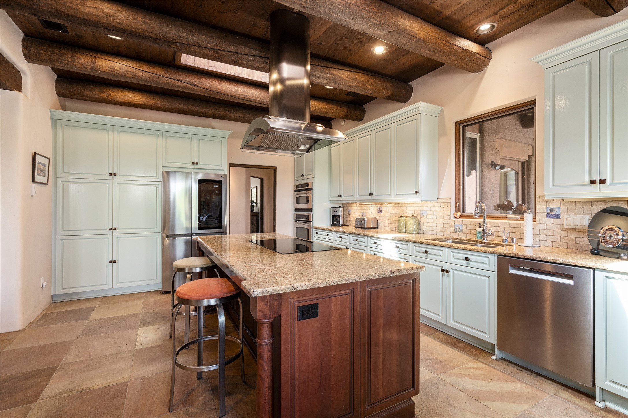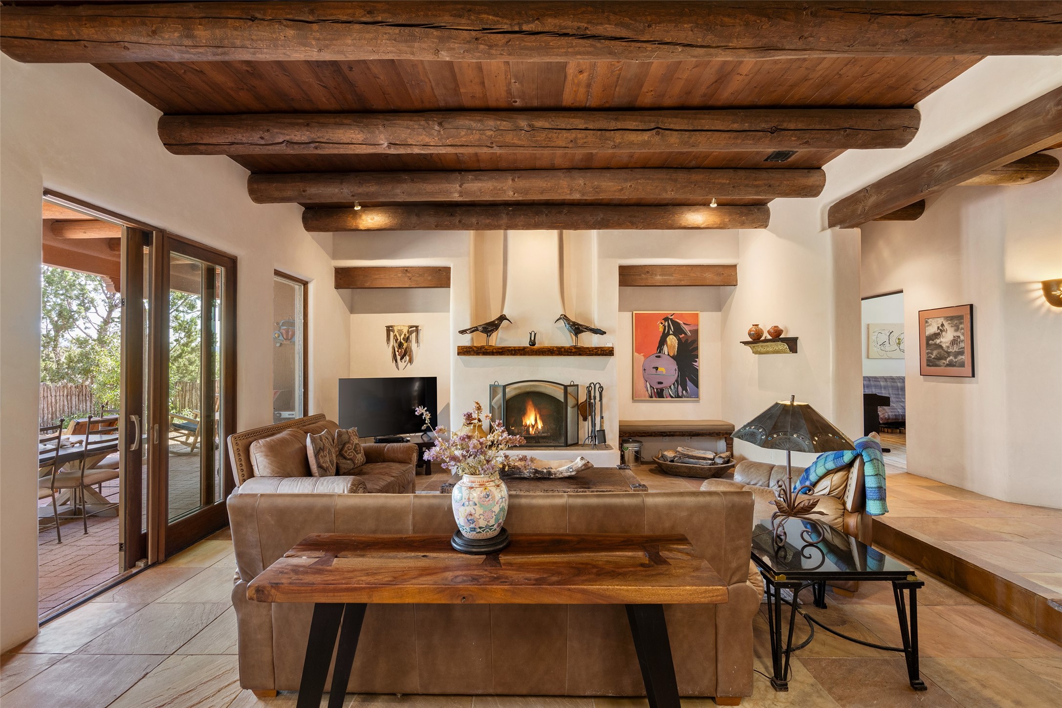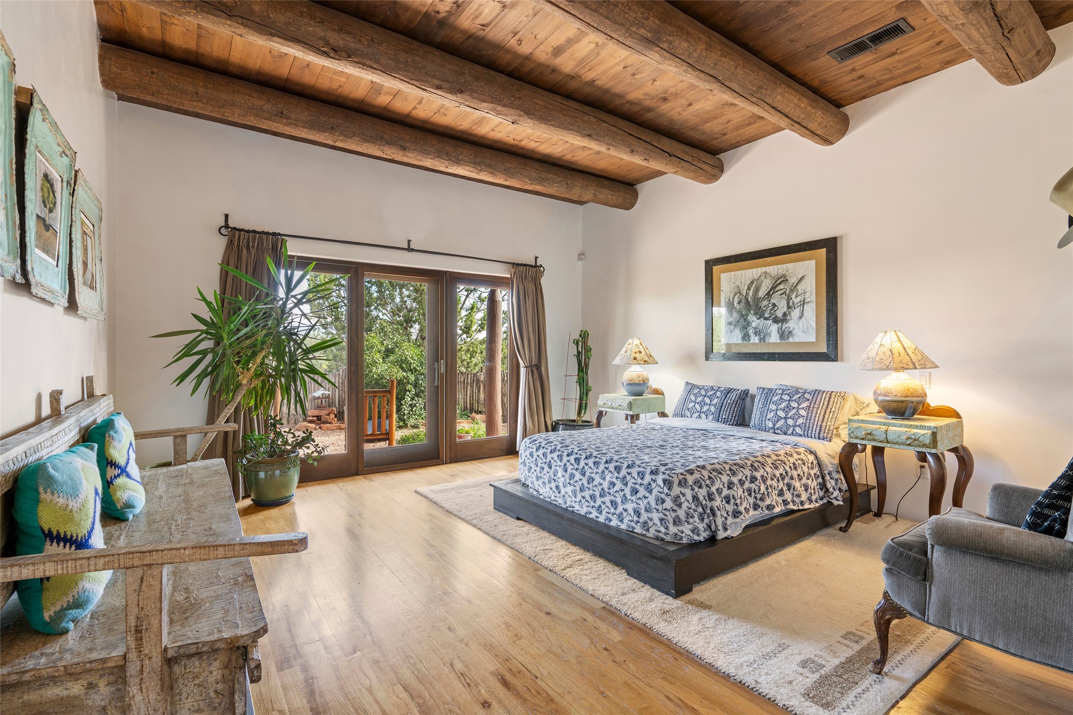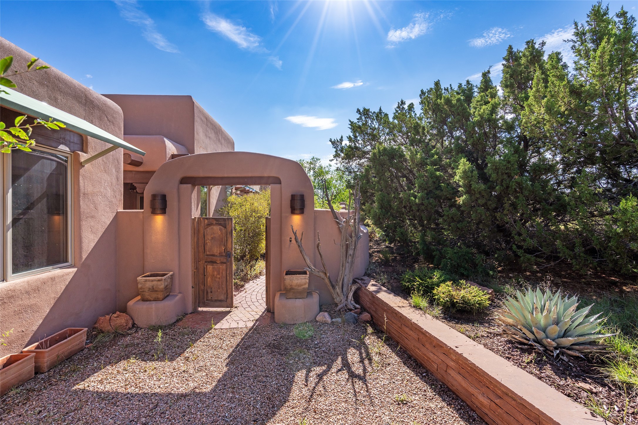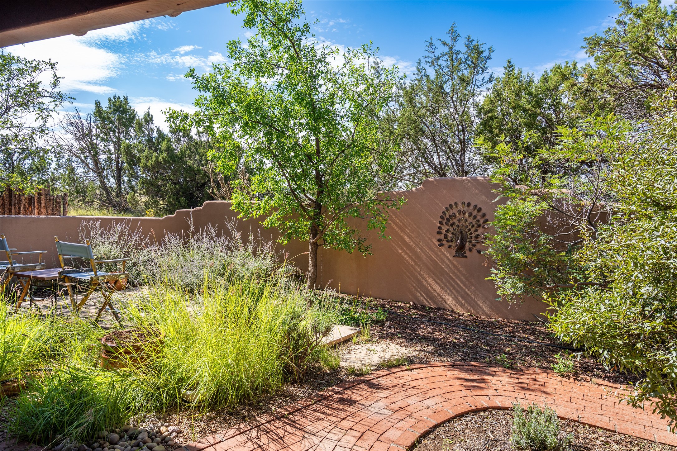 Peaceful Country Living with Room to Roam! If you've been searching for unencumbered horse property, extra elbow room, or simply a serene retreat away from the bustle, this exceptional home delivers. Nestled on 10 fenced acres at the end of a private lane, the elevated setting offers breathtaking eastern views of the Sangre de Cristo Mountains. Enjoy your mornings with sunlit vistas and your evenings under the shaded portal, where sunsets dance across the mountains.A welcoming enclosed courtyard and striking entryway lead inside, where sandstone floors contrast beautifully with vigas and wood-beamed ceilings. Smooth plaster walls add elegance, while thoughtful upgrades throughout the home reflect quality and care. The split three-bedroom floor plan is enhanced by a spacious bonus room with a closet, currently used as an office and game room. The updated kitchen features stainless steel appliances, a convection cooktop, and a cozy dining nook warmed by a kiva fireplace. The owner's suite is a retreat of its own with mountain views, outdoor access, and a luxurious 400+/- square foot bath, boasting a claw-foot soaking tub, steam shower, dual vanities, and a private water closet with bidet. You will also love the spacious laundry room with plenty of storage and utility sink and access to the back yard. Practical amenities include a shared well on the property that supplies both domestic water and drip irrigation, with the option to connect to the community water system if desired. A brand-new TPO roof was installed in 2018. On the acreage, an alternate site with electric and water is ready for a barn, guest house, or studio--making this property as versatile as it is beautiful. Come experience the best of Northern New Mexico living--space, views, and a home filled with timeless Santa Fe character.