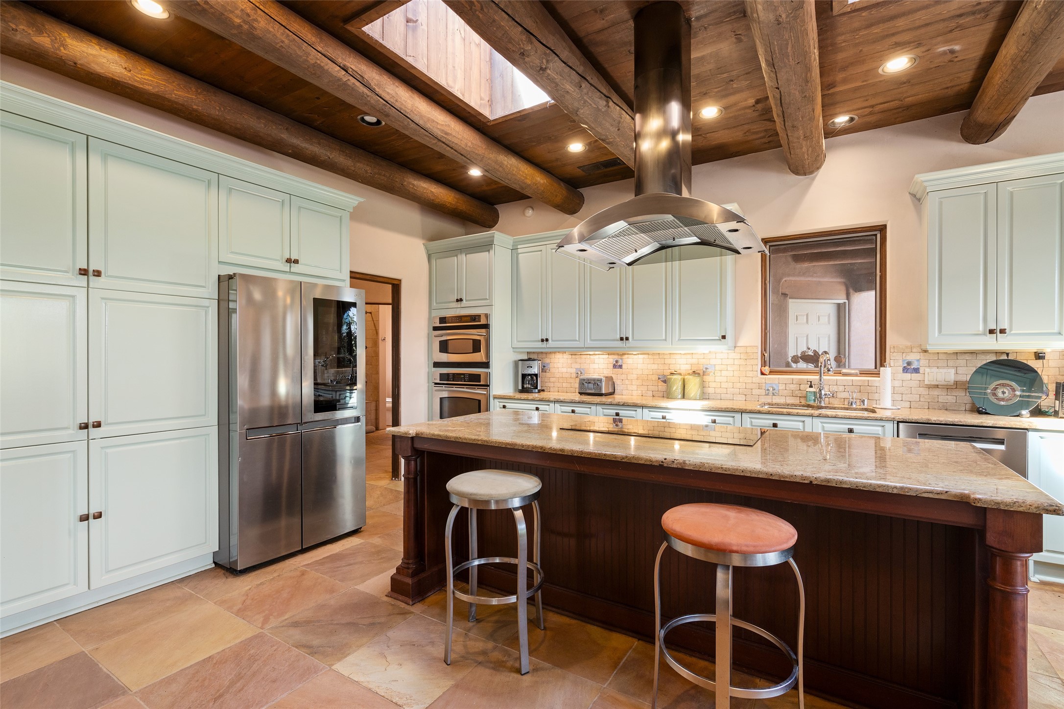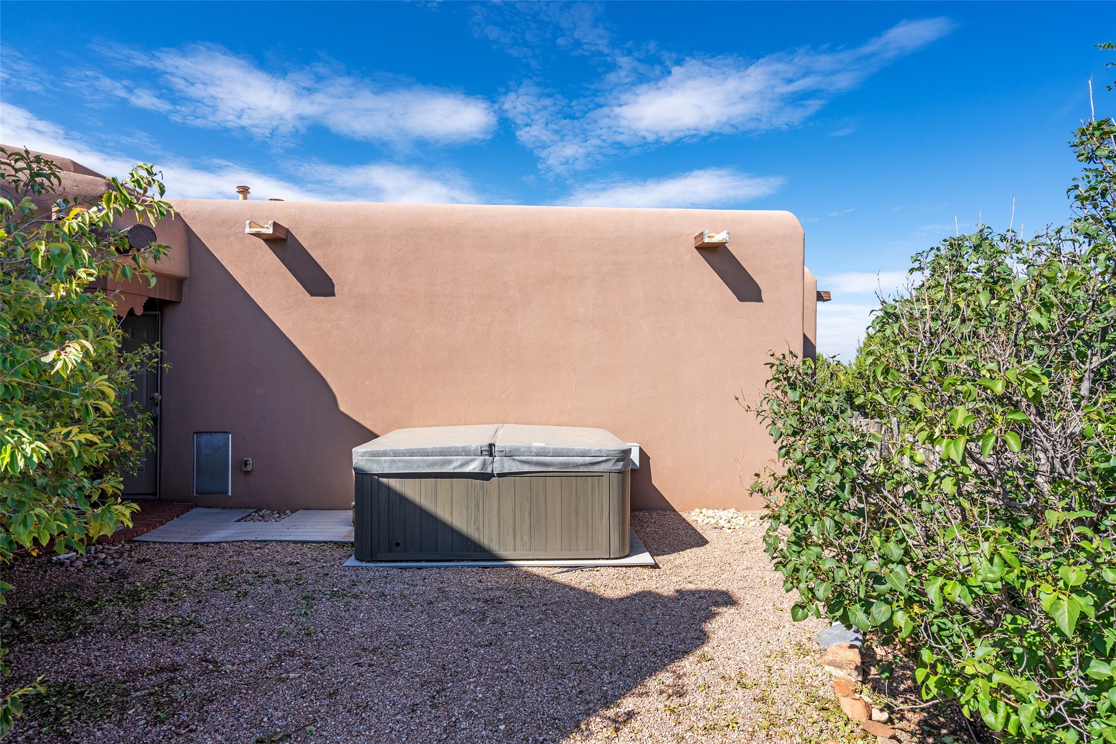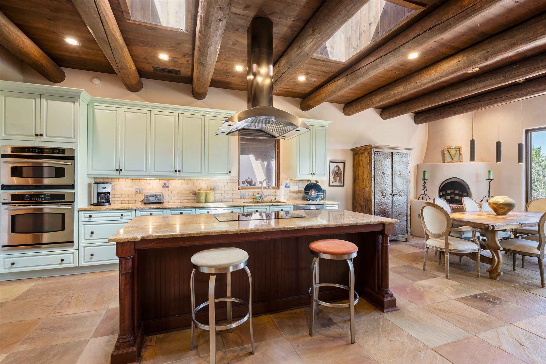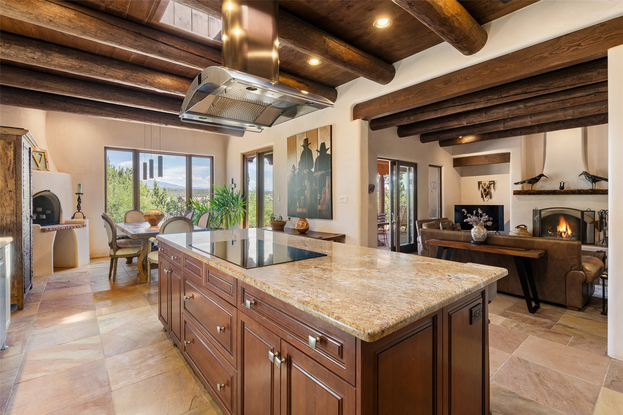 Peaceful Country Living with Room to Roam! If you've been searching for unencumbered horse property, extra elbow room, or simply a serene retreat away from the bustle, this exceptional home delivers. Nestled on 10 fenced acres at the end of a private lane, the elevated setting offers breathtaking eastern views of the Sangre de Cristo Mountains. Enjoy your mornings with sunlit vistas and your evenings under the shaded portal, where sunsets dance across the mountains.A welcoming enclosed courtyard and striking entryway lead inside, where sandstone floors contrast beautifully with vigas and wood-beamed ceilings. Smooth plaster walls add elegance, while thoughtful upgrades throughout the home reflect quality and care. The split three-bedroom floor plan is enhanced by a spacious bonus room with a closet, currently used as an office and game room. The updated kitchen features stainless steel appliances, a convection cooktop, and a cozy dining nook warmed by a kiva fireplace. The owner's suite is a retreat of its own with mountain views, outdoor access, and a luxurious 400+/- square foot bath, boasting a claw-foot soaking tub, steam shower, dual vanities, and a private water closet with bidet. You will also love the spacious laundry room with plenty of storage and utility sink and access to the back yard. Practical amenities include a shared well on the property that supplies both domestic water and drip irrigation, with the option to connect to the community water system if desired. A brand-new TPO roof was installed in 2018. On the acreage, an alternate site with electric and water is ready for a barn, guest house, or studio--making this property as versatile as it is beautiful. Come experience the best of Northern New Mexico living--space, views, and a home filled with timeless Santa Fe character.