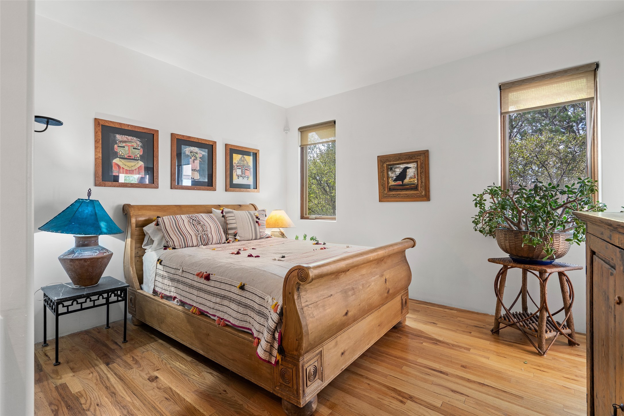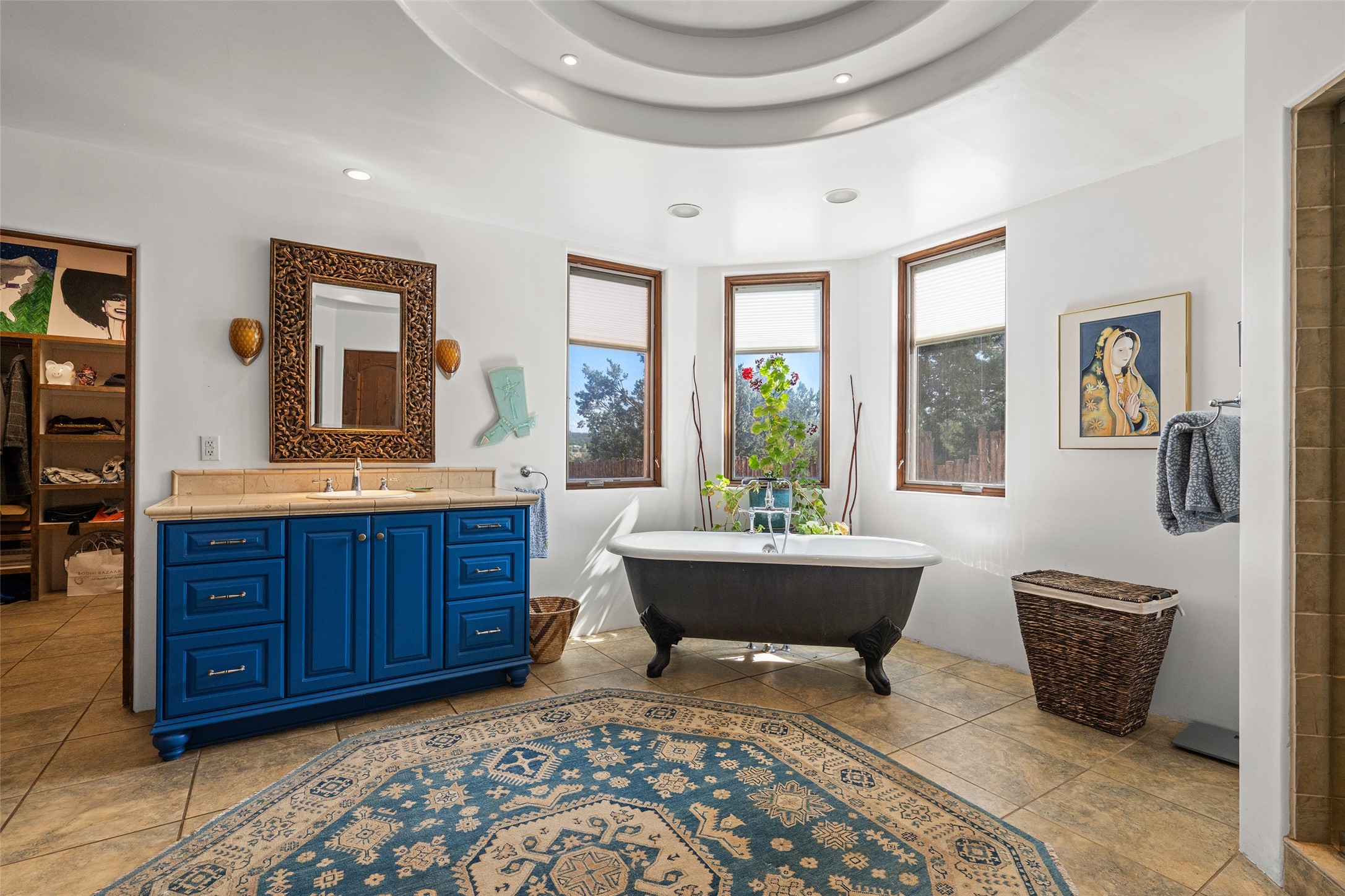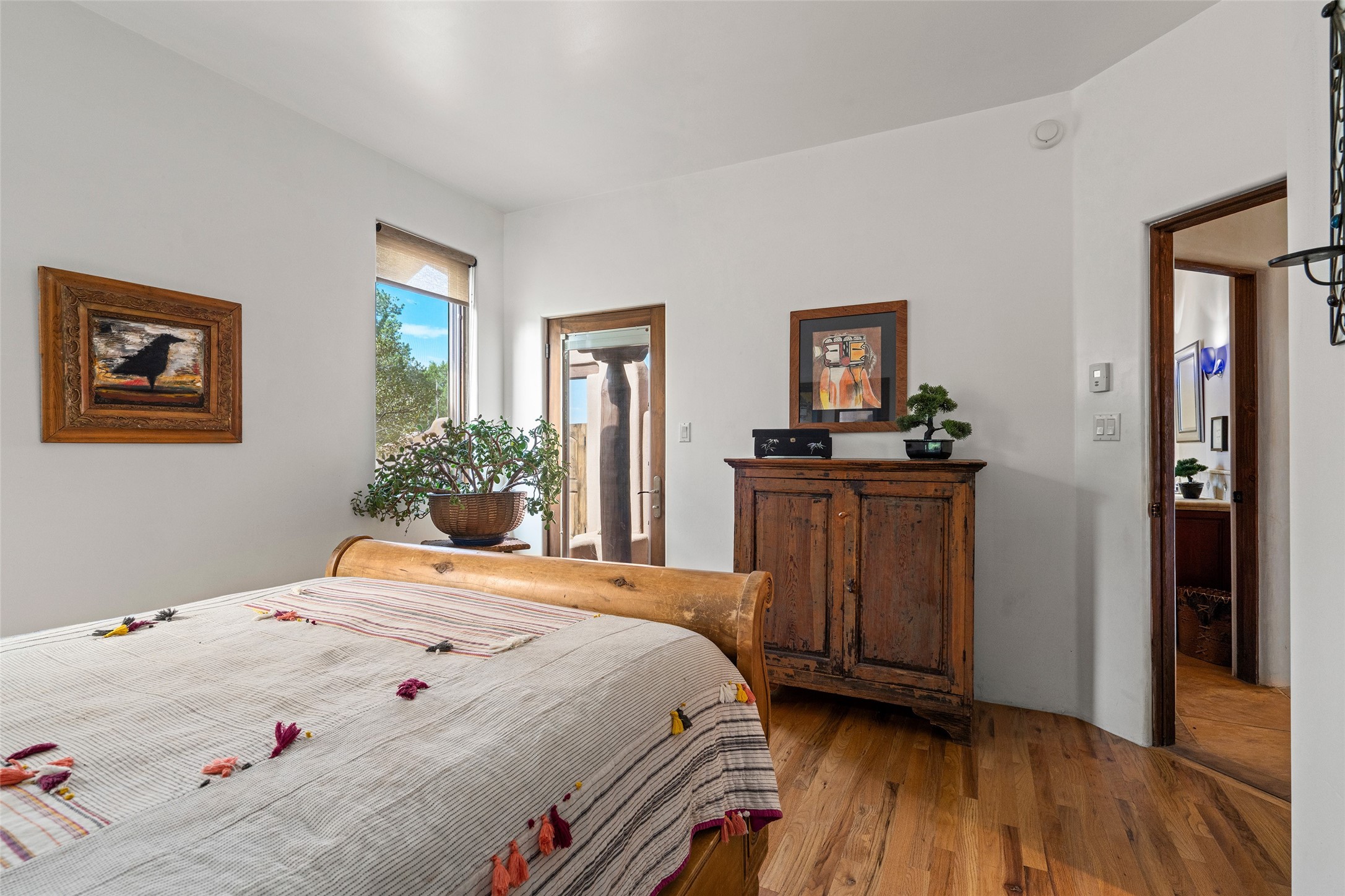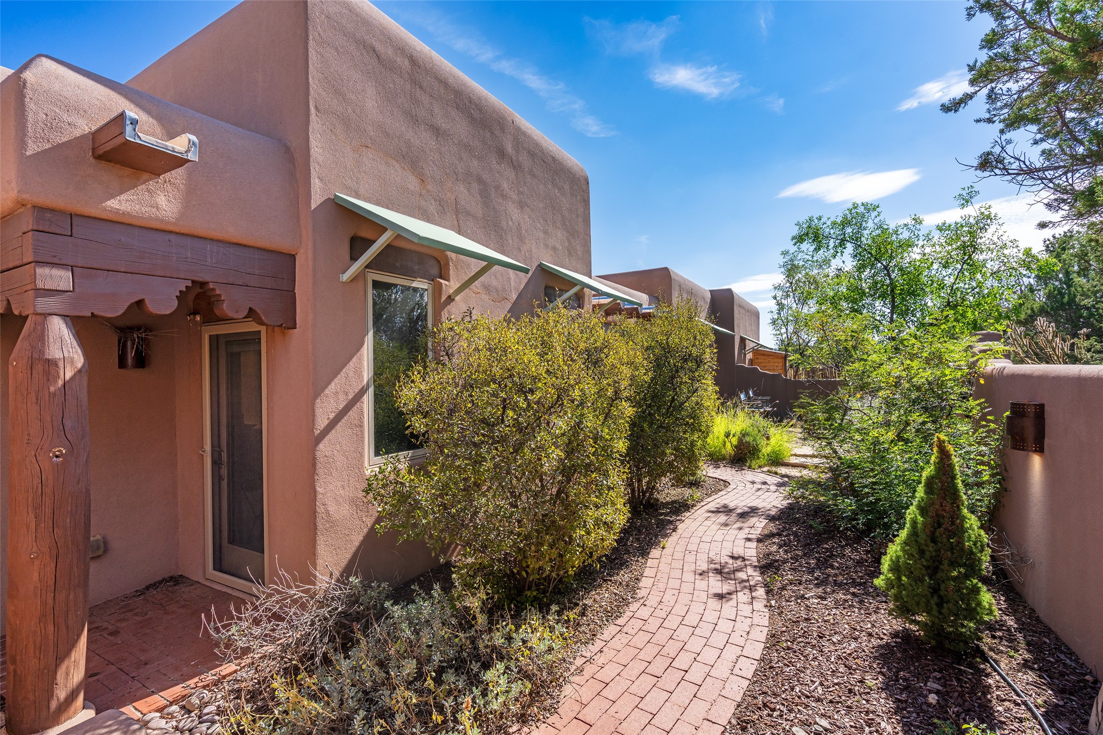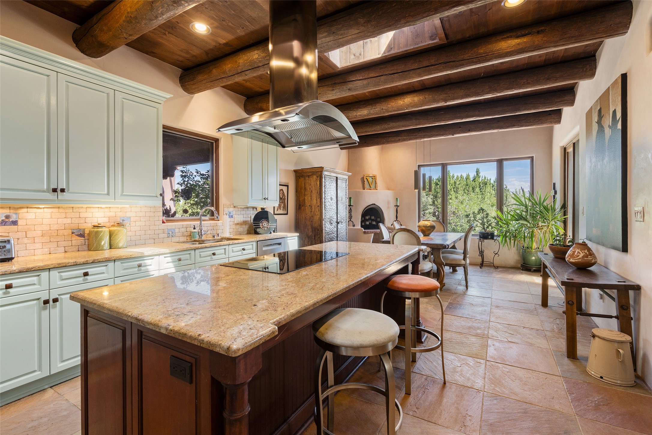 Peaceful Country Living with Room to Roam! If you've been searching for unencumbered horse property, extra elbow room, or simply a serene retreat away from the bustle, this exceptional home delivers. Nestled on 10 fenced acres at the end of a private lane, the elevated setting offers breathtaking eastern views of the Sangre de Cristo Mountains. Enjoy your mornings with sunlit vistas and your evenings under the shaded portal, where sunsets dance across the mountains.A welcoming enclosed courtyard and striking entryway lead inside, where sandstone floors contrast beautifully with vigas and wood-beamed ceilings. Smooth plaster walls add elegance, while thoughtful upgrades throughout the home reflect quality and care. The split three-bedroom floor plan is enhanced by a spacious bonus room with a closet, currently used as an office and game room. The updated kitchen features stainless steel appliances, a convection cooktop, and a cozy dining nook warmed by a kiva fireplace. The owner's suite is a retreat of its own with mountain views, outdoor access, and a luxurious 400+/- square foot bath, boasting a claw-foot soaking tub, steam shower, dual vanities, and a private water closet with bidet. You will also love the spacious laundry room with plenty of storage and utility sink and access to the back yard. Practical amenities include a shared well on the property that supplies both domestic water and drip irrigation, with the option to connect to the community water system if desired. A brand-new TPO roof was installed in 2018. On the acreage, an alternate site with electric and water is ready for a barn, guest house, or studio--making this property as versatile as it is beautiful. Come experience the best of Northern New Mexico living--space, views, and a home filled with timeless Santa Fe character.
