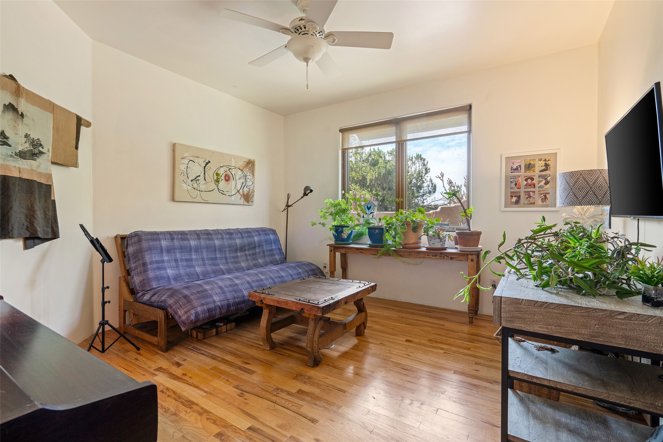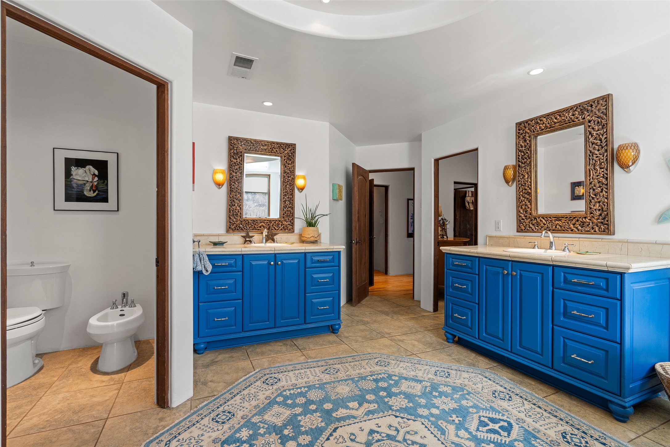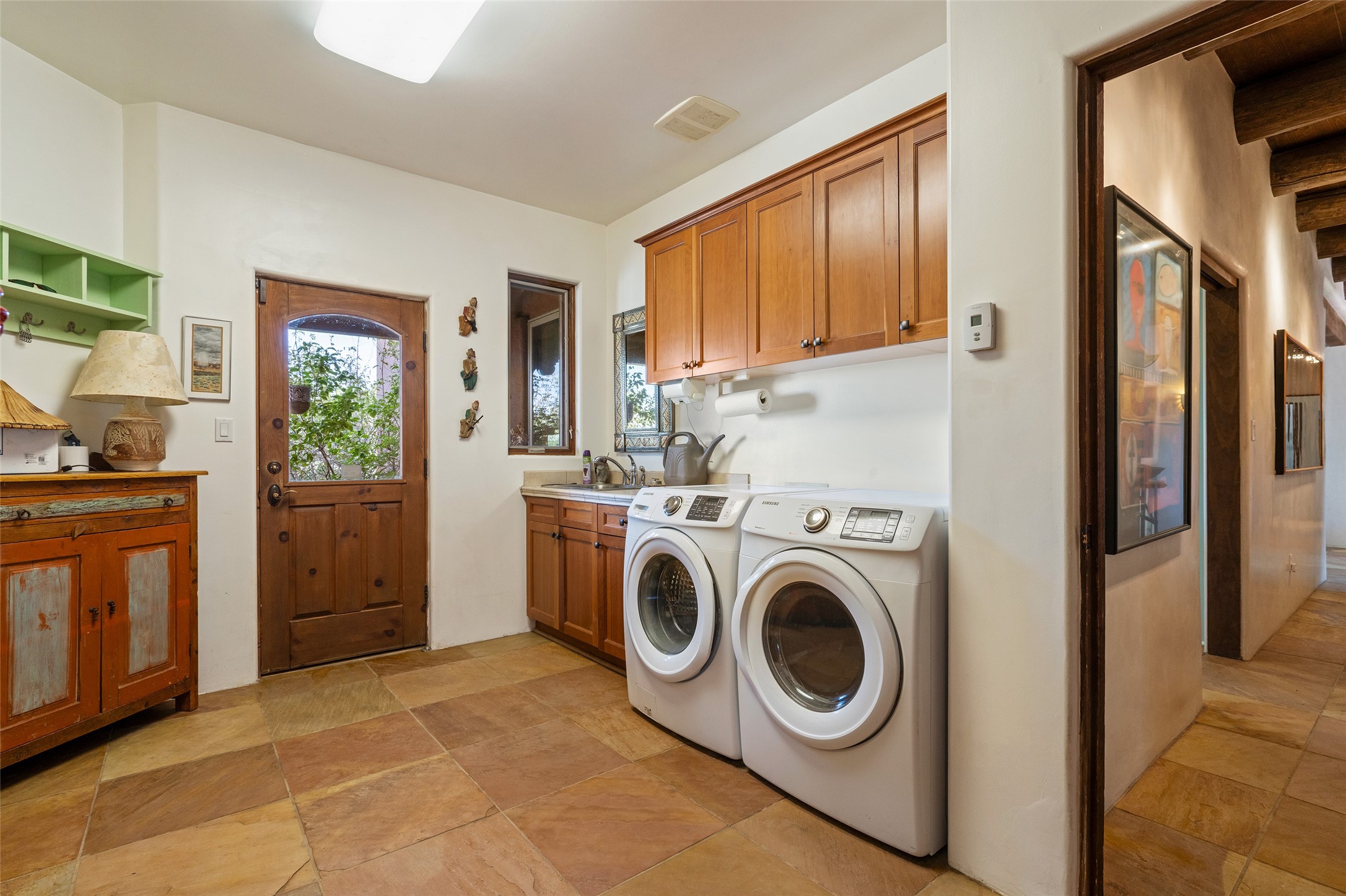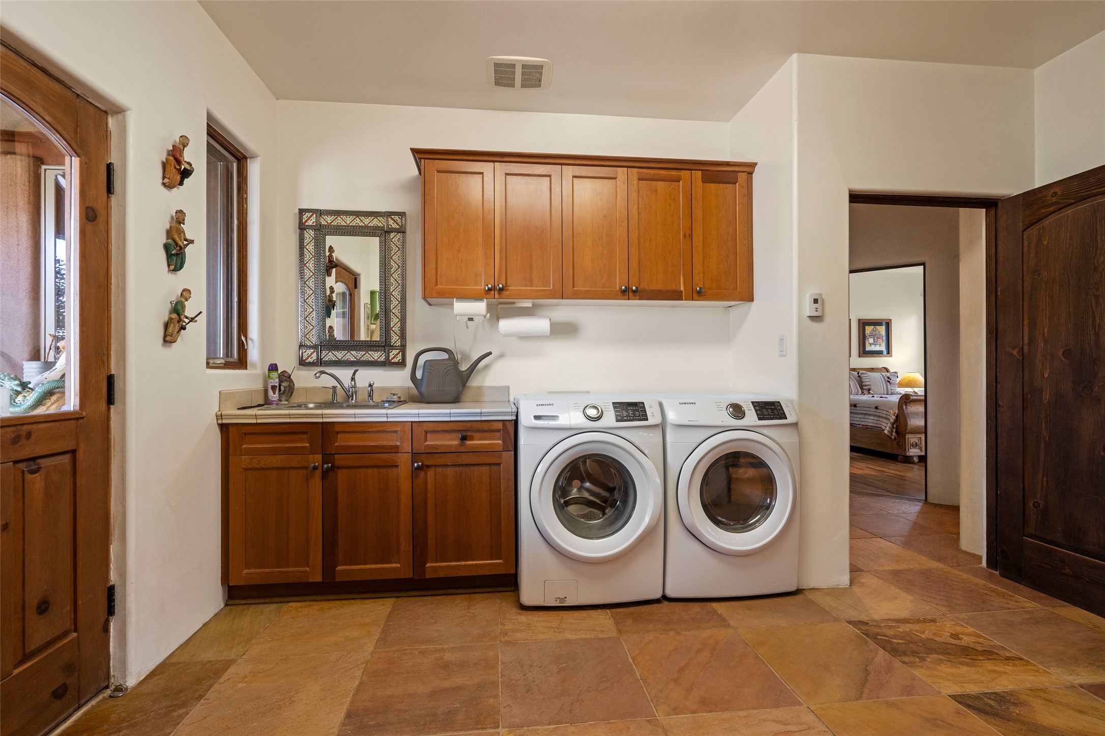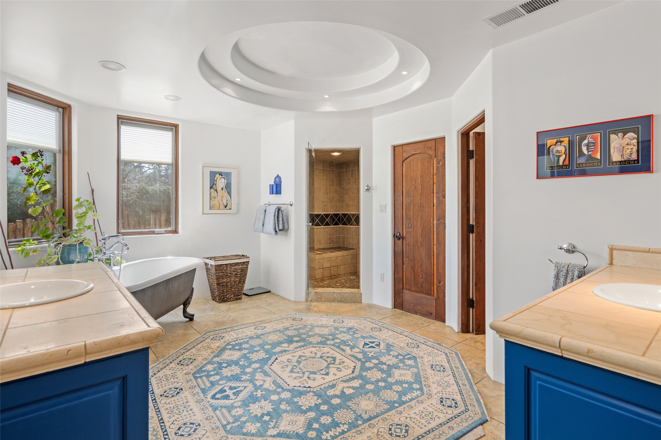 Peaceful Country Living with Room to Roam! If you've been searching for unencumbered horse property, extra elbow room, or simply a serene retreat away from the bustle, this exceptional home delivers. Nestled on 10 fenced acres at the end of a private lane, the elevated setting offers breathtaking eastern views of the Sangre de Cristo Mountains. Enjoy your mornings with sunlit vistas and your evenings under the shaded portal, where sunsets dance across the mountains.A welcoming enclosed courtyard and striking entryway lead inside, where sandstone floors contrast beautifully with vigas and wood-beamed ceilings. Smooth plaster walls add elegance, while thoughtful upgrades throughout the home reflect quality and care. The split three-bedroom floor plan is enhanced by a spacious bonus room with a closet, currently used as an office and game room. The updated kitchen features stainless steel appliances, a convection cooktop, and a cozy dining nook warmed by a kiva fireplace. The owner's suite is a retreat of its own with mountain views, outdoor access, and a luxurious 400+/- square foot bath, boasting a claw-foot soaking tub, steam shower, dual vanities, and a private water closet with bidet. You will also love the spacious laundry room with plenty of storage and utility sink and access to the back yard. Practical amenities include a shared well on the property that supplies both domestic water and drip irrigation, with the option to connect to the community water system if desired. A brand-new TPO roof was installed in 2018. On the acreage, an alternate site with electric and water is ready for a barn, guest house, or studio--making this property as versatile as it is beautiful. Come experience the best of Northern New Mexico living--space, views, and a home filled with timeless Santa Fe character.