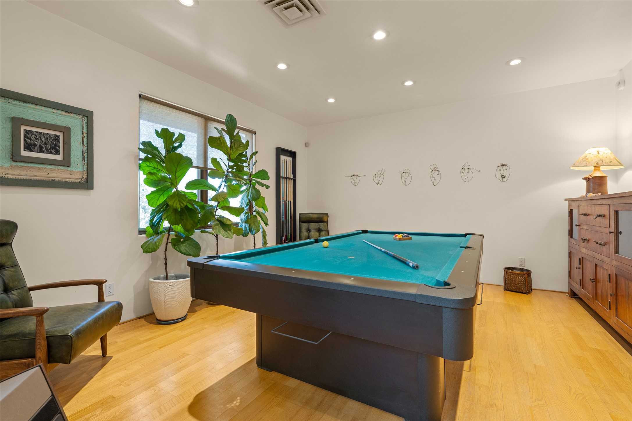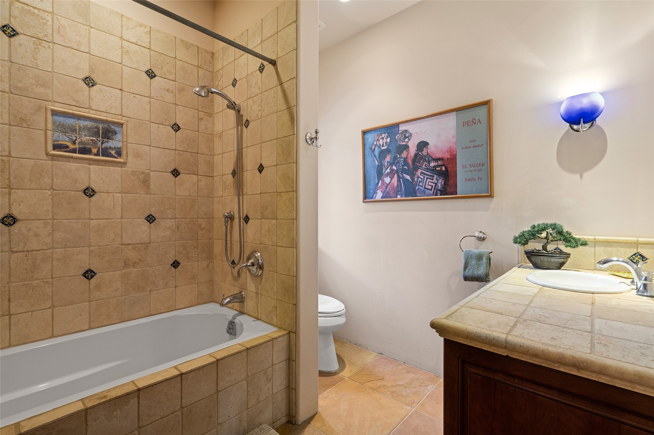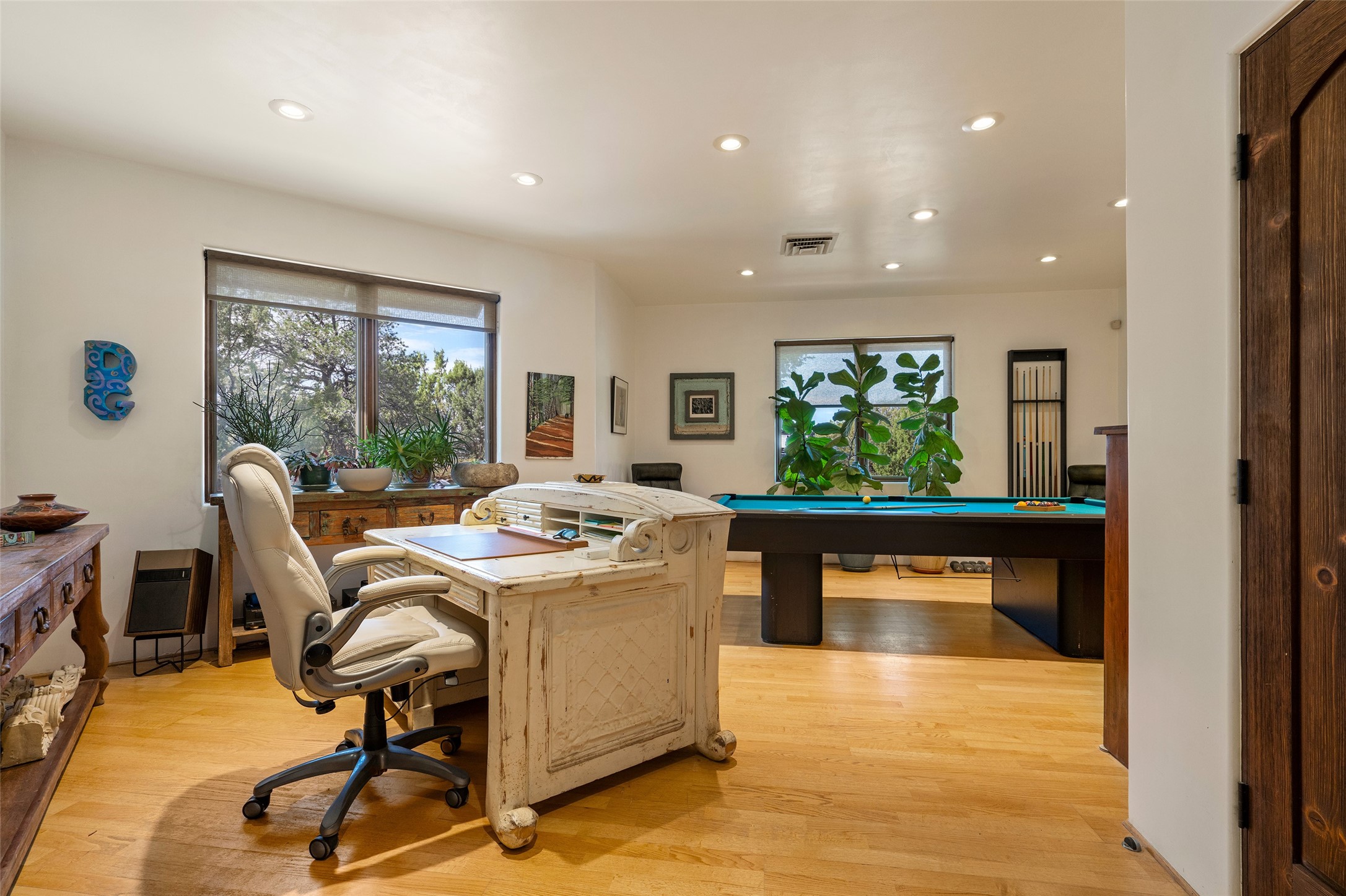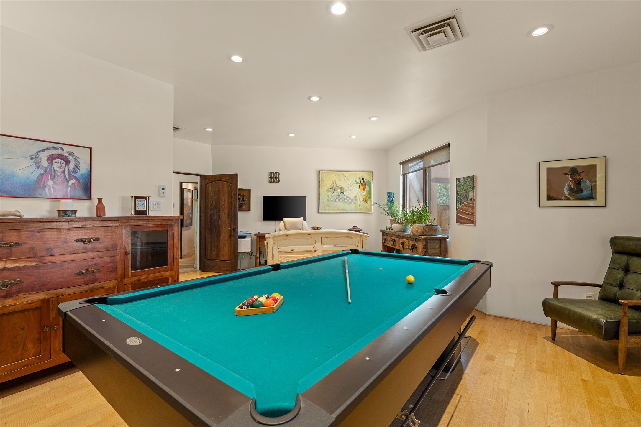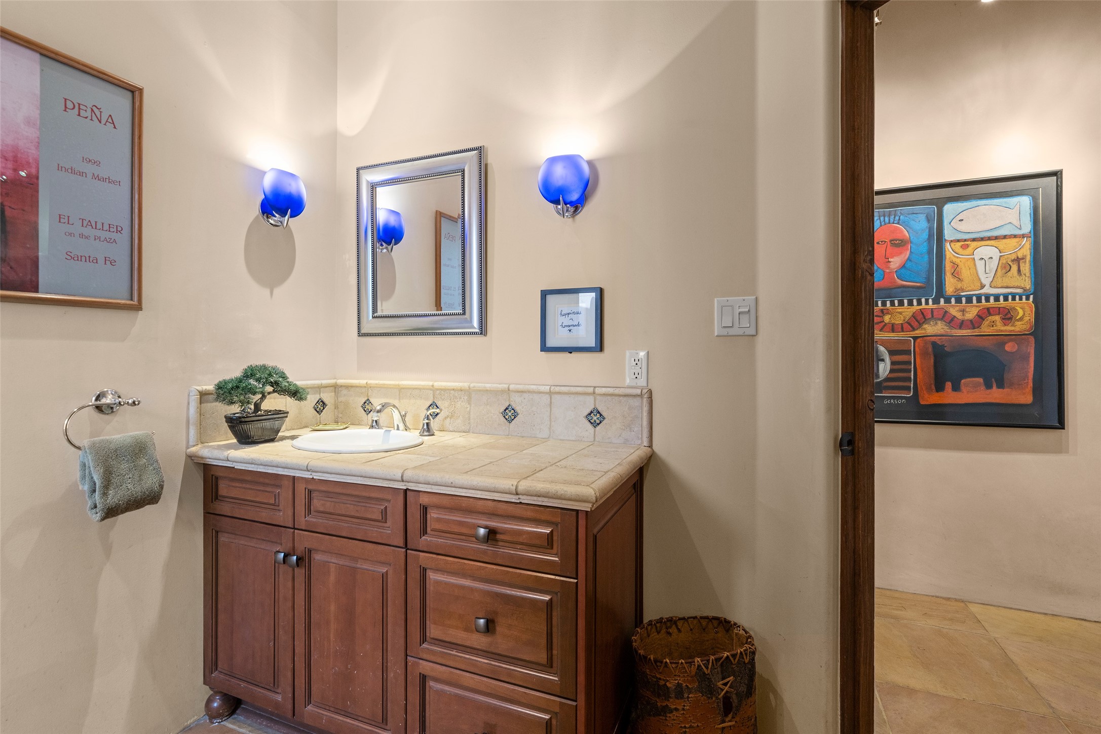 Peaceful Country Living with Room to Roam! If you've been searching for unencumbered horse property, extra elbow room, or simply a serene retreat away from the bustle, this exceptional home delivers. Nestled on 10 fenced acres at the end of a private lane, the elevated setting offers breathtaking eastern views of the Sangre de Cristo Mountains. Enjoy your mornings with sunlit vistas and your evenings under the shaded portal, where sunsets dance across the mountains.A welcoming enclosed courtyard and striking entryway lead inside, where sandstone floors contrast beautifully with vigas and wood-beamed ceilings. Smooth plaster walls add elegance, while thoughtful upgrades throughout the home reflect quality and care. The split three-bedroom floor plan is enhanced by a spacious bonus room with a closet, currently used as an office and game room. The updated kitchen features stainless steel appliances, a convection cooktop, and a cozy dining nook warmed by a kiva fireplace. The owner's suite is a retreat of its own with mountain views, outdoor access, and a luxurious 400+/- square foot bath, boasting a claw-foot soaking tub, steam shower, dual vanities, and a private water closet with bidet. You will also love the spacious laundry room with plenty of storage and utility sink and access to the back yard. Practical amenities include a shared well on the property that supplies both domestic water and drip irrigation, with the option to connect to the community water system if desired. A brand-new TPO roof was installed in 2018. On the acreage, an alternate site with electric and water is ready for a barn, guest house, or studio--making this property as versatile as it is beautiful. Come experience the best of Northern New Mexico living--space, views, and a home filled with timeless Santa Fe character.