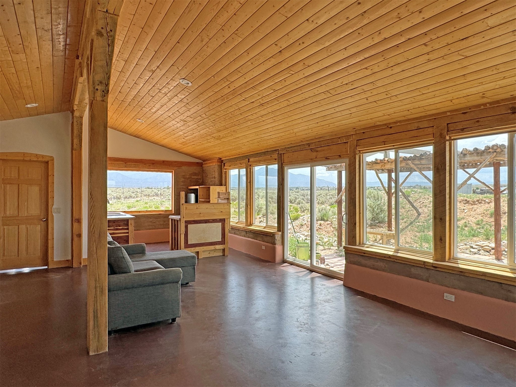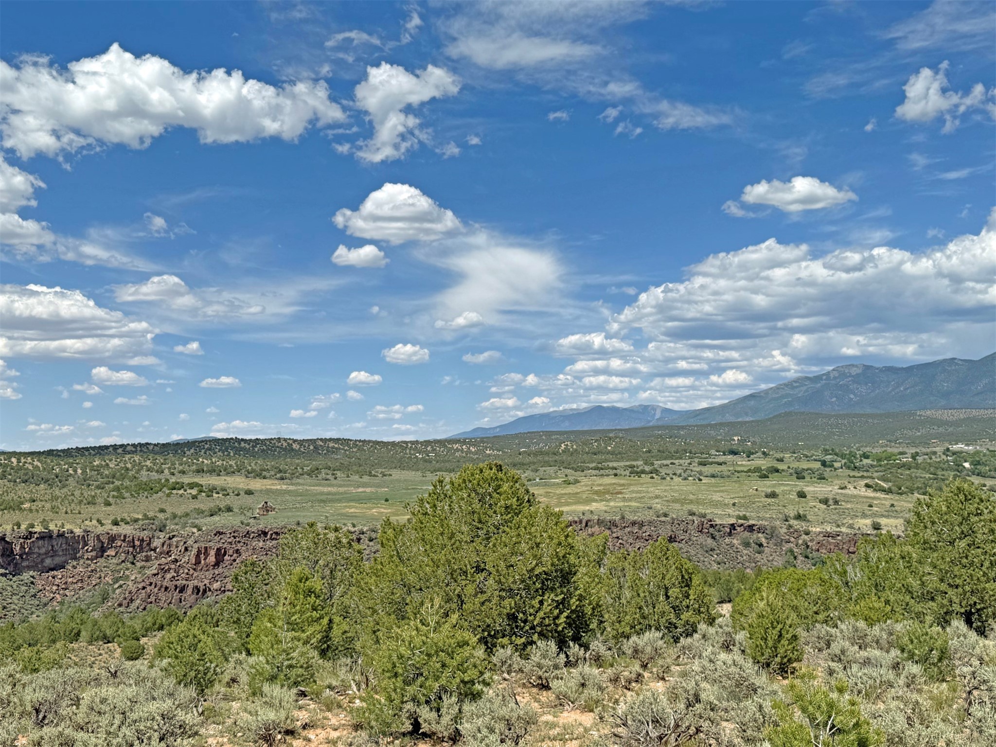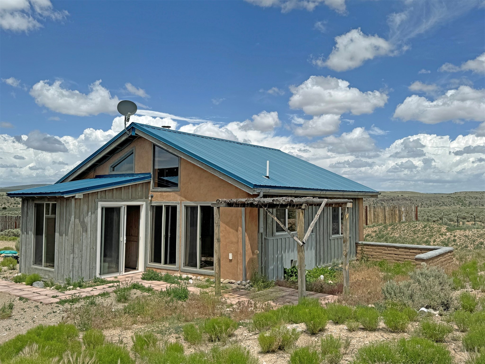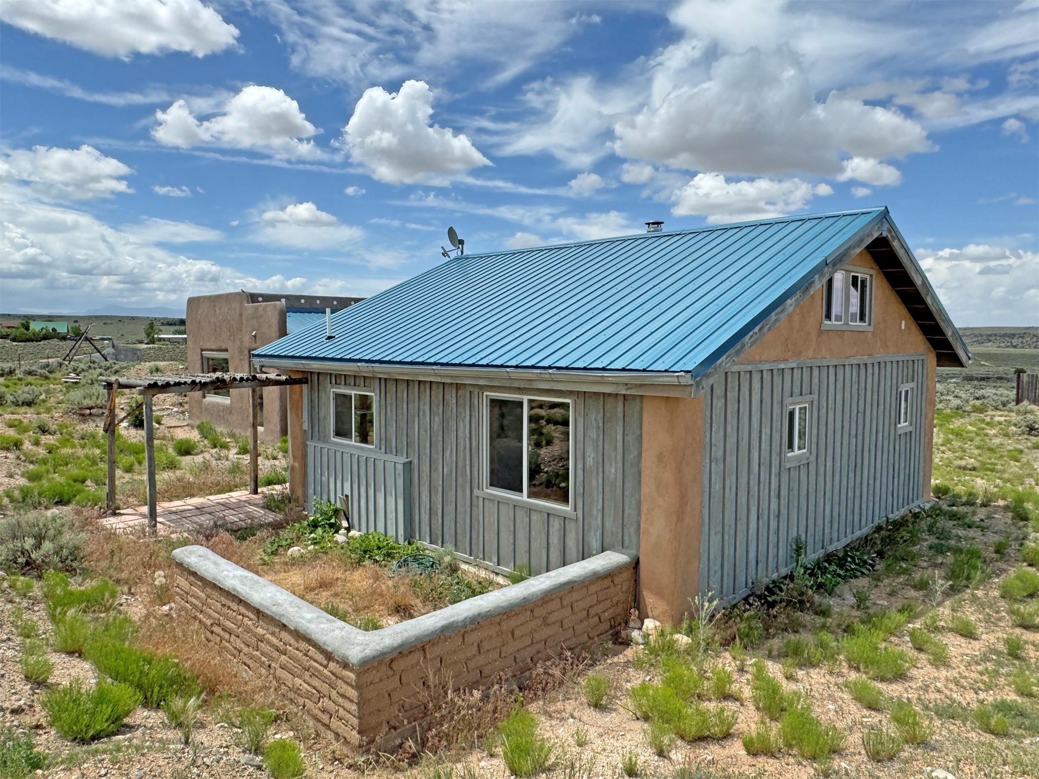 Here's a flexible property featuring two 700 square feet casitas on 2.53 unrestricted acres! Main house constructed in 2017 has entrymud room and open living/dining/kitchen areas with lots of windows framing wrap around views of sunset, Taos Mountain and Sangre deCristo Mountains. Painted concrete floors with in floor radiant heat. Pitched tongue and groove ceiling, ceiling fan and woodstovemaintain comfortable temperatures year round. Easily accessible, finished loft with cabinets provides ample storage. Cook's kitchen hasgranite tile countertops, is wired for under counter lighting, and has a propane gas range and fridge. Comfortable bedroom with T&G andbeams ceiling features a spacious ensuite bathroom with cast iron tub, personal shower and ample linen storage. Mechanical/utility roomincludes a washer which conveys with sale and storage shelving. On the north side is a sweet exposed adobe wall courtyard containinga paver stone patio and latilla ramada, perfect for dining al fresco and star gazing. Pitched Propanel roof delivers water catchment for a1700 gallon buried cistern in lieu of conventional well. Seller typically orders supplemental water 1-2 times a year for a cost ofapproximately $230 each delivery of 1700 gallons. Exterior siding is a combination of stucco and Cape Cod wood siding. Guest houseis 714 square feet of flexible space built in 2023 featuring kitchenette with fridge, full bath, wood stove, exposed adobes, and vaultedT&G ceiling with beams and columns. Comfortable full bathroom with linen storage, tub and shower. This structure is heated and cooledwith a heat pump mini split system. This space could serve as a studio/workshop, studio apartment rental, or additional property livingspace. Painted cement floors and wrap around windows with mountain views. Entertain outside with a latilla ramada over paver stonepatio. Propanel metal shed roof is plumbed for cistern catchment. Landscape berms cradle both structures, adding privacy and providinga canvass for gardeners. Taosnet broadband Internet in both houses (Kit Carson fiber optic in Tune Drive); cell service on site. Locatedon a rise with stellar 360 degree views and easy walk to the Rio Grande Gorge and John Dunn bridge, Mamby/Stagecoach and BlackRock springs. GPS: 36.52508202679919, -05.70209218650817. Approximately one acre around the structures is fully fence with a farmgate at the entrance. Wood board fencing provides additional privacy. Circle drive and ample guest parking. Property could besubdivided into three separate parcels. Electric transformer has been installed in lower part of property for future development. Allconstruction county permitted with C/Os in Associated Documents. Seller has left firewood, Colorado red flagstone, adobe bricks andnew generator in the original box for the buyer. Approximately twenty minutes from Taos Plaza and half an hour from Taos Ski Valley.Only half a mile off the paved road. This quiet, peaceful property could be developed into three residential properties, a family compound, investment rentals, or horse property. So many options for this creative, energy efficient property built with love!