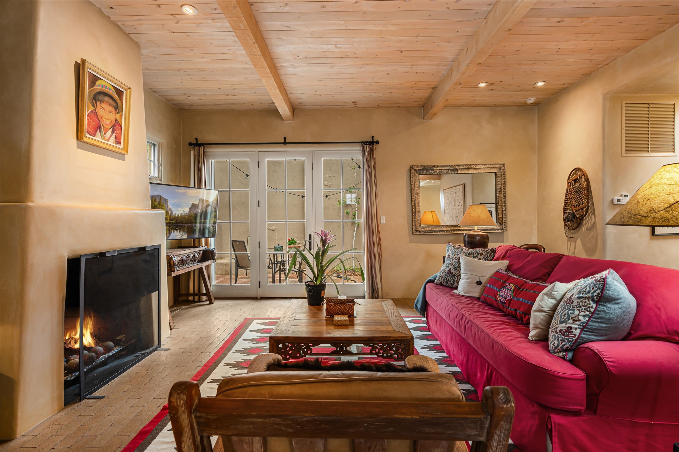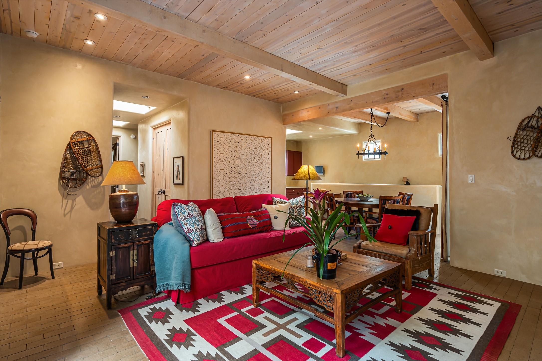 Los Perales is a pear tree covered hillside in the historic district, corner of Palace Avenue and Cerro Gordo with three beautiful units designed and built by internationally renowned architect Michael Mahaffey. Great location, wonderful finishes! This lovely Unit B includes two well separated bedrooms and baths that flank the central living areas with gorgeous hand, troweled plaster walls; lovely pickled high, beamed ceilings; tumbled travertine marble baths; private, lovely, entertaining courtyards outside. The intelligent floor plan is elegant and livable! There is plenty of parking and the property is an easy stroll to the plaza, Canyon Road, the river, and the museum District. Walk home in the moonlight in 3 minutes from The Compound, Geronimo, and El Farol!