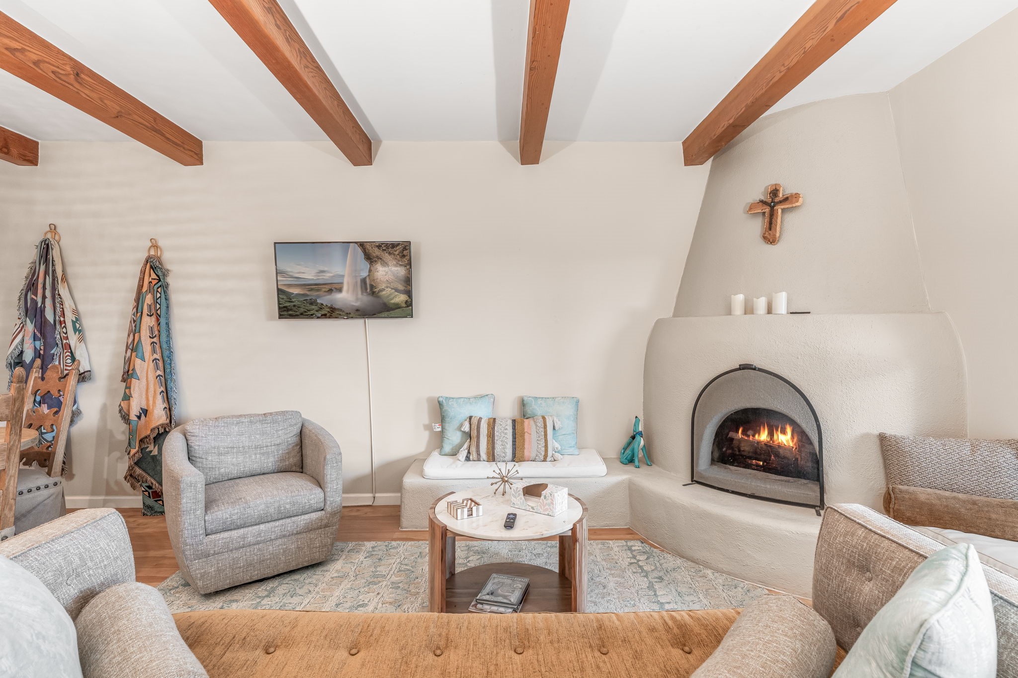 PENDING TAKING BCKUPS!! A cute and well-located Northside condo! This is a remodeled fully-furnished short term rental, with 2 beds and 2 baths. This house is recently updated, with all new HVAC, new kitchen cabinets, countertops, sink and disposal, all new flooring, new bathroom vanities, and more in 2024. Appreciate a magnificent view of the Sangre de Cristo Mountains from a private back patio, and enjoy community amenities including a barbecue grill. A very convenient 2-minute drive to the plaza. This is an easy lock and leave condo or full time residence!