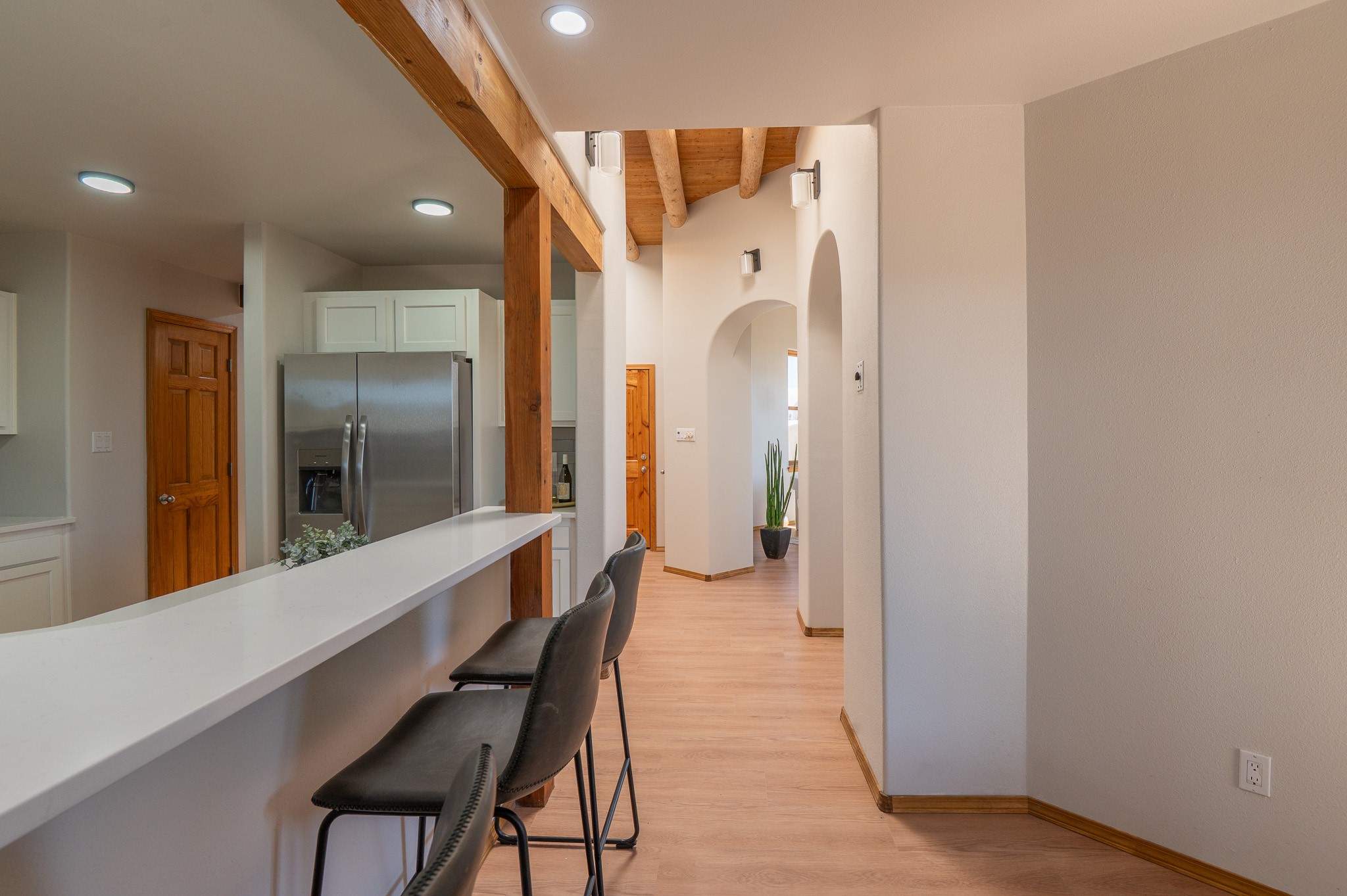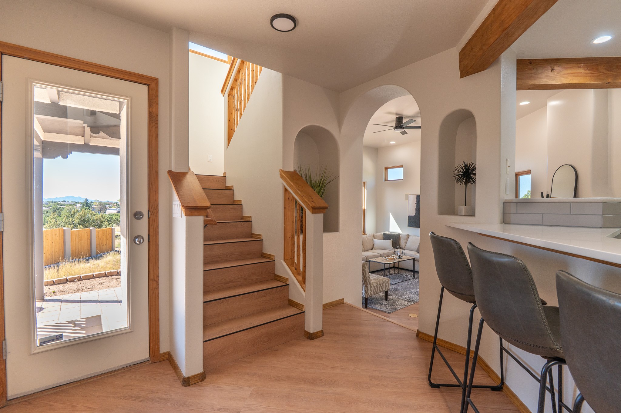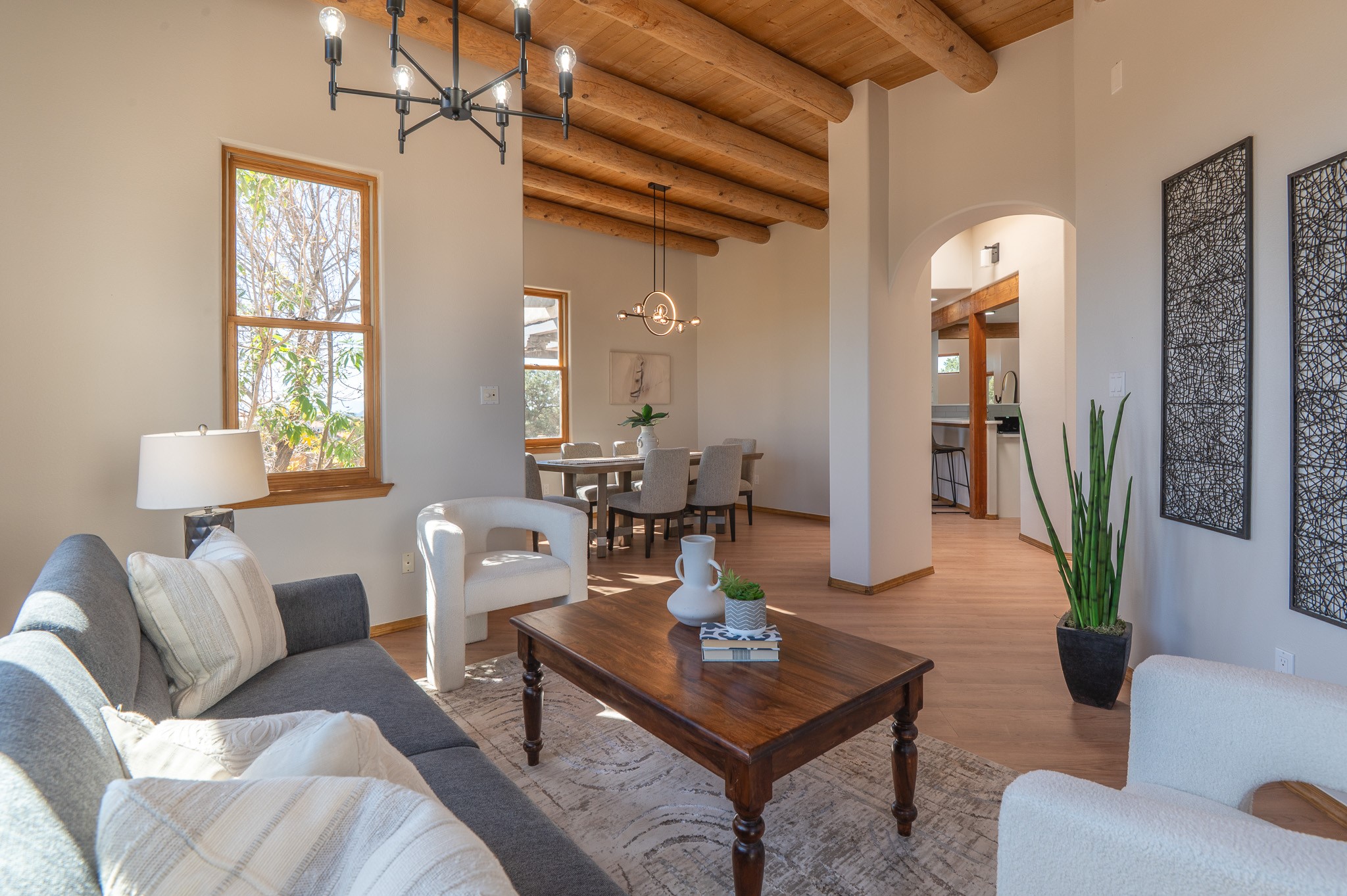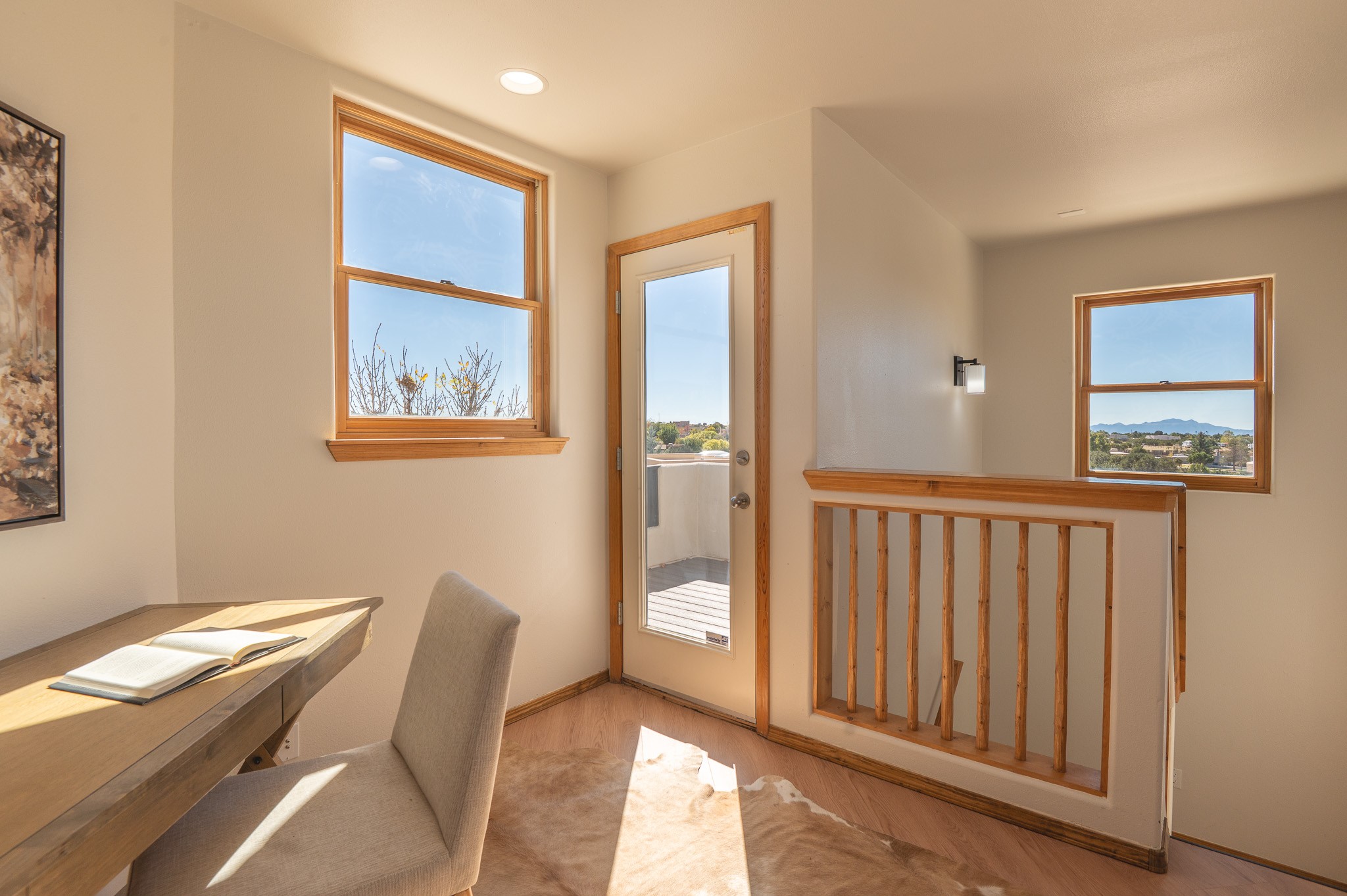 This is the house where you actually live the great Santa Fe life effortlessly. Nestled on a quarter acre of beautiful land, it's been completely updated so you don't spend weekends dealing with a contractor. This generous 2,200 sq ft, adobe-style home just got a serious glow up. We're talking newly installed TPO roof, fresh interior paint, and gorgeous newly installed LVP flooring all done. The place feels legitimately new, running on a newly installed evaporative cooling unit, plus, lovely newly installed light fixtures throughout the entire home. The main level is the ultimate hang out zone, offering three distinct living spaces for any mood. The chef's kitchen (newly installed granite, cabinets, and appliances) anchorsthe flow between the open Living and Dining areas, which feature amazing rounded Vigas and classic ceilings, perfect for hosting. Need a quiet retreat? There's a large great room with soaring ceilings and beautiful fireplace for cozy winter nights. Two flexible bedrooms and a full bath are conveniently located on this main level, along with a huge laundry room with tons of storage and counter space.Upstairs is the Primary Suite, your luxurious private retreat. It features a spacious walk in closet, a newly remodeled and updated spa-worthy en suite bath, and a private deck on this level for morning coffee under the New Mexico sky.The outside is a peaceful haven. Your backyard is perfect for relaxing, under the covered patio.An oversized two-car garage with workspace ensures this home combines classic Santa Fe style with zero compromises on convenience. All the big, annoying projects are done.Come see the home that lets you stop working on your house, and start living in it.