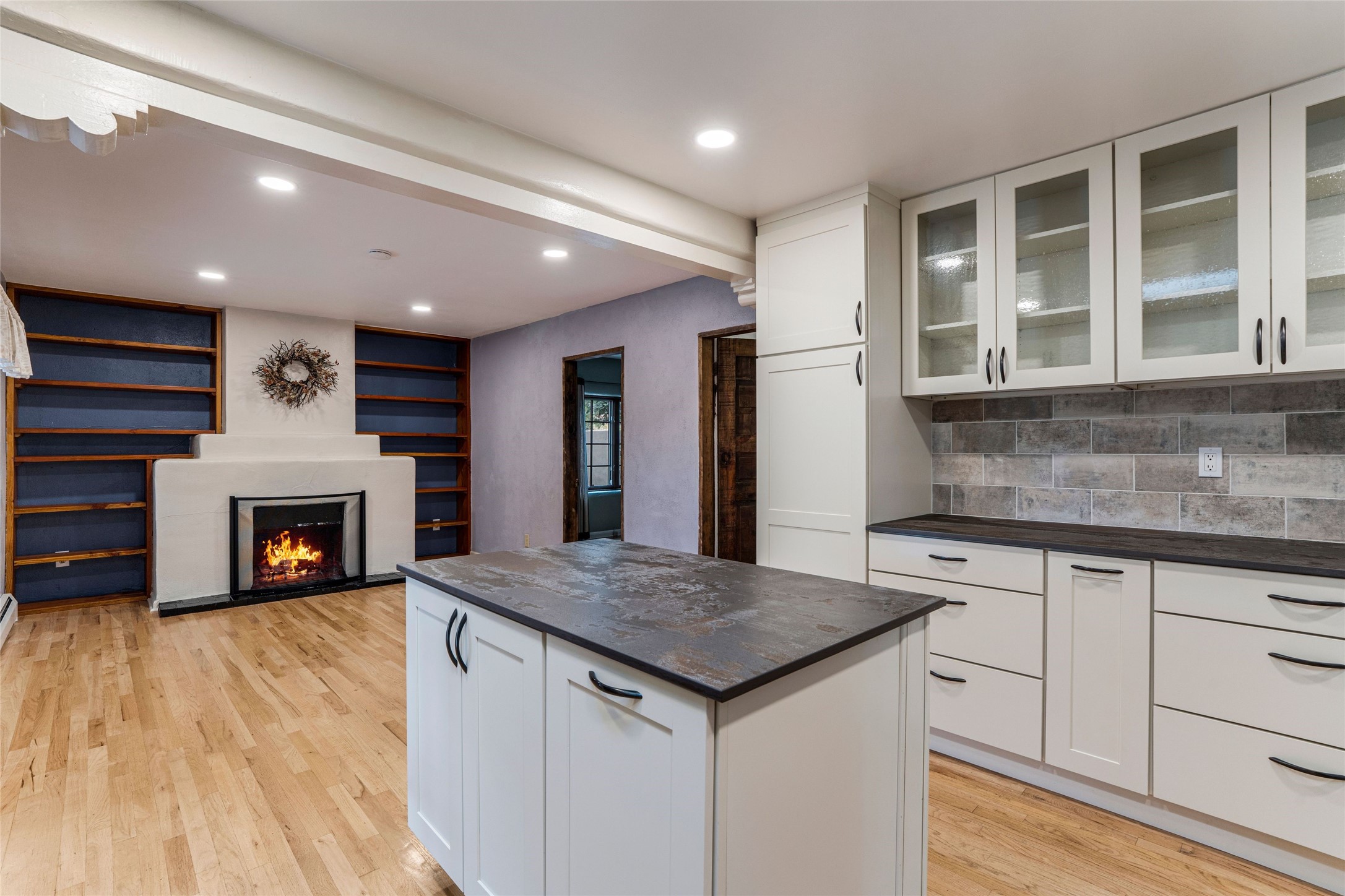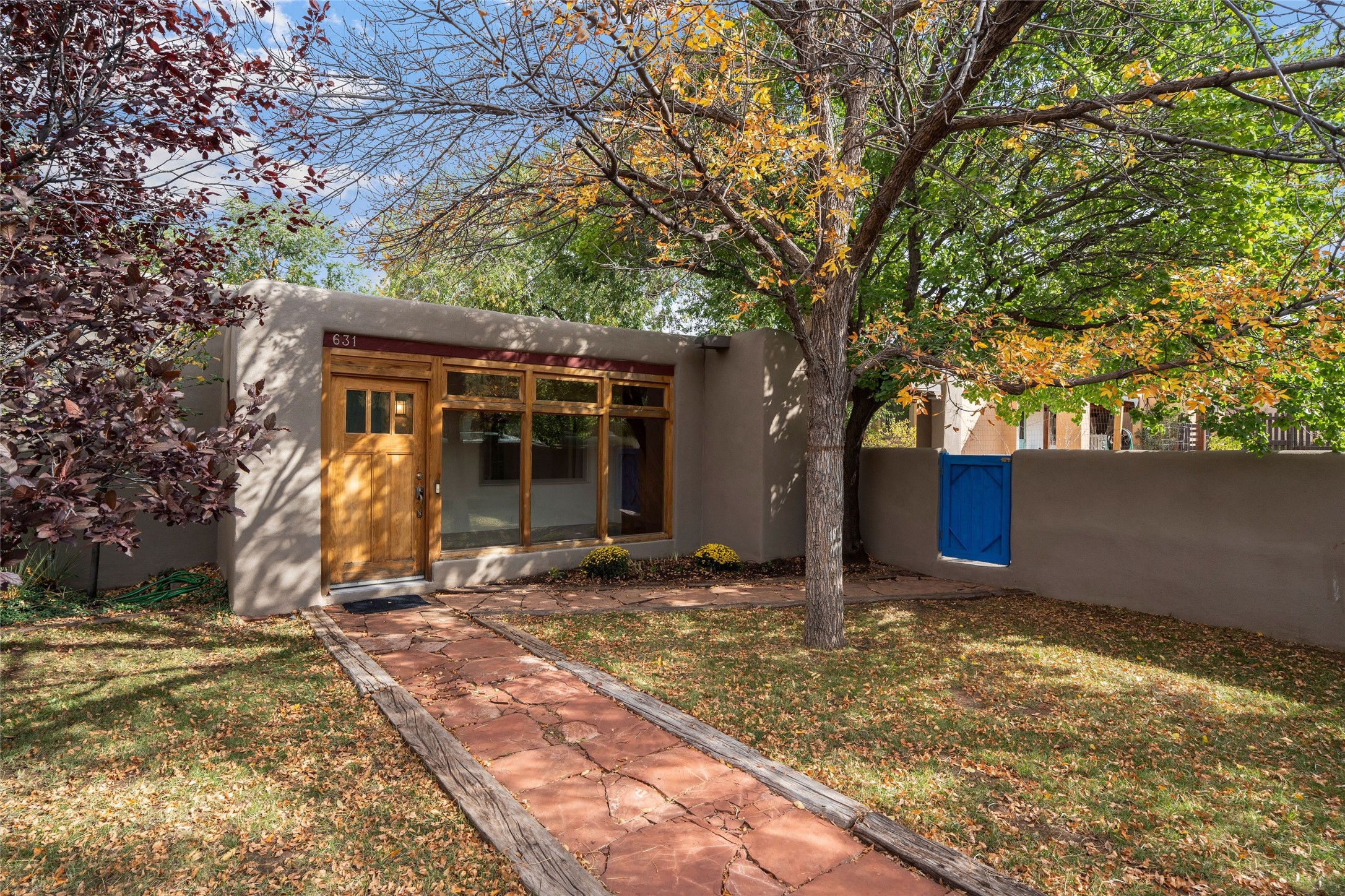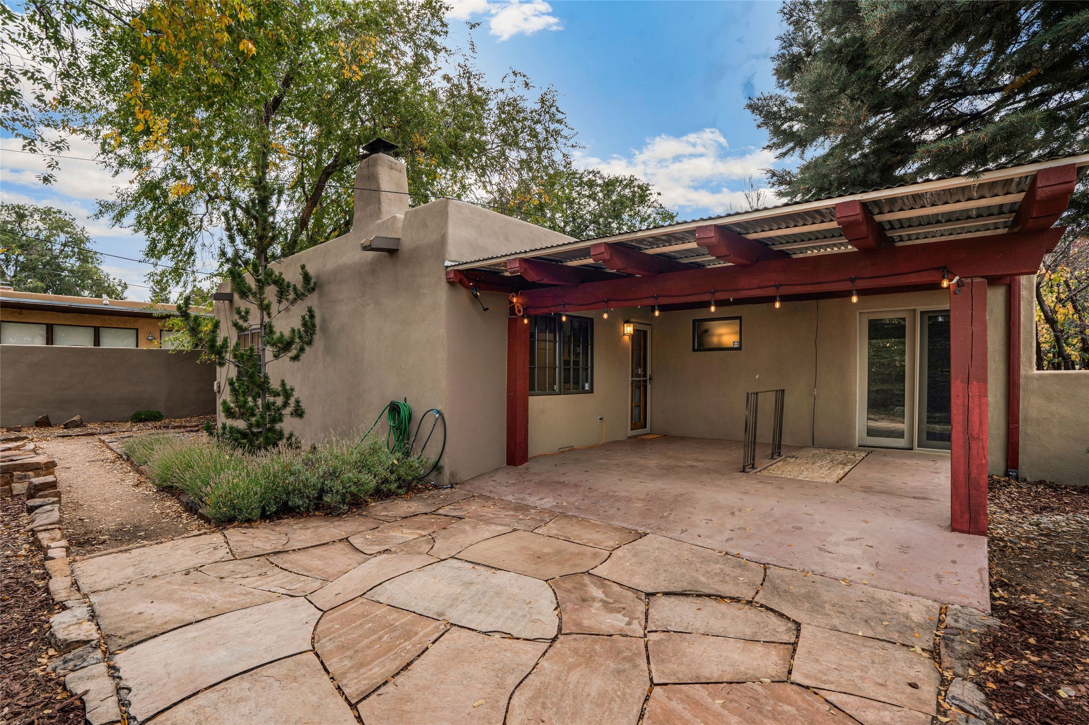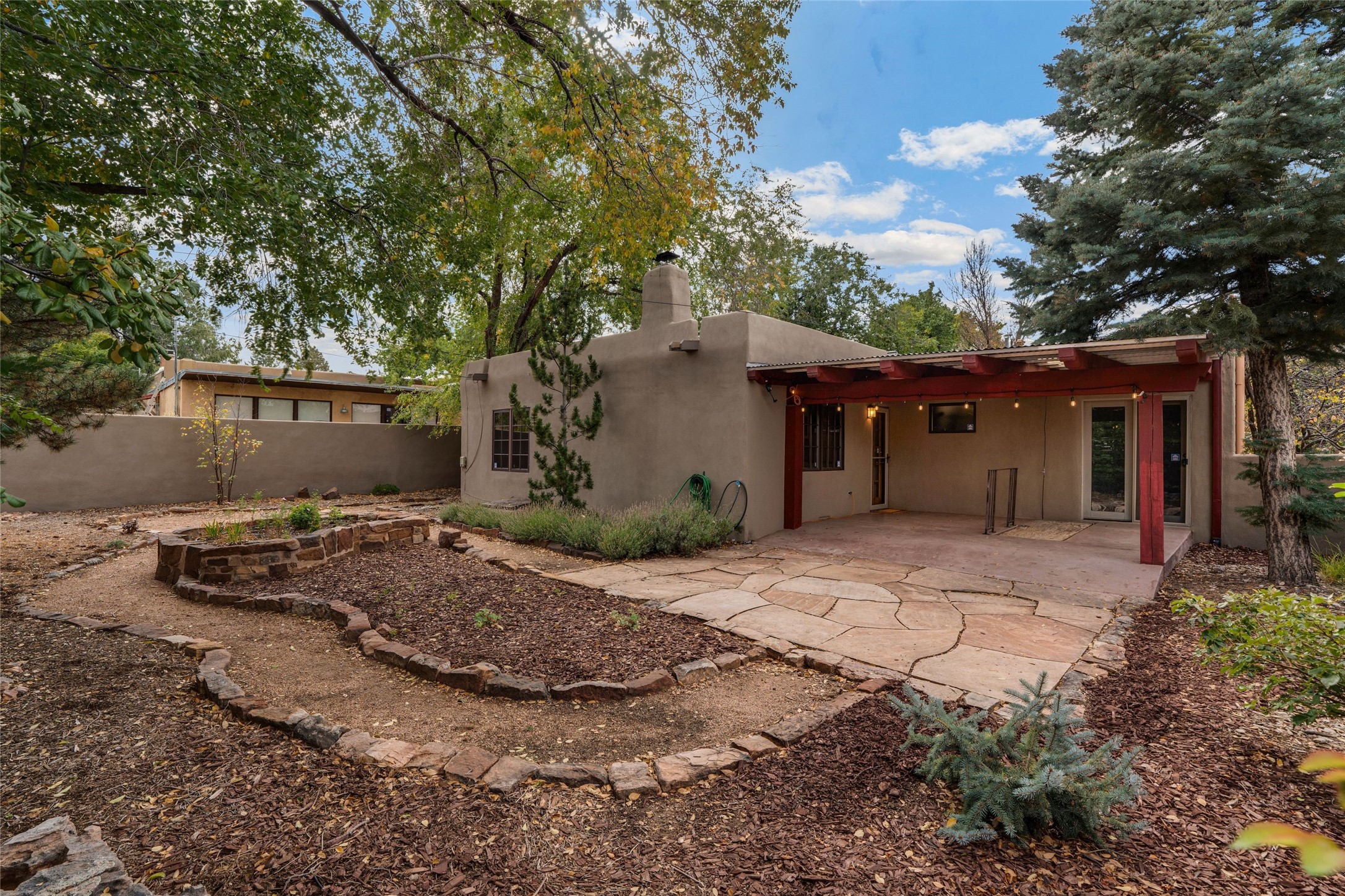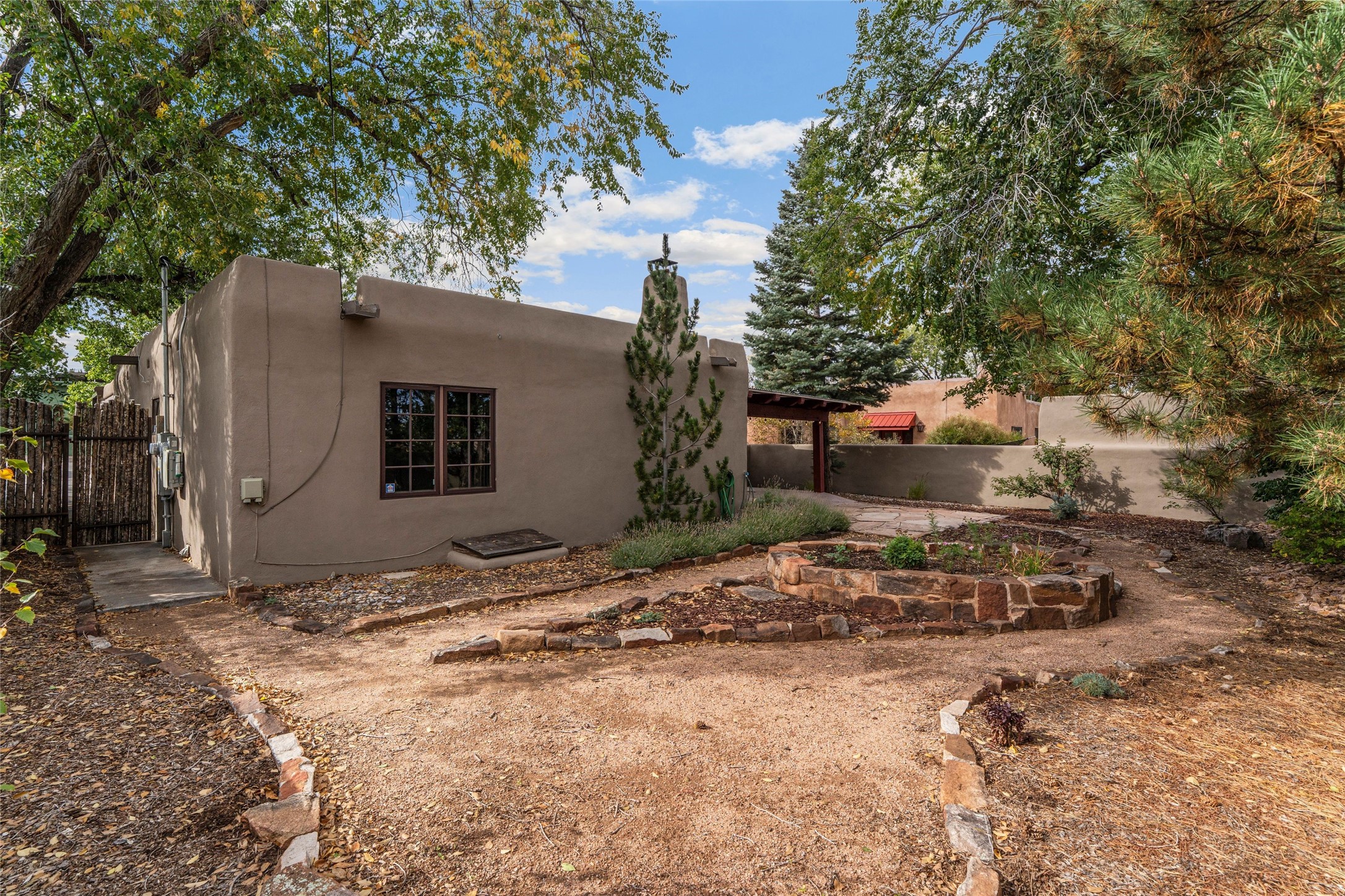 South Capital Gem with Modern Upgrades and Timeless Charm. This beautifully maintained single-level home blends classic Santa Fe character with thoughtful modern updates. The brand-new modern kitchen features sleek finishes and opens seamlessly to a spacious dining area with a classic wood-burning fireplace, creating a warm and inviting atmosphere for gatherings. Natural light fills the home through the charming wood sunroom, leading into a generous living area perfect for relaxing or entertaining. The primary suite offers a private retreat with an additional flex room ideal for an office or reading nook, along with a stylish bath featuring a stone countertop. A comfortable guest bedroom and library or media room share a beautifully updated three-quarter bath. Outside, enjoy the shady front lawn, covered porch, and private backyard surrounded by mature fruit trees and lush vegetation, offering both privacy and a tranquil garden setting. Solar panels provide energy efficiency and long-term savings. Located in one of Santa Fe's most desirable neighborhoods, this home offers peace and quiet while being just minutes from the Plaza, restaurants, and galleries. Classic style meets modern living in this South Capital treasure.