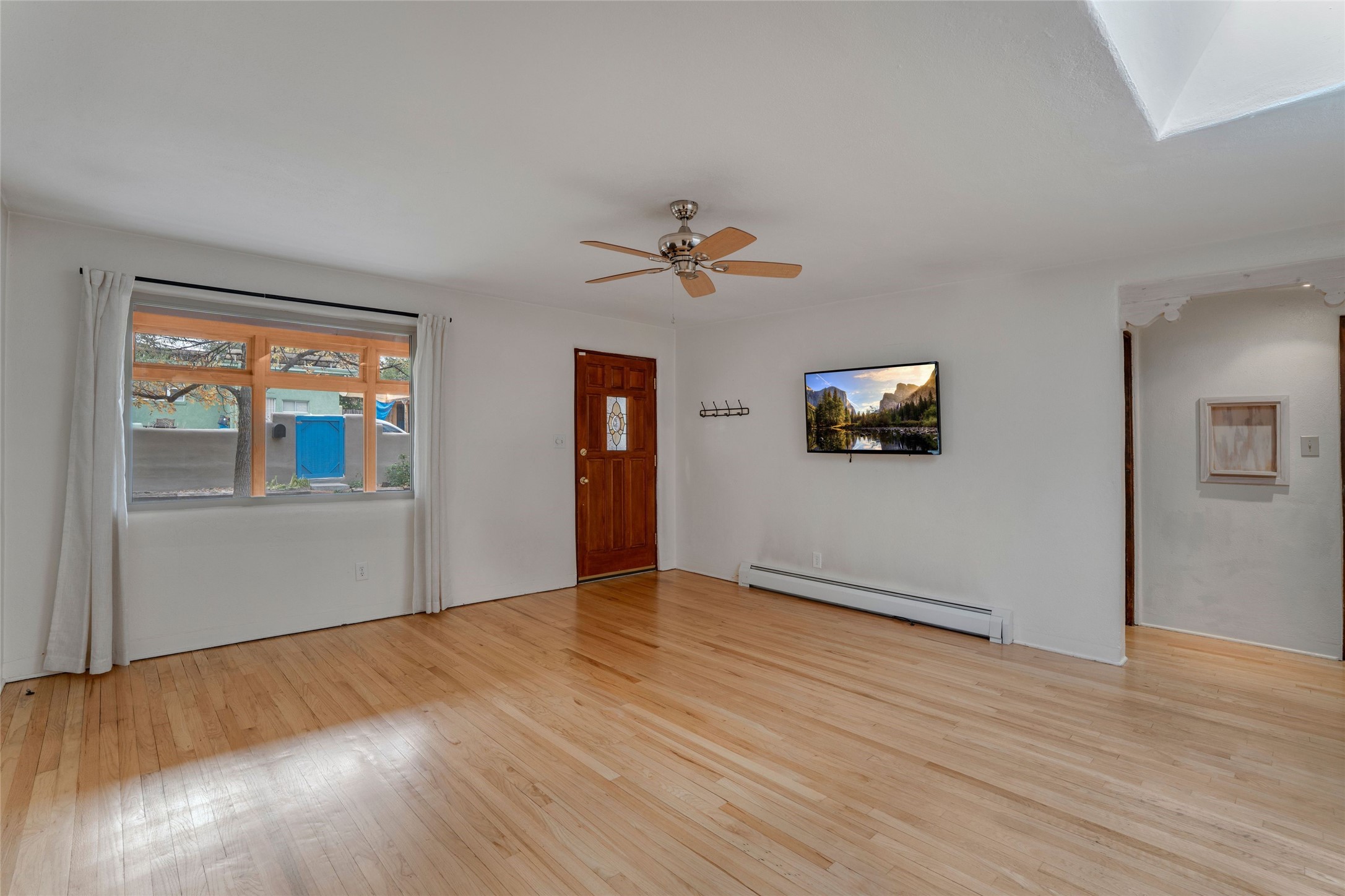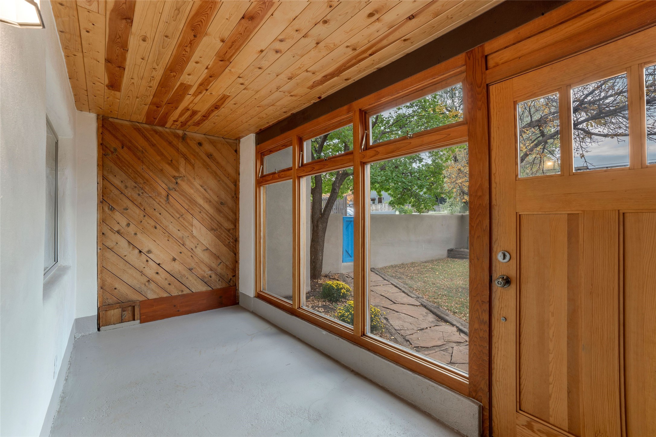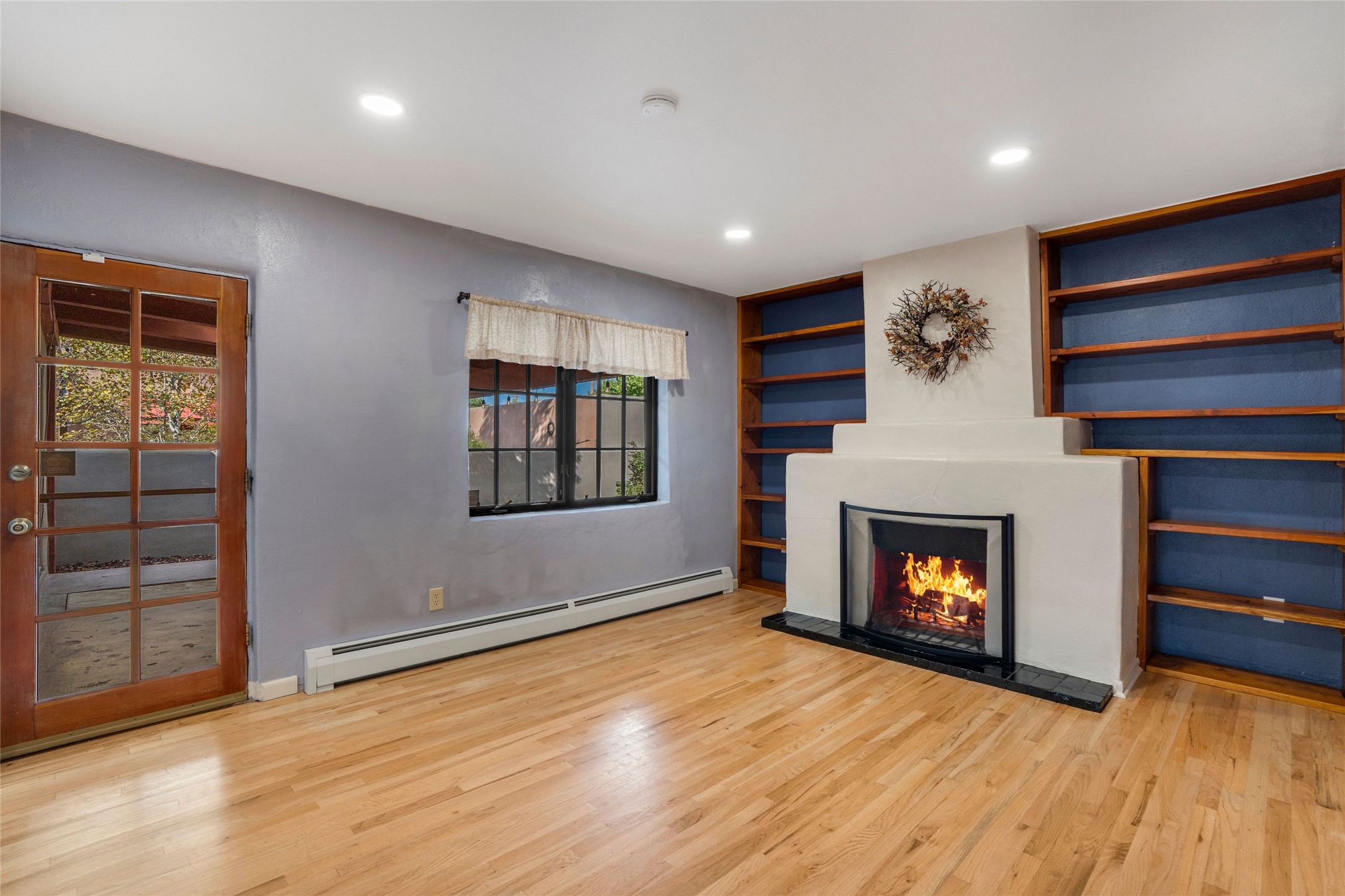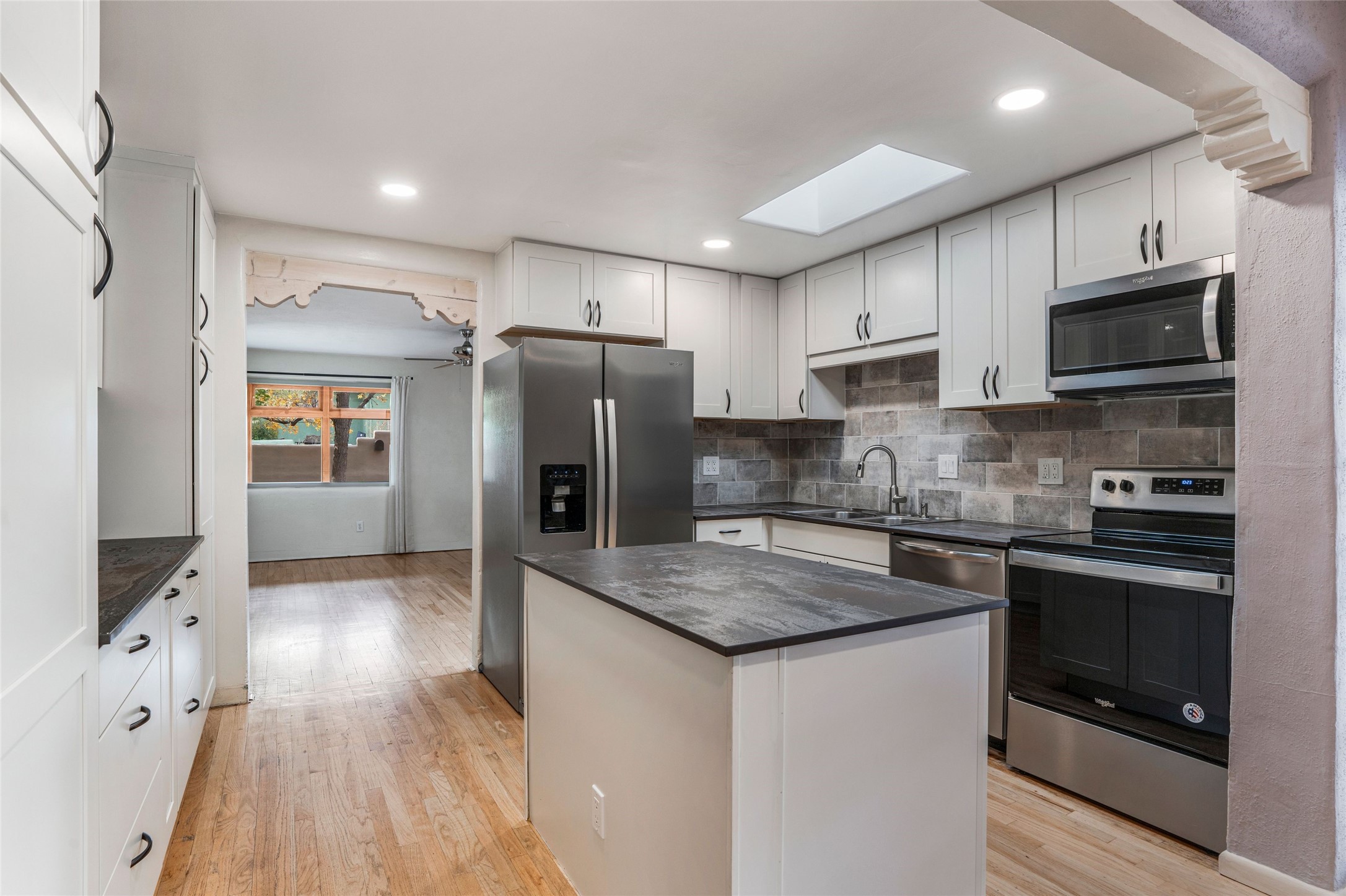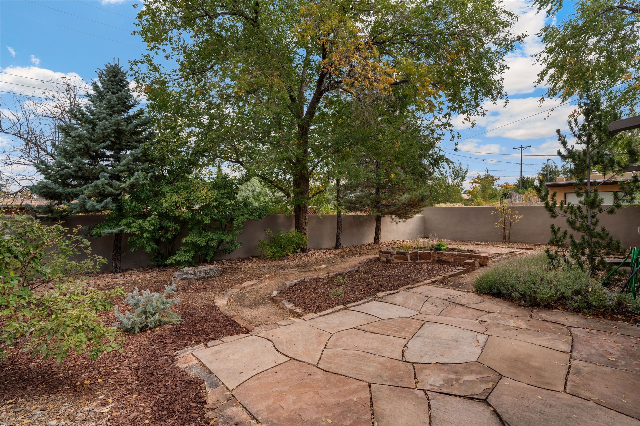 South Capital Gem with Modern Upgrades and Timeless Charm. This beautifully maintained single-level home blends classic Santa Fe character with thoughtful modern updates. The brand-new modern kitchen features sleek finishes and opens seamlessly to a spacious dining area with a classic wood-burning fireplace, creating a warm and inviting atmosphere for gatherings. Natural light fills the home through the charming wood sunroom, leading into a generous living area perfect for relaxing or entertaining. The primary suite offers a private retreat with an additional flex room ideal for an office or reading nook, along with a stylish bath featuring a stone countertop. A comfortable guest bedroom and library or media room share a beautifully updated three-quarter bath. Outside, enjoy the shady front lawn, covered porch, and private backyard surrounded by mature fruit trees and lush vegetation, offering both privacy and a tranquil garden setting. Solar panels provide energy efficiency and long-term savings. Located in one of Santa Fe's most desirable neighborhoods, this home offers peace and quiet while being just minutes from the Plaza, restaurants, and galleries. Classic style meets modern living in this South Capital treasure.