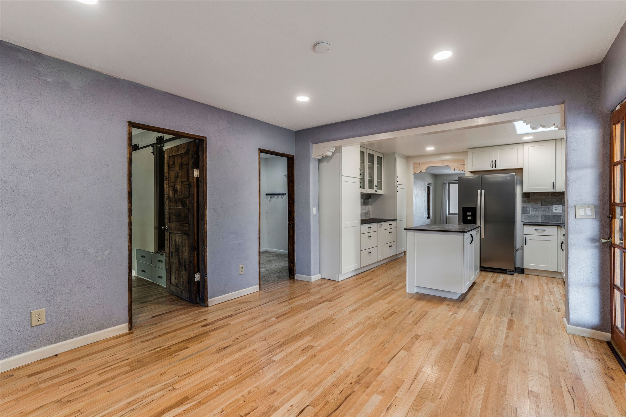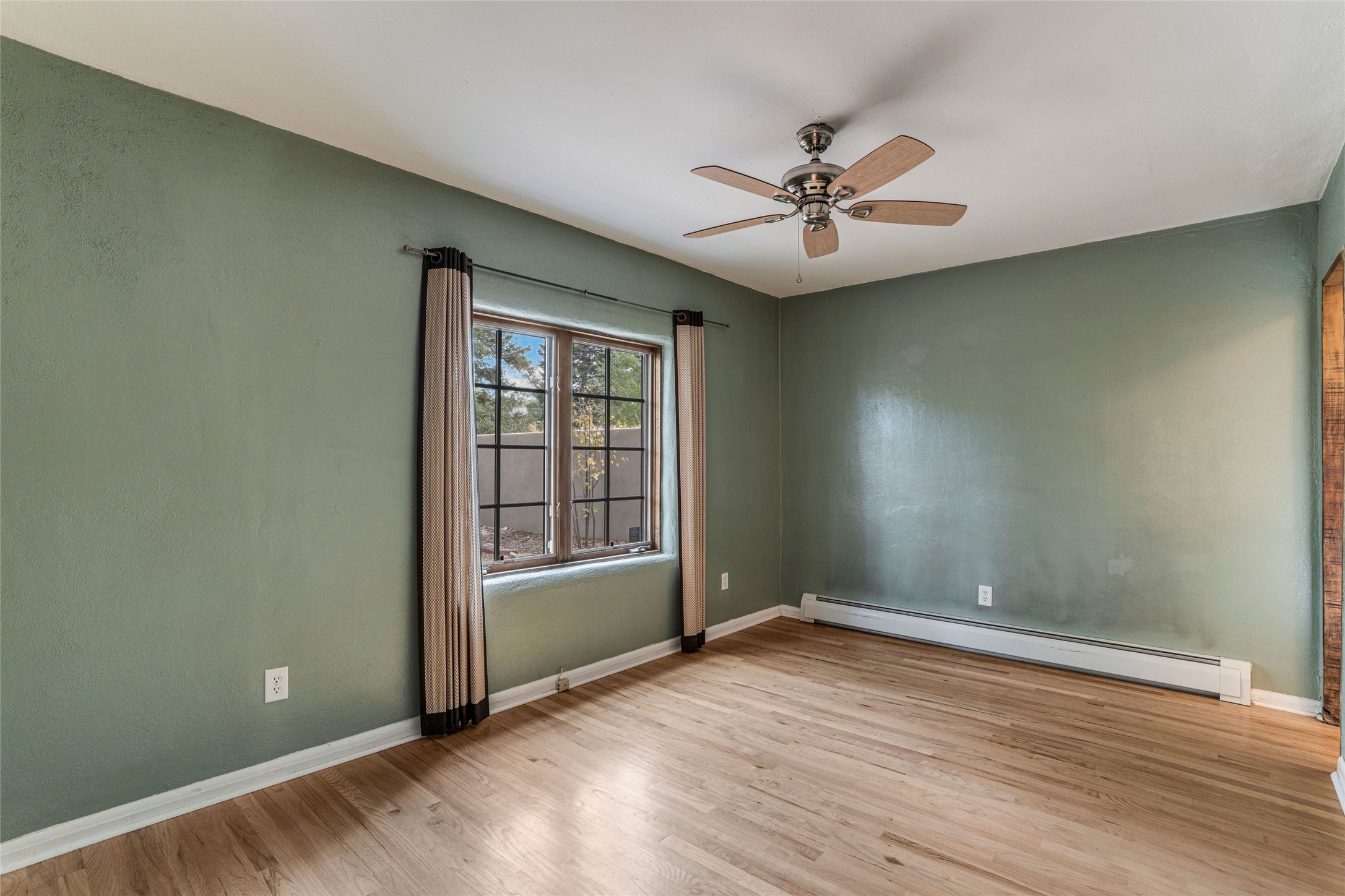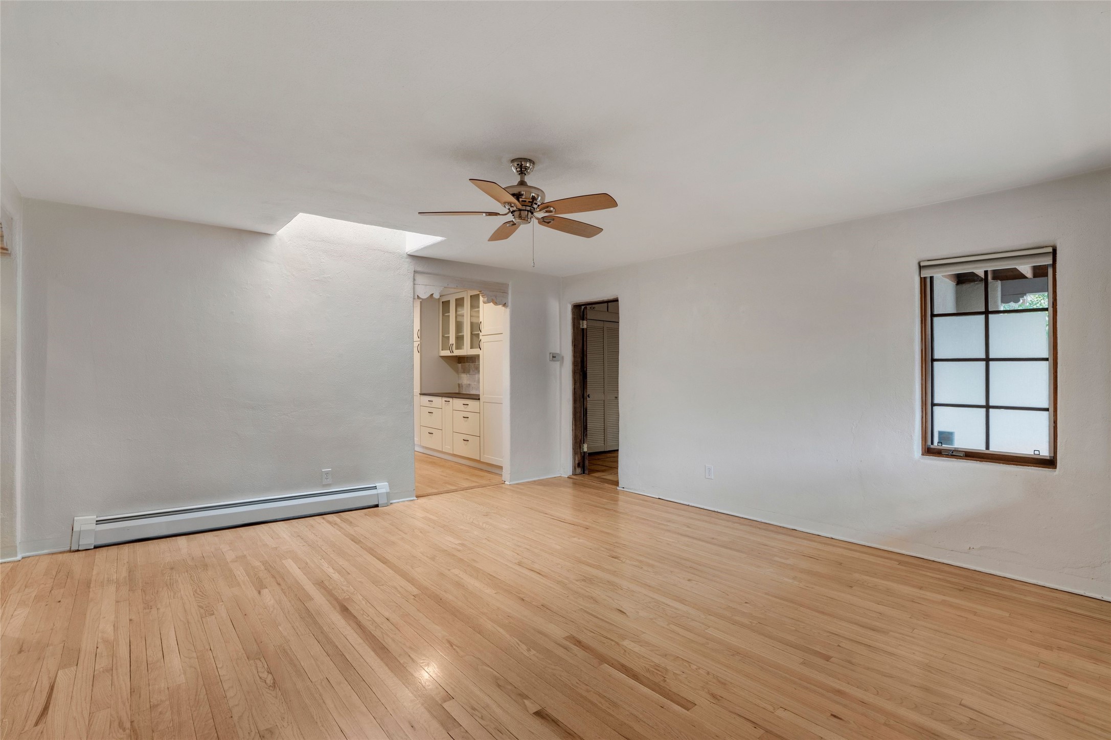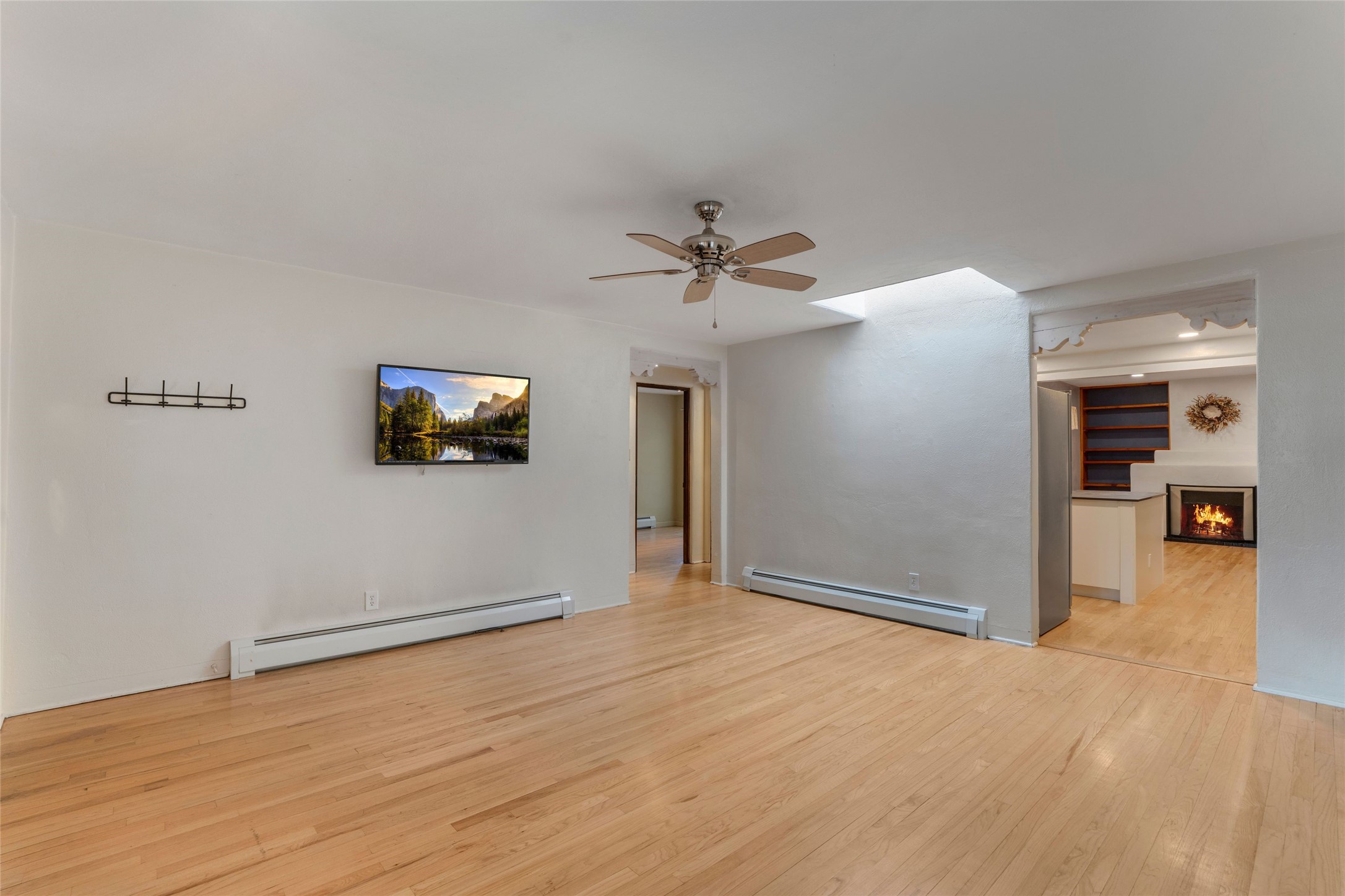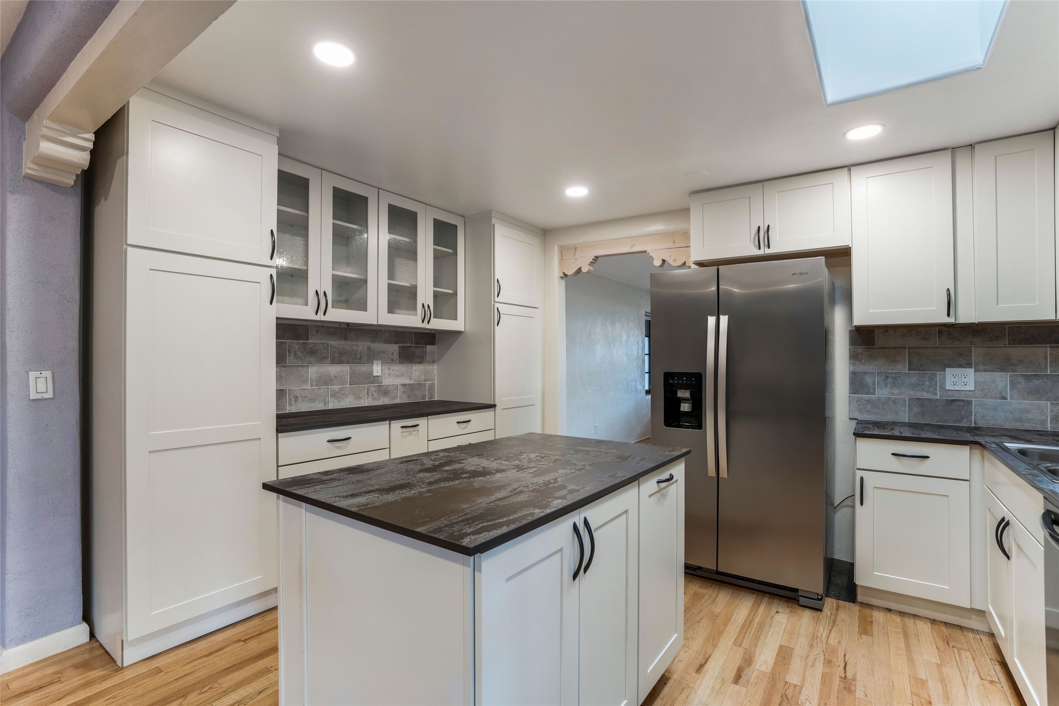 South Capital Gem with Modern Upgrades and Timeless Charm. This beautifully maintained single-level home blends classic Santa Fe character with thoughtful modern updates. The brand-new modern kitchen features sleek finishes and opens seamlessly to a spacious dining area with a classic wood-burning fireplace, creating a warm and inviting atmosphere for gatherings. Natural light fills the home through the charming wood sunroom, leading into a generous living area perfect for relaxing or entertaining. The primary suite offers a private retreat with an additional flex room ideal for an office or reading nook, along with a stylish bath featuring a stone countertop. A comfortable guest bedroom and library or media room share a beautifully updated three-quarter bath. Outside, enjoy the shady front lawn, covered porch, and private backyard surrounded by mature fruit trees and lush vegetation, offering both privacy and a tranquil garden setting. Solar panels provide energy efficiency and long-term savings. Located in one of Santa Fe's most desirable neighborhoods, this home offers peace and quiet while being just minutes from the Plaza, restaurants, and galleries. Classic style meets modern living in this South Capital treasure.