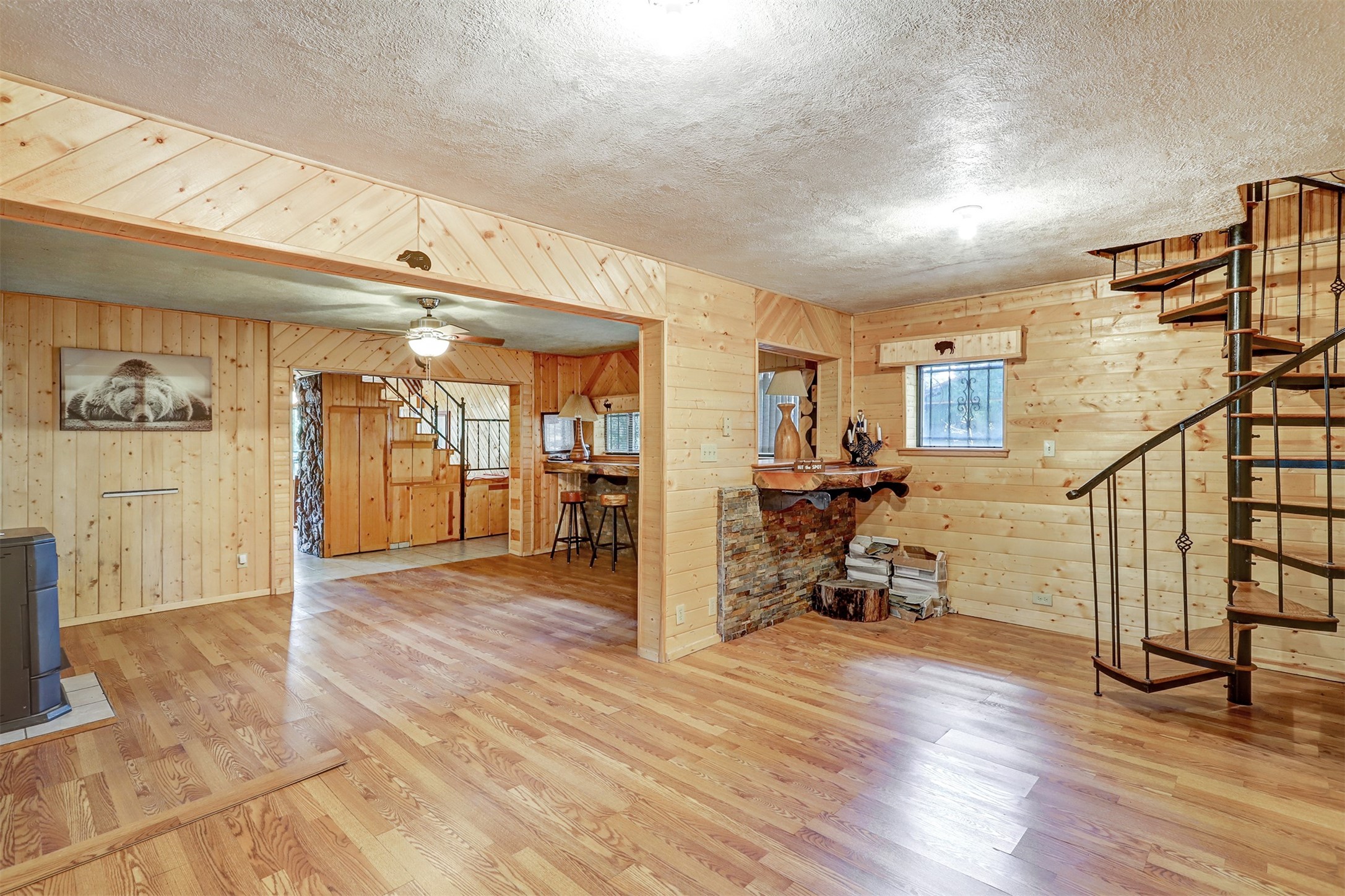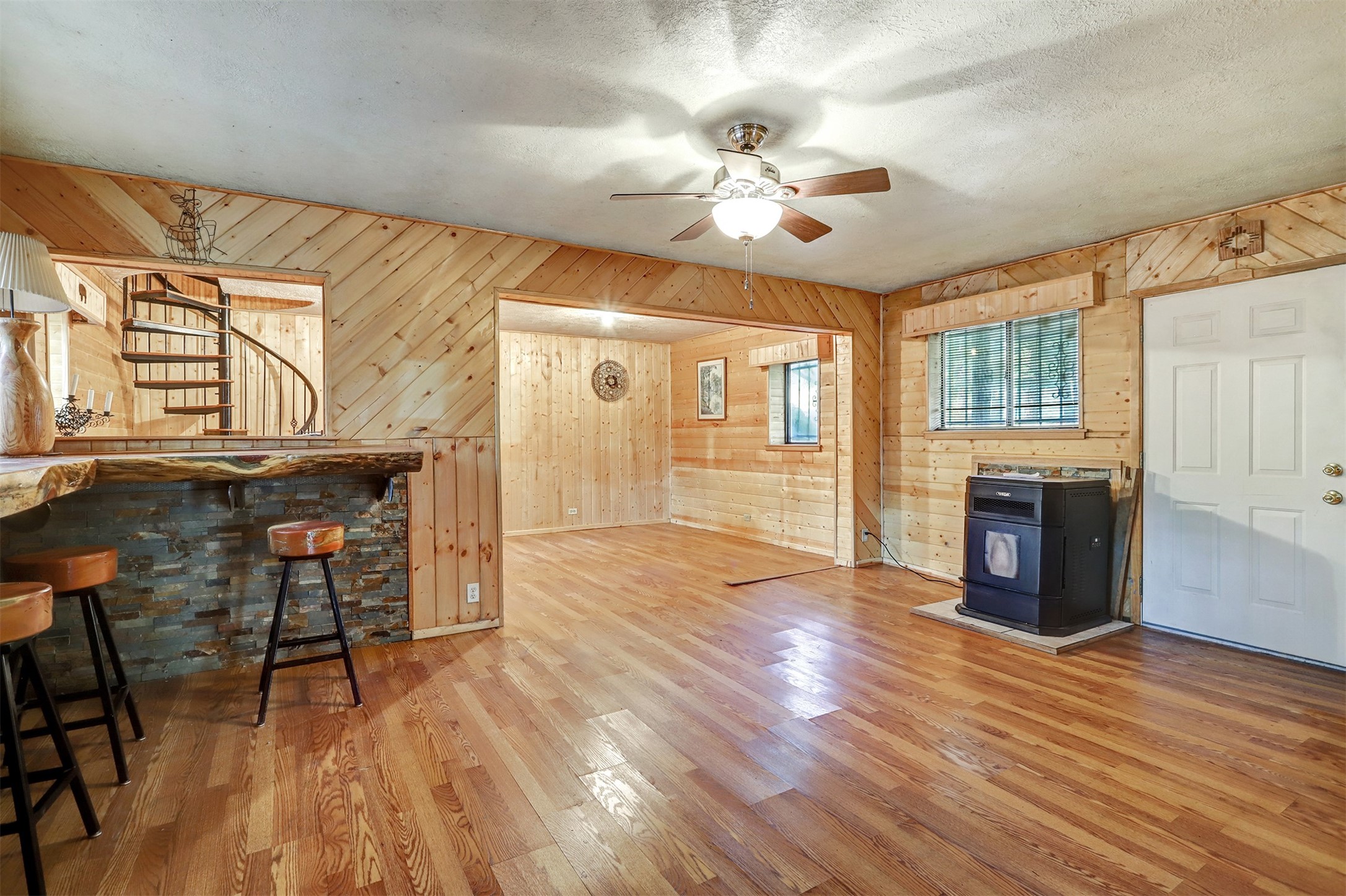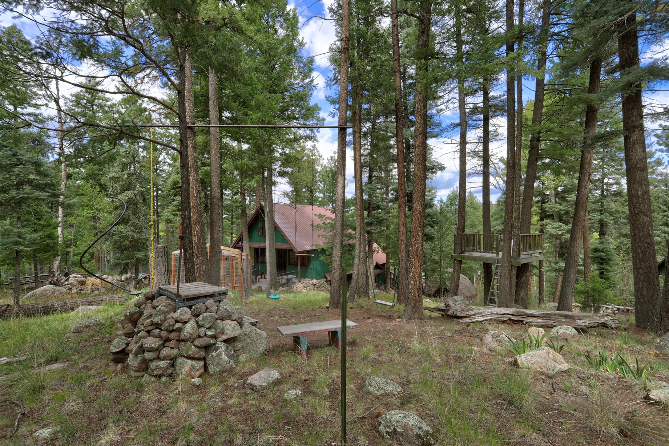 This 1750 SF mountain home is like no other! Located in Thompson Ridge Estates and has three levels, plus a one car garage/storage area underneath. The main floor features a spacious kitchen/dining area leading into the family/living room. Most of the residence is finished in tongue and groove floor to ceiling and gives it that warm mountain feel. Electric baseboard plus a wood stove and two pellet stoves keep everything toasty in the winter. Take the steps or spiral staircase up to the master suite and sleeping area. Walk in closet, full bath and laundry have access from the master and open sleeping area. Walk out to the back deck and upper lot area. From the second floor, head up the ship stairs upper loft and train room. Come to the mountains and enjoy all the Jemez has to offer!