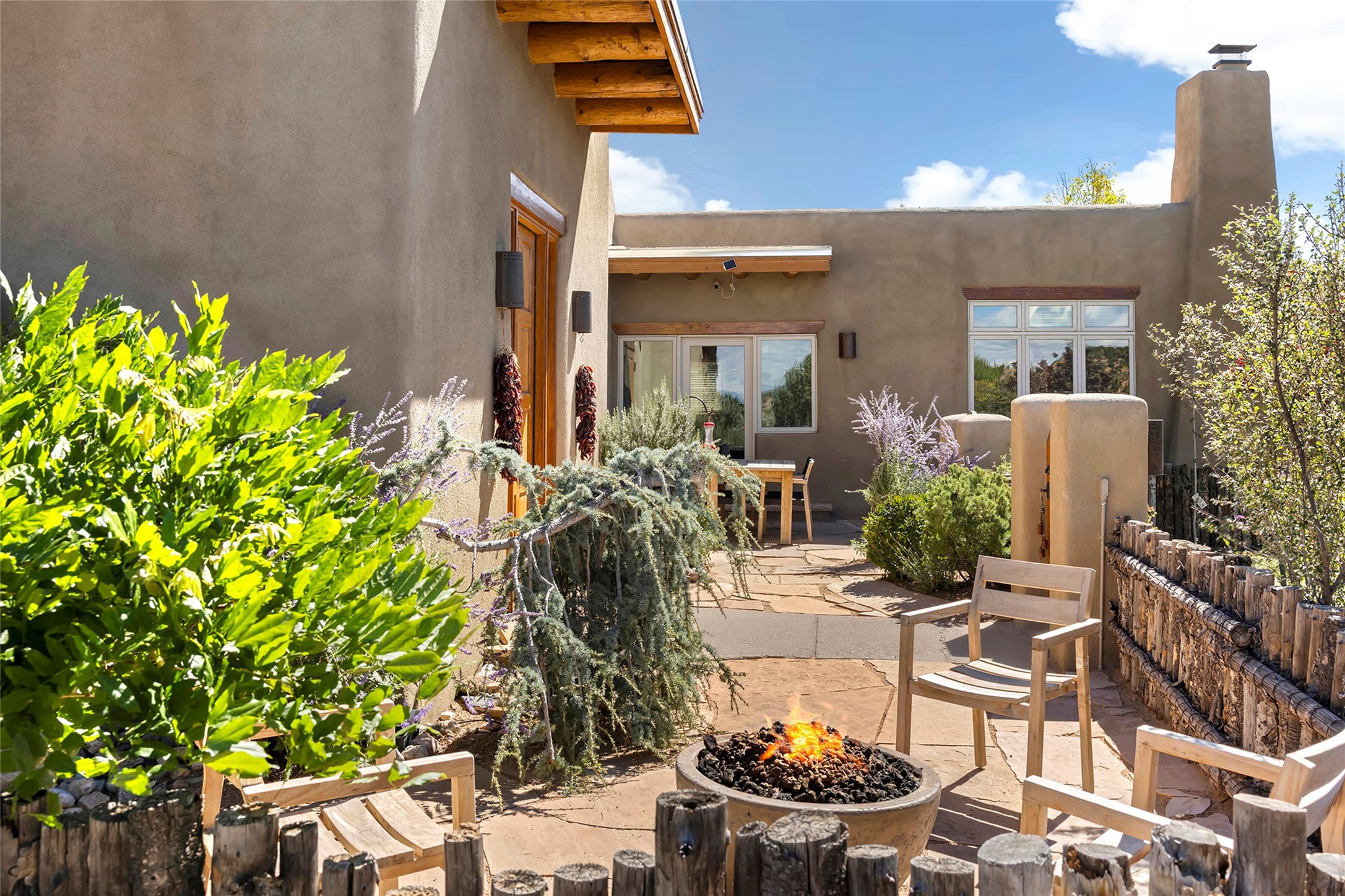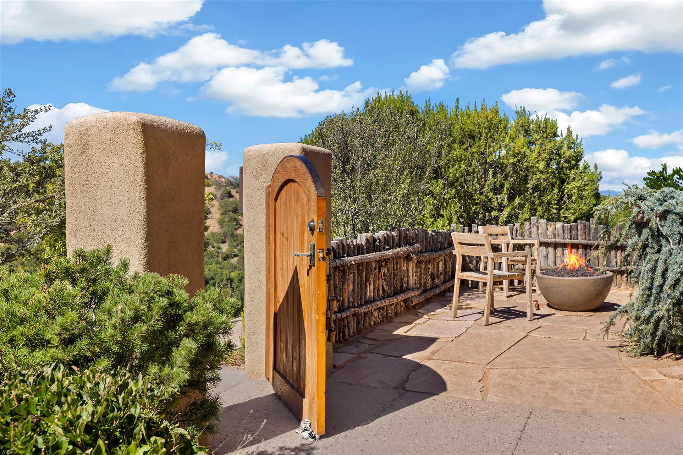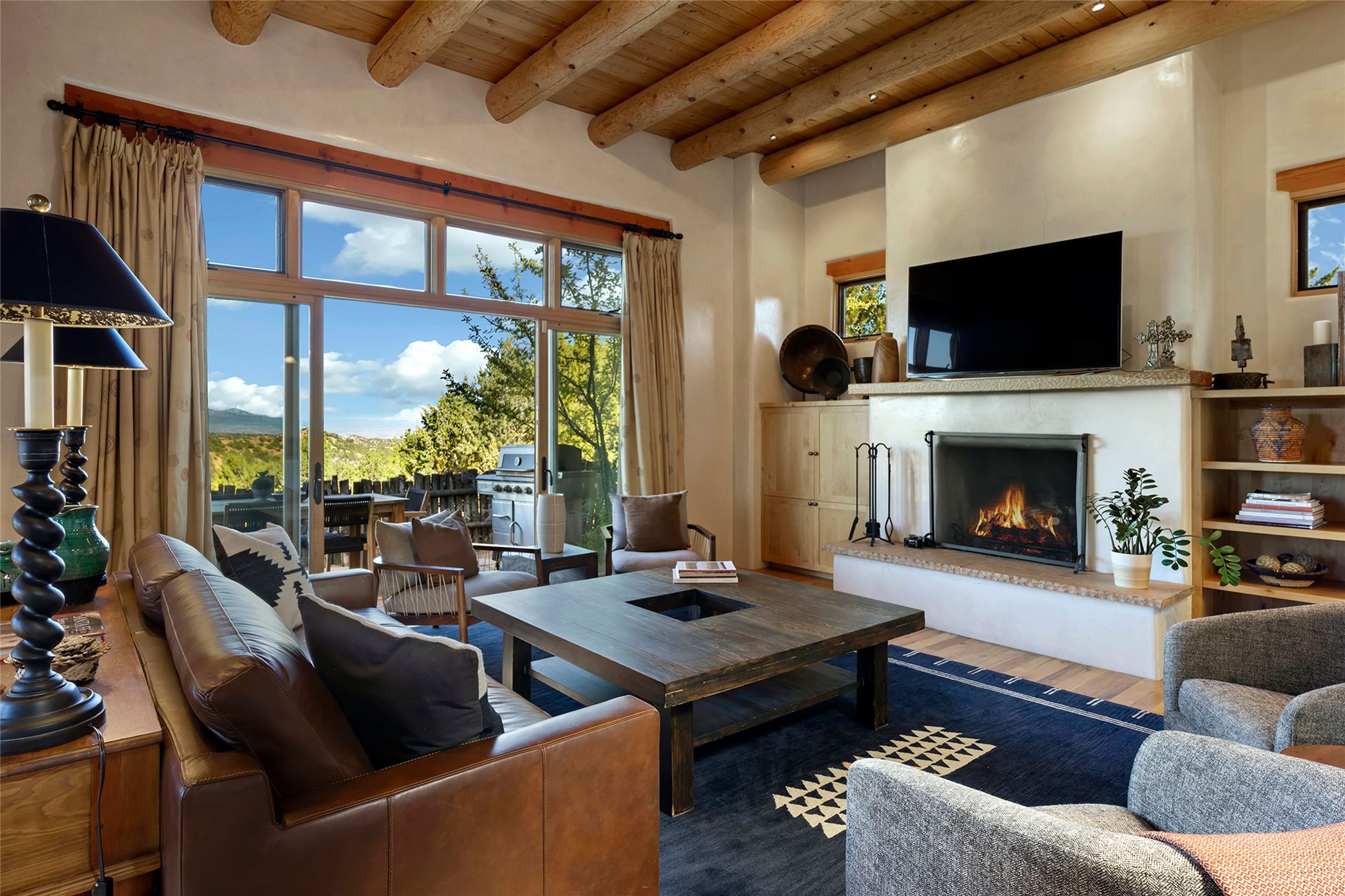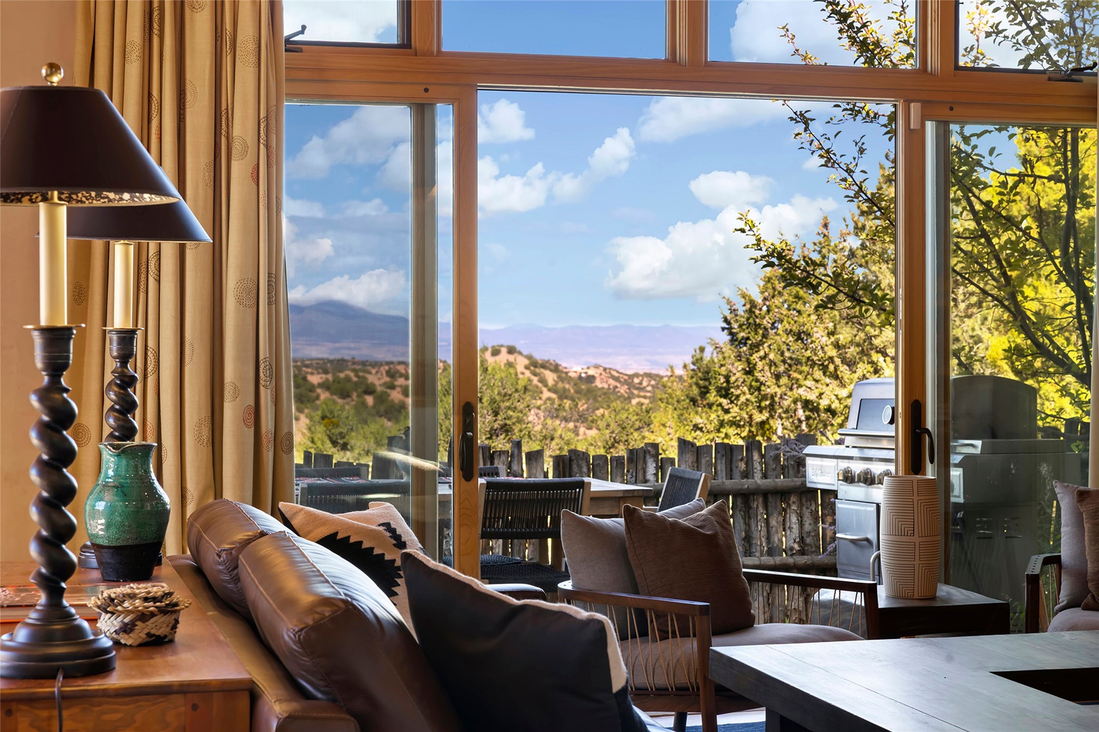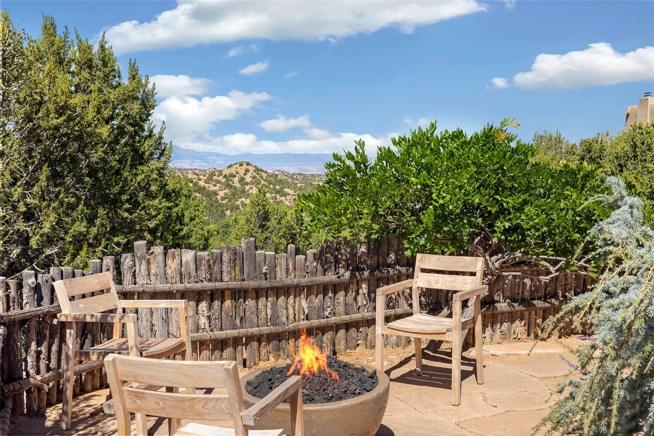 Rare single-level Bishop's Lodge Villa located above the Bishop's Lodge, Auberge Collection Resort. This free standing villa is uniquely located within the gated community perched on the edge of nature with sweeping Jemez Mountain Views and ultimate privacy from neighbors. Price includes a turn-key upgraded furniture package on this professional & locally managed investment opportunity with future bookings in place. A custom entry gate leads to the updated courtyards with coyote fencing, flagstone patios, lush landscaping, and a fire-pit ideal for entertaining & sunset views. Inside, a grand foyer opens to the living room that views the mountain vistas, a fireplace with flagstone hearth, gas logs and glass sliders all opening to an outdoor grilling/dining terrace. The generous kitchen offers updated quartzite countertops, KitchenAid SS appliances with gas range, bar seating and ample storage, opening to an expansive dining area filled with natural light.Three spacious ensuite bedrooms each feature access to outdoor patios, two with gas kiva fireplaces and updated quartzite counters in the baths. The primary includes a steam shower and jetted tub, fireplace and private courtyard. Traditional Santa Fe details throughout: high ceilings with Vigas, skylights, plaster walls, wood & tile flooring. Community amenities include a private pool plus access to the #1 Resort in the Mountain West by Cond Nast Traveler offering discounts for hotel rooms, dining, spa, horseback riding and limited access to the hotel pool. Just minutes north of downtown Santa Fe, this private and meticulously maintained Villa is move-in ready.