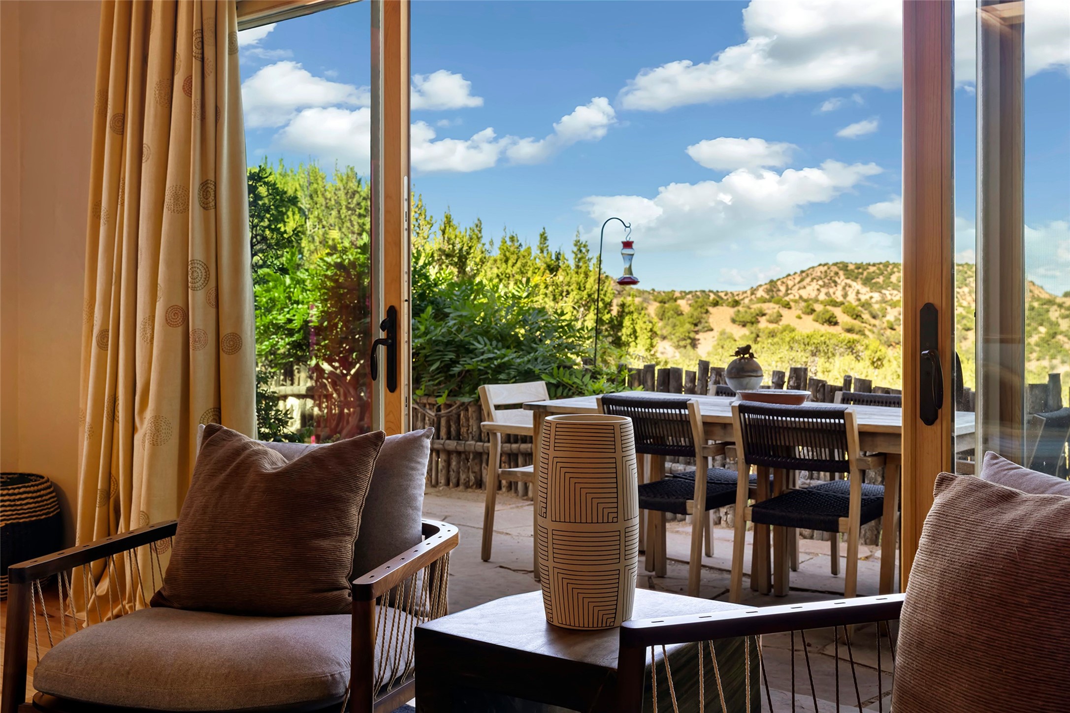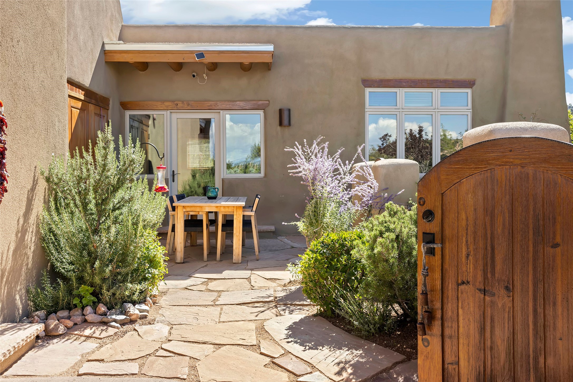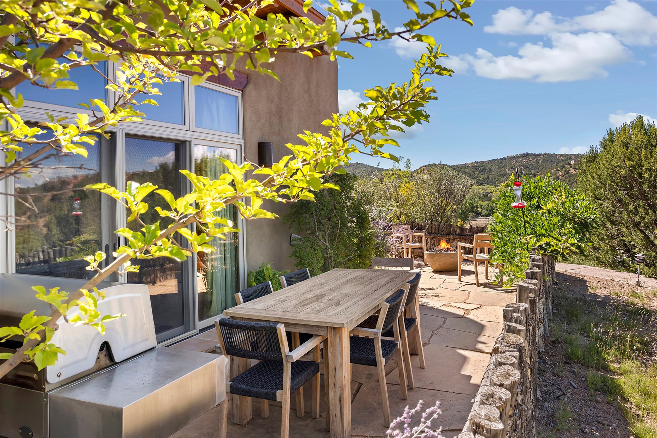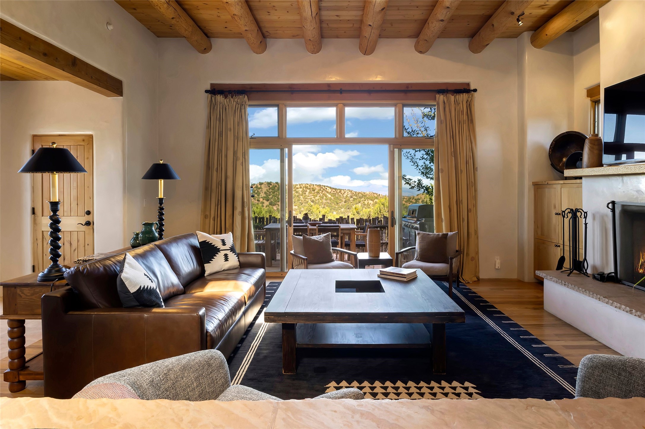 Rare single-level Bishop's Lodge Villa located above the Bishop's Lodge, Auberge Collection Resort. This free standing villa is uniquely located within the gated community perched on the edge of nature with sweeping Jemez Mountain Views and ultimate privacy from neighbors. Price includes a turn-key upgraded furniture package on this professional & locally managed investment opportunity with future bookings in place. A custom entry gate leads to the updated courtyards with coyote fencing, flagstone patios, lush landscaping, and a fire-pit ideal for entertaining & sunset views. Inside, a grand foyer opens to the living room that views the mountain vistas, a fireplace with flagstone hearth, gas logs and glass sliders all opening to an outdoor grilling/dining terrace. The generous kitchen offers updated quartzite countertops, KitchenAid SS appliances with gas range, bar seating and ample storage, opening to an expansive dining area filled with natural light.Three spacious ensuite bedrooms each feature access to outdoor patios, two with gas kiva fireplaces and updated quartzite counters in the baths. The primary includes a steam shower and jetted tub, fireplace and private courtyard. Traditional Santa Fe details throughout: high ceilings with Vigas, skylights, plaster walls, wood & tile flooring. Community amenities include a private pool plus access to the #1 Resort in the Mountain West by Cond Nast Traveler offering discounts for hotel rooms, dining, spa, horseback riding and limited access to the hotel pool. Just minutes north of downtown Santa Fe, this private and meticulously maintained Villa is move-in ready.