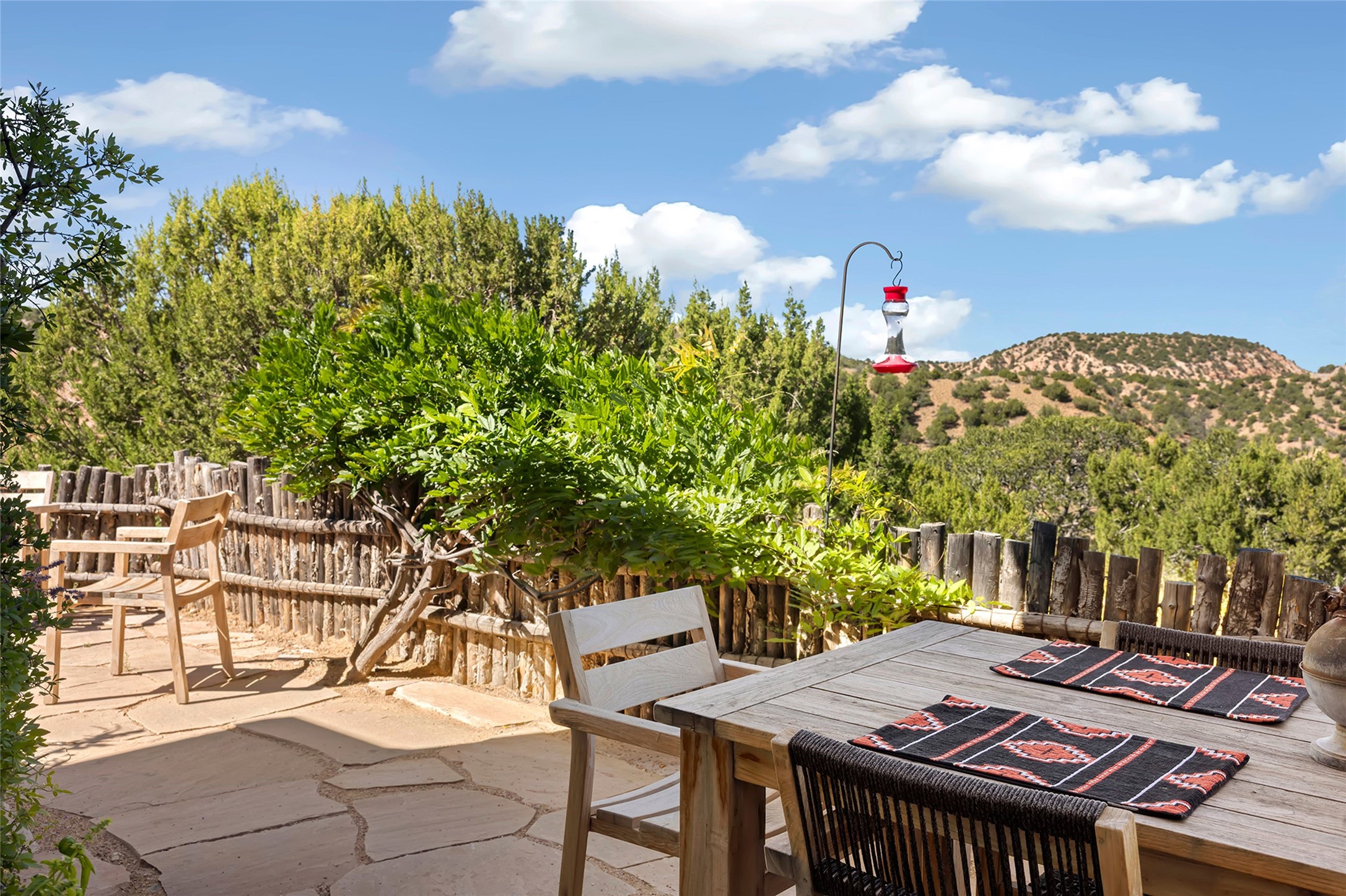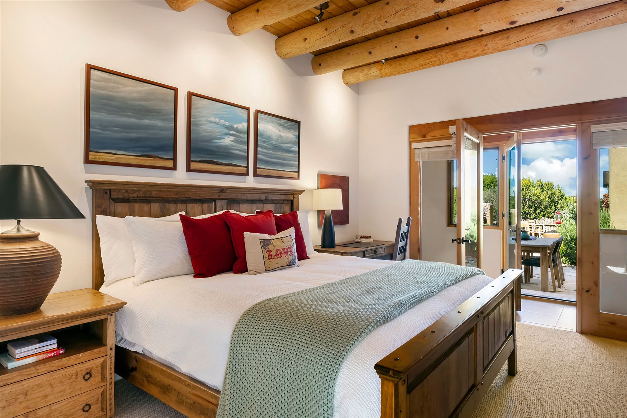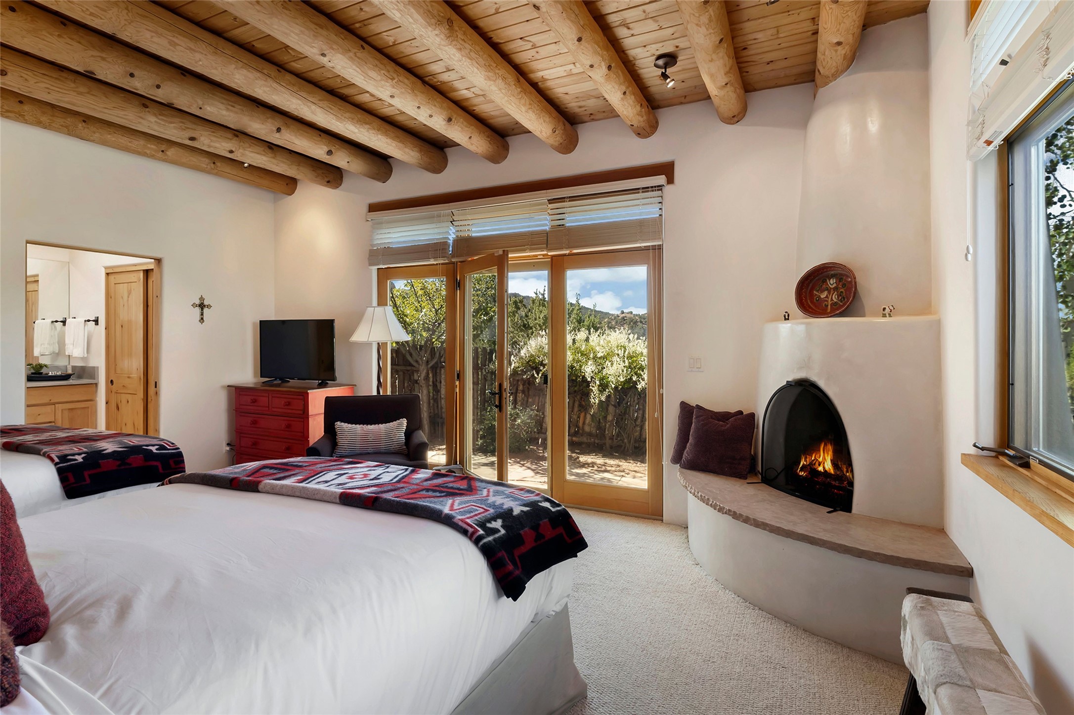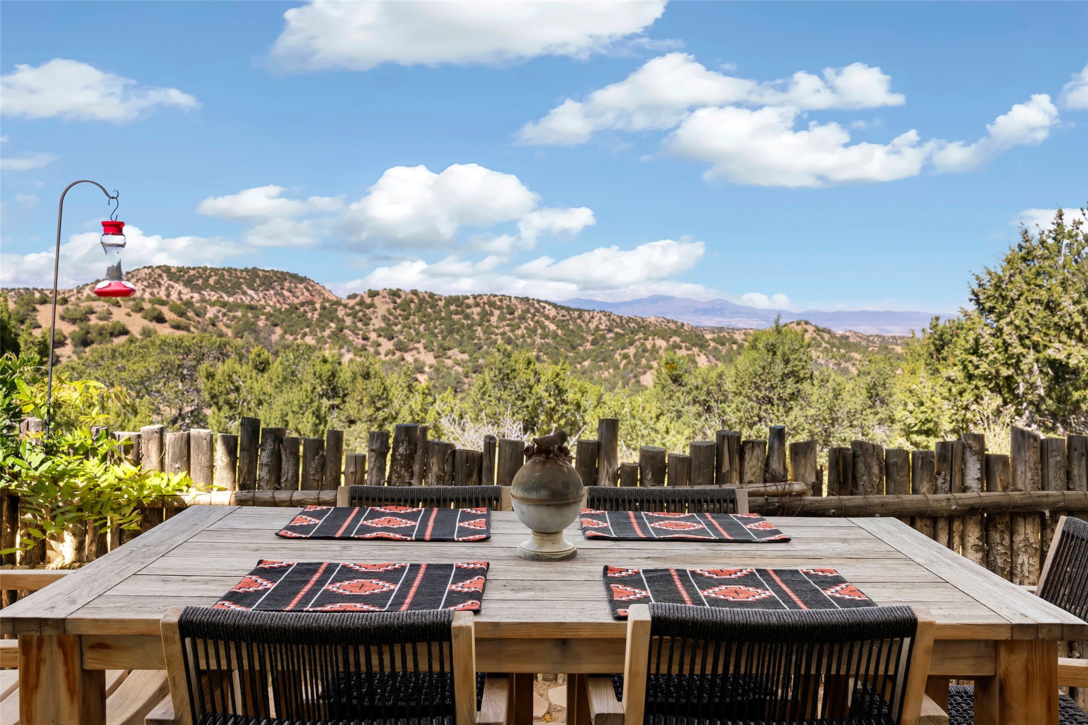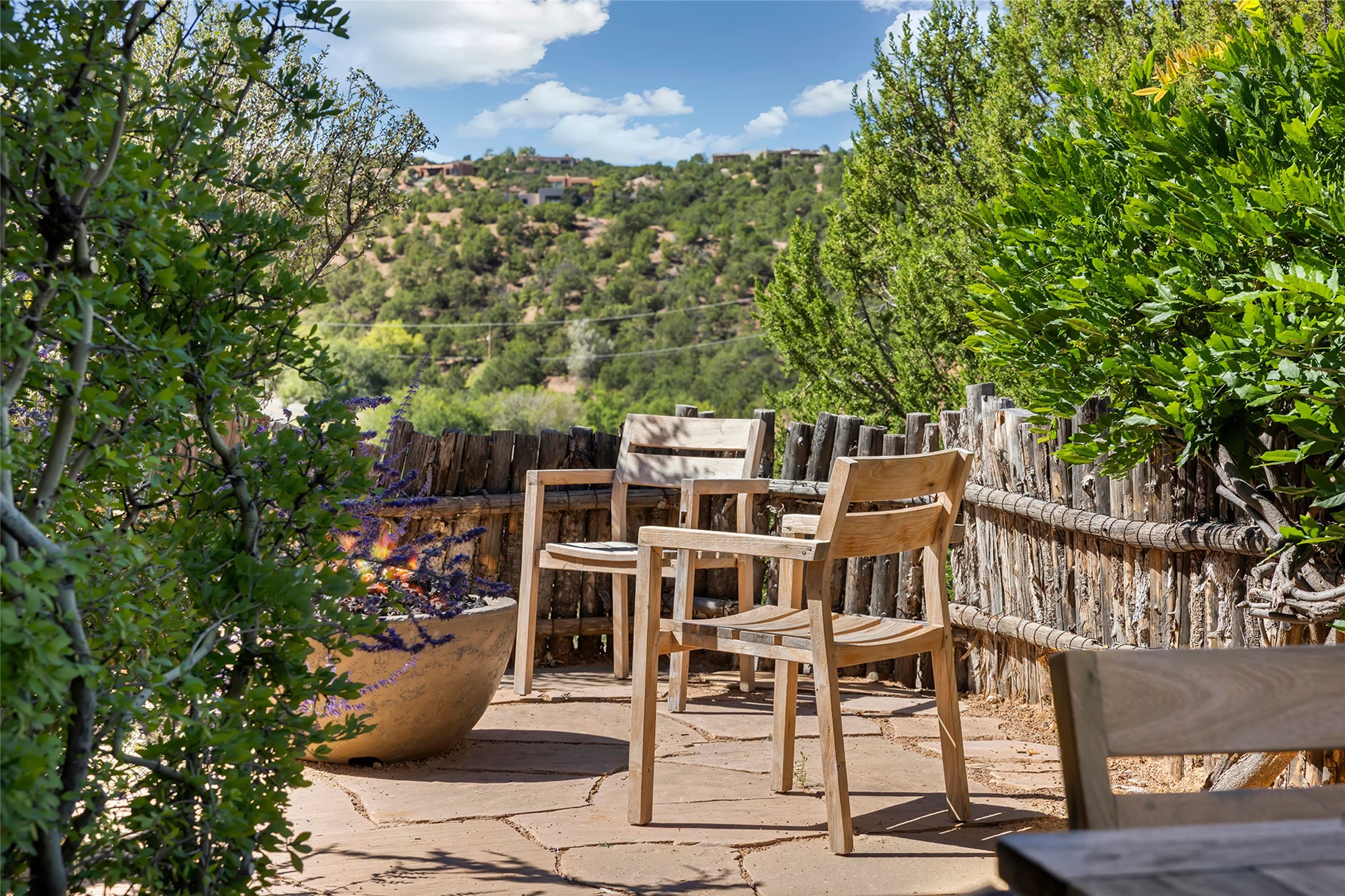 Rare single-level Bishop's Lodge Villa located above the Bishop's Lodge, Auberge Collection Resort. This free standing villa is uniquely located within the gated community perched on the edge of nature with sweeping Jemez Mountain Views and ultimate privacy from neighbors. Price includes a turn-key upgraded furniture package on this professional & locally managed investment opportunity with future bookings in place. A custom entry gate leads to the updated courtyards with coyote fencing, flagstone patios, lush landscaping, and a fire-pit ideal for entertaining & sunset views. Inside, a grand foyer opens to the living room that views the mountain vistas, a fireplace with flagstone hearth, gas logs and glass sliders all opening to an outdoor grilling/dining terrace. The generous kitchen offers updated quartzite countertops, KitchenAid SS appliances with gas range, bar seating and ample storage, opening to an expansive dining area filled with natural light.Three spacious ensuite bedrooms each feature access to outdoor patios, two with gas kiva fireplaces and updated quartzite counters in the baths. The primary includes a steam shower and jetted tub, fireplace and private courtyard. Traditional Santa Fe details throughout: high ceilings with Vigas, skylights, plaster walls, wood & tile flooring. Community amenities include a private pool plus access to the #1 Resort in the Mountain West by Cond Nast Traveler offering discounts for hotel rooms, dining, spa, horseback riding and limited access to the hotel pool. Just minutes north of downtown Santa Fe, this private and meticulously maintained Villa is move-in ready.