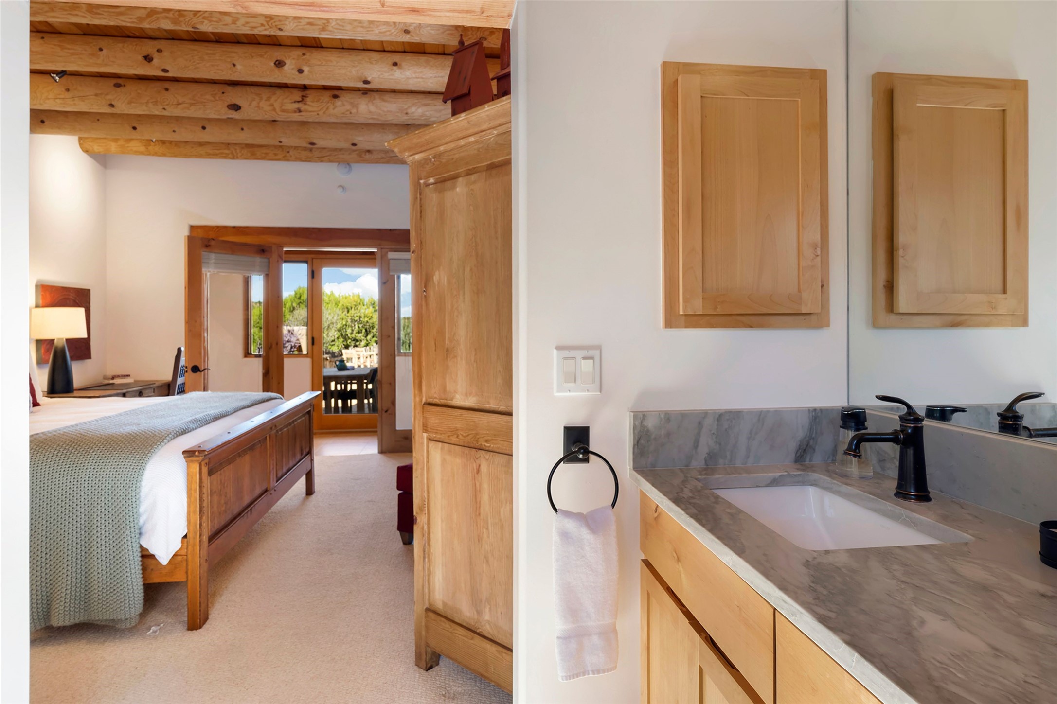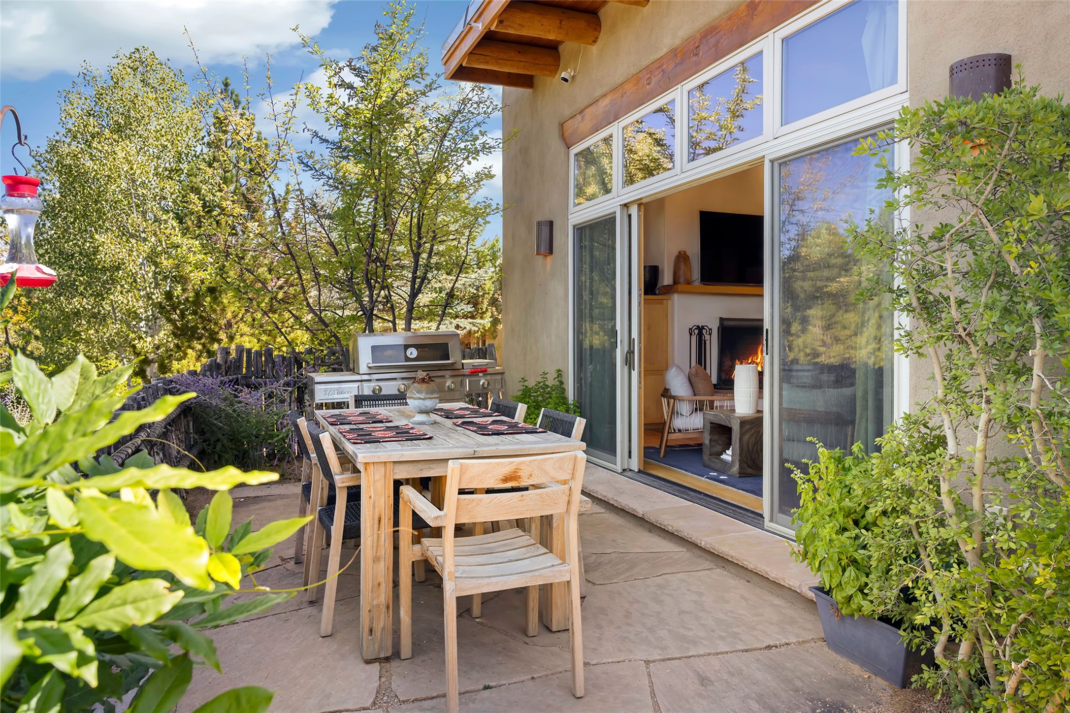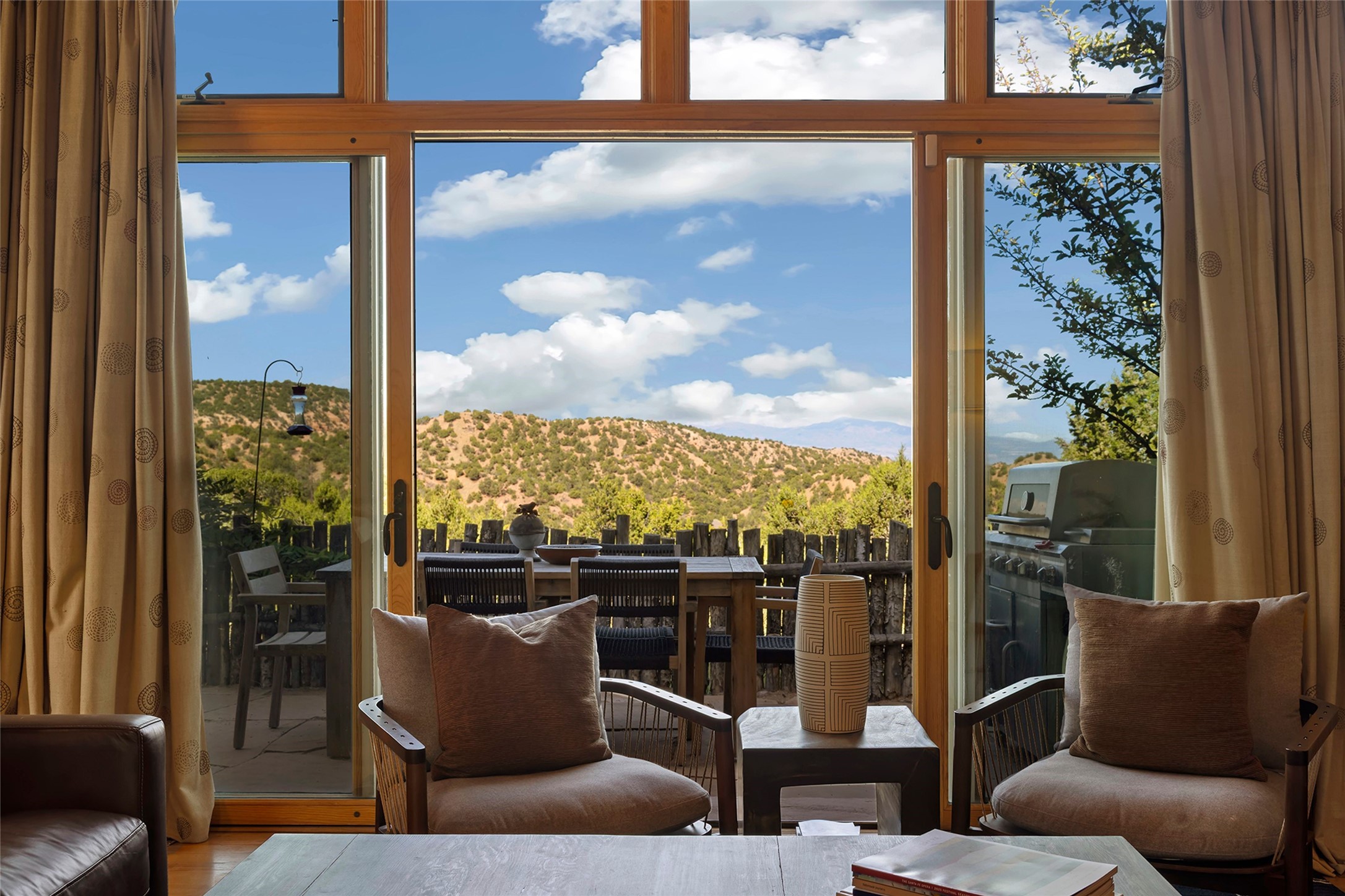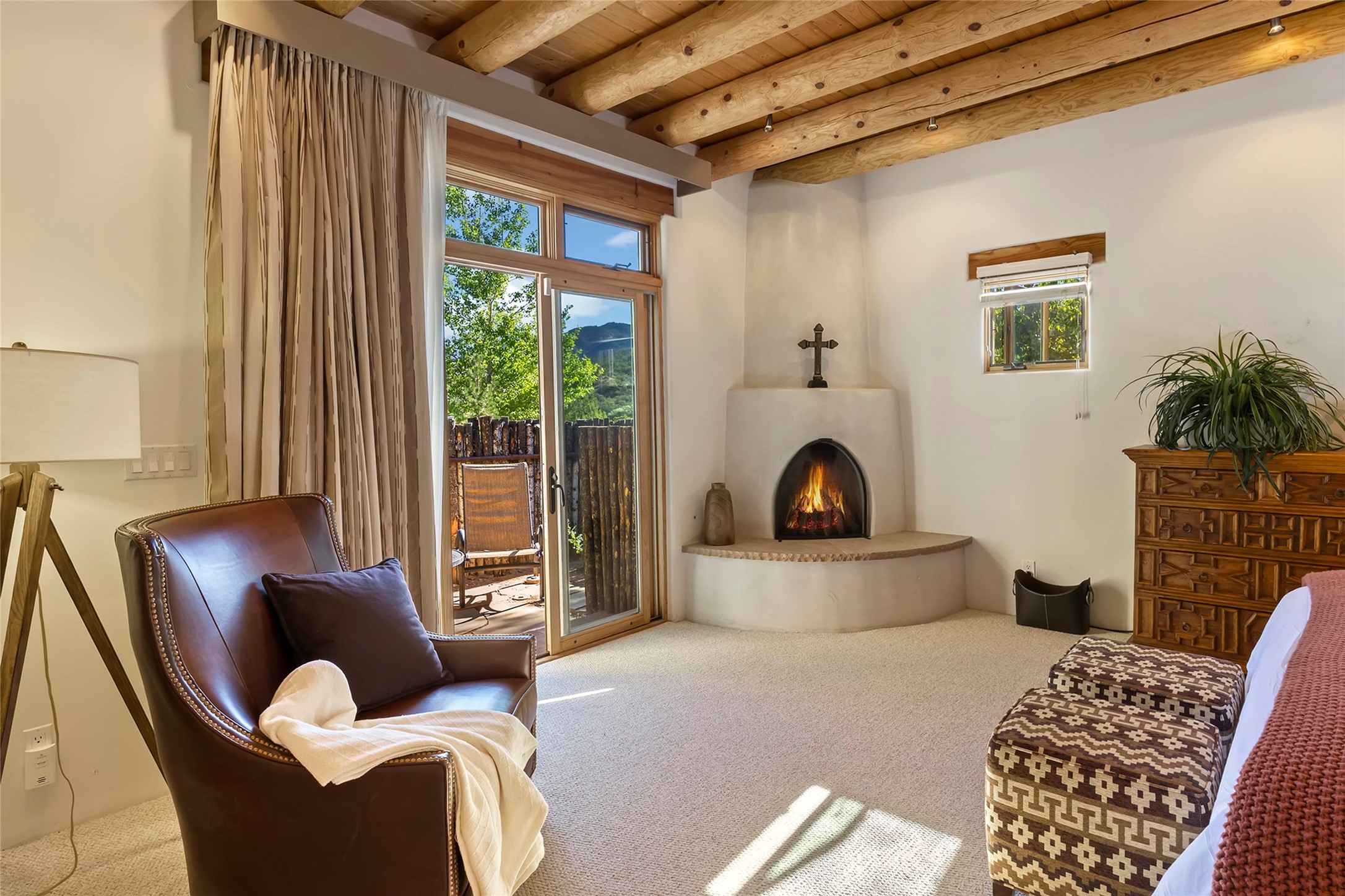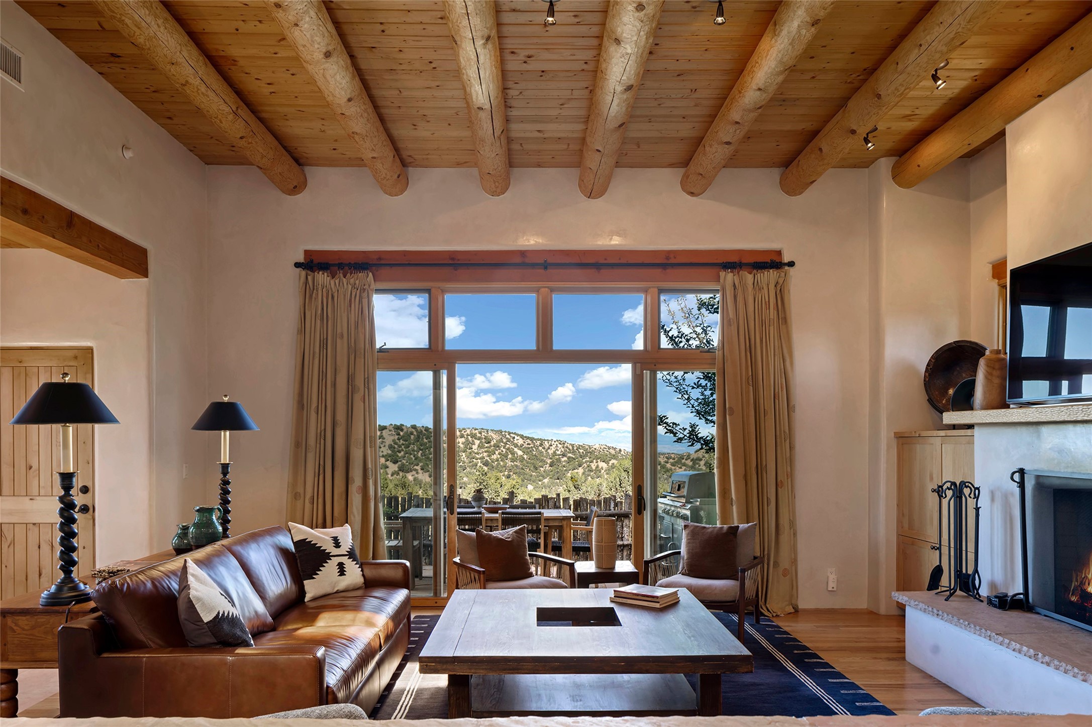 Rare single-level Bishop's Lodge Villa located above the Bishop's Lodge, Auberge Collection Resort. This free standing villa is uniquely located within the gated community perched on the edge of nature with sweeping Jemez Mountain Views and ultimate privacy from neighbors. Price includes a turn-key upgraded furniture package on this professional & locally managed investment opportunity with future bookings in place. A custom entry gate leads to the updated courtyards with coyote fencing, flagstone patios, lush landscaping, and a fire-pit ideal for entertaining & sunset views. Inside, a grand foyer opens to the living room that views the mountain vistas, a fireplace with flagstone hearth, gas logs and glass sliders all opening to an outdoor grilling/dining terrace. The generous kitchen offers updated quartzite countertops, KitchenAid SS appliances with gas range, bar seating and ample storage, opening to an expansive dining area filled with natural light.Three spacious ensuite bedrooms each feature access to outdoor patios, two with gas kiva fireplaces and updated quartzite counters in the baths. The primary includes a steam shower and jetted tub, fireplace and private courtyard. Traditional Santa Fe details throughout: high ceilings with Vigas, skylights, plaster walls, wood & tile flooring. Community amenities include a private pool plus access to the #1 Resort in the Mountain West by Cond Nast Traveler offering discounts for hotel rooms, dining, spa, horseback riding and limited access to the hotel pool. Just minutes north of downtown Santa Fe, this private and meticulously maintained Villa is move-in ready.