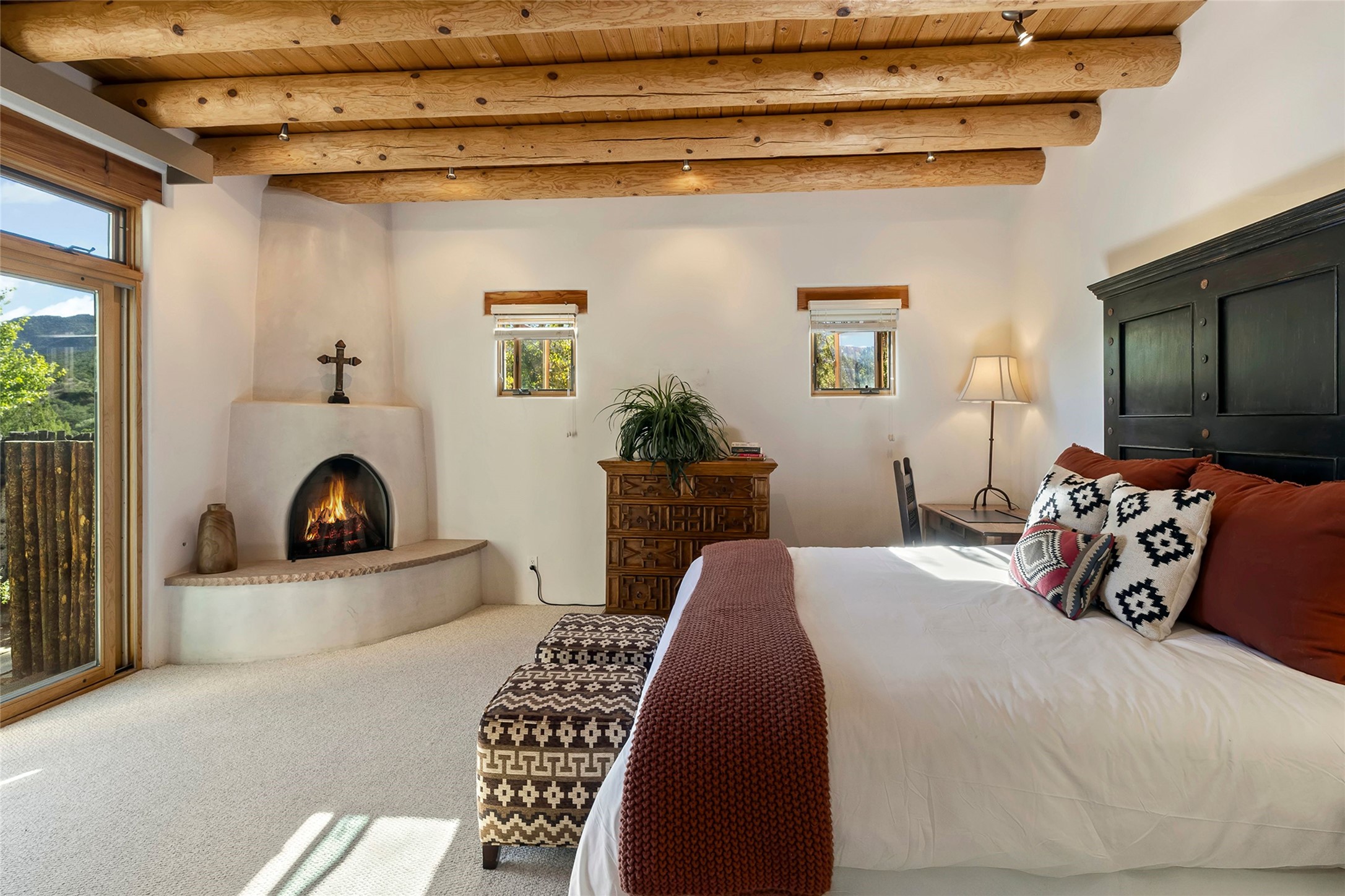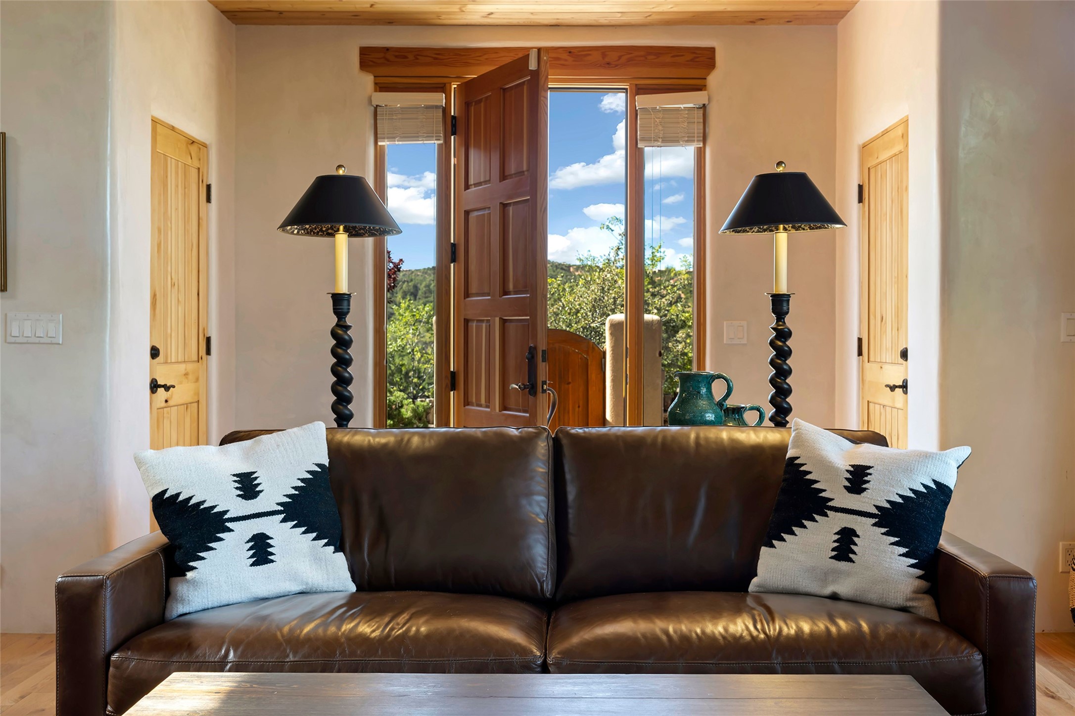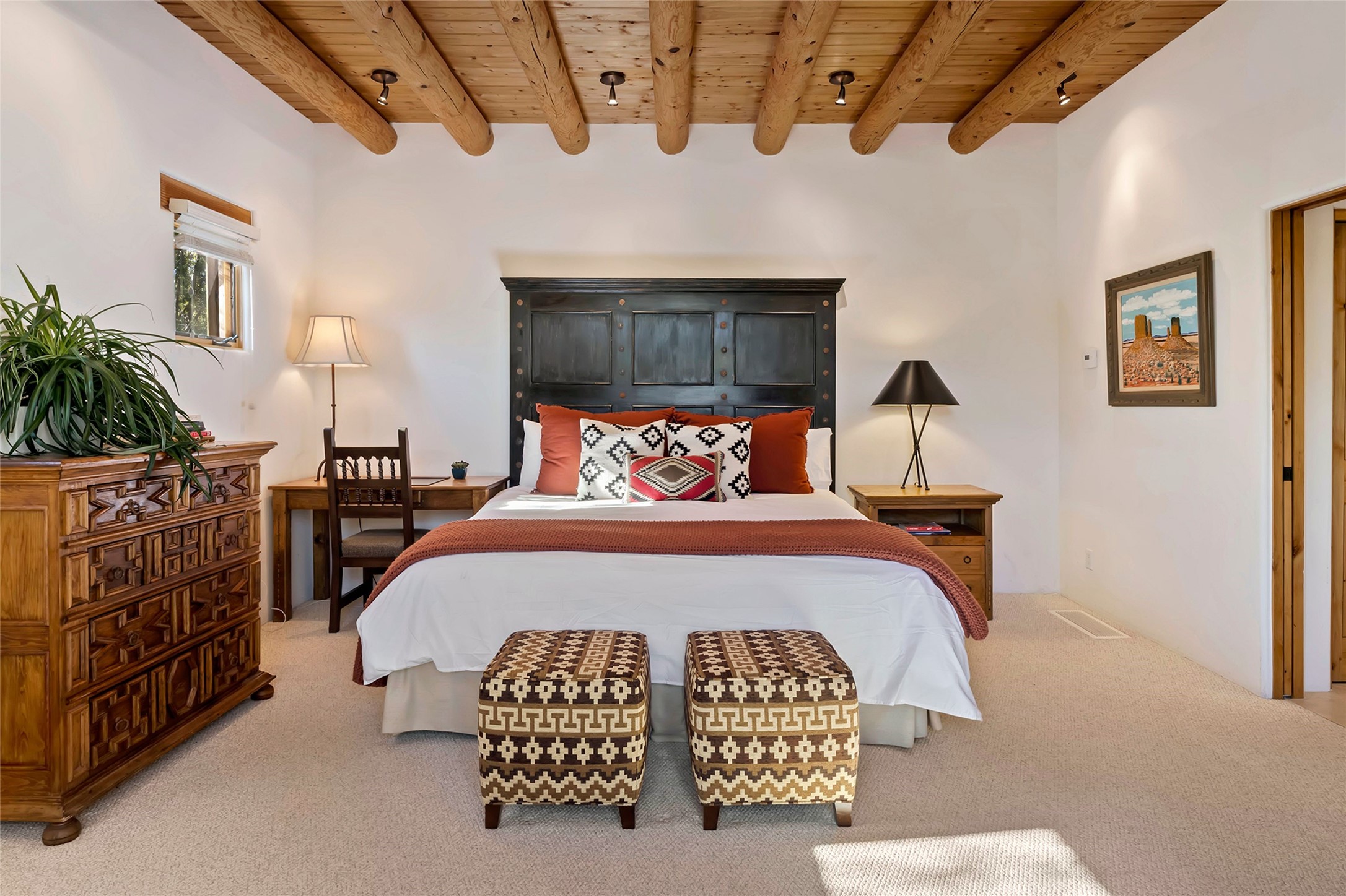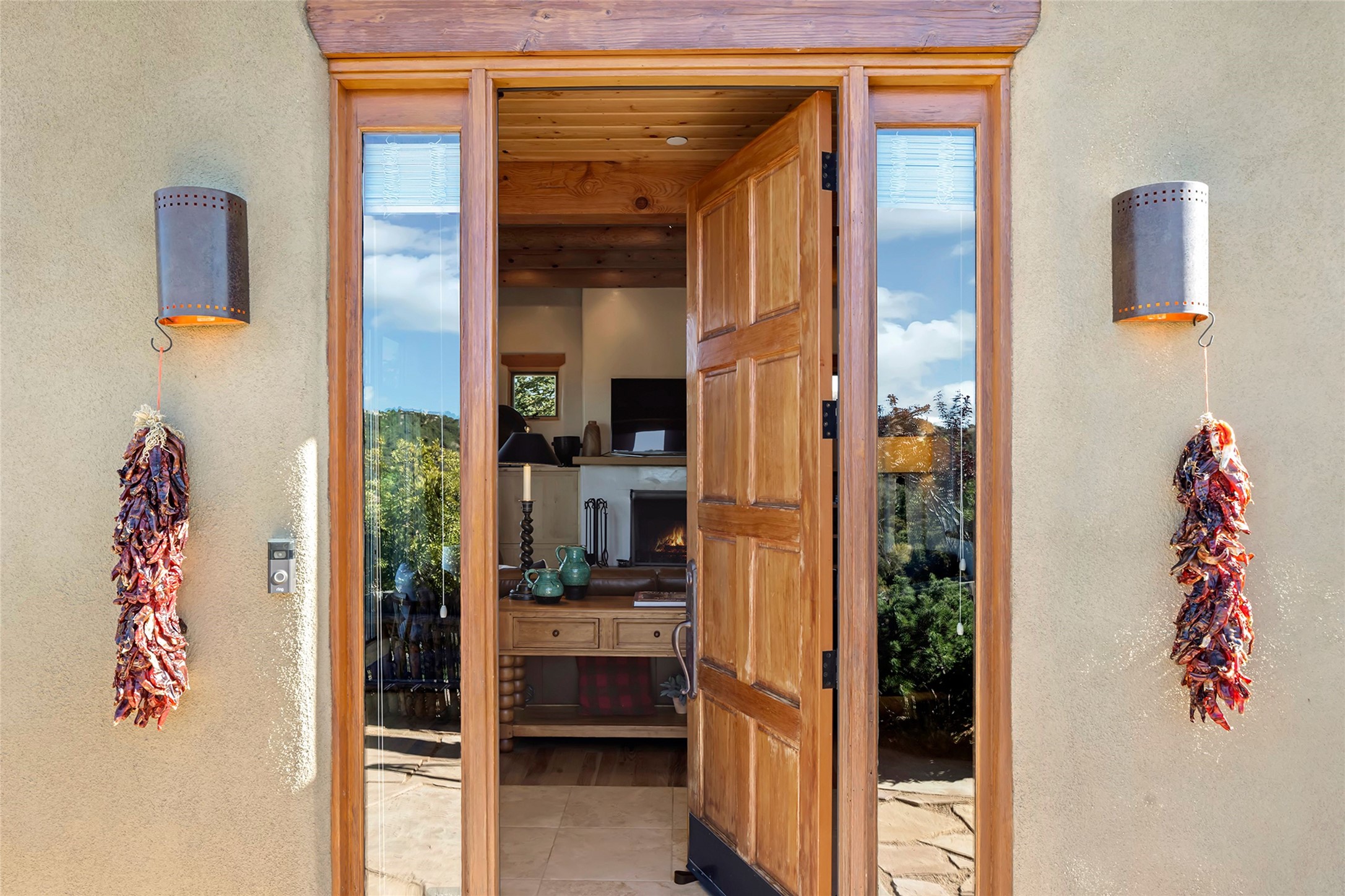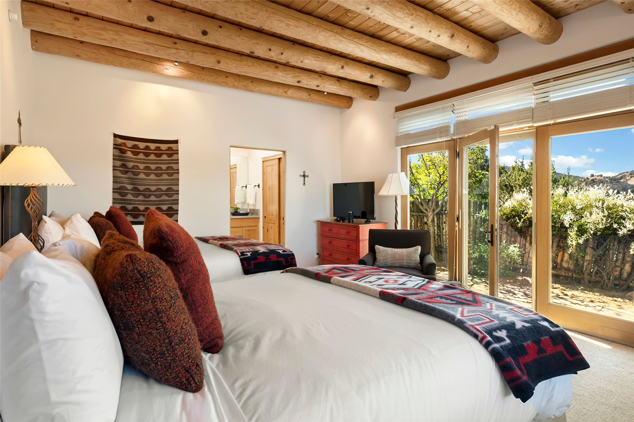 Rare single-level Bishop's Lodge Villa located above the Bishop's Lodge, Auberge Collection Resort. This free standing villa is uniquely located within the gated community perched on the edge of nature with sweeping Jemez Mountain Views and ultimate privacy from neighbors. Price includes a turn-key upgraded furniture package on this professional & locally managed investment opportunity with future bookings in place. A custom entry gate leads to the updated courtyards with coyote fencing, flagstone patios, lush landscaping, and a fire-pit ideal for entertaining & sunset views. Inside, a grand foyer opens to the living room that views the mountain vistas, a fireplace with flagstone hearth, gas logs and glass sliders all opening to an outdoor grilling/dining terrace. The generous kitchen offers updated quartzite countertops, KitchenAid SS appliances with gas range, bar seating and ample storage, opening to an expansive dining area filled with natural light.Three spacious ensuite bedrooms each feature access to outdoor patios, two with gas kiva fireplaces and updated quartzite counters in the baths. The primary includes a steam shower and jetted tub, fireplace and private courtyard. Traditional Santa Fe details throughout: high ceilings with Vigas, skylights, plaster walls, wood & tile flooring. Community amenities include a private pool plus access to the #1 Resort in the Mountain West by Cond Nast Traveler offering discounts for hotel rooms, dining, spa, horseback riding and limited access to the hotel pool. Just minutes north of downtown Santa Fe, this private and meticulously maintained Villa is move-in ready.