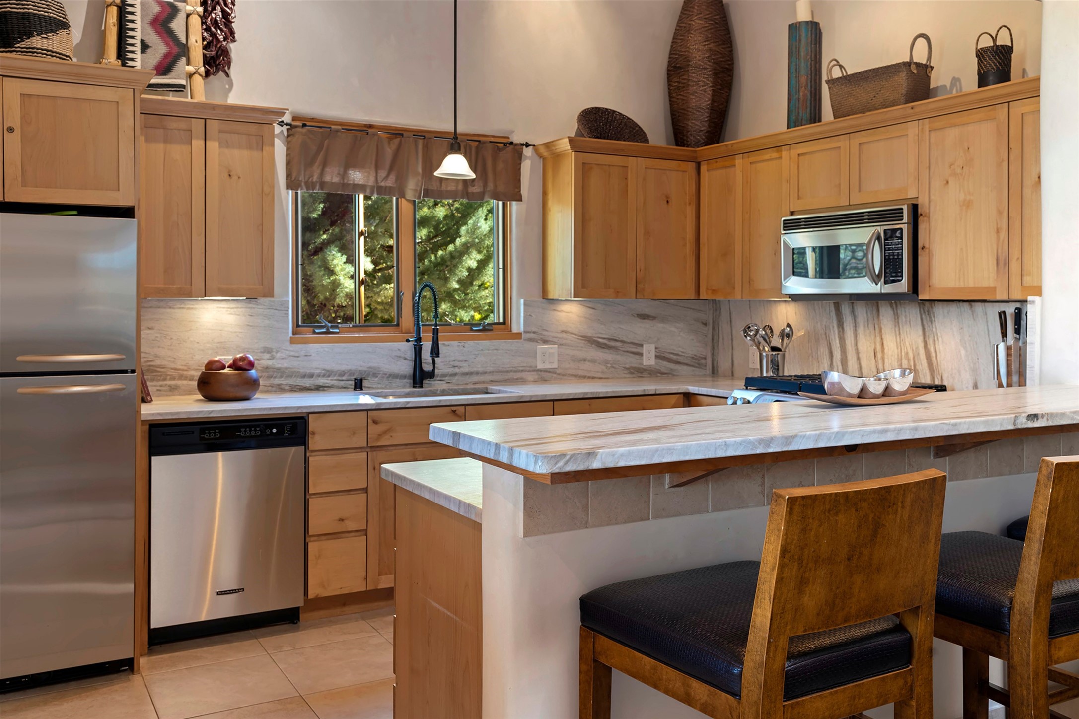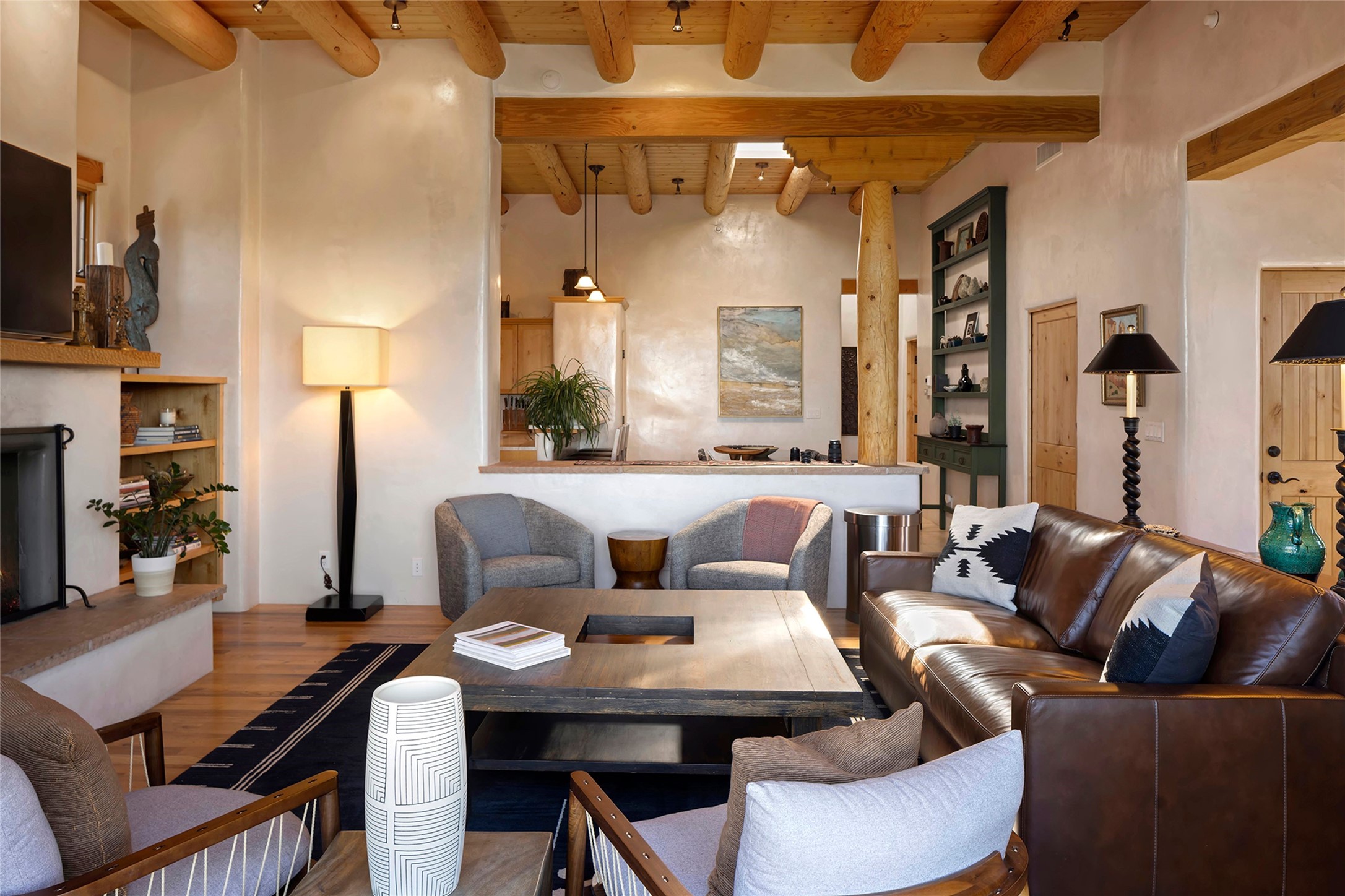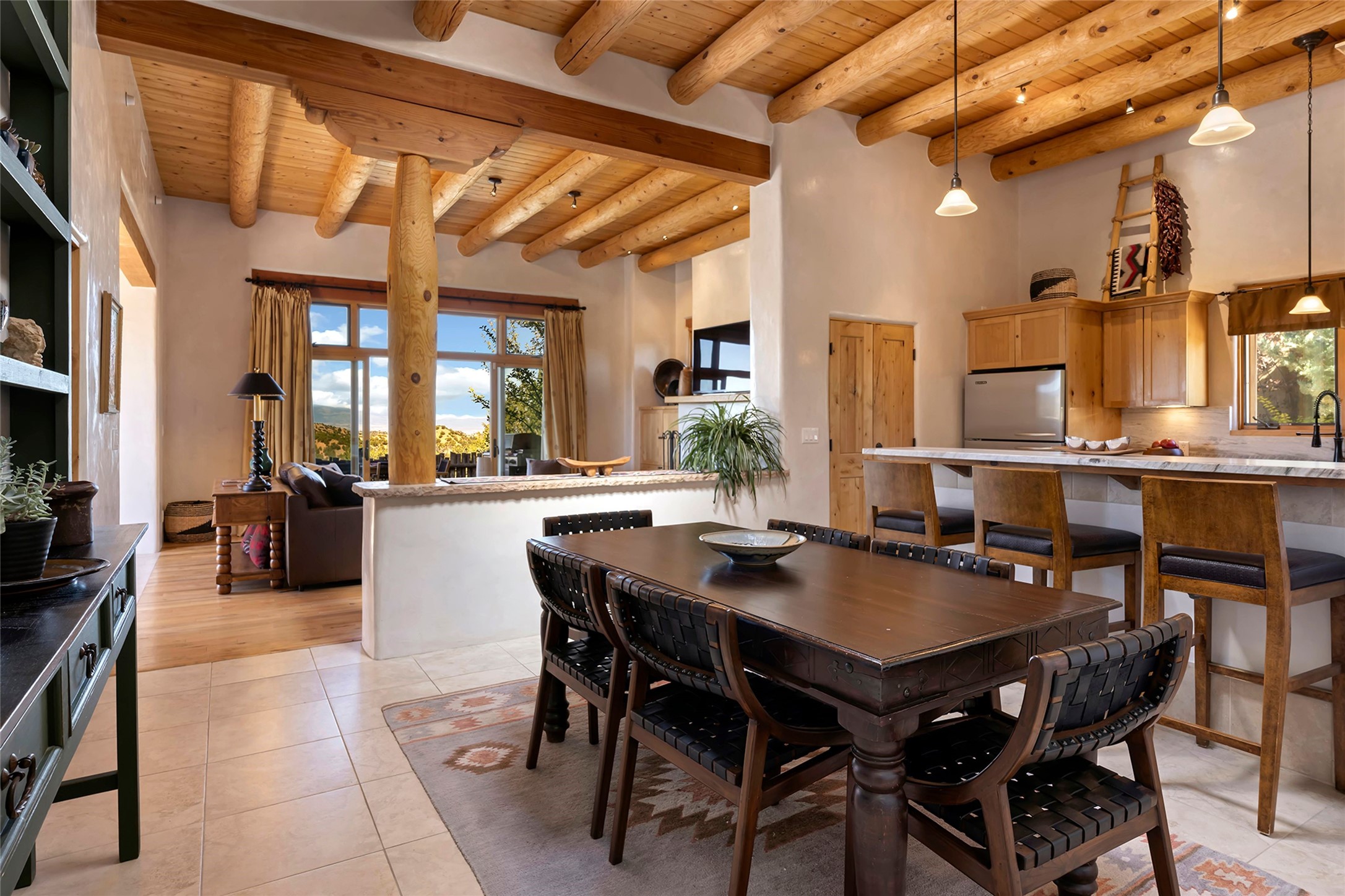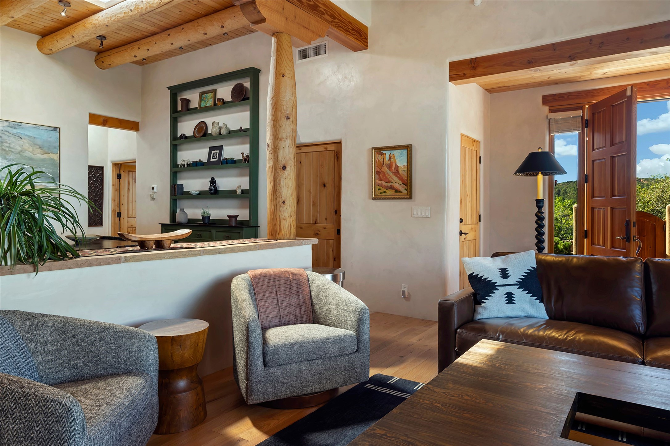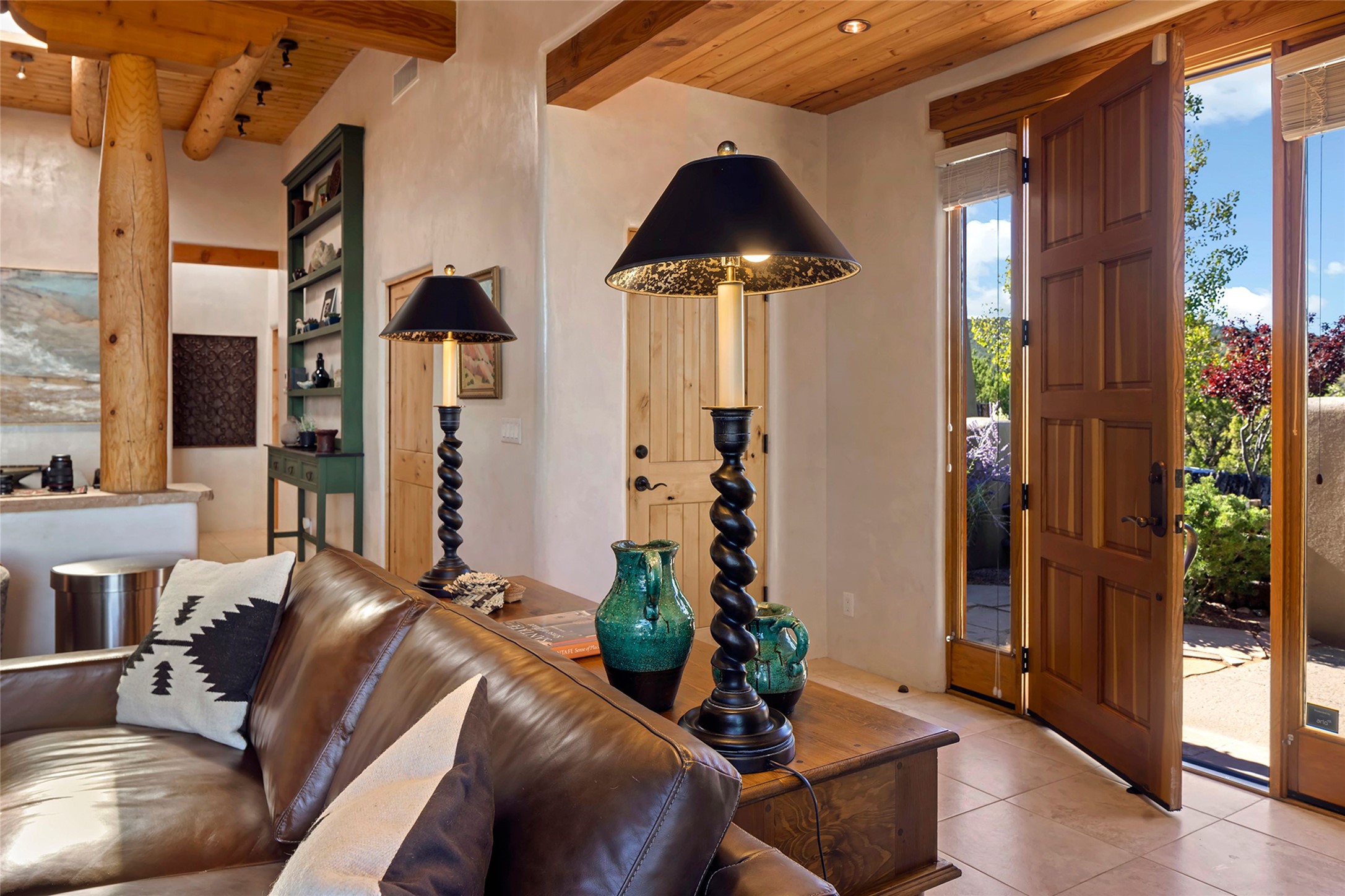 Rare single-level Bishop's Lodge Villa located above the Bishop's Lodge, Auberge Collection Resort. This free standing villa is uniquely located within the gated community perched on the edge of nature with sweeping Jemez Mountain Views and ultimate privacy from neighbors. Price includes a turn-key upgraded furniture package on this professional & locally managed investment opportunity with future bookings in place. A custom entry gate leads to the updated courtyards with coyote fencing, flagstone patios, lush landscaping, and a fire-pit ideal for entertaining & sunset views. Inside, a grand foyer opens to the living room that views the mountain vistas, a fireplace with flagstone hearth, gas logs and glass sliders all opening to an outdoor grilling/dining terrace. The generous kitchen offers updated quartzite countertops, KitchenAid SS appliances with gas range, bar seating and ample storage, opening to an expansive dining area filled with natural light.Three spacious ensuite bedrooms each feature access to outdoor patios, two with gas kiva fireplaces and updated quartzite counters in the baths. The primary includes a steam shower and jetted tub, fireplace and private courtyard. Traditional Santa Fe details throughout: high ceilings with Vigas, skylights, plaster walls, wood & tile flooring. Community amenities include a private pool plus access to the #1 Resort in the Mountain West by Cond Nast Traveler offering discounts for hotel rooms, dining, spa, horseback riding and limited access to the hotel pool. Just minutes north of downtown Santa Fe, this private and meticulously maintained Villa is move-in ready.