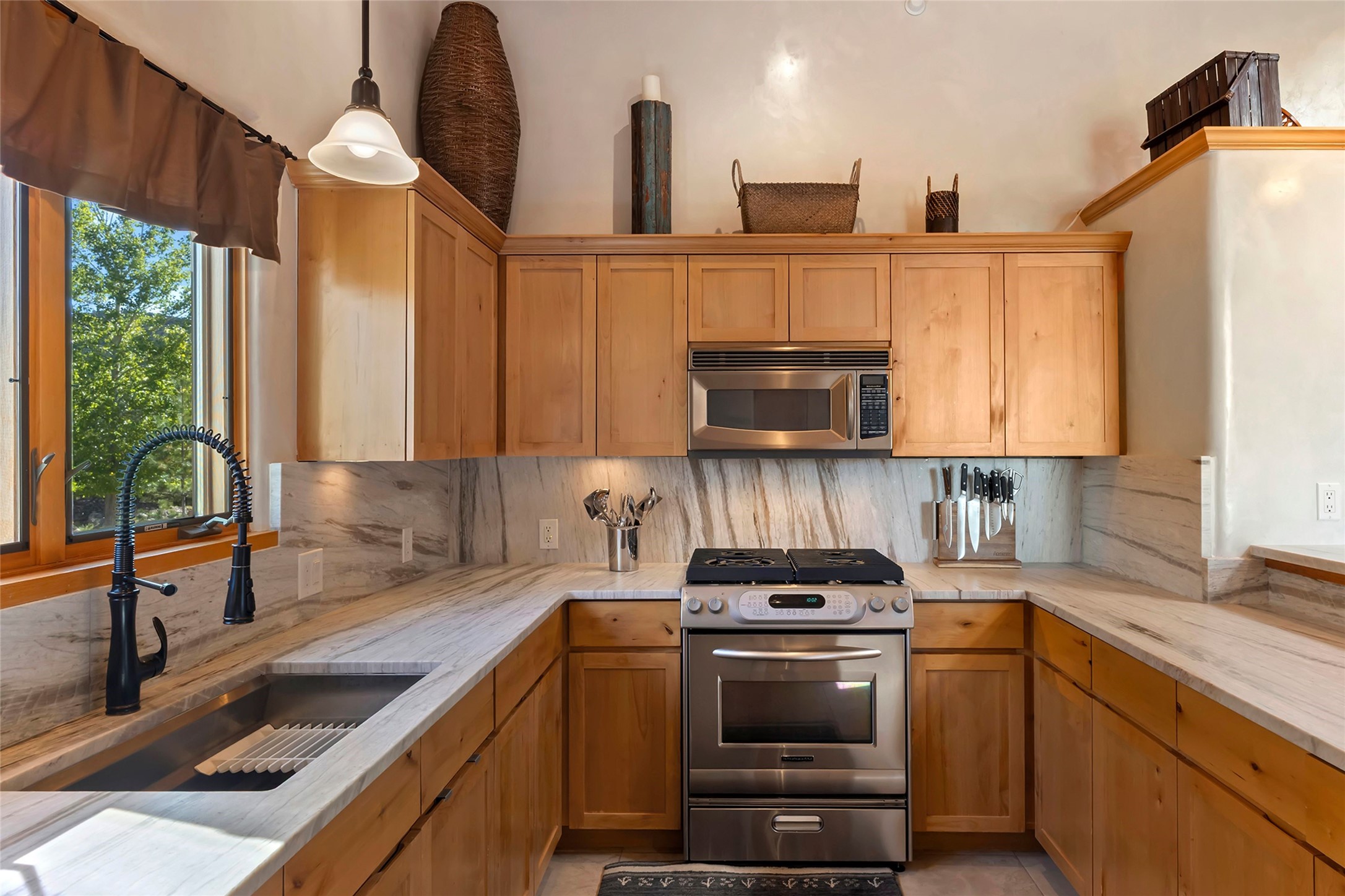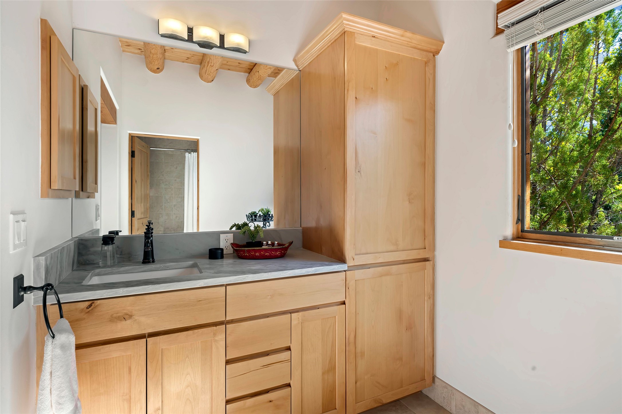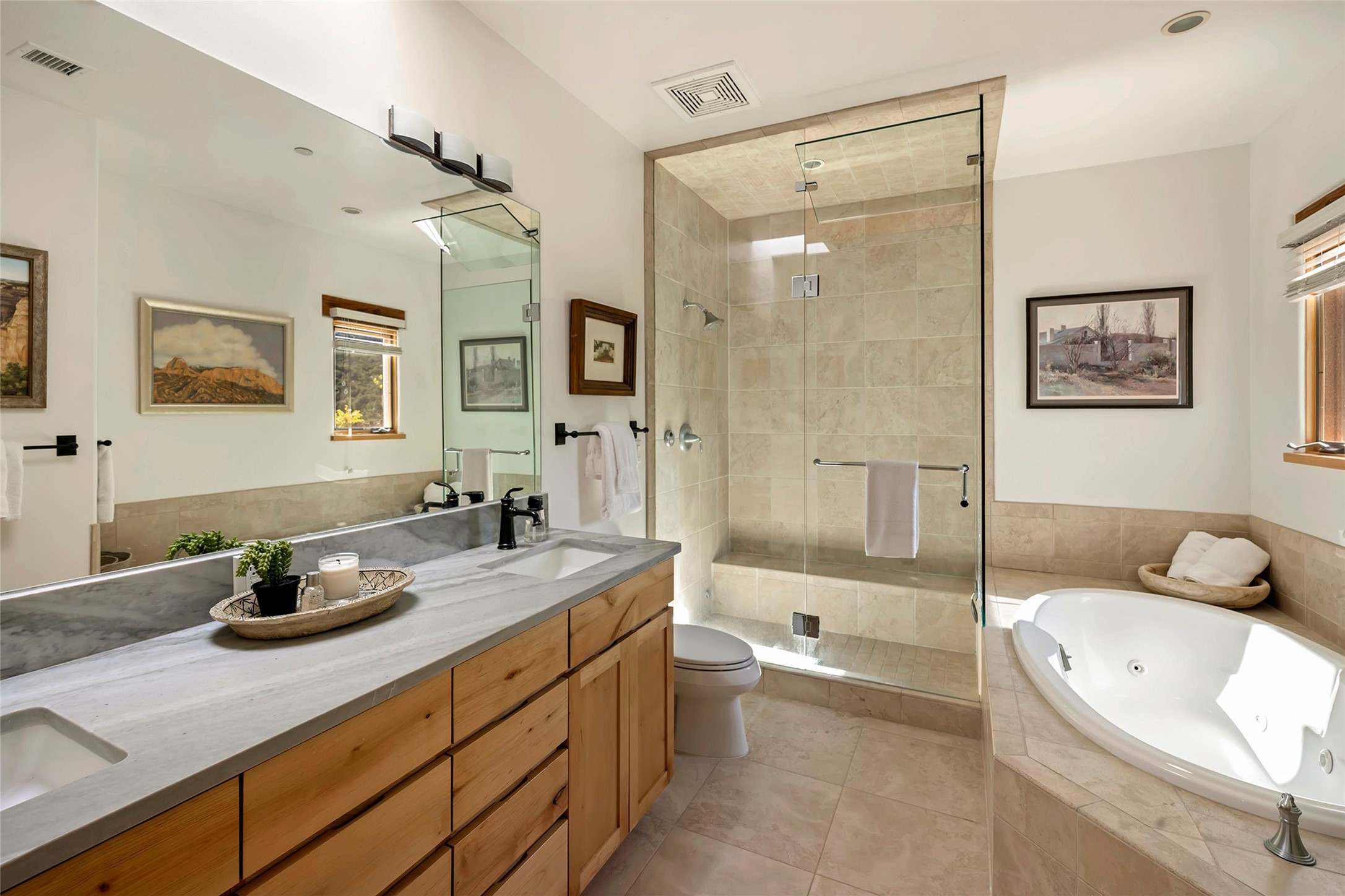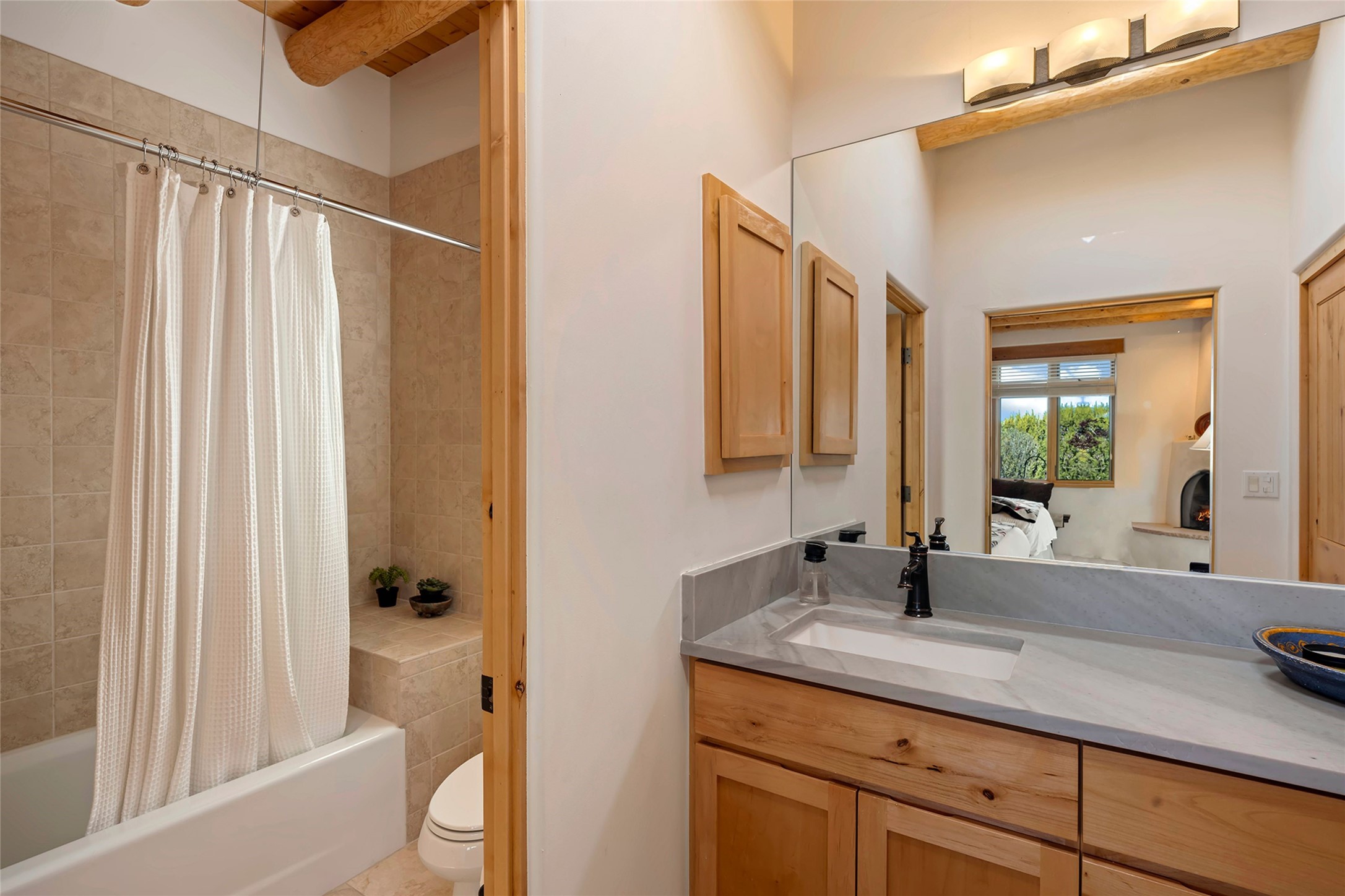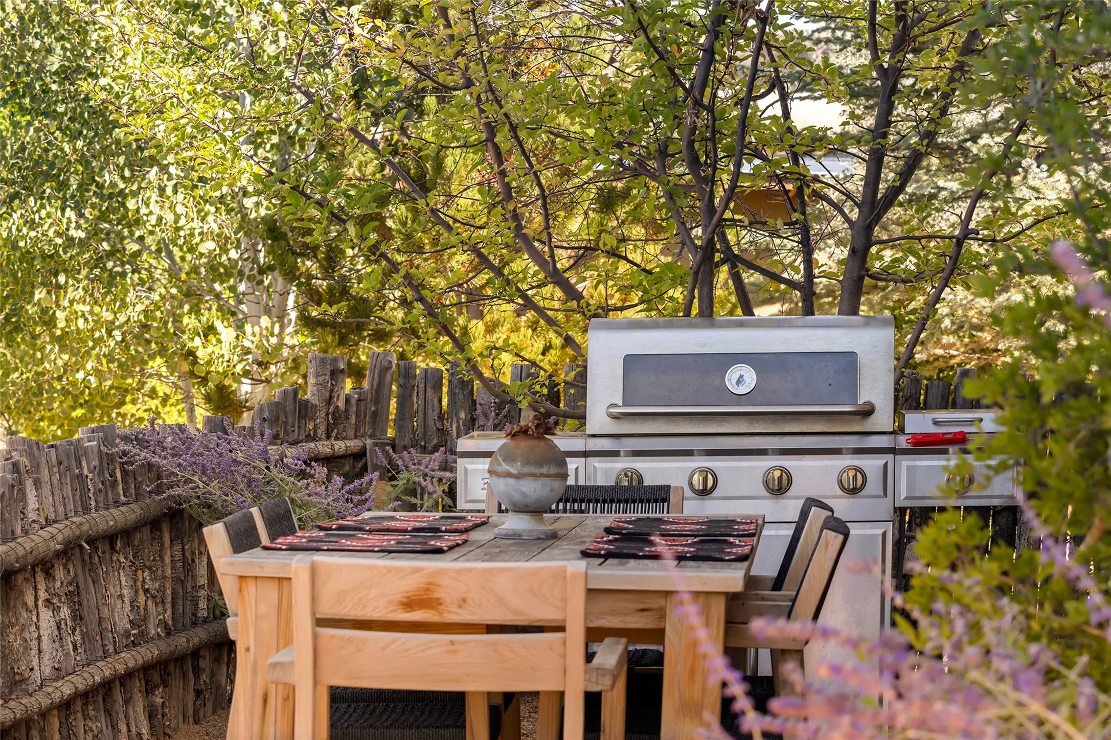 Rare single-level Bishop's Lodge Villa located above the Bishop's Lodge, Auberge Collection Resort. This free standing villa is uniquely located within the gated community perched on the edge of nature with sweeping Jemez Mountain Views and ultimate privacy from neighbors. Price includes a turn-key upgraded furniture package on this professional & locally managed investment opportunity with future bookings in place. A custom entry gate leads to the updated courtyards with coyote fencing, flagstone patios, lush landscaping, and a fire-pit ideal for entertaining & sunset views. Inside, a grand foyer opens to the living room that views the mountain vistas, a fireplace with flagstone hearth, gas logs and glass sliders all opening to an outdoor grilling/dining terrace. The generous kitchen offers updated quartzite countertops, KitchenAid SS appliances with gas range, bar seating and ample storage, opening to an expansive dining area filled with natural light.Three spacious ensuite bedrooms each feature access to outdoor patios, two with gas kiva fireplaces and updated quartzite counters in the baths. The primary includes a steam shower and jetted tub, fireplace and private courtyard. Traditional Santa Fe details throughout: high ceilings with Vigas, skylights, plaster walls, wood & tile flooring. Community amenities include a private pool plus access to the #1 Resort in the Mountain West by Cond Nast Traveler offering discounts for hotel rooms, dining, spa, horseback riding and limited access to the hotel pool. Just minutes north of downtown Santa Fe, this private and meticulously maintained Villa is move-in ready.