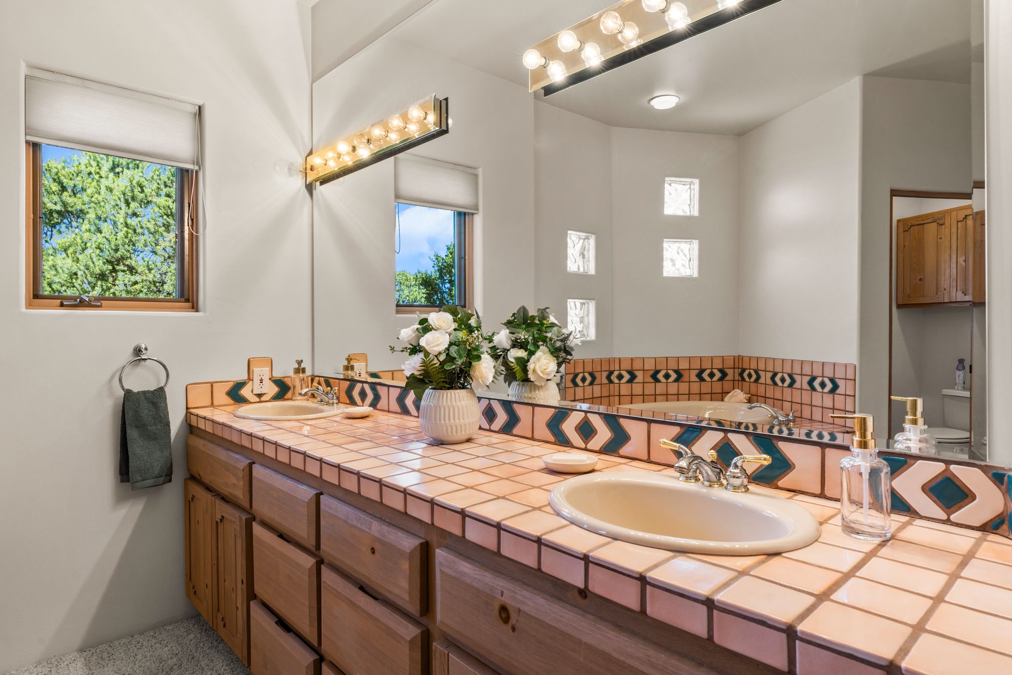 BEAUTIFUL ALTEZA ESTATES HOME WITH ADJACENT LOT AVAILABLE! Sited on one of the highest lots in this gated subdivision, this home offers truly astounding mountain views with the lot in front available for sale to protect the views. This one-owner home offers three bedrooms, three bathrooms plus office/studio space. SINGLE LEVEL - NO STEPS. LOT IS PRICED AT 145K. Custom hard-carved entry door with diamond plaster in the public areas. NEW TPO ROOF in 2020. New stucco in 2016. Kitchen has pretty custom cabinetry with lighting, ample pantry space and breakfast area. Dining room has built-in buffet. Spacious primary bedroom has vigas and beams and a good-sized walk-in closet. Landscaped and walled front courtyard on a drip system. Proper laundry room with sink and storage - washer and dryer convey with the property. Two-car finished, direct-entry garage with workbench and good storage. The vacant lot in front of the property protects the amazing views and is 2.57 acres. Seller prefers to sell them together. THIS HOME HAS BEEN PRE-INSPECTED AND MOST REPAIRS ARE COMPLETE. SPLIT SYSTEM FOR HEAT AND A/C IS IN PROCESS.