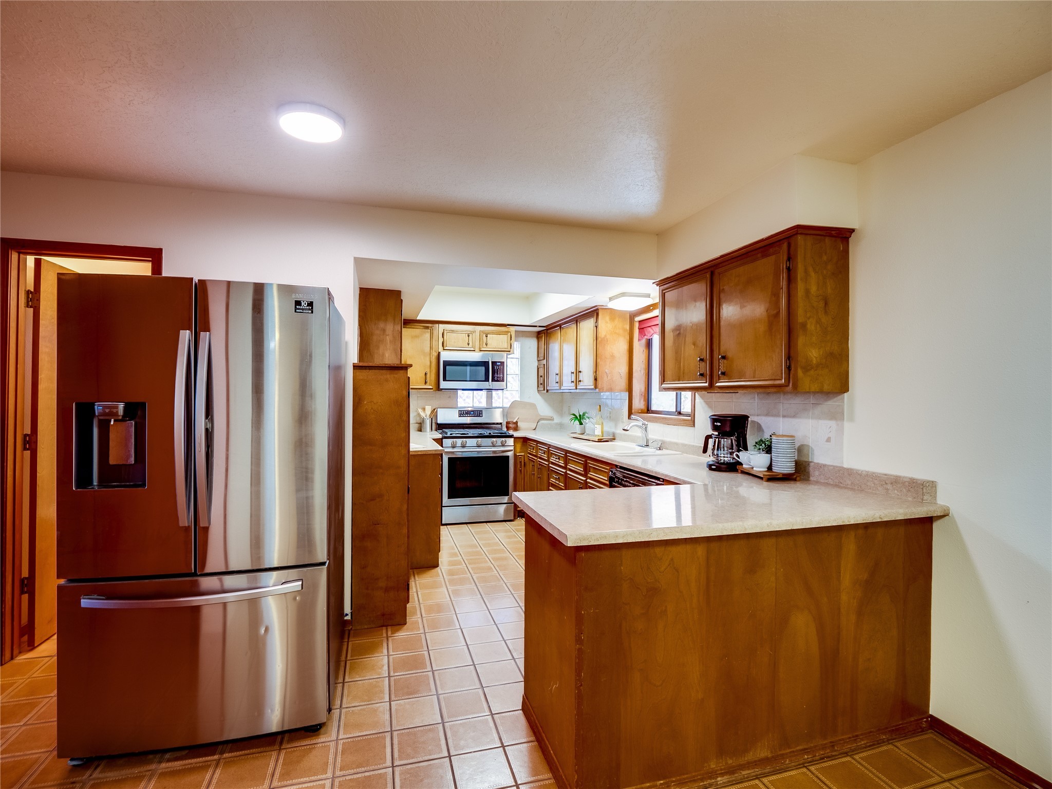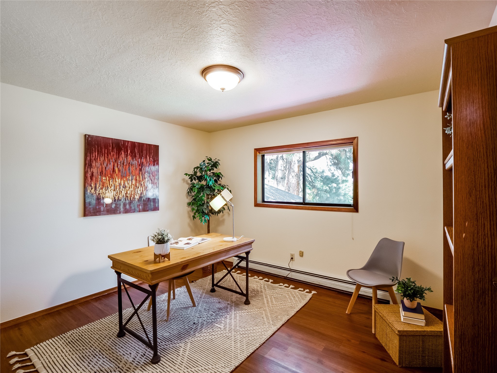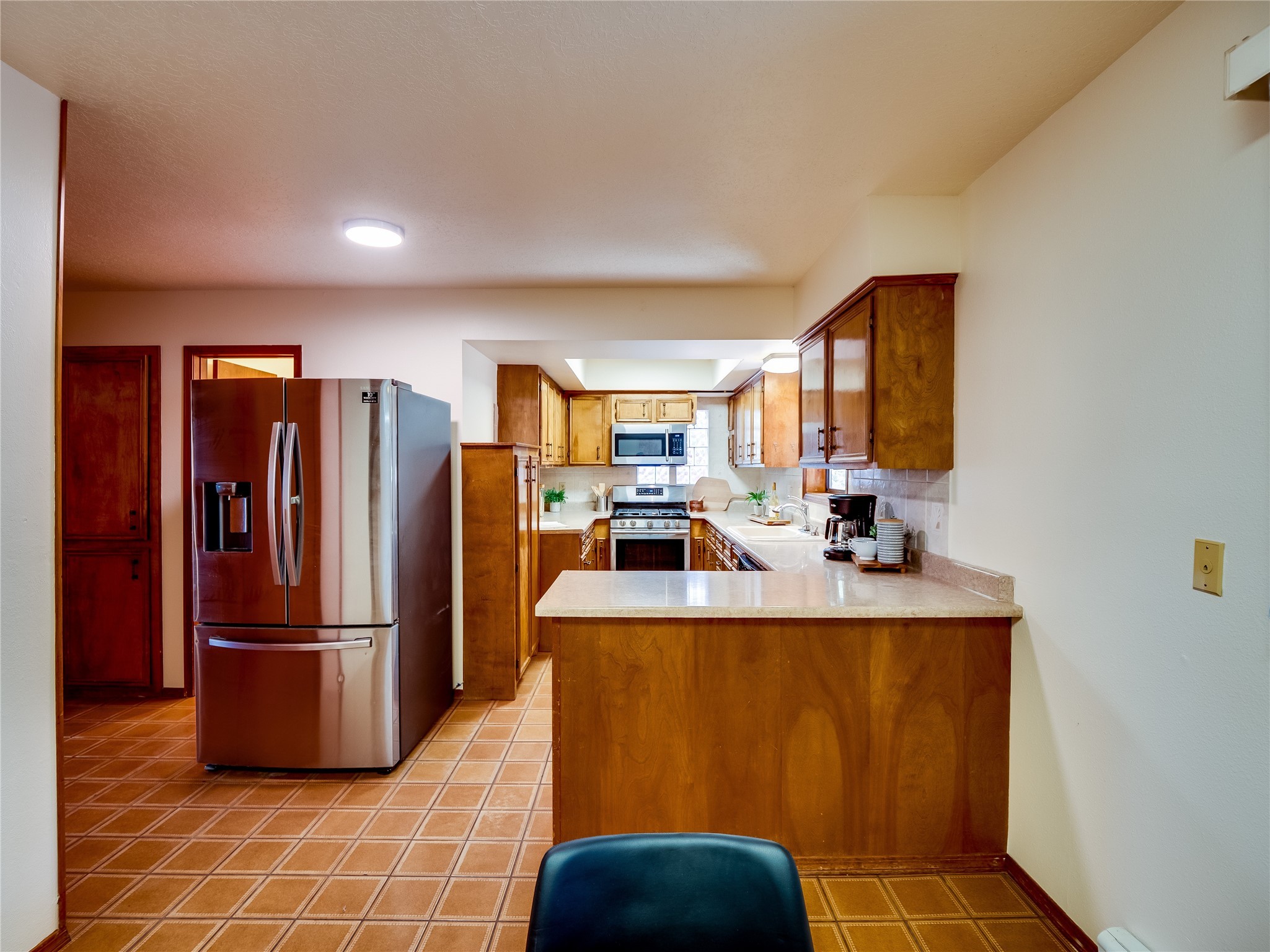 Welcome to this beautiful two-story home in the highly sought-after North Mesa neighborhood! Nestled on a wooded lot with a lush grass lawn, vibrant flower beds, and mature trees, the inviting curb appeal leads you to a charming sunroom-style front porch with stone flooring and direct access to the two-car garage. Step inside through one of two entryways, including sliding doors that open into the warm and welcoming living room. Here, vaulted ceilings create a spacious atmosphere while a stunning corner stone wood-burning fireplace serves as the focal point. Sliding doors extend the living space outdoors to a covered wood deck overlooking the expansive backyard--complete with fruit trees, mature landscaping, a grassy lawn, greenhouse, and storage shed, making it a true outdoor retreat. The dining and kitchen area features tile flooring, a tray ceiling with a skylight, and a thoughtful layout perfect for everyday living. The kitchen is equipped with warm wood cabinets accented by black hardware, light counters, a tile backsplash, and stainless steel appliances. Down the hall, the main level also offers a comfortable guest en-suite with a walk-in shower, an additional guest bedroom, a full guest bathroom with a single sink vanity, and a convenient laundry closet. Upstairs, plush carpet leads to a cozy loft-style family room with built-in cabinet bookcases, ideal for reading or gathering. A bright guest bedroom provides storage space and sliding doors that open to a private deck with breathtaking mountain views. The large primary en-suite is a peaceful retreat, featuring a spacious walk-in closet and extra storage. The bathroom is designed with a white single sink vanity with granite counters located within the bedroom, while a separate enclosed space houses the walk-in glass shower and toilet for added privacy. This fantastic home is in a prime location close to the golf course, trails, horse stables, and schools. Don't miss your chance to own this one-of-a-kind home!