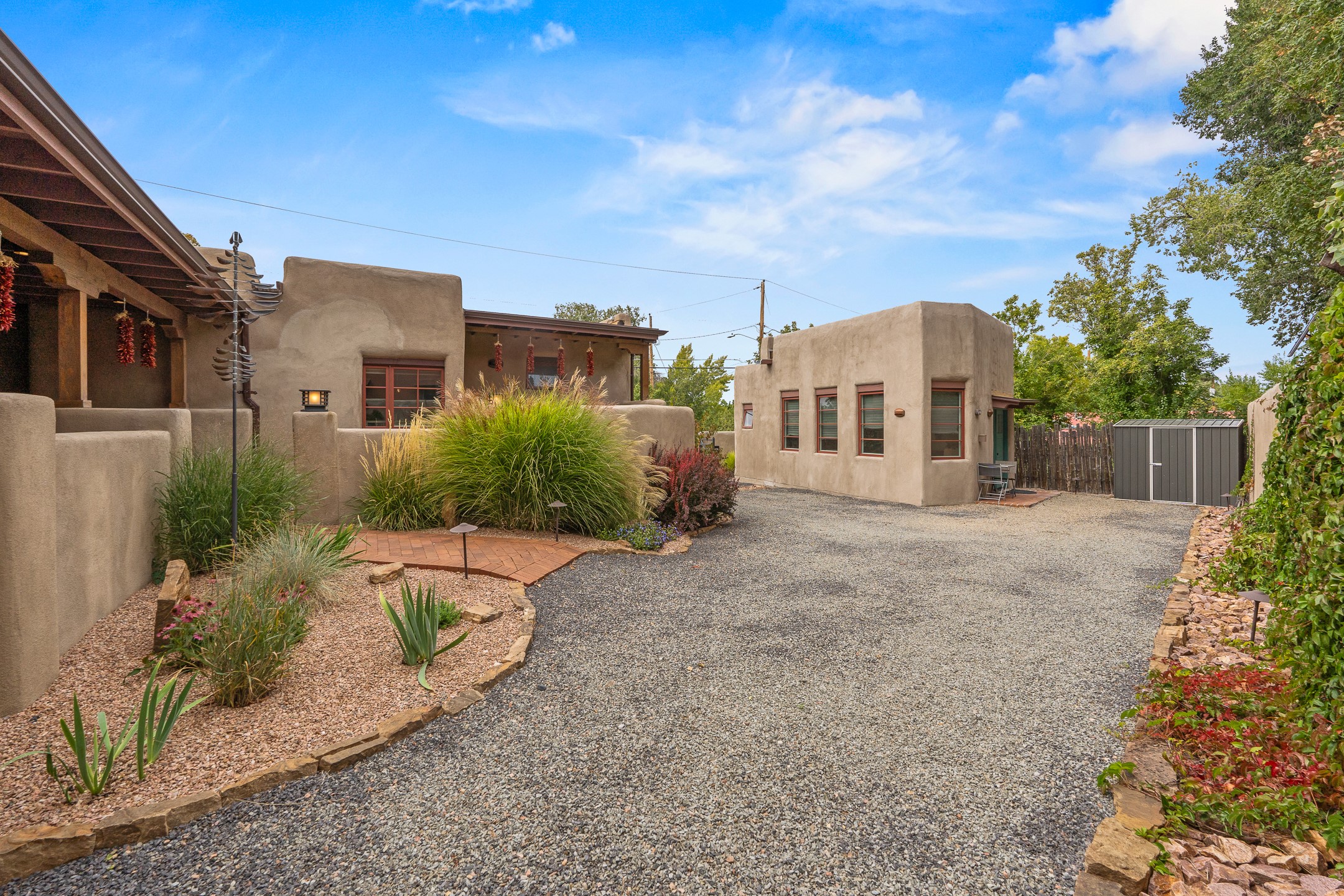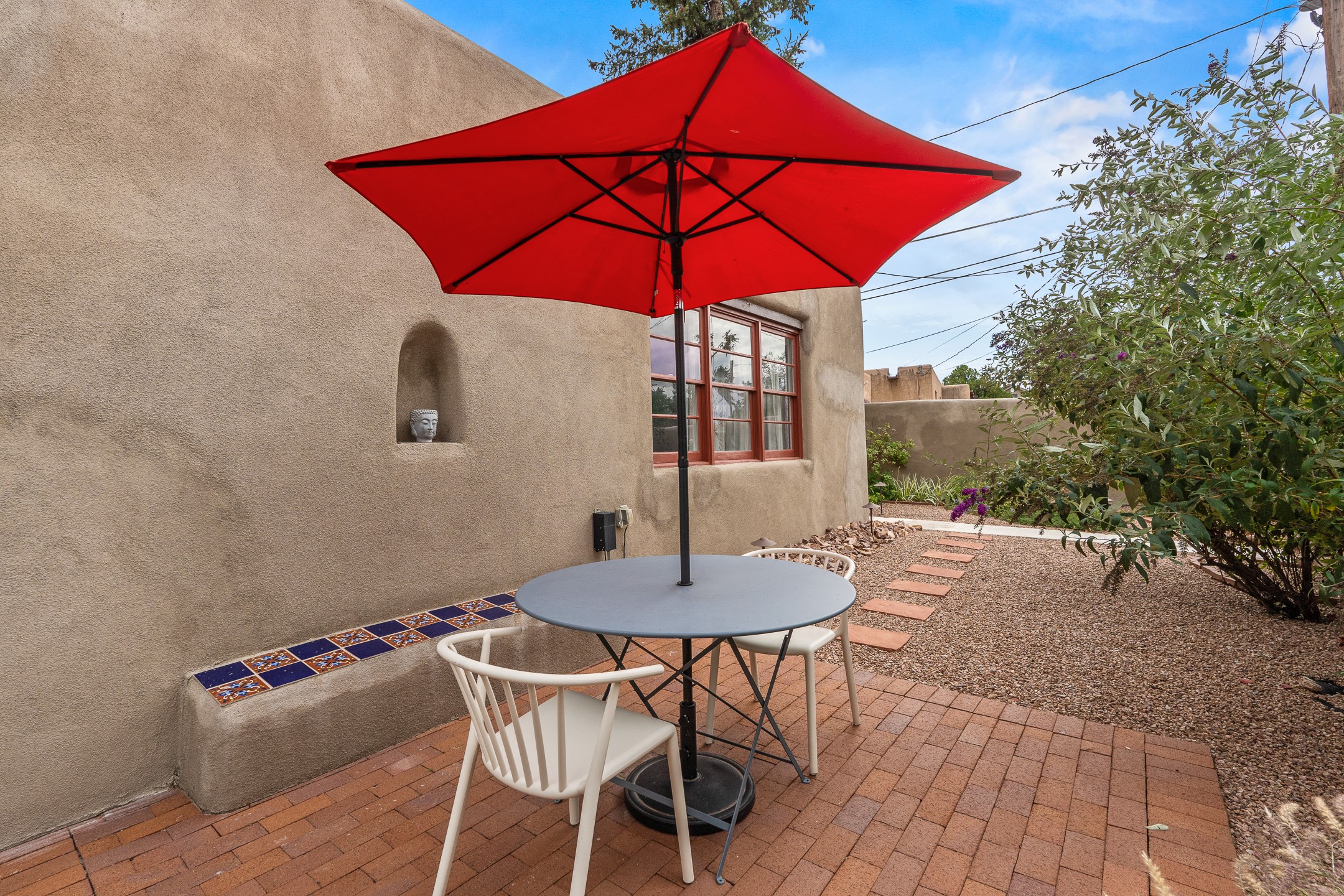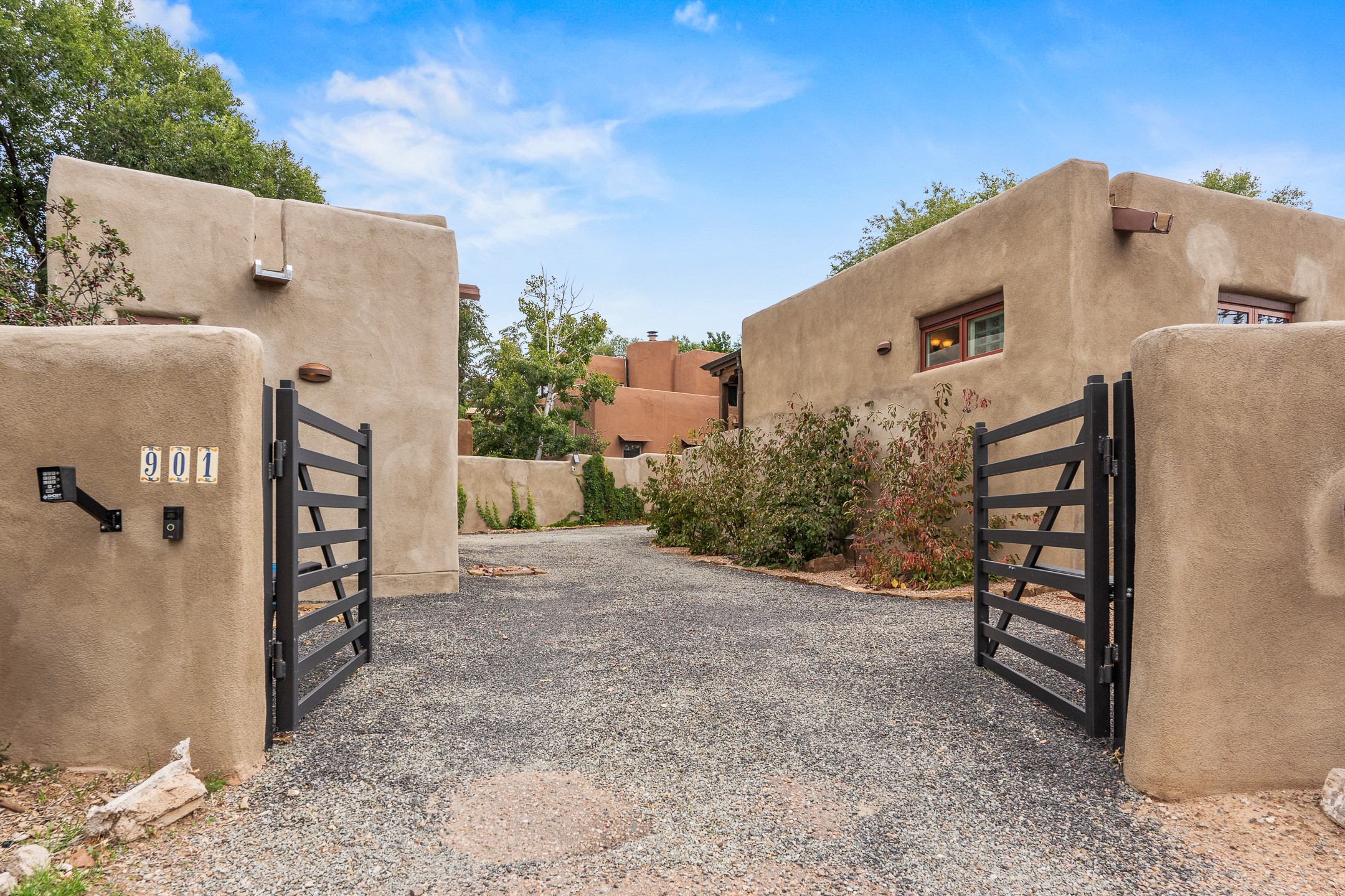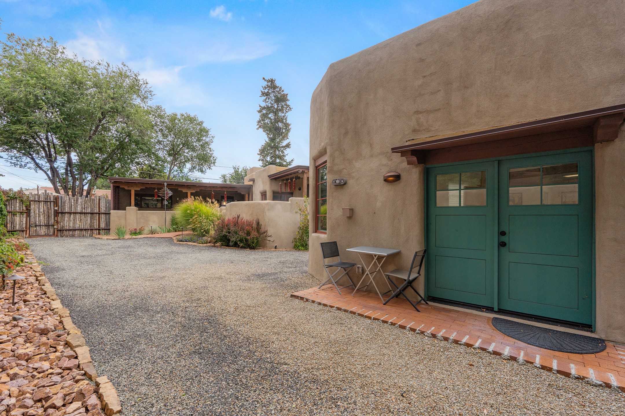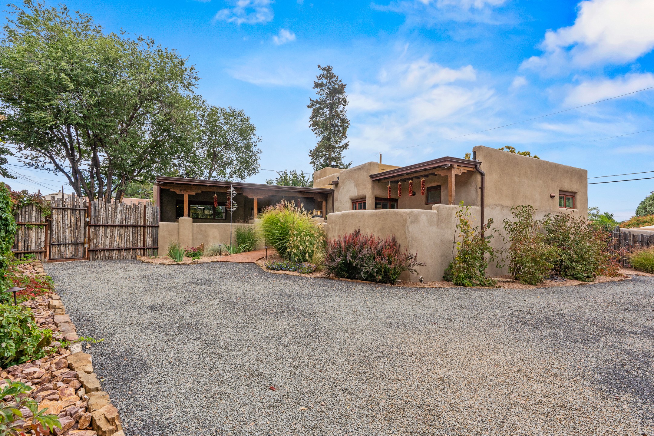 PENDING-- TAKING BACKUP OFFERS! Live like the artist that you are! This historic South Capitol home has had an incredible modern transformation! Lots of designer finishes!Originally built in 1949, this little piece of history has been thoughtfully remodeled to incorporate the old and the new -- a unique combination of mid-century and Santa Fe styles.Featuring 2 bedrooms plus an office, 4 baths, and not one - but two - artist studios, all on a gated lot within walking distance to downtown - this property has everything you could want in your Santa Fe dream home.The all-new kitchen was inspired by the original 1949 style, rebuilt with quartz counters, Caf brand appliances, including a new oven installed in 2025, and hand-made cottage style cabinetry.The primary suite, completely reimagined in 2024, will have you luxuriating in the Americh soaking tub, walk-in shower, and luxury Grohe and Kohler finishes.Need studio space? There are TWO artist's studios - one attached and one detached. The attached studio has skylights, industrial sink, and a private patio -- perfect for use as a creative or flex space. The new (2022) 480-square-foot studio has soaring ceilings plenty of light, a sink and a 1/2 bath.Outdoors, discover hidden native gardens curated by a landscape designer, the custom outdoor kitchen with built-in gas Coyote grill and and covered dining portal, and a sculptural rock fountain by artist Joshua Gannon. Other bonuses include custom uplighting throughout the property, George Nelson and Pablo Pardo pendant lighting, solar tube skylights, a custom-made wine cabinet with built in wine cooler,b new windows in 2020, an EV car charger, a new roof in 2020, and all new electric and plumbing (2020). Seven split HVAC units will keep you comfortable year-round.This is South Capitol redefined. A historic home, transformed for high-quality modern living -- don't miss this opportunity to live your artistic Santa Fe dream!