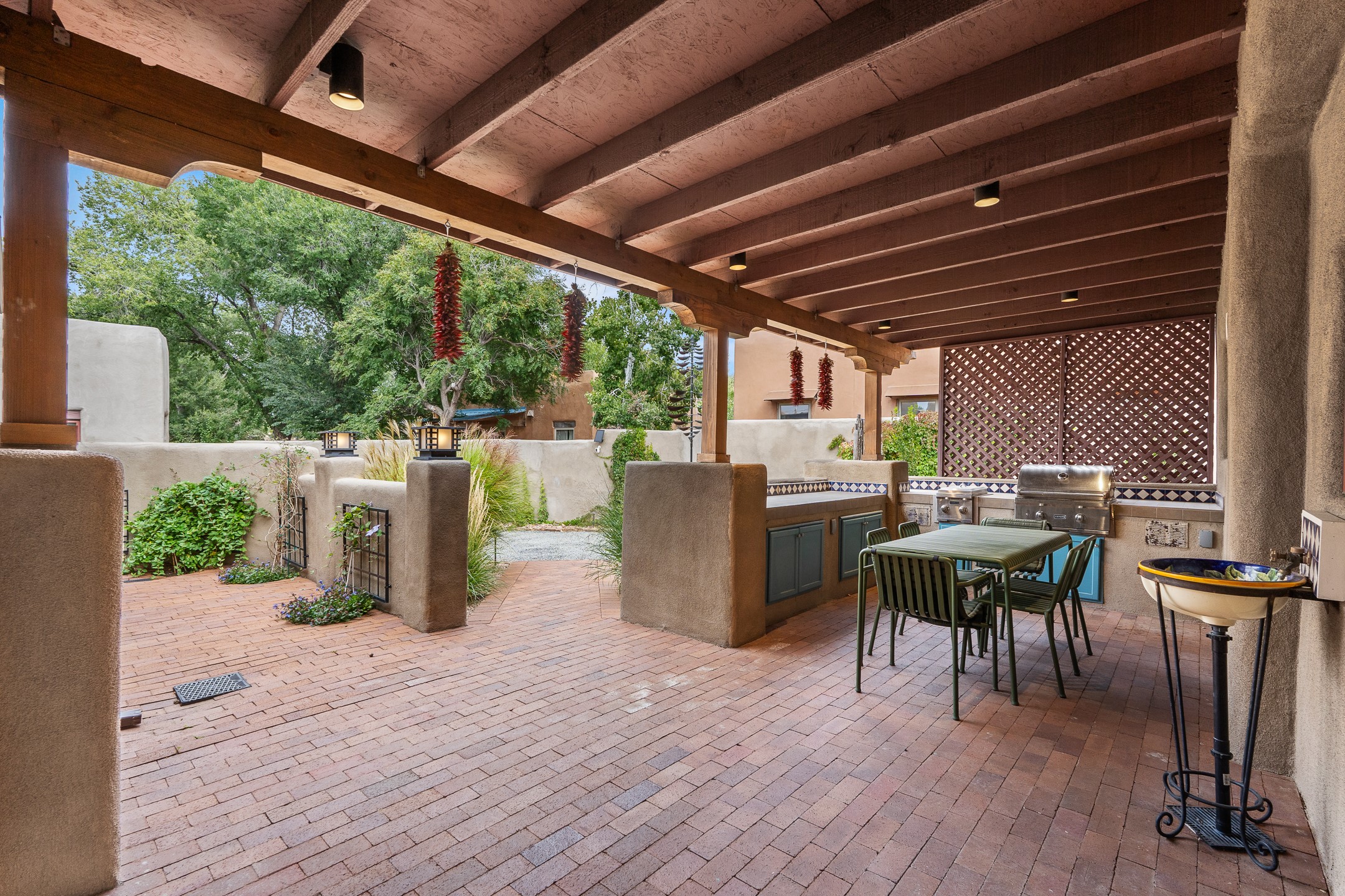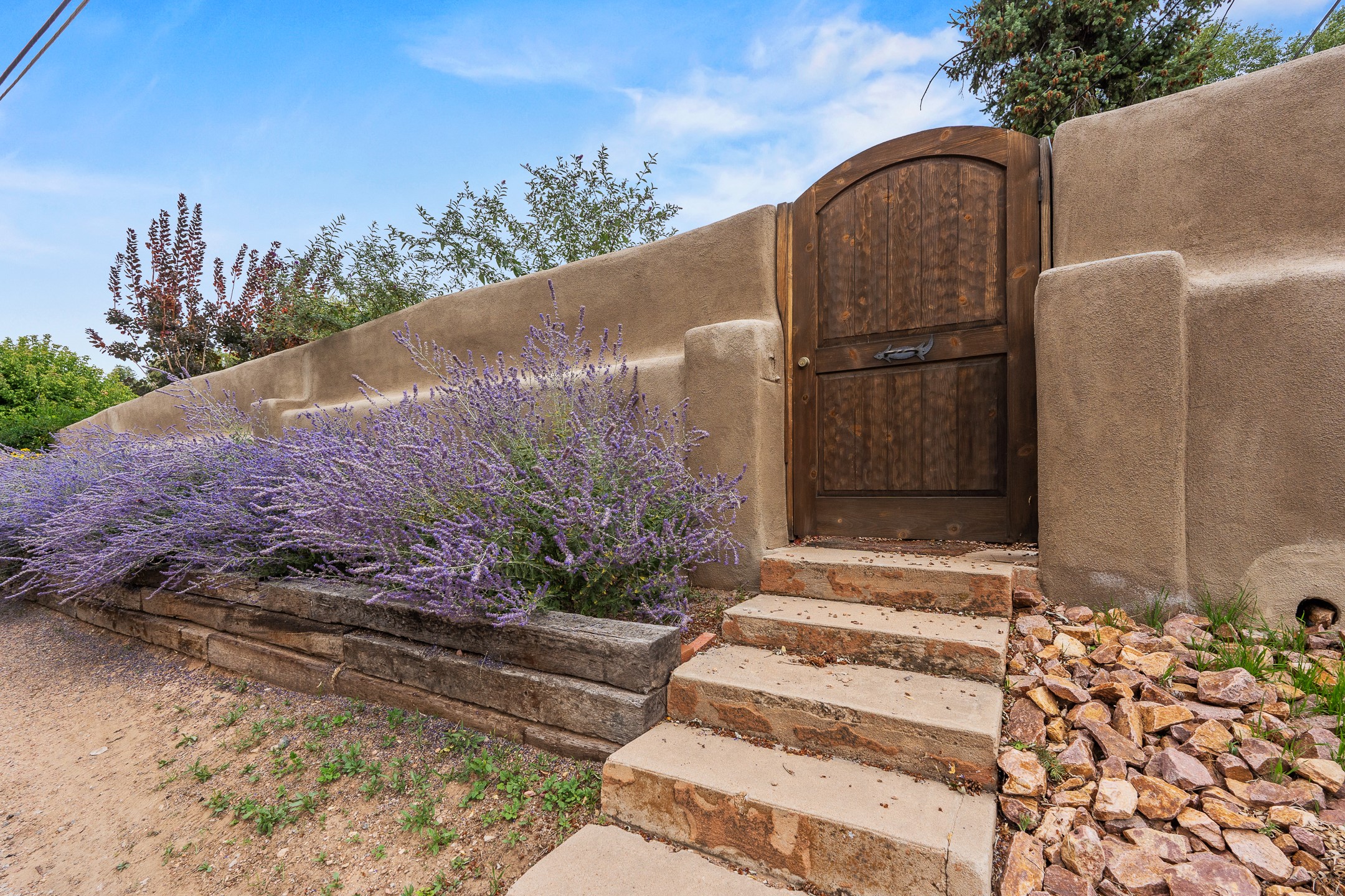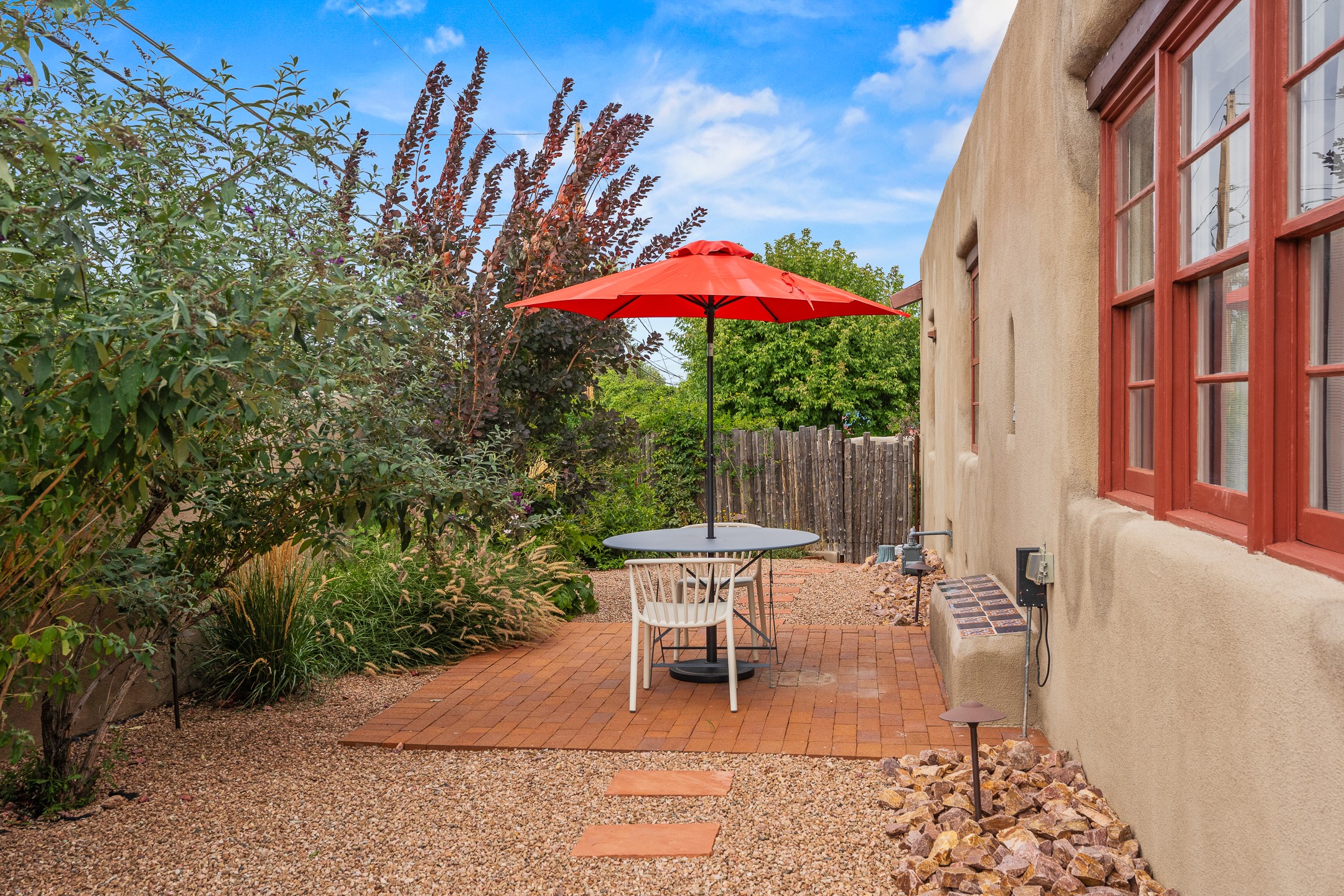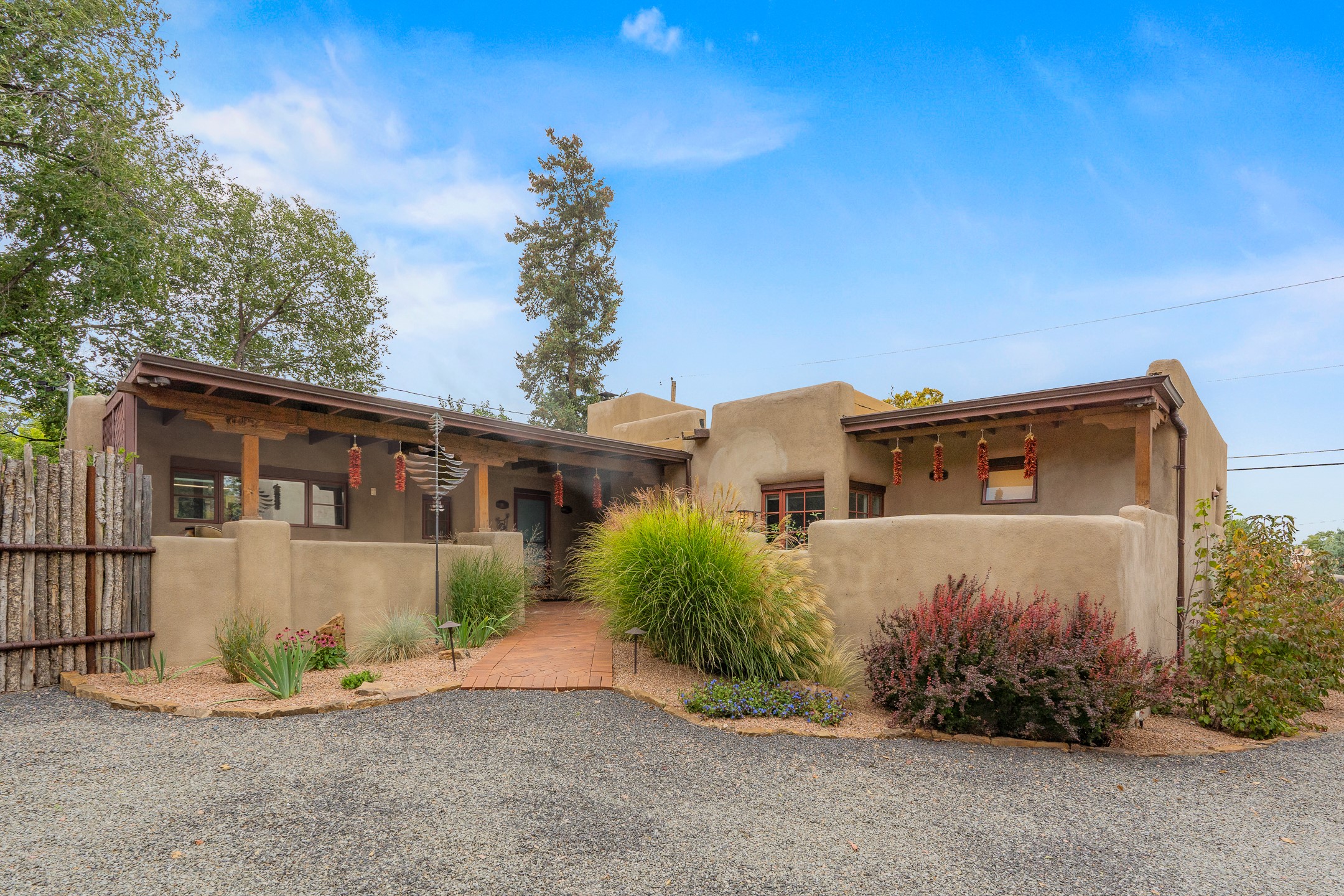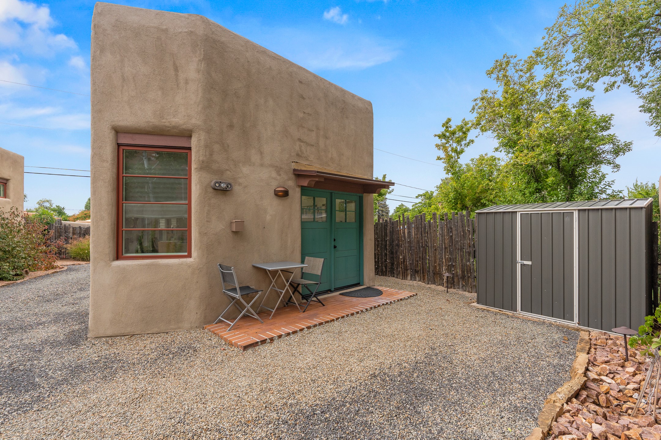 PENDING-- TAKING BACKUP OFFERS! Live like the artist that you are! This historic South Capitol home has had an incredible modern transformation! Lots of designer finishes!Originally built in 1949, this little piece of history has been thoughtfully remodeled to incorporate the old and the new -- a unique combination of mid-century and Santa Fe styles.Featuring 2 bedrooms plus an office, 4 baths, and not one - but two - artist studios, all on a gated lot within walking distance to downtown - this property has everything you could want in your Santa Fe dream home.The all-new kitchen was inspired by the original 1949 style, rebuilt with quartz counters, Caf brand appliances, including a new oven installed in 2025, and hand-made cottage style cabinetry.The primary suite, completely reimagined in 2024, will have you luxuriating in the Americh soaking tub, walk-in shower, and luxury Grohe and Kohler finishes.Need studio space? There are TWO artist's studios - one attached and one detached. The attached studio has skylights, industrial sink, and a private patio -- perfect for use as a creative or flex space. The new (2022) 480-square-foot studio has soaring ceilings plenty of light, a sink and a 1/2 bath.Outdoors, discover hidden native gardens curated by a landscape designer, the custom outdoor kitchen with built-in gas Coyote grill and and covered dining portal, and a sculptural rock fountain by artist Joshua Gannon. Other bonuses include custom uplighting throughout the property, George Nelson and Pablo Pardo pendant lighting, solar tube skylights, a custom-made wine cabinet with built in wine cooler,b new windows in 2020, an EV car charger, a new roof in 2020, and all new electric and plumbing (2020). Seven split HVAC units will keep you comfortable year-round.This is South Capitol redefined. A historic home, transformed for high-quality modern living -- don't miss this opportunity to live your artistic Santa Fe dream!
