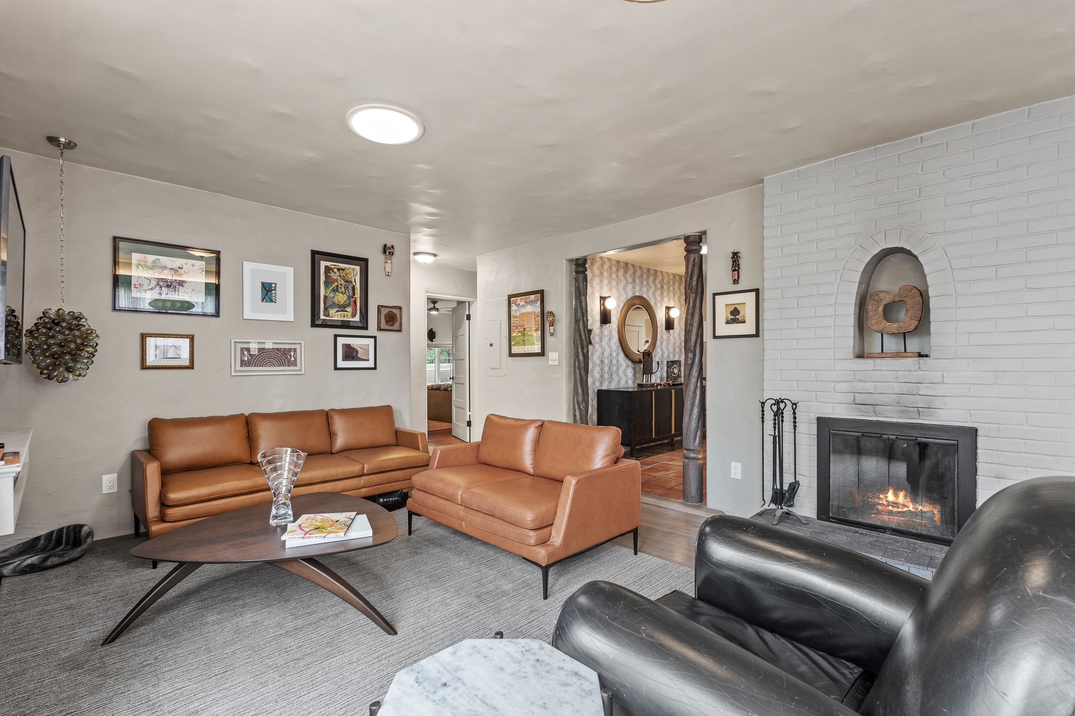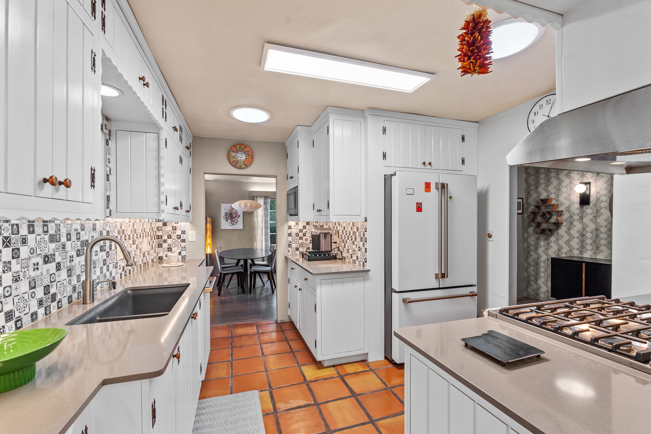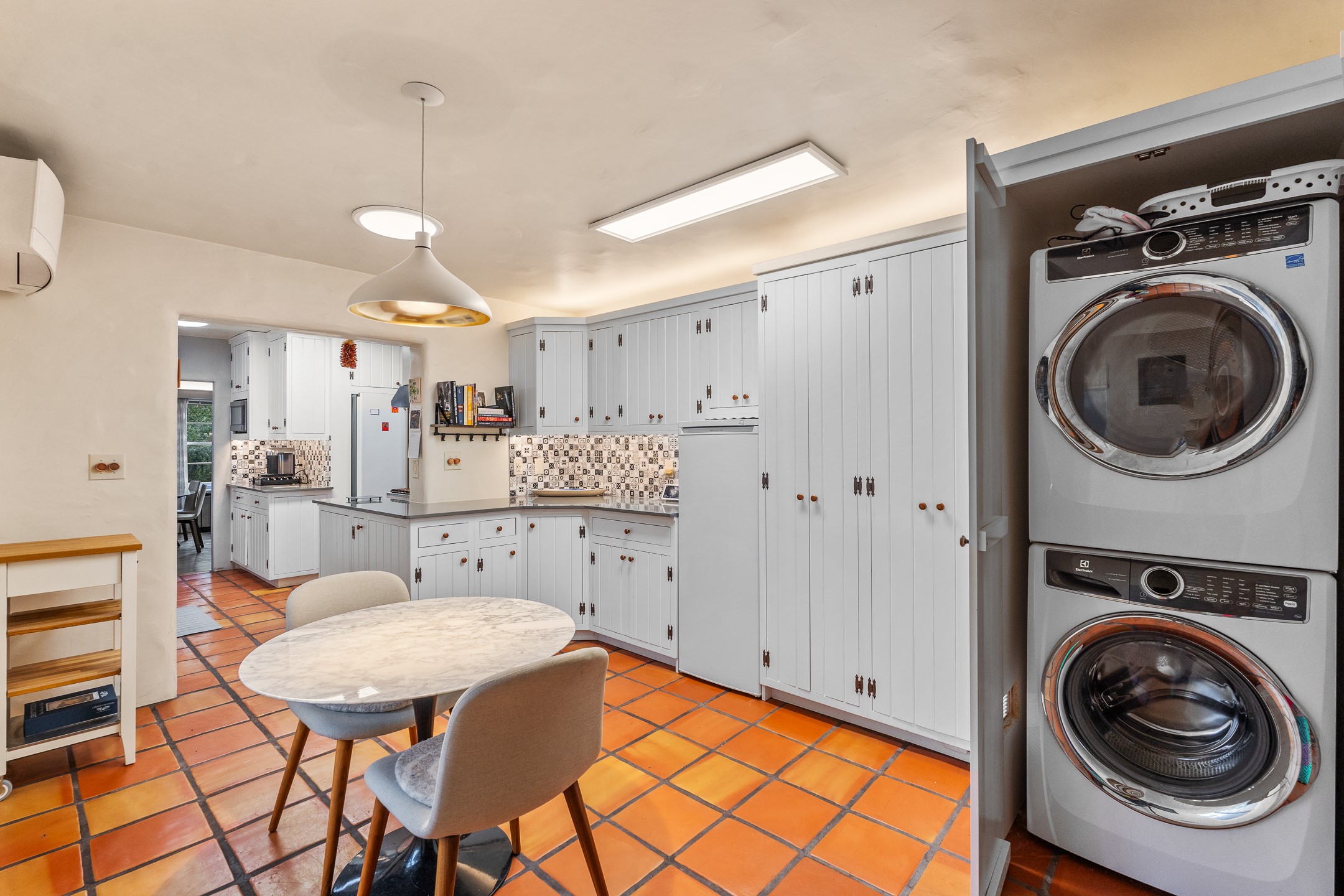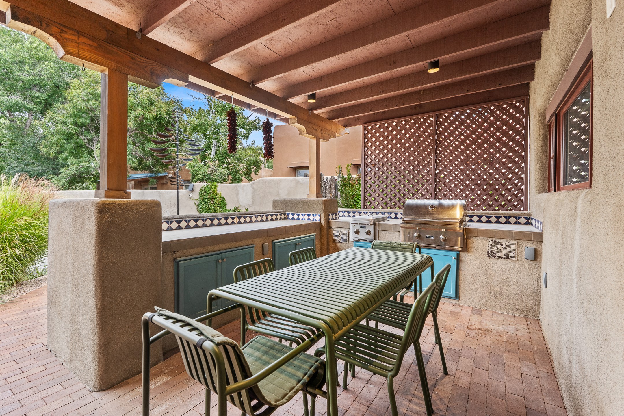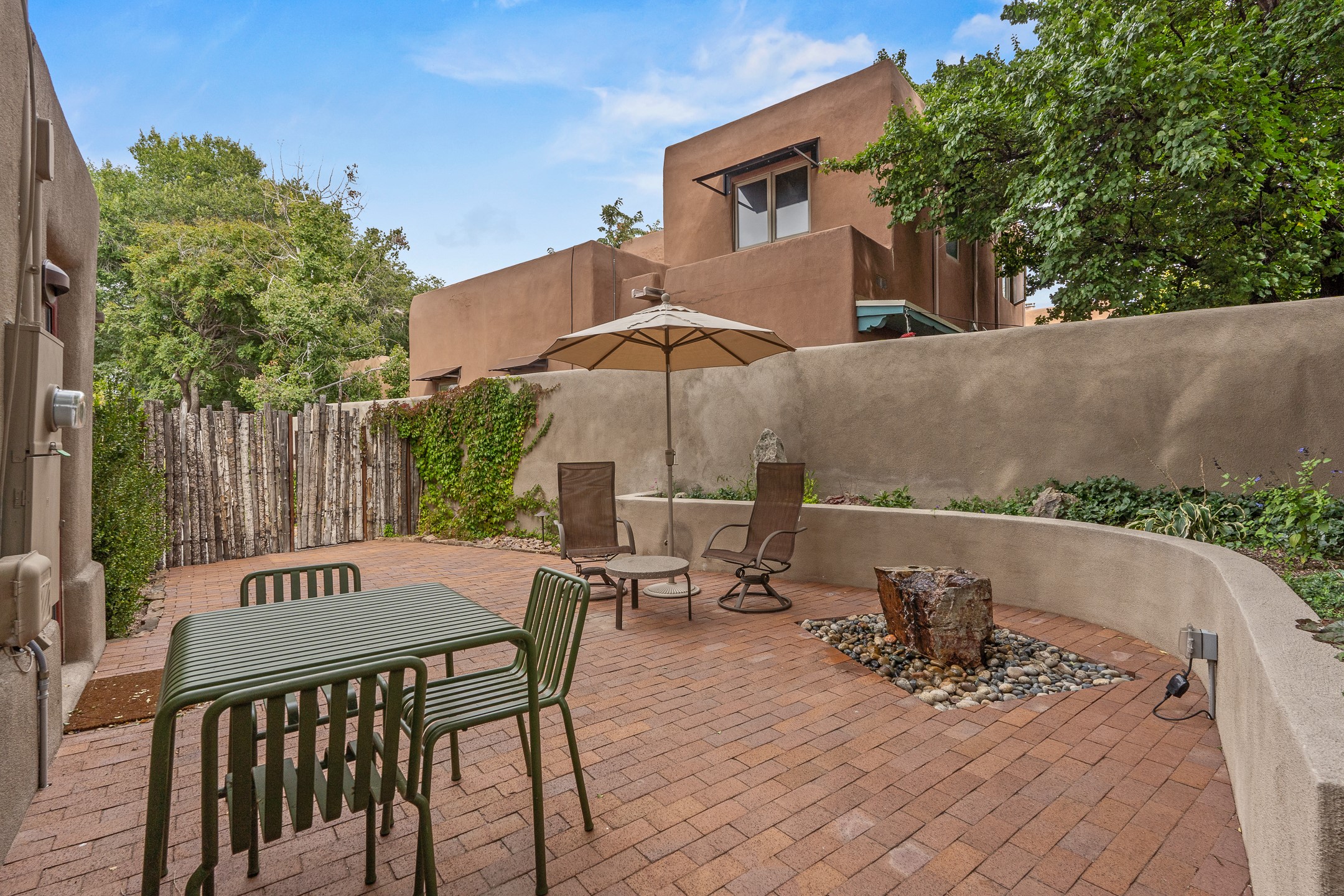 PENDING-- TAKING BACKUP OFFERS! Live like the artist that you are! This historic South Capitol home has had an incredible modern transformation! Lots of designer finishes!Originally built in 1949, this little piece of history has been thoughtfully remodeled to incorporate the old and the new -- a unique combination of mid-century and Santa Fe styles.Featuring 2 bedrooms plus an office, 4 baths, and not one - but two - artist studios, all on a gated lot within walking distance to downtown - this property has everything you could want in your Santa Fe dream home.The all-new kitchen was inspired by the original 1949 style, rebuilt with quartz counters, Caf brand appliances, including a new oven installed in 2025, and hand-made cottage style cabinetry.The primary suite, completely reimagined in 2024, will have you luxuriating in the Americh soaking tub, walk-in shower, and luxury Grohe and Kohler finishes.Need studio space? There are TWO artist's studios - one attached and one detached. The attached studio has skylights, industrial sink, and a private patio -- perfect for use as a creative or flex space. The new (2022) 480-square-foot studio has soaring ceilings plenty of light, a sink and a 1/2 bath.Outdoors, discover hidden native gardens curated by a landscape designer, the custom outdoor kitchen with built-in gas Coyote grill and and covered dining portal, and a sculptural rock fountain by artist Joshua Gannon. Other bonuses include custom uplighting throughout the property, George Nelson and Pablo Pardo pendant lighting, solar tube skylights, a custom-made wine cabinet with built in wine cooler,b new windows in 2020, an EV car charger, a new roof in 2020, and all new electric and plumbing (2020). Seven split HVAC units will keep you comfortable year-round.This is South Capitol redefined. A historic home, transformed for high-quality modern living -- don't miss this opportunity to live your artistic Santa Fe dream!